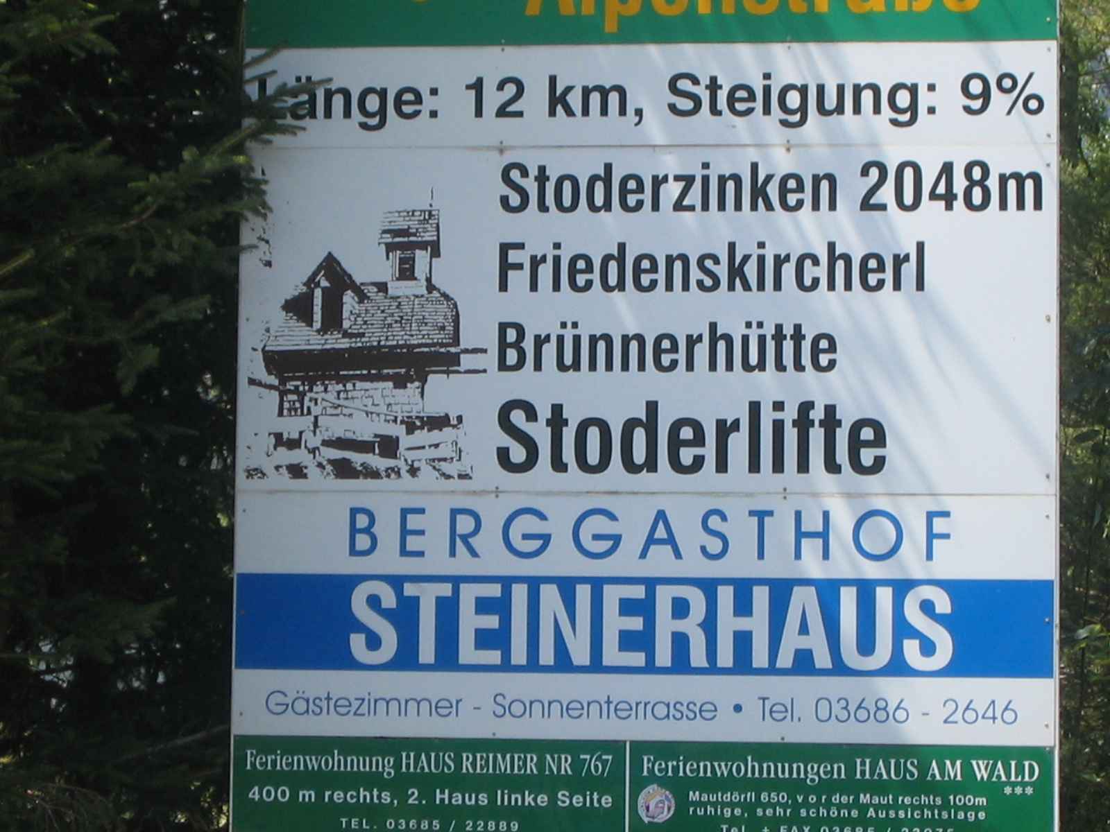 Gleich am ersten Tag sollte es auf den Stoderzinken gehen. So ganz konnte ich die Daten, die mir Carsten genannt hatte nicht glauben. Sollte es wirklich über 12 Kilometer mit mehr als 9% bergauf gehen ? Unsere Tour begann mit einem lockeren Einrollen, bis wir über eine erste Kuppe mussten. Bereits dort musste ich ordentlich arbeiten und machte mir so meine Gedanken, wie ich wohl diese „mörderische“ Steigung bewältigt bekommen würde. Das gute Wetter liess mich aber hoffen und so näherten wir uns der Auffahrt, immer mit dem Blick auf das gewaltige Dachsteinmassiv. Die Größe dieser Berge konnte man kaum erfassen, da die Relation fehlte. Erst als ich hoch oben in der Luft ein Segelflugzeug entdeckte, wurde ich mir der Ausmaße dieses Gebirgsstocks bewusst. Am Fuße des Berges gab es dann auch ein Schild, in dem der Beweis für Carsten’s Aussage schriftlich zu sehen war. 12 Kilometer mit durchschnittlich 9% Steigung…