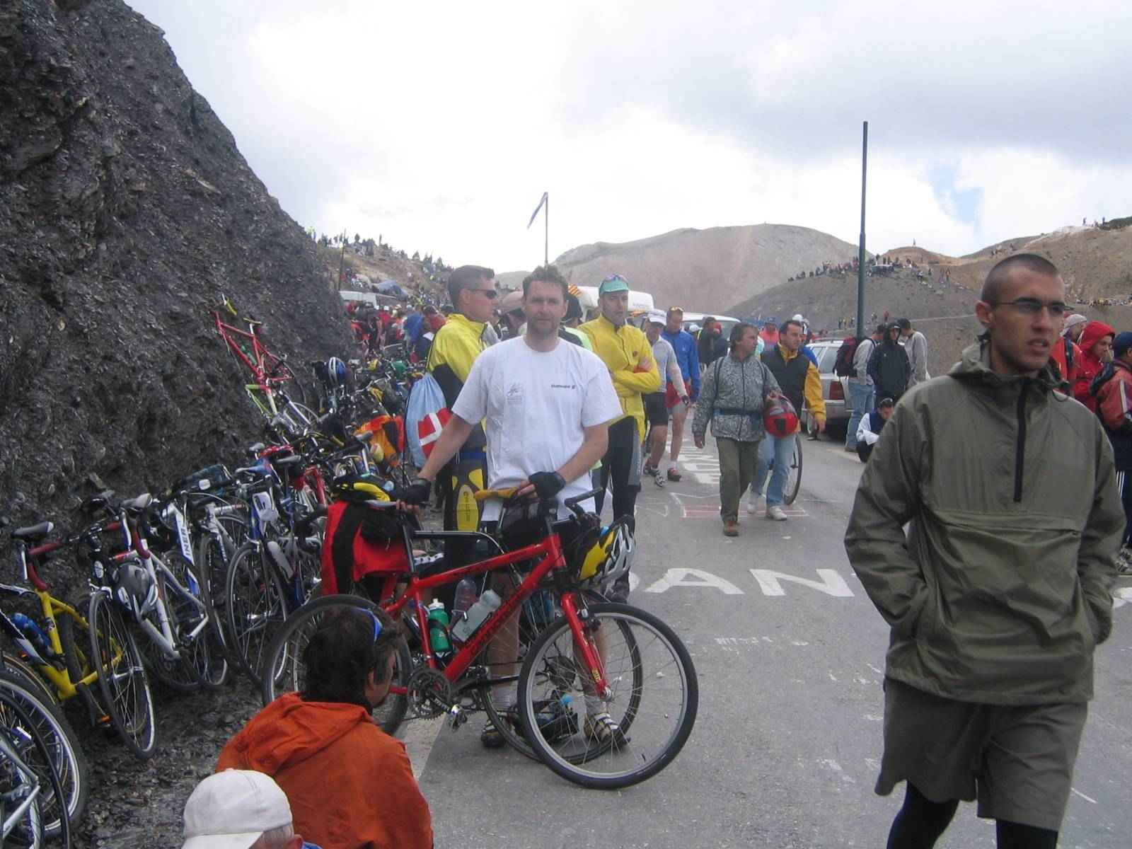 Nach einem rustikalen Mahl auf dem Parkplatz für Wohnmobile und einer sehr unterschiedlichen Nacht (Casi übernachtete im Auto und bewachte seiner Gitarre (die am Ende nie zum Einsatz kam) ging es zum Dach der Tour. Es war ein langer Anstieg und fast jeder von uns musste zwischendurch einen kleinen Stopp einlegen, bis wir ganz oben waren. Dort sammelten wir uns bei ca. 5-8 Grad und warteten auf unsere „Helden“. Zwischendurch hatten wir sogar die Möglichkeit bei einem Wohnmobil einen Blick auf einen Fernseher werfen, allerdings hatten wir alle immer wieder Sorge, dass irgendjemand unsere Räder stehlen würde, was uns doch ein wenig nervös machte…