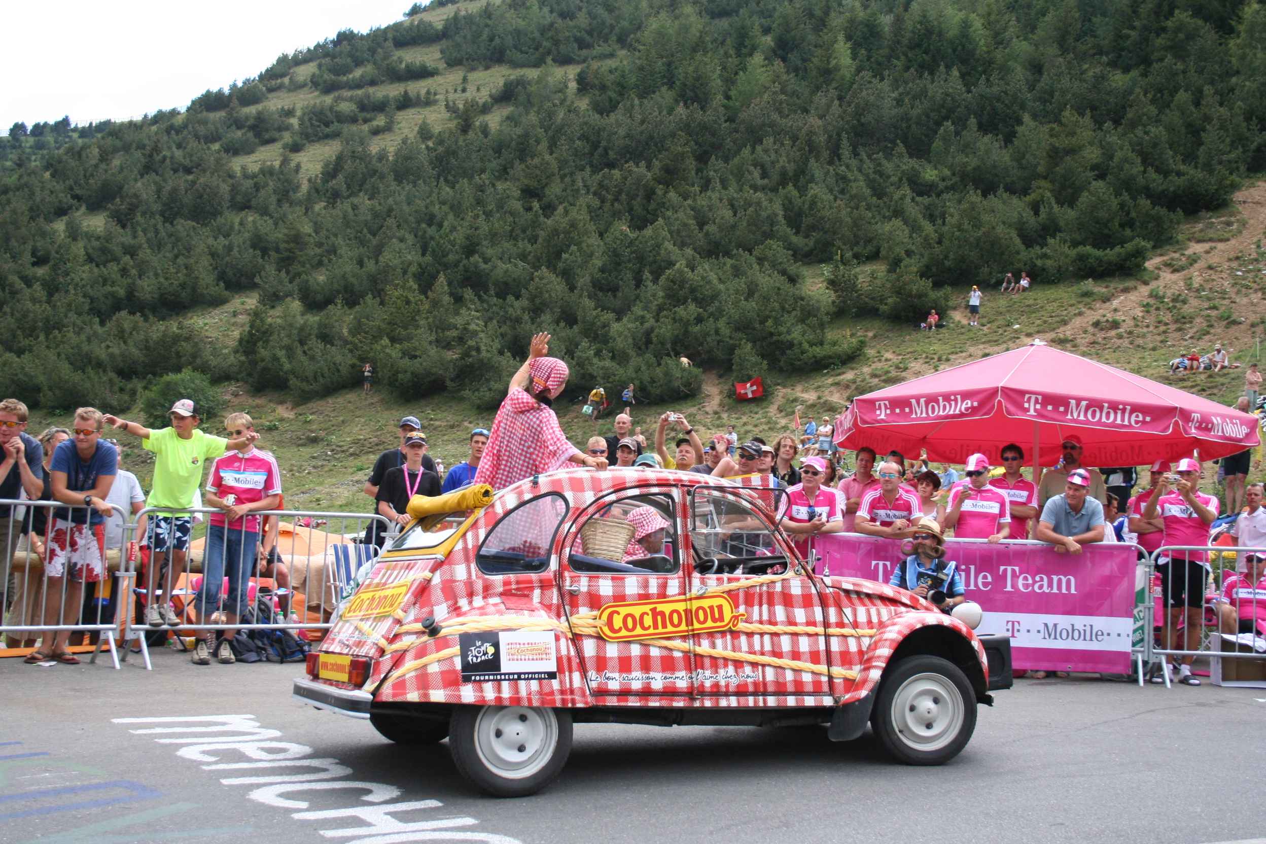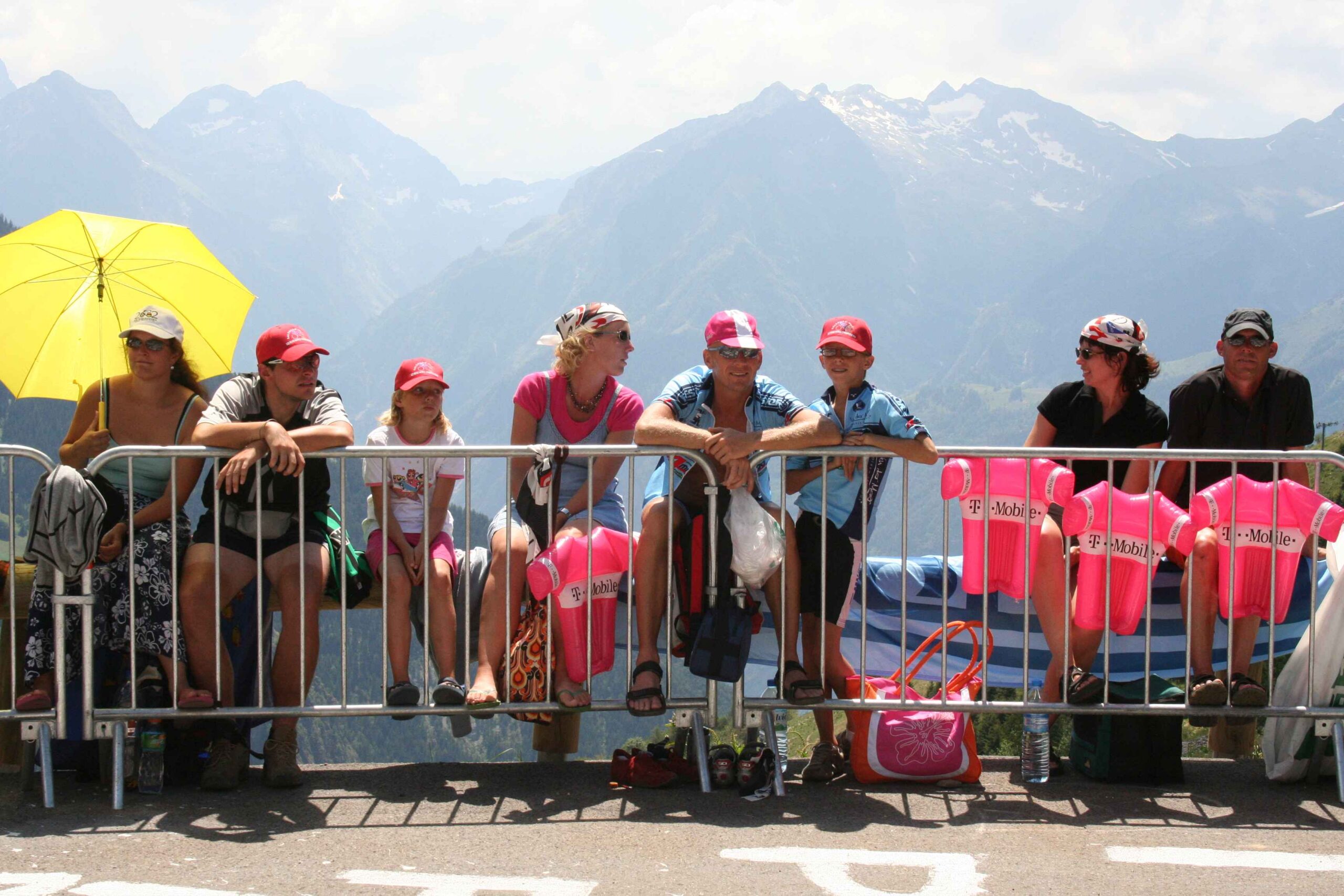 Am Ende standen wir genau gegenüber eines Telekom VIP Zelts wo sich eine gute Stimmung breit machte. Allerdings waren sie nicht dazu zu bewegen ein Fan Artikel herauszurücken. Lautstark feuerten wir die Profis an, die hinauf geflogen kamen, selbst das Gruppetto war noch mit einem Tempo unterwegs, von dem wir nur träumen konnten.