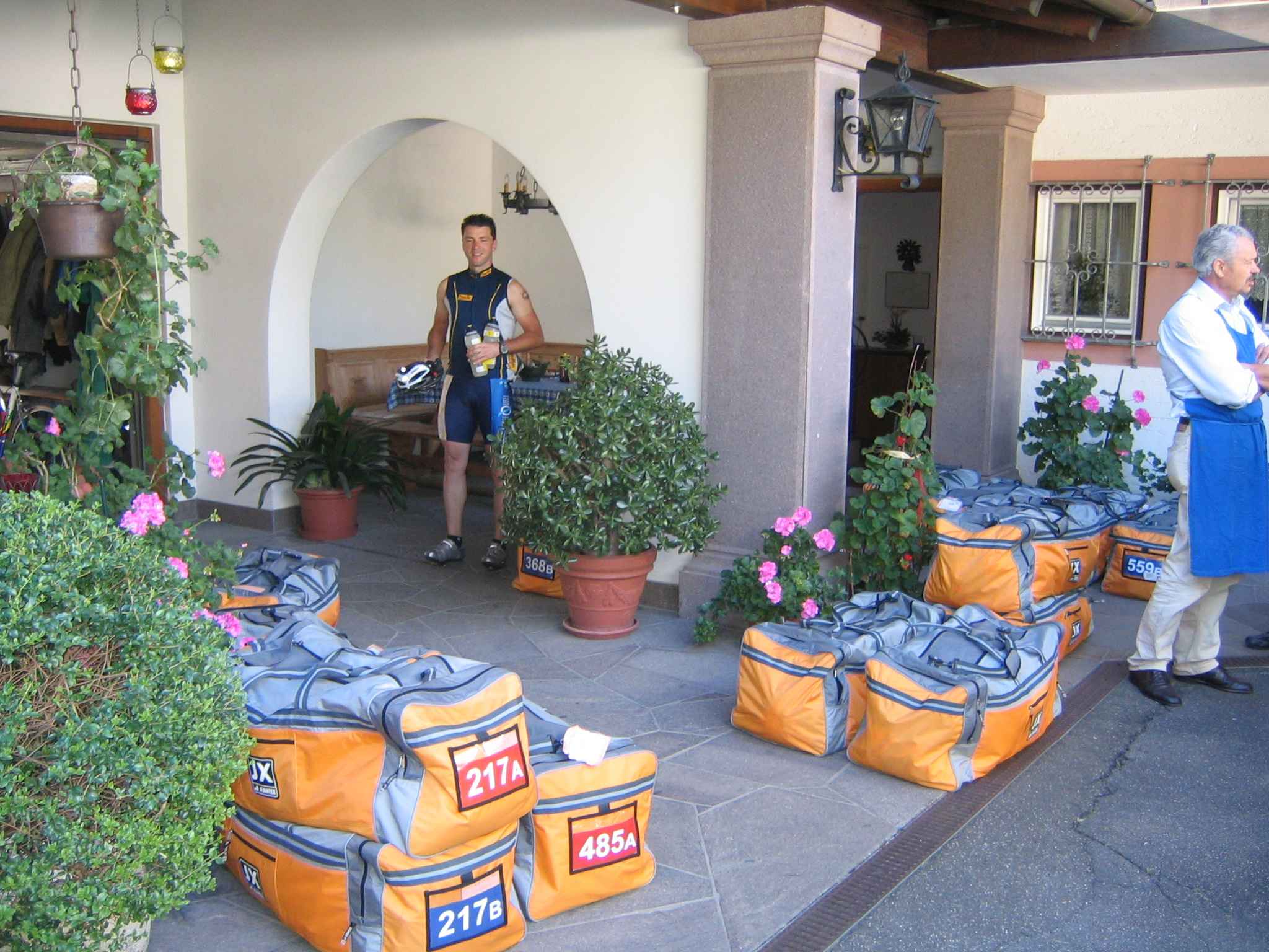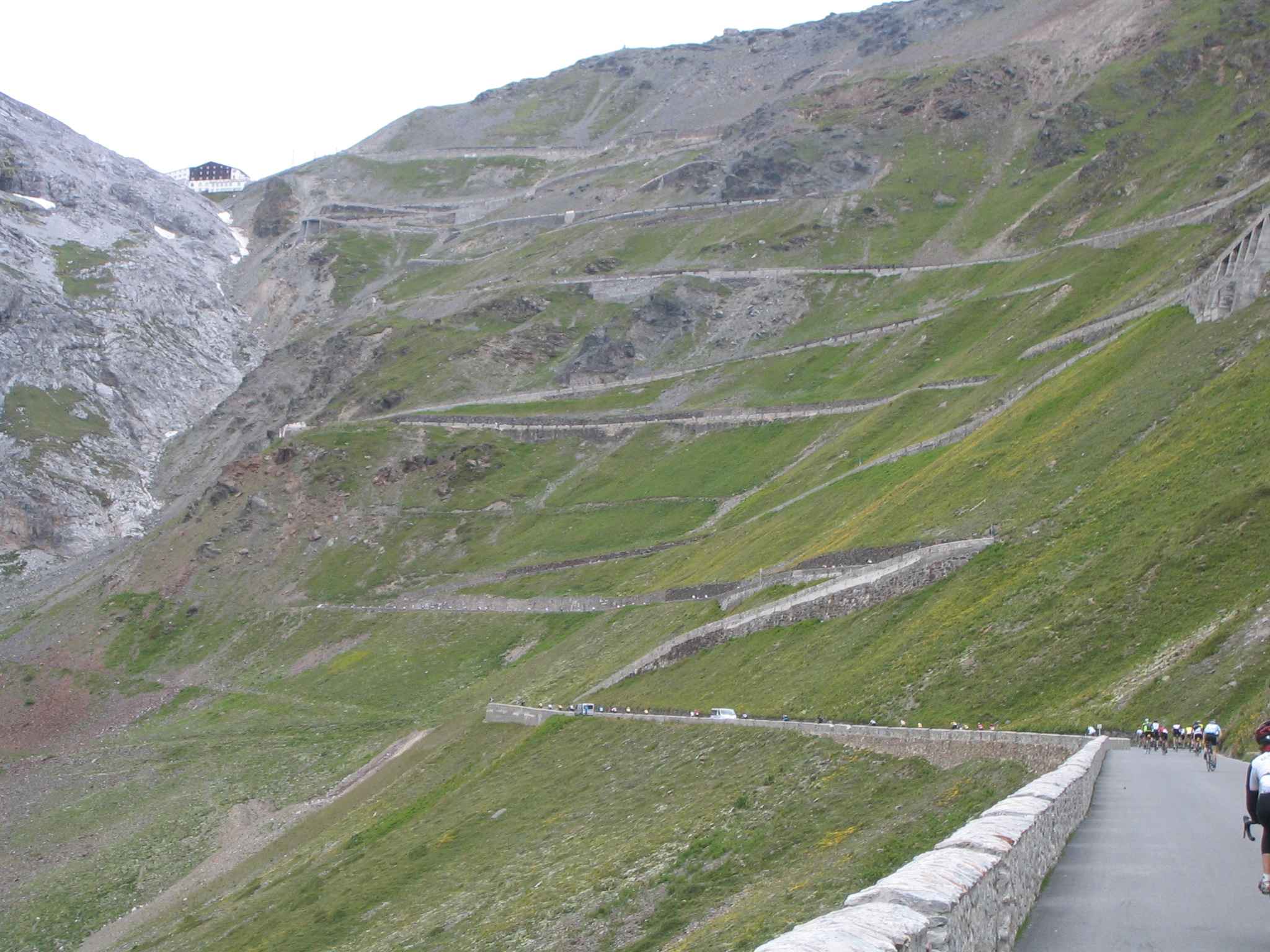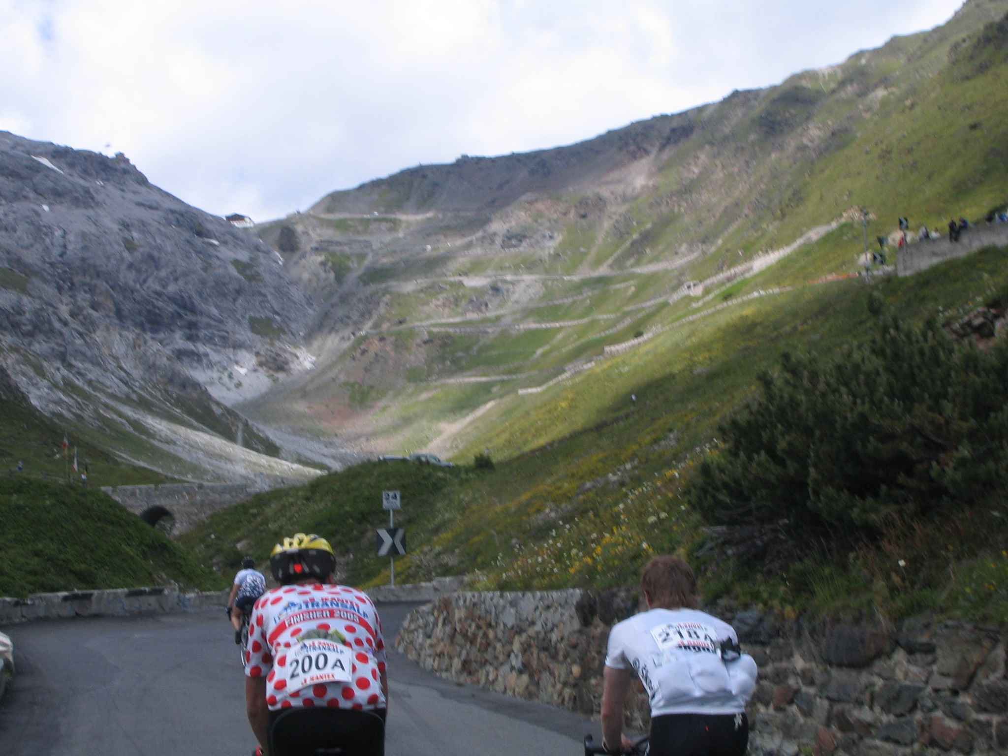 Es stand die Königsetappe an! Es sollte über das Dach der Tour gehen mit einem Anstieg von 2.200 Höhenmetern auf das Stilfser Joch. Insgesamt standen auf einer Strecke von 118 km annähernd 3.600 hm an. Trotz des Erfolges des gestrigen Tages hatten wir vor dem Stilfser Joch gehörigen Respekt. Der Anstieg war sehr  herausfordernd und wir merkten die dünne Luft sehr wohl. Allerdings war es auch ein einzigartigen Erlebnis diesen Pass ohne Autoverkehr hochzufahren. Auf dem Pass war es dann doch recht frisch und es vielen sogar ein paar kleine Schneeflocken. Die Abfahrt runter nach Bormio war so richtig nach meinem Geschmack, auch wenn das schnelle Fahren durch die unbeleuchteten Tunnel ein wenig Überwindung erforderten, zumal dort auch die ein oder andere nasse Stelle wartete. Leider war der Tag in Bormio noch nicht zu Ende sondern es folgten noch zwei weitere Anstiege. Oben auf dem Passo Foscagno machten wir an der Verpflegungsstelle Pause und dehnten erst mal unsere müden Beine. Auf der Abfahrt ins Ziel drohte auch noch Regen, doch kamen wir trocken in die Unterkunft. Unser heutiger Schnitt war aufgrund des langen Anstiegs mit gut 17 km/h auch deutlich hinter dem Tempo der letzten Tage zurückgefallen. Doch da es bei allen so war, blieben wir in der Startgruppe C! Unser Zimmer lag genau vor der Zieleinfahrt und wir konnten die Fahrer, die nach uns kamen noch beklatschen… Insbesondere freuten wir uns die Strecke doch in einer Zeit von 6:47 Stunden hinter uns gebracht zu haben, da es etwas später noch richtig anfing zu Regnen und die Abfahrt vom Passo d’Eira da sicherlich kein Spaß gewesen ist..