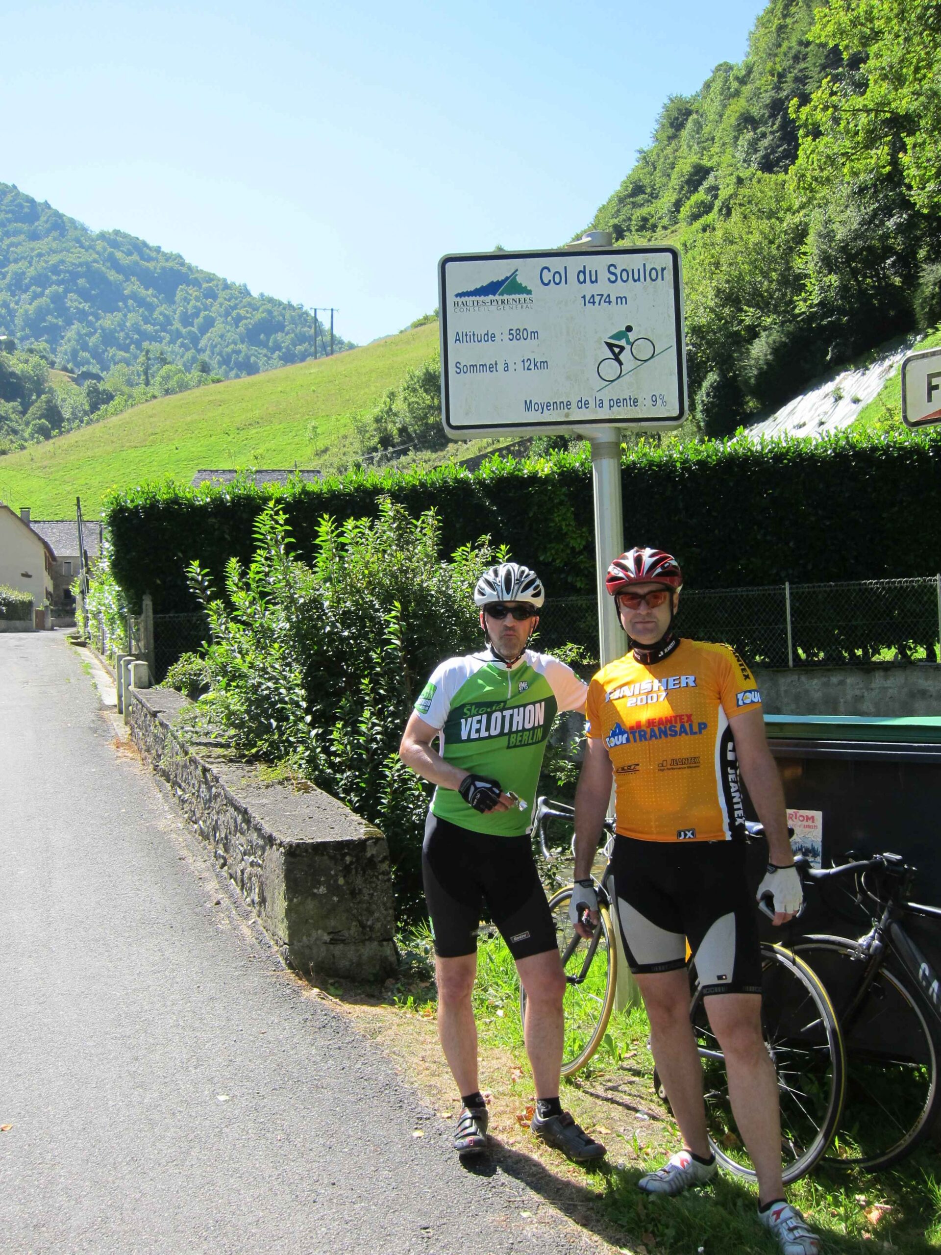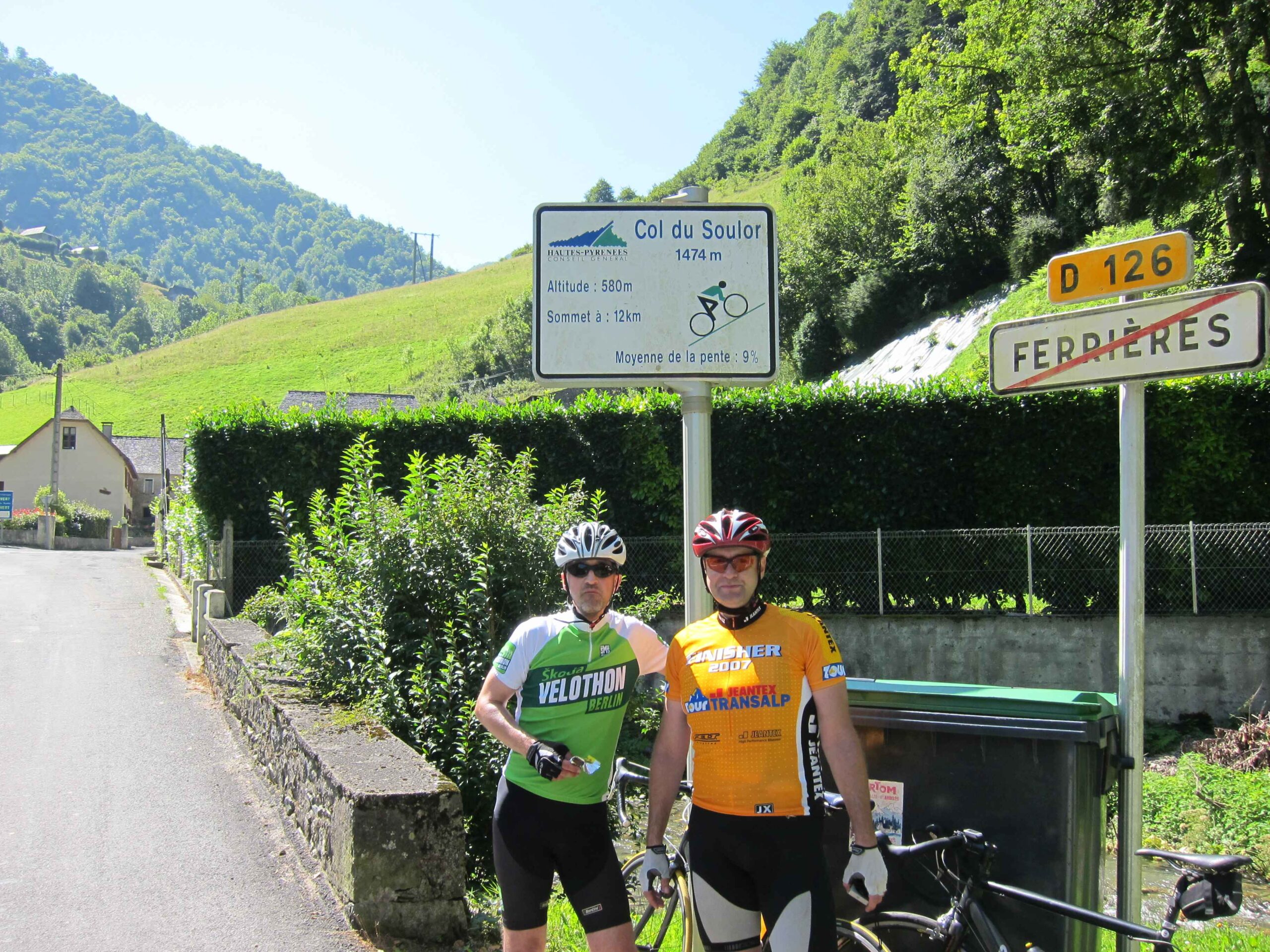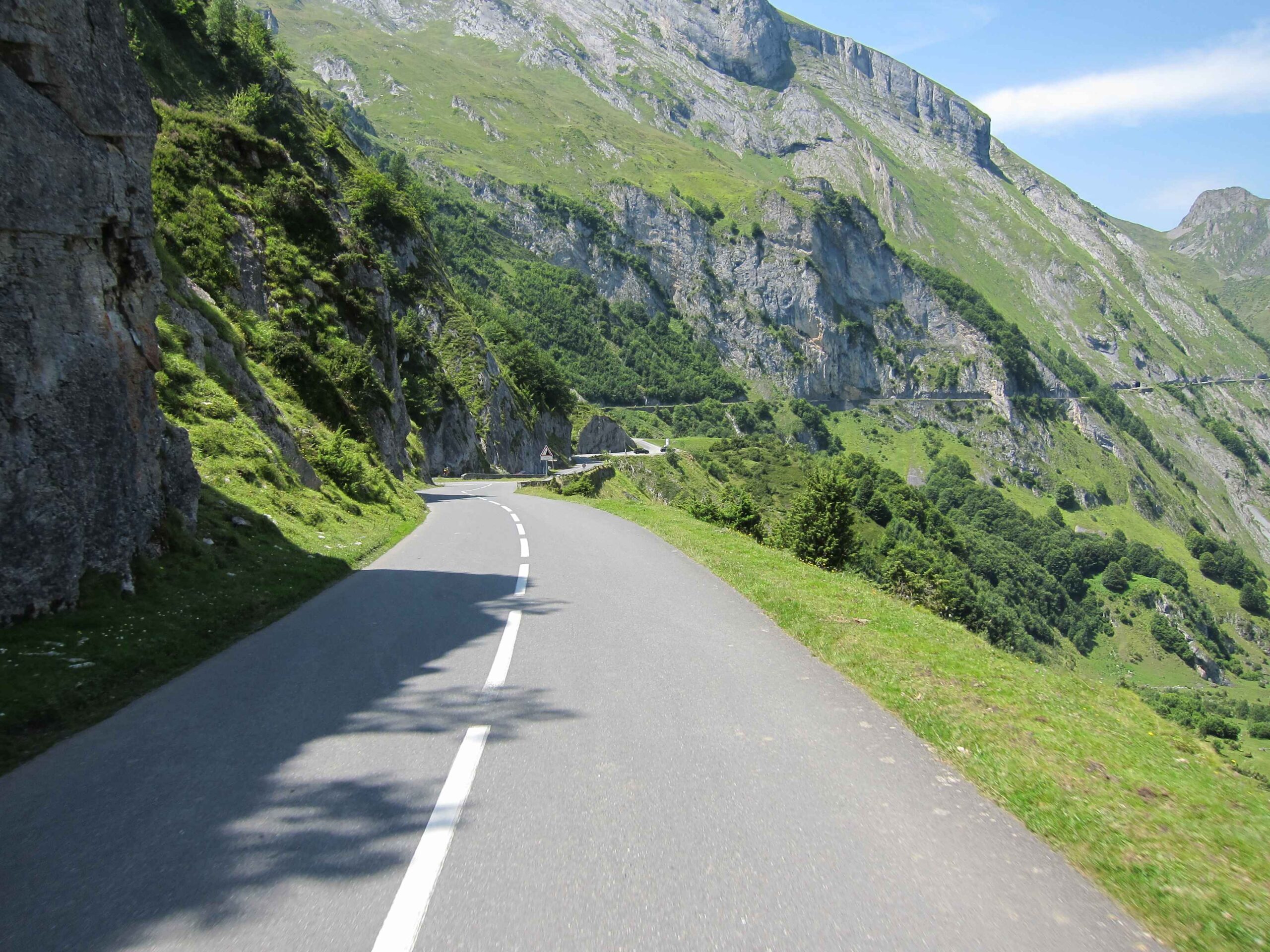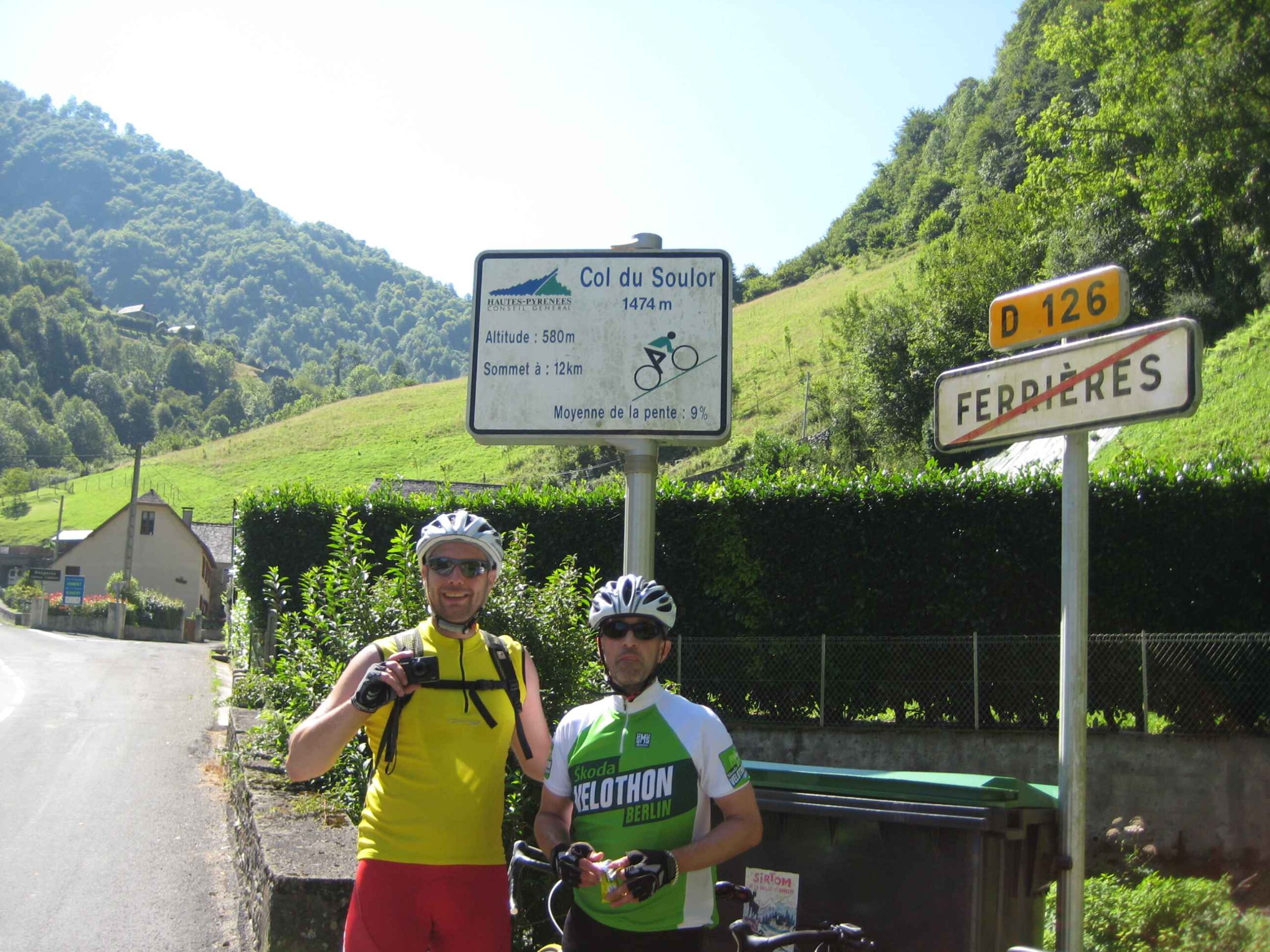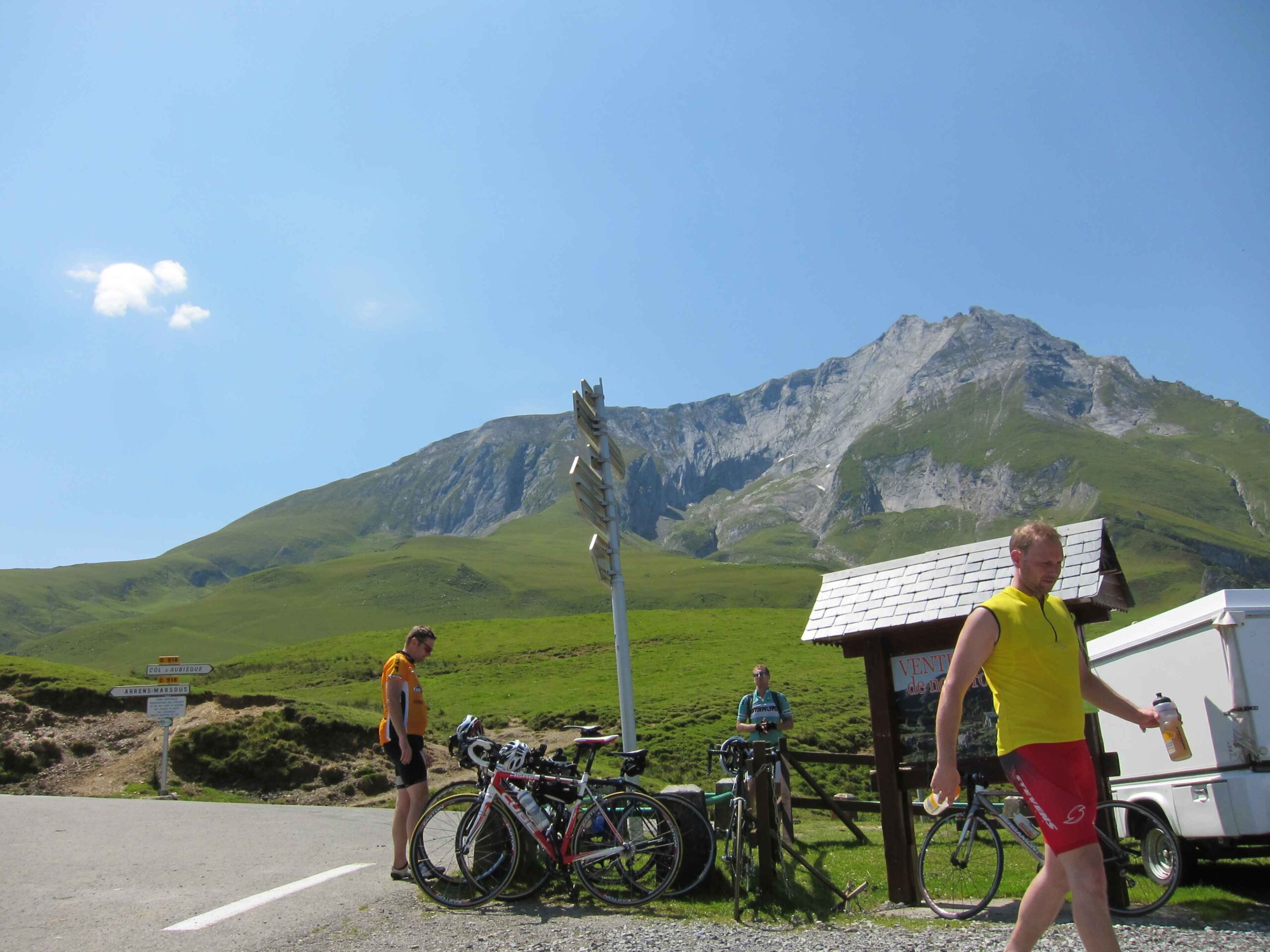 Nachdem wir den ersten Tag gut verkraftet hatten ging es heute in Richtung Osten über den Co de Solour zum Col d’Aubisque. Die Anfahrt durch das schmale Tal war schöner als wir es erwartet hatten und wir genossen die Fahrt in vollen Zügen. Am anstieg zum Solour angekommen ging es mit 9% gleich in die Vollen. Ca. 1-2 Kilometer vor dem Gipfel kam wir aus dem engen Tal heraus und hatten einen wundervollen Blick über den Talkessel hinweg auf den Schlussanstieg zum Col d’Aubisque. In den warmen Temperaturen lief mein Motor richtig gut und ich konnte mich etwas von den anderen absetzen und holte mir den Etappensieg am Col de Solour. Erfreulich war dort eine kleine Raststation, an der wir uns erfrischten und unsere Trinkflaschen netterweise von der Bedienung gefüllt wurden.Der weitere Anstieg zum Col d’Aubisque war genau nach dem Geschmack von Markus. Uns begleitete noch ein zumindest äußerlich ziemlich durchtrainierter Radfahrer, der uns zum Ende des Berges auch stehen ließ. Es folgten noch die obligatorischen Gipfelfotos, zumal dort die berühmten drei großen Räder der Tour stehen. In der Abfahrt war ich wieder in meinem Element, während sich Fayek insbesondere bei dem unbeleuchteten Tunnel nicht wirklich wohl fühlte.