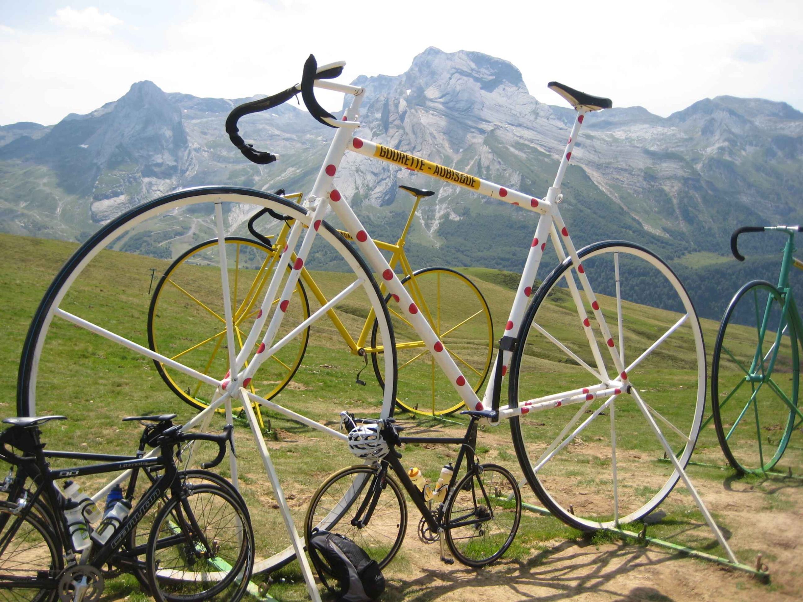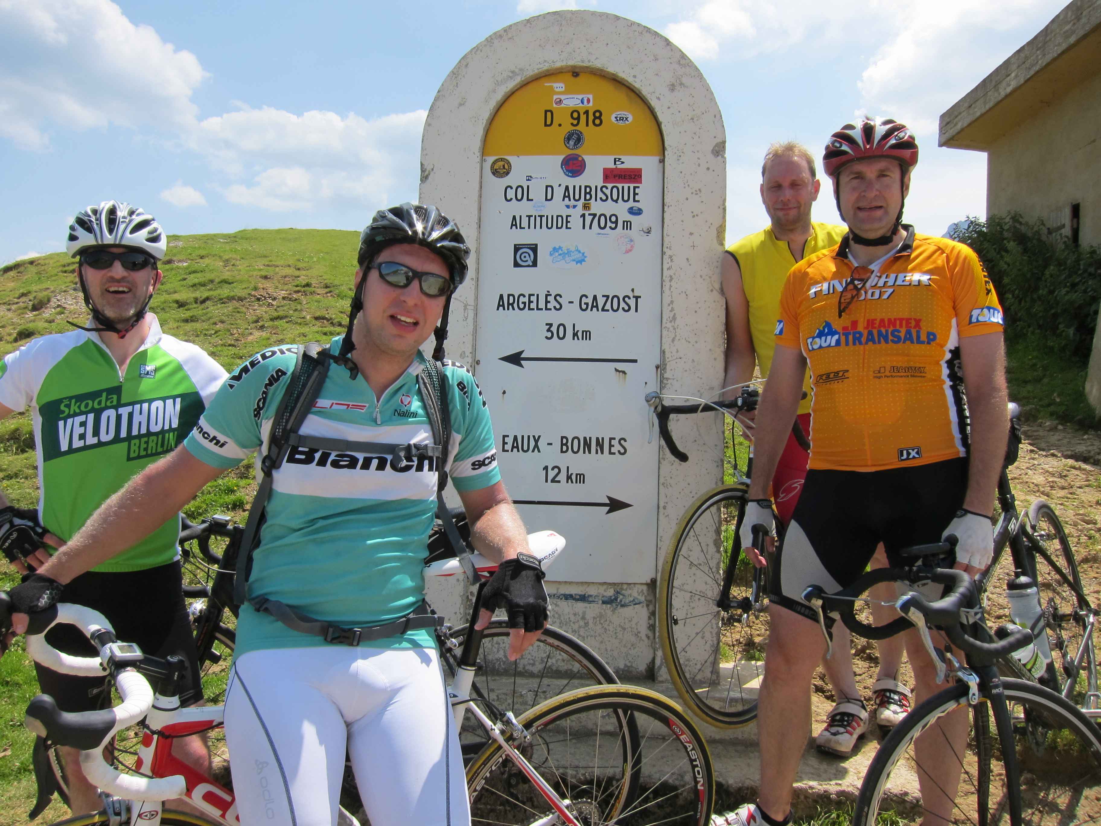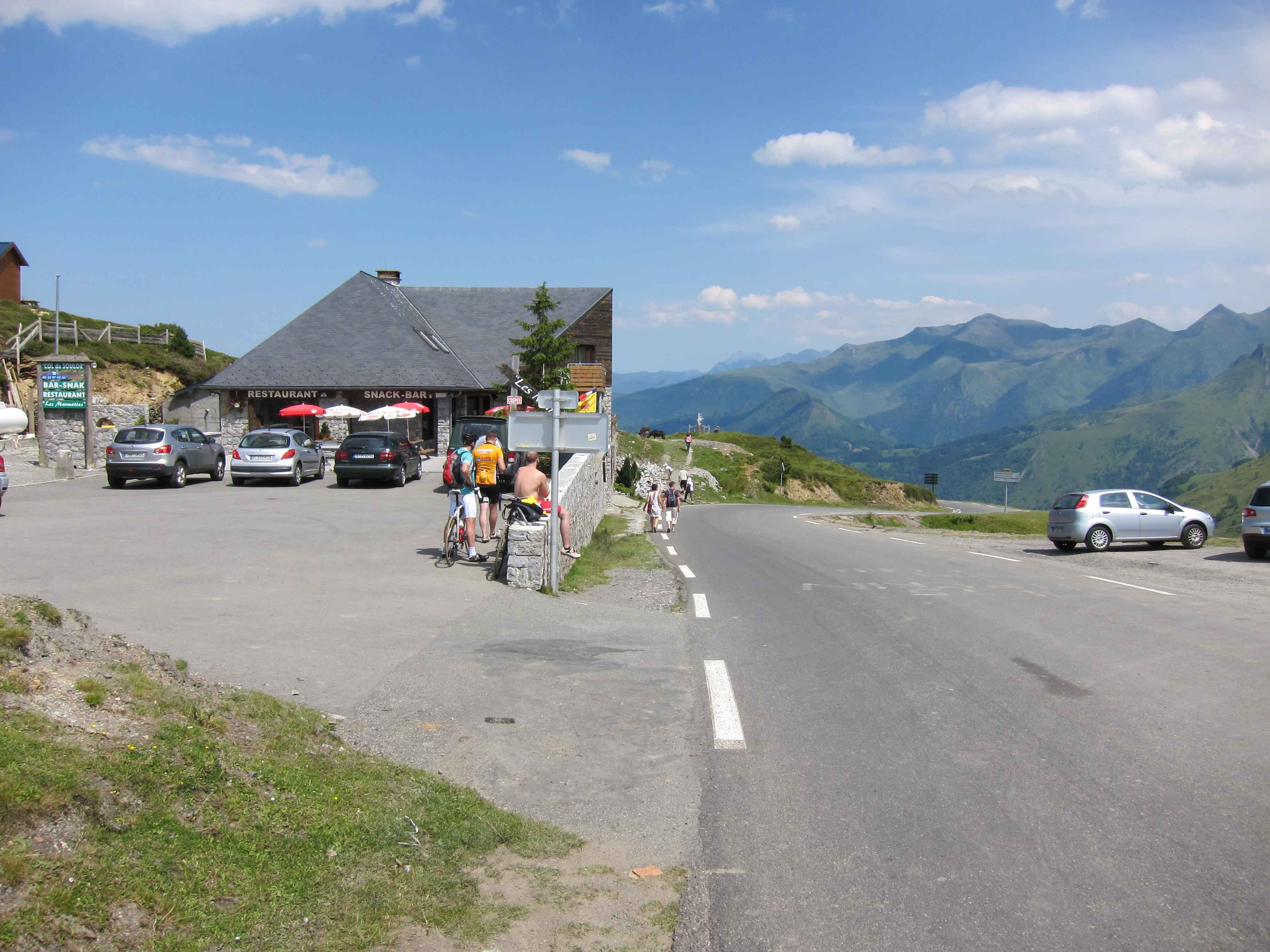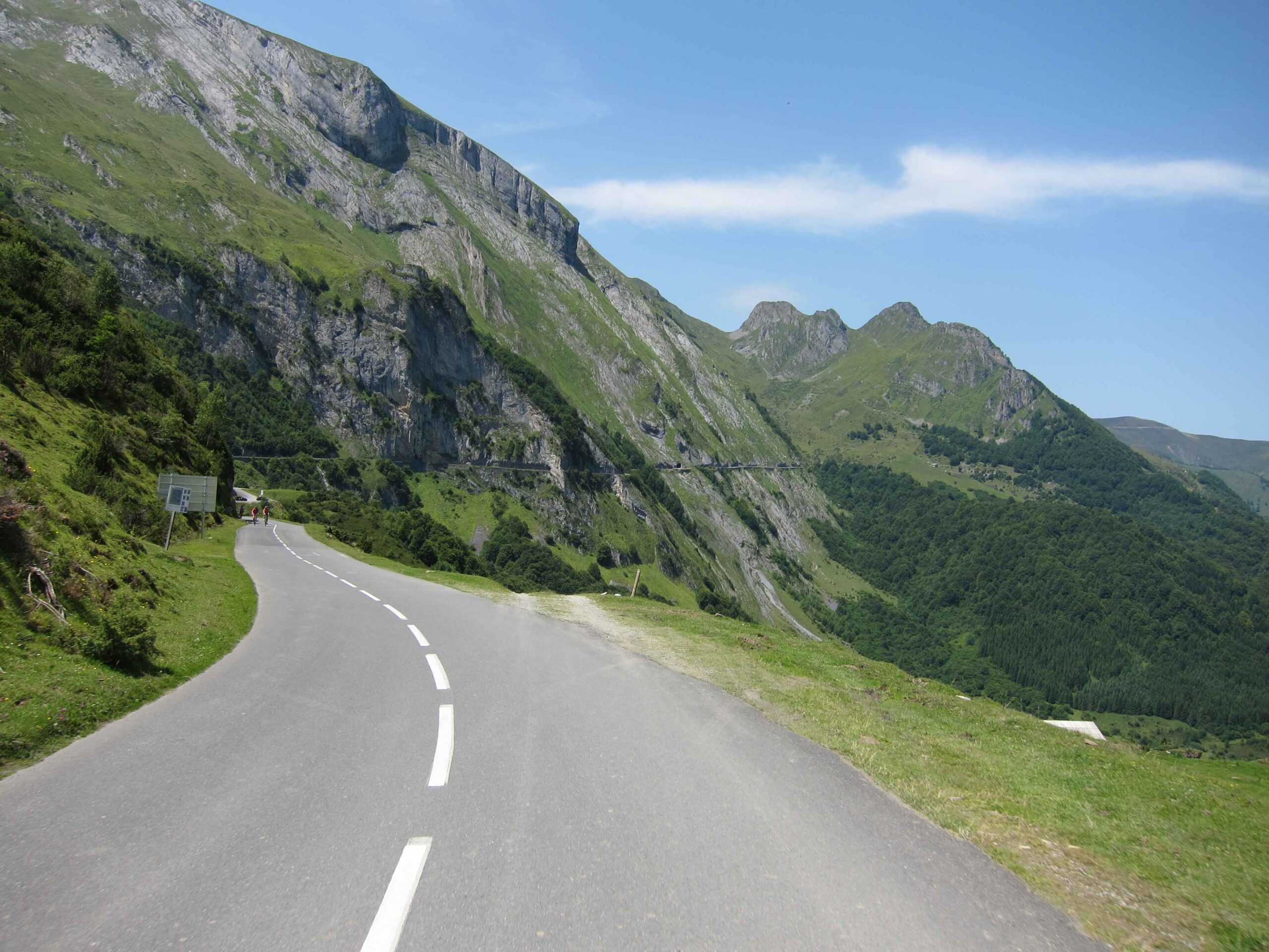 Nachdem wir den ersten Tag gut verkraftet hatten ging es heute in Richtung Osten über den Co de Solour zum Col d’Aubisque. Die Anfahrt durch das schmale Tal war schöner als wir es erwartet hatten und wir genossen die Fahrt in vollen Zügen. Am anstieg zum Solour angekommen ging es mit 9% gleich in die Vollen. Ca. 1-2 Kilometer vor dem Gipfel kam wir aus dem engen Tal heraus und hatten einen wundervollen Blick über den Talkessel hinweg auf den Schlussanstieg zum Col d’Aubisque. In den warmen Temperaturen lief mein Motor richtig gut und ich konnte mich etwas von den anderen absetzen und holte mir den Etappensieg am Col de Solour. Erfreulich war dort eine kleine Raststation, an der wir uns erfrischten und unsere Trinkflaschen netterweise von der Bedienung gefüllt wurden.Der weitere Anstieg zum Col d’Aubisque war genau nach dem Geschmack von Markus. Uns begleitete noch ein zumindest äußerlich ziemlich durchtrainierter Radfahrer, der uns zum Ende des Berges auch stehen ließ. Es folgten noch die obligatorischen Gipfelfotos, zumal dort die berühmten drei großen Räder der Tour stehen. In der Abfahrt war ich wieder in meinem Element, während sich Fayek insbesondere bei dem unbeleuchteten Tunnel nicht wirklich wohl fühlte.