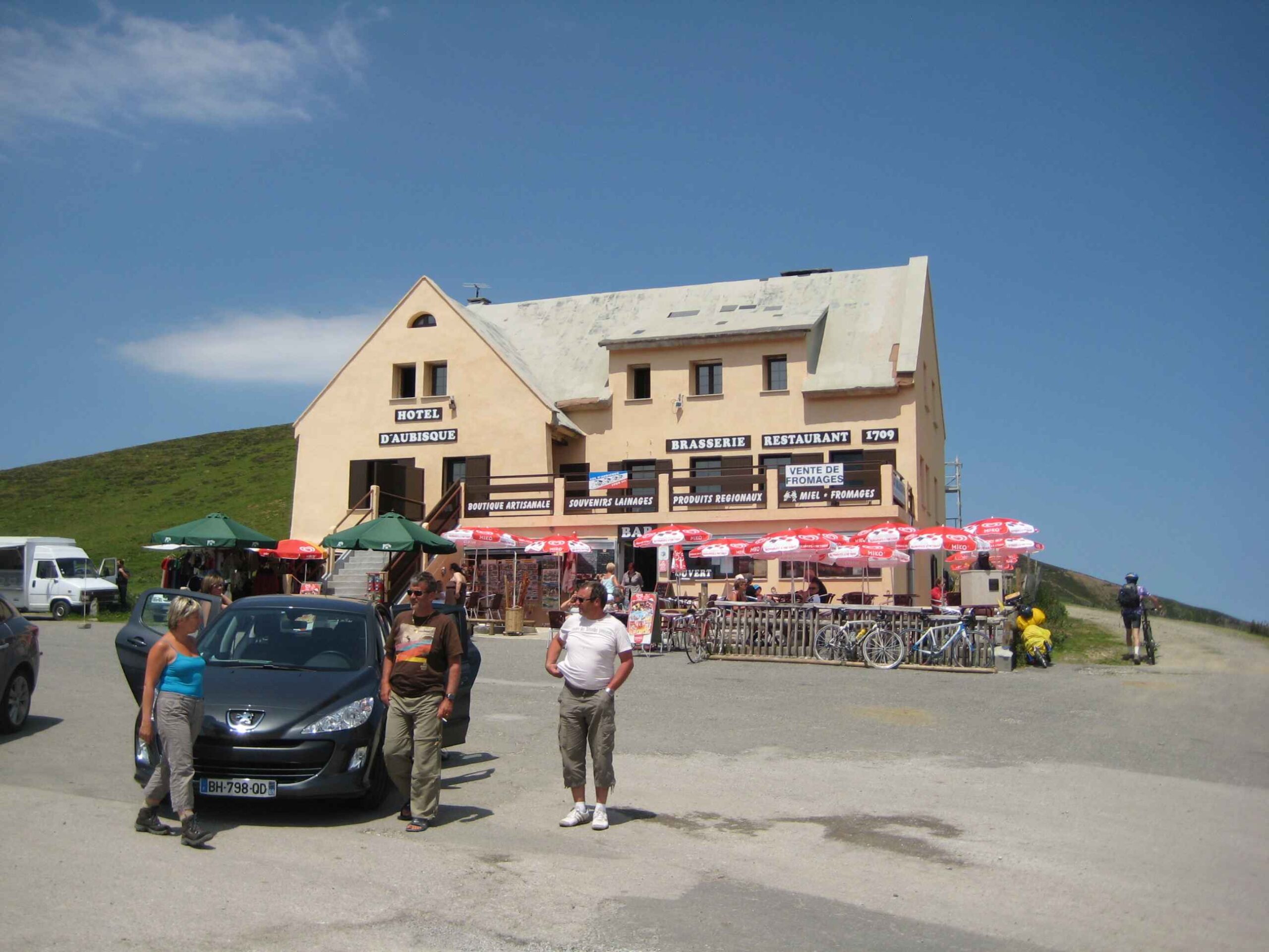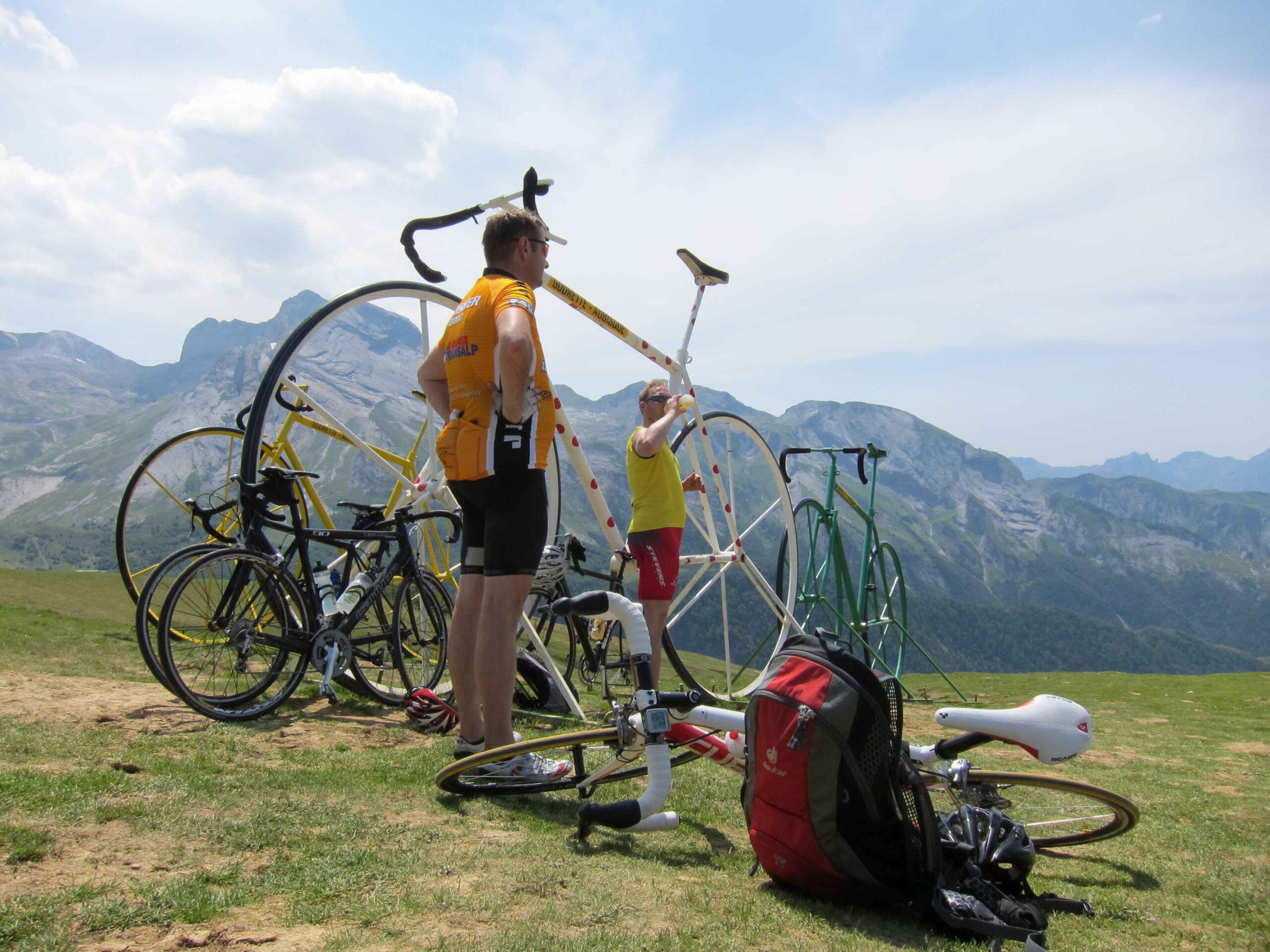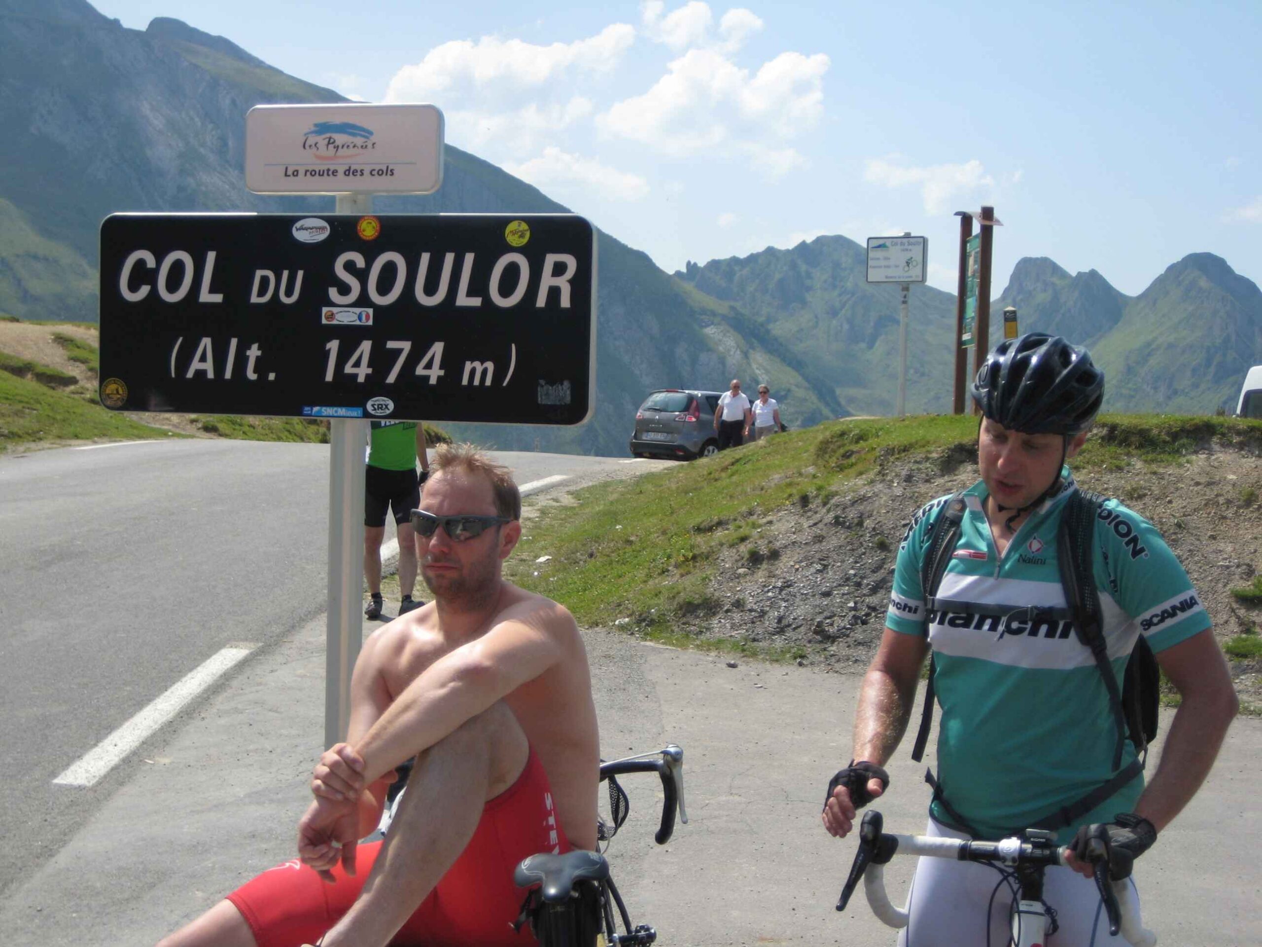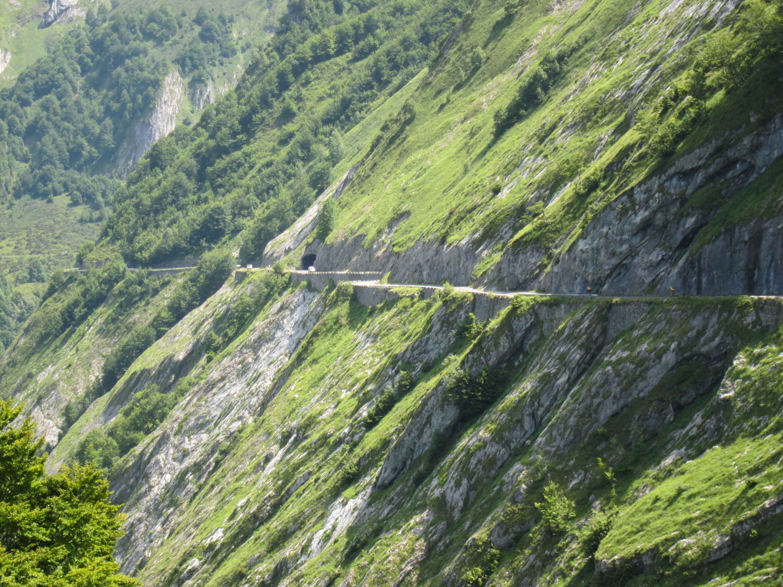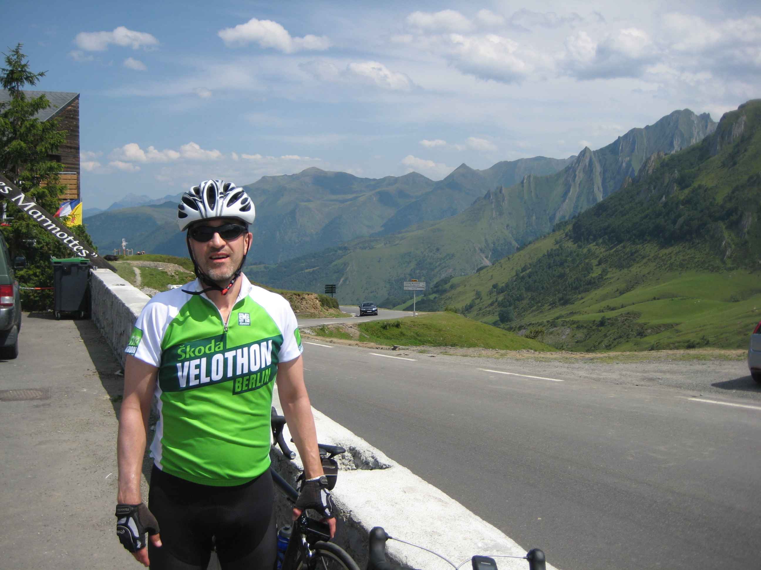 Nachdem wir den ersten Tag gut verkraftet hatten ging es heute in Richtung Osten über den Co de Solour zum Col d’Aubisque. Die Anfahrt durch das schmale Tal war schöner als wir es erwartet hatten und wir genossen die Fahrt in vollen Zügen. Am anstieg zum Solour angekommen ging es mit 9% gleich in die Vollen. Ca. 1-2 Kilometer vor dem Gipfel kam wir aus dem engen Tal heraus und hatten einen wundervollen Blick über den Talkessel hinweg auf den Schlussanstieg zum Col d’Aubisque. In den warmen Temperaturen lief mein Motor richtig gut und ich konnte mich etwas von den anderen absetzen und holte mir den Etappensieg am Col de Solour. Erfreulich war dort eine kleine Raststation, an der wir uns erfrischten und unsere Trinkflaschen netterweise von der Bedienung gefüllt wurden.Der weitere Anstieg zum Col d’Aubisque war genau nach dem Geschmack von Markus. Uns begleitete noch ein zumindest äußerlich ziemlich durchtrainierter Radfahrer, der uns zum Ende des Berges auch stehen ließ. Es folgten noch die obligatorischen Gipfelfotos, zumal dort die berühmten drei großen Räder der Tour stehen. In der Abfahrt war ich wieder in meinem Element, während sich Fayek insbesondere bei dem unbeleuchteten Tunnel nicht wirklich wohl fühlte.