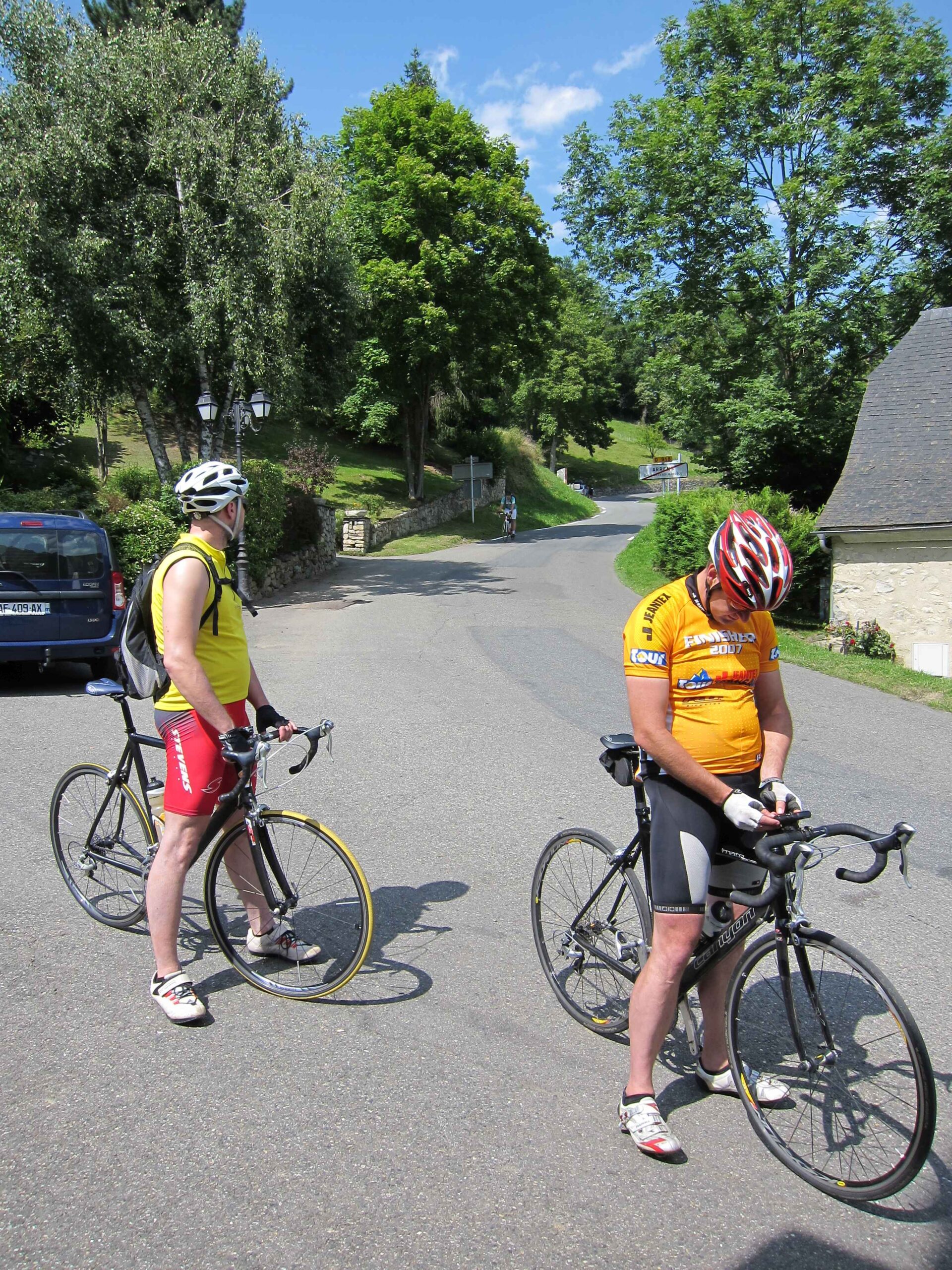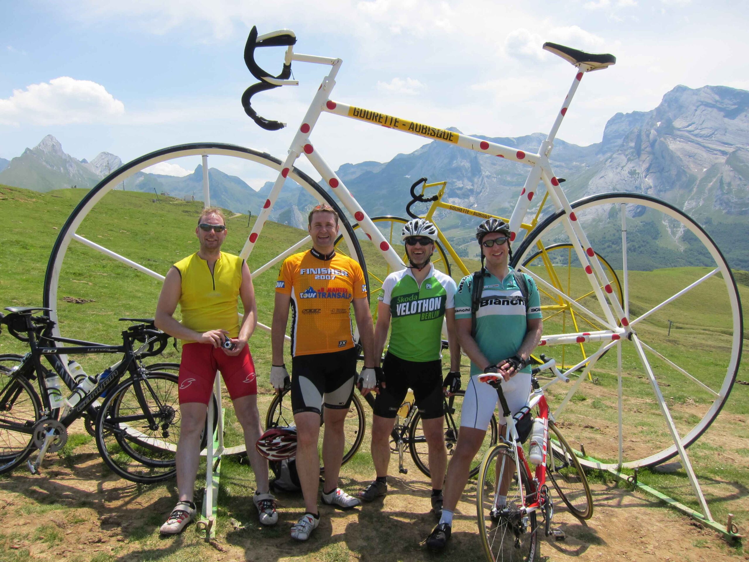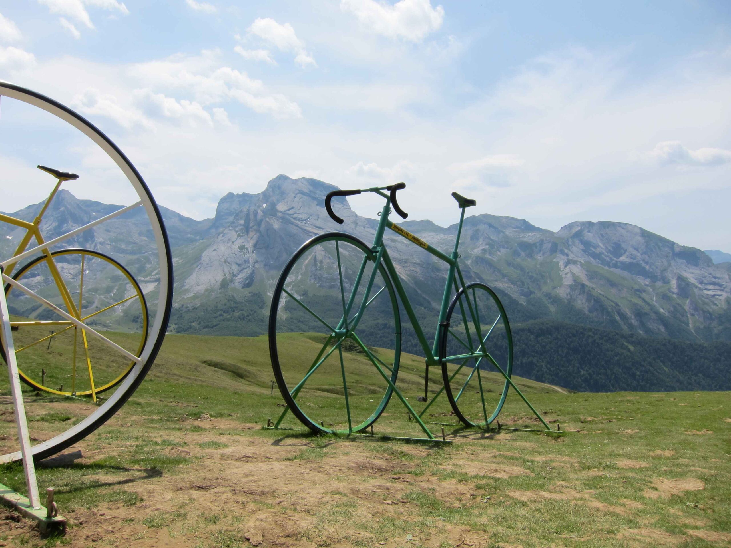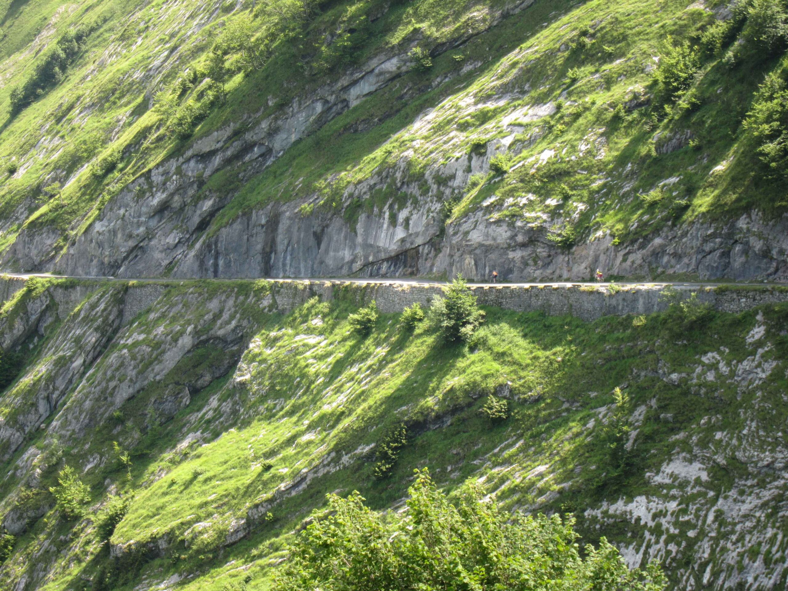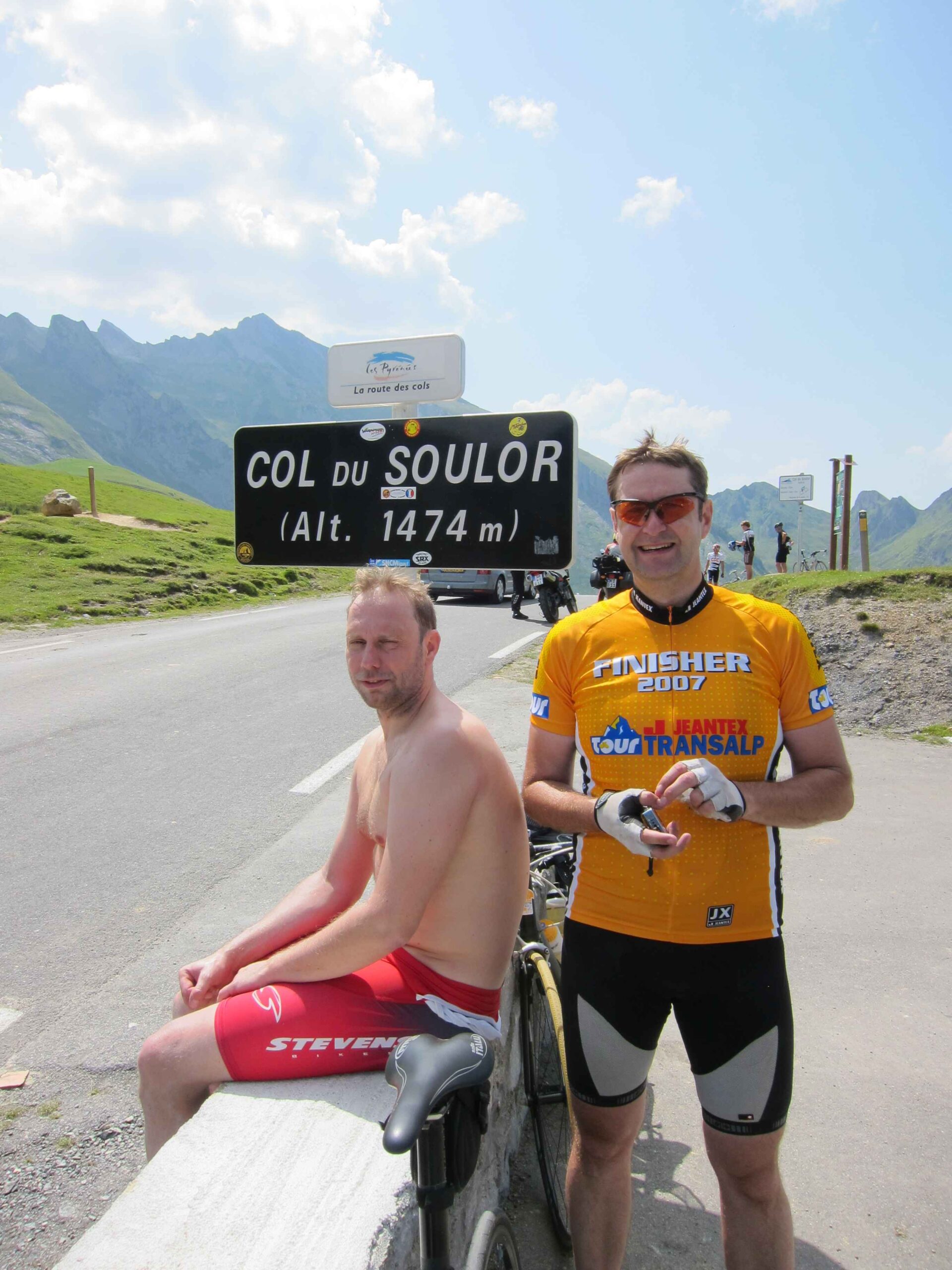 Nachdem wir den ersten Tag gut verkraftet hatten ging es heute in Richtung Osten über den Co de Solour zum Col d’Aubisque. Die Anfahrt durch das schmale Tal war schöner als wir es erwartet hatten und wir genossen die Fahrt in vollen Zügen. Am anstieg zum Solour angekommen ging es mit 9% gleich in die Vollen. Ca. 1-2 Kilometer vor dem Gipfel kam wir aus dem engen Tal heraus und hatten einen wundervollen Blick über den Talkessel hinweg auf den Schlussanstieg zum Col d’Aubisque. In den warmen Temperaturen lief mein Motor richtig gut und ich konnte mich etwas von den anderen absetzen und holte mir den Etappensieg am Col de Solour. Erfreulich war dort eine kleine Raststation, an der wir uns erfrischten und unsere Trinkflaschen netterweise von der Bedienung gefüllt wurden.Der weitere Anstieg zum Col d’Aubisque war genau nach dem Geschmack von Markus. Uns begleitete noch ein zumindest äußerlich ziemlich durchtrainierter Radfahrer, der uns zum Ende des Berges auch stehen ließ. Es folgten noch die obligatorischen Gipfelfotos, zumal dort die berühmten drei großen Räder der Tour stehen. In der Abfahrt war ich wieder in meinem Element, während sich Fayek insbesondere bei dem unbeleuchteten Tunnel nicht wirklich wohl fühlte.