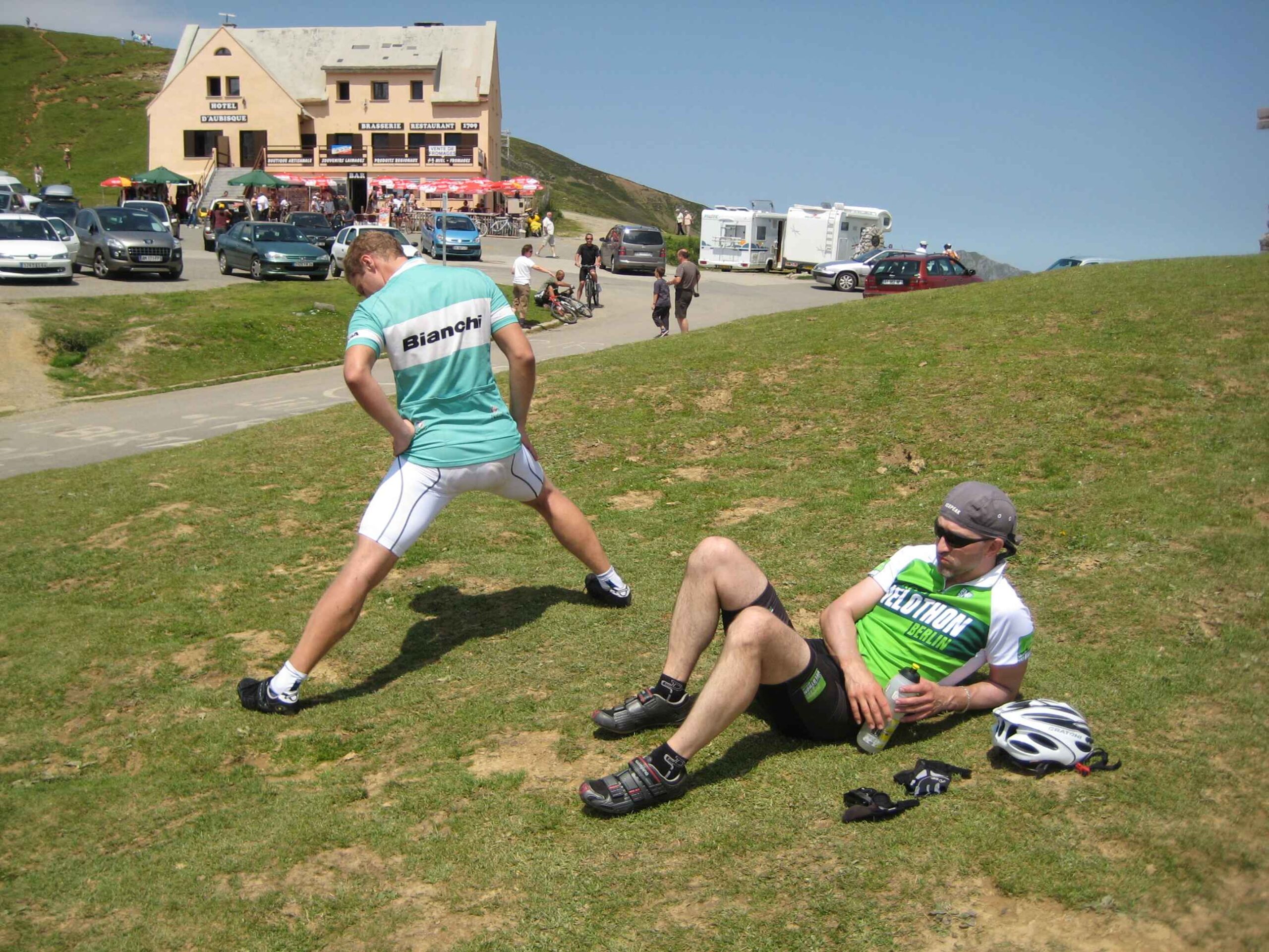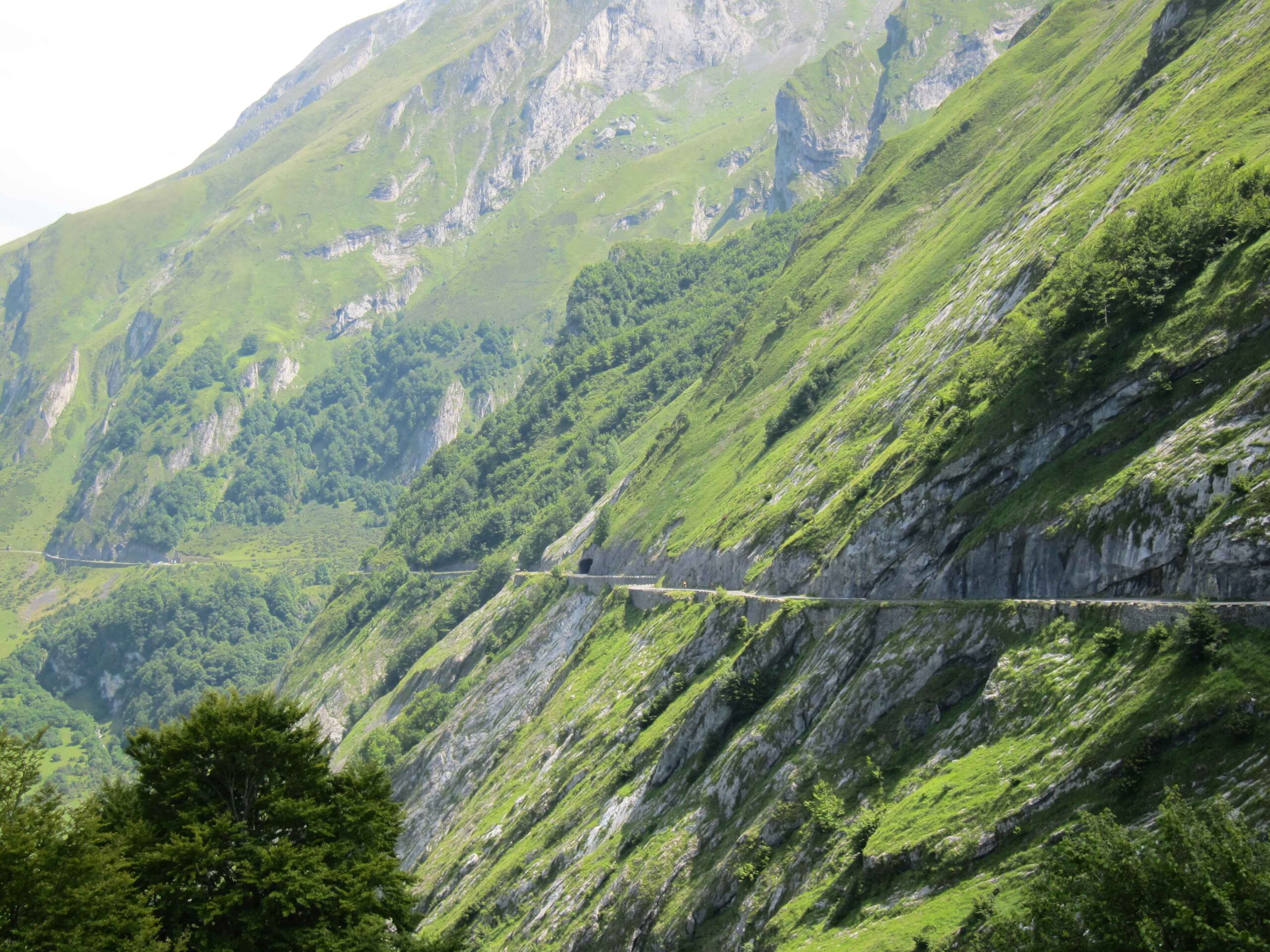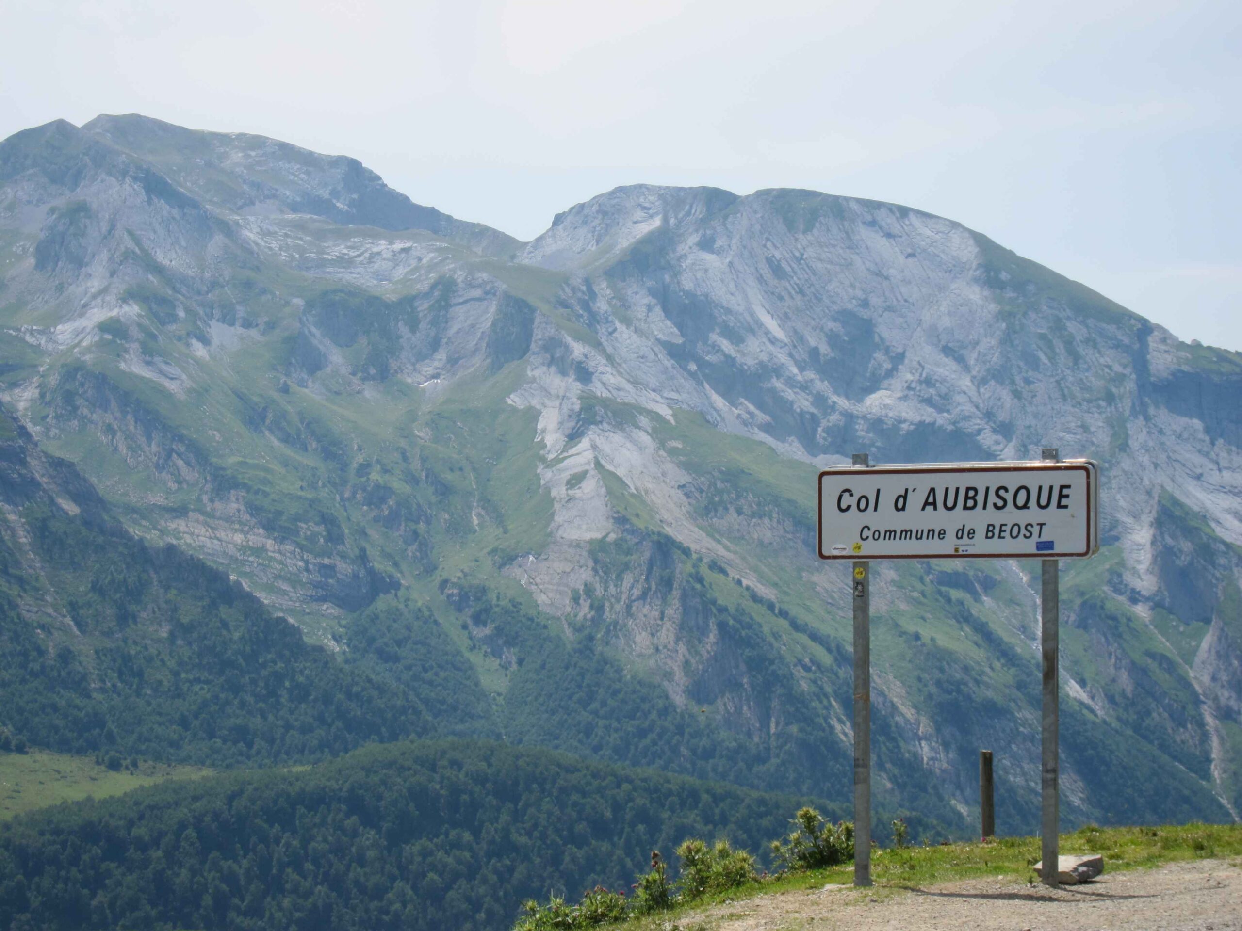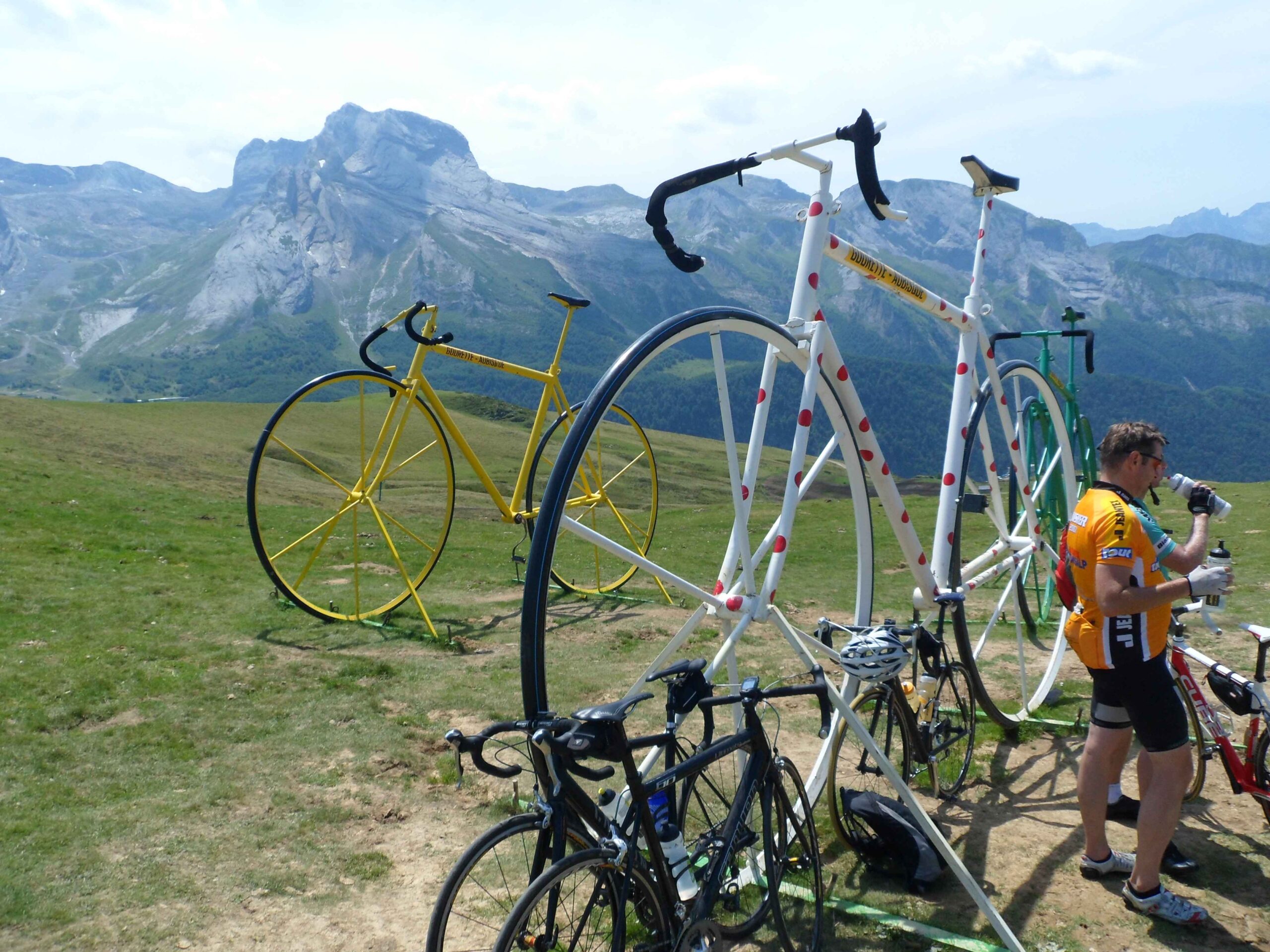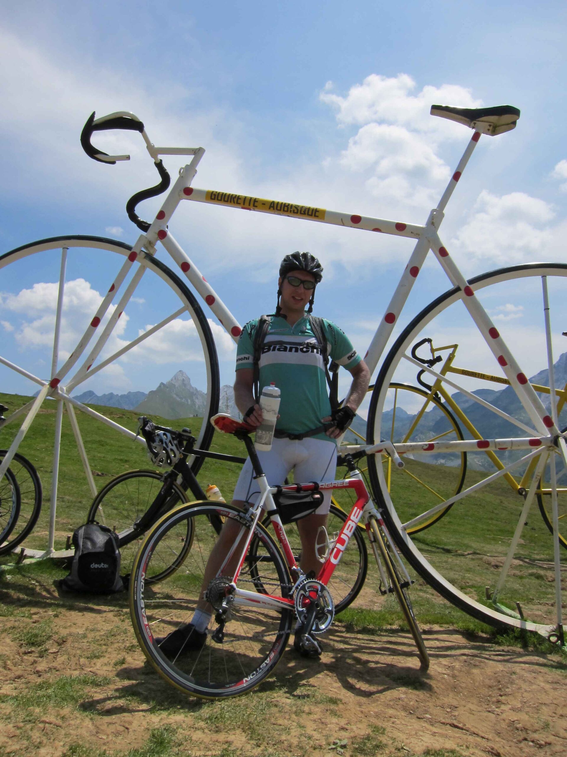 Nachdem wir den ersten Tag gut verkraftet hatten ging es heute in Richtung Osten über den Co de Solour zum Col d’Aubisque. Die Anfahrt durch das schmale Tal war schöner als wir es erwartet hatten und wir genossen die Fahrt in vollen Zügen. Am anstieg zum Solour angekommen ging es mit 9% gleich in die Vollen. Ca. 1-2 Kilometer vor dem Gipfel kam wir aus dem engen Tal heraus und hatten einen wundervollen Blick über den Talkessel hinweg auf den Schlussanstieg zum Col d’Aubisque. In den warmen Temperaturen lief mein Motor richtig gut und ich konnte mich etwas von den anderen absetzen und holte mir den Etappensieg am Col de Solour. Erfreulich war dort eine kleine Raststation, an der wir uns erfrischten und unsere Trinkflaschen netterweise von der Bedienung gefüllt wurden.Der weitere Anstieg zum Col d’Aubisque war genau nach dem Geschmack von Markus. Uns begleitete noch ein zumindest äußerlich ziemlich durchtrainierter Radfahrer, der uns zum Ende des Berges auch stehen ließ. Es folgten noch die obligatorischen Gipfelfotos, zumal dort die berühmten drei großen Räder der Tour stehen. In der Abfahrt war ich wieder in meinem Element, während sich Fayek insbesondere bei dem unbeleuchteten Tunnel nicht wirklich wohl fühlte.