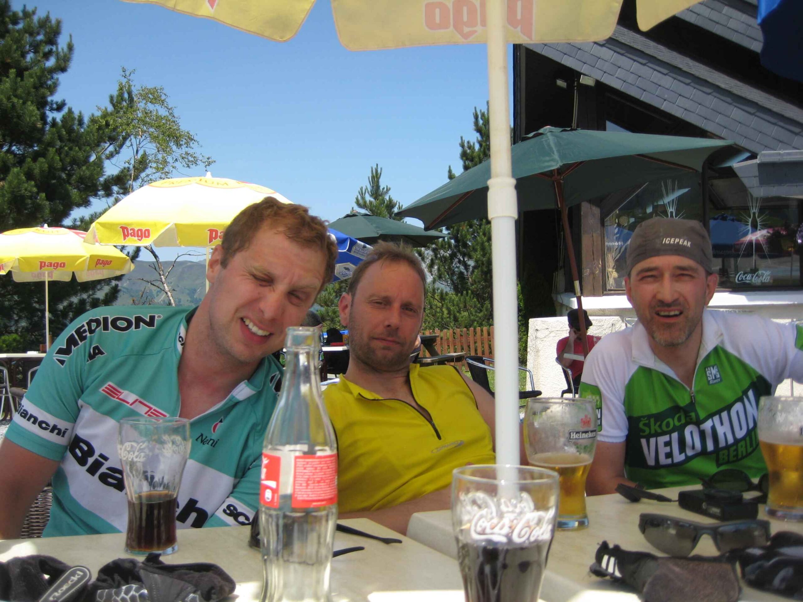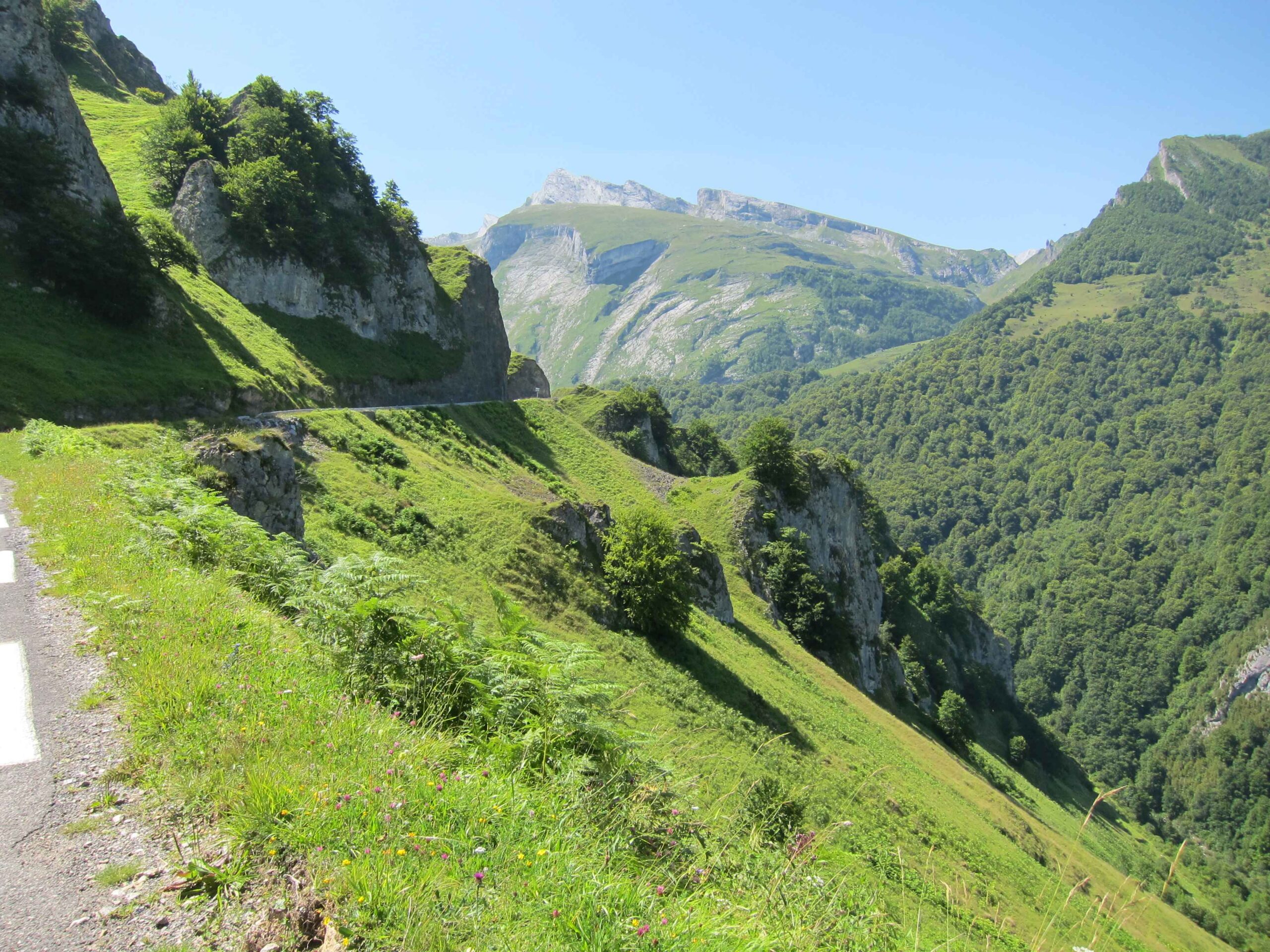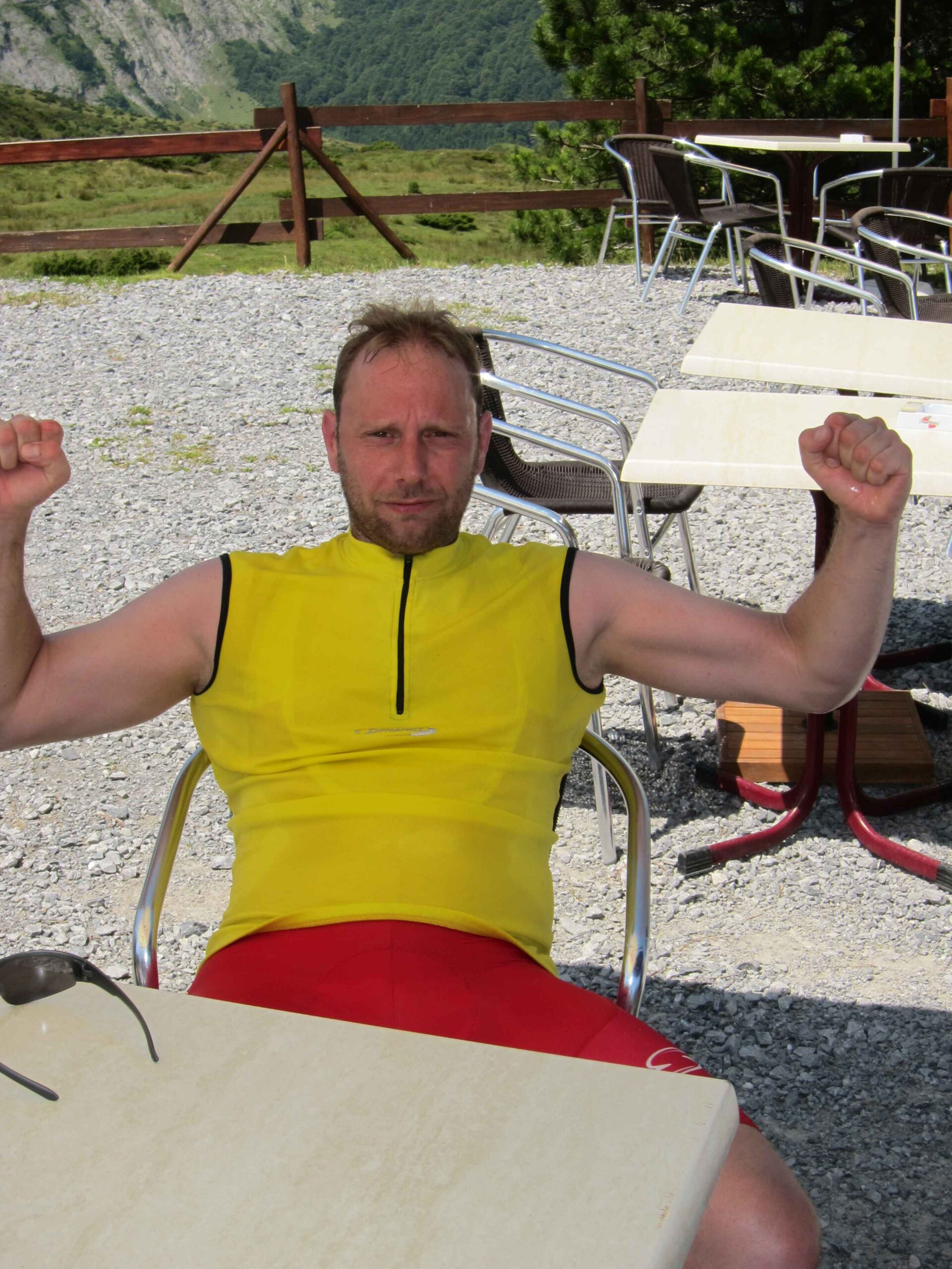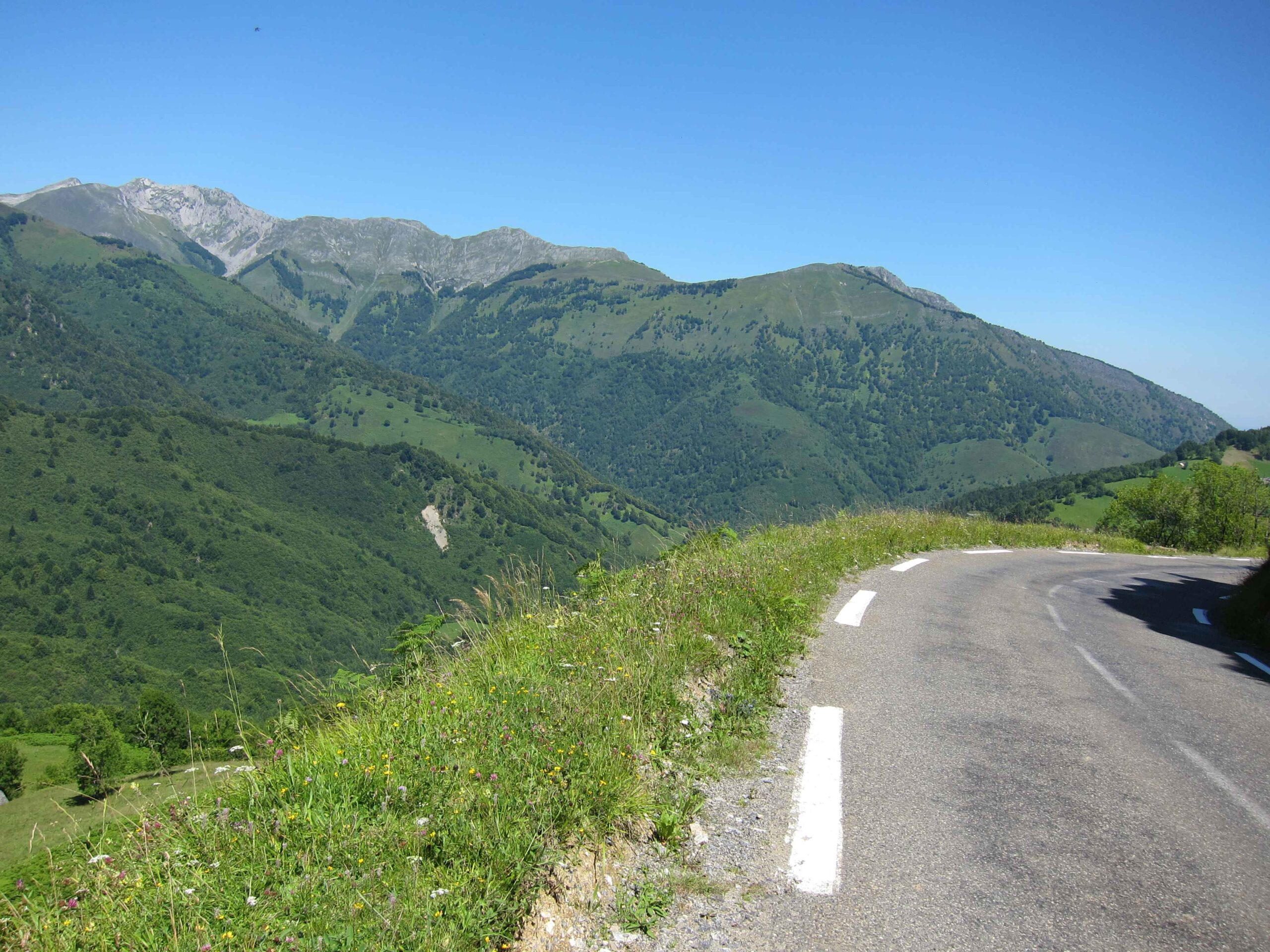 Nachdem wir den ersten Tag gut verkraftet hatten ging es heute in Richtung Osten über den Co de Solour zum Col d’Aubisque. Die Anfahrt durch das schmale Tal war schöner als wir es erwartet hatten und wir genossen die Fahrt in vollen Zügen. Am anstieg zum Solour angekommen ging es mit 9% gleich in die Vollen. Ca. 1-2 Kilometer vor dem Gipfel kam wir aus dem engen Tal heraus und hatten einen wundervollen Blick über den Talkessel hinweg auf den Schlussanstieg zum Col d’Aubisque. In den warmen Temperaturen lief mein Motor richtig gut und ich konnte mich etwas von den anderen absetzen und holte mir den Etappensieg am Col de Solour. Erfreulich war dort eine kleine Raststation, an der wir uns erfrischten und unsere Trinkflaschen netterweise von der Bedienung gefüllt wurden.Der weitere Anstieg zum Col d’Aubisque war genau nach dem Geschmack von Markus. Uns begleitete noch ein zumindest äußerlich ziemlich durchtrainierter Radfahrer, der uns zum Ende des Berges auch stehen ließ. Es folgten noch die obligatorischen Gipfelfotos, zumal dort die berühmten drei großen Räder der Tour stehen. In der Abfahrt war ich wieder in meinem Element, während sich Fayek insbesondere bei dem unbeleuchteten Tunnel nicht wirklich wohl fühlte.