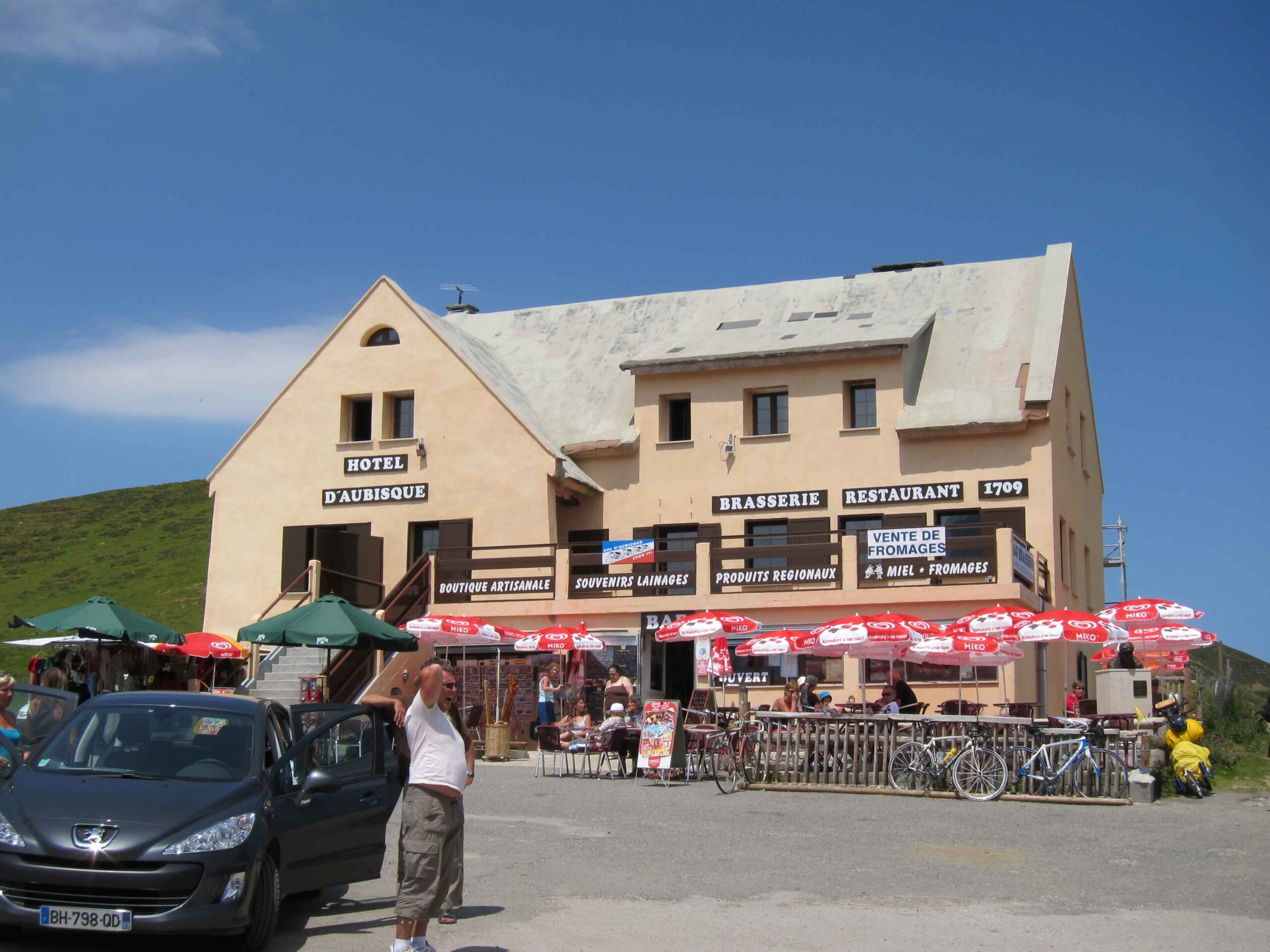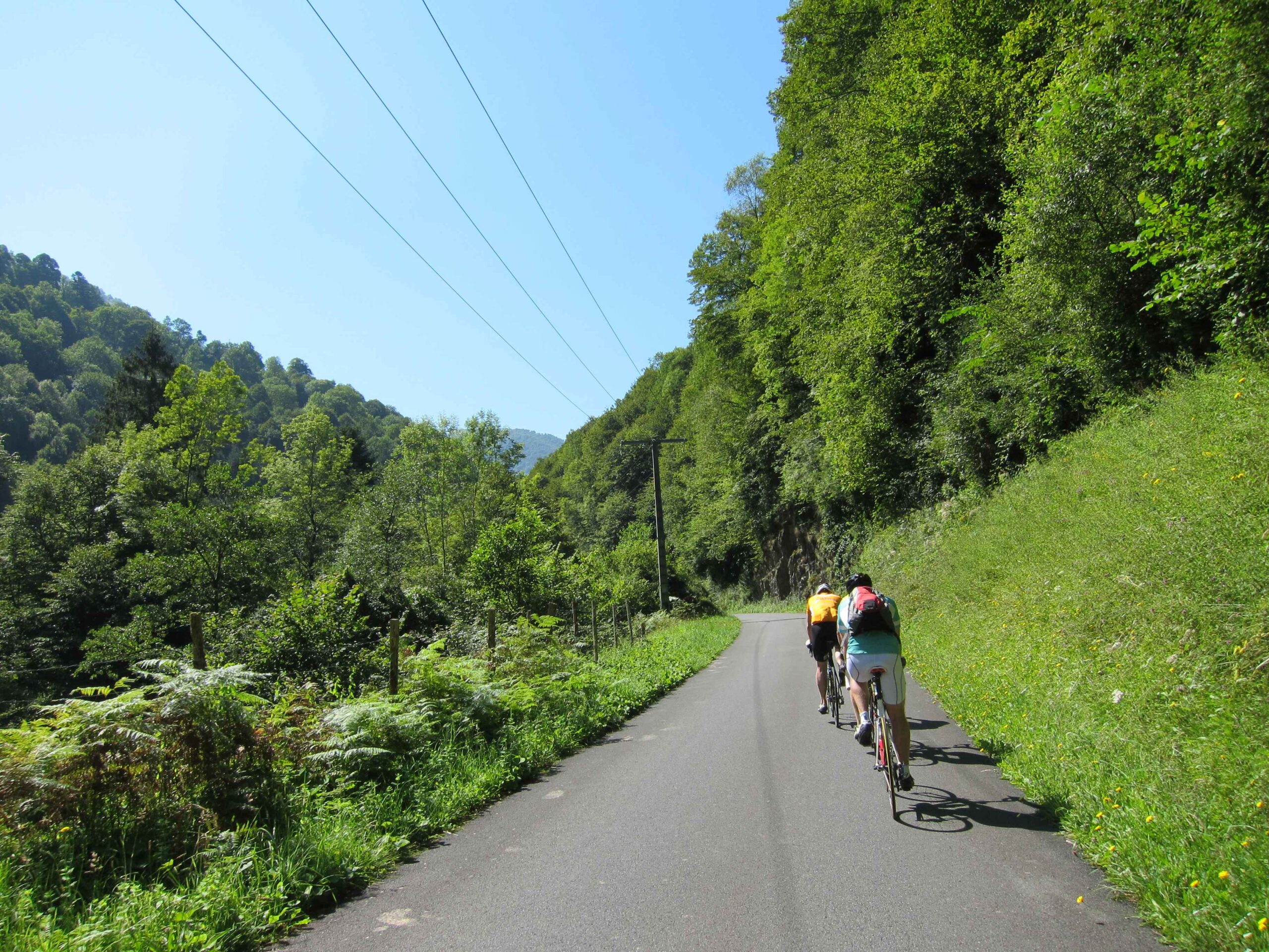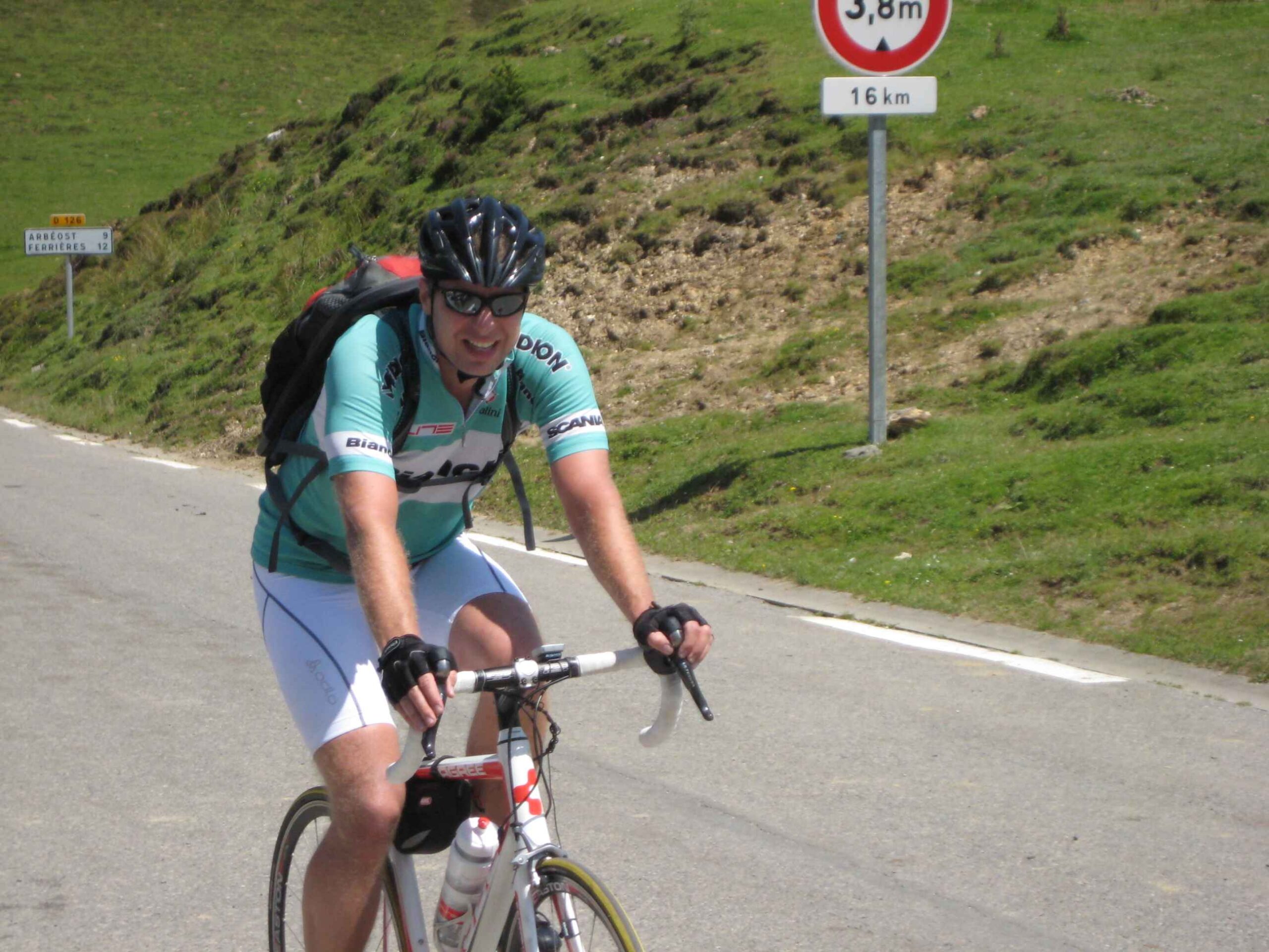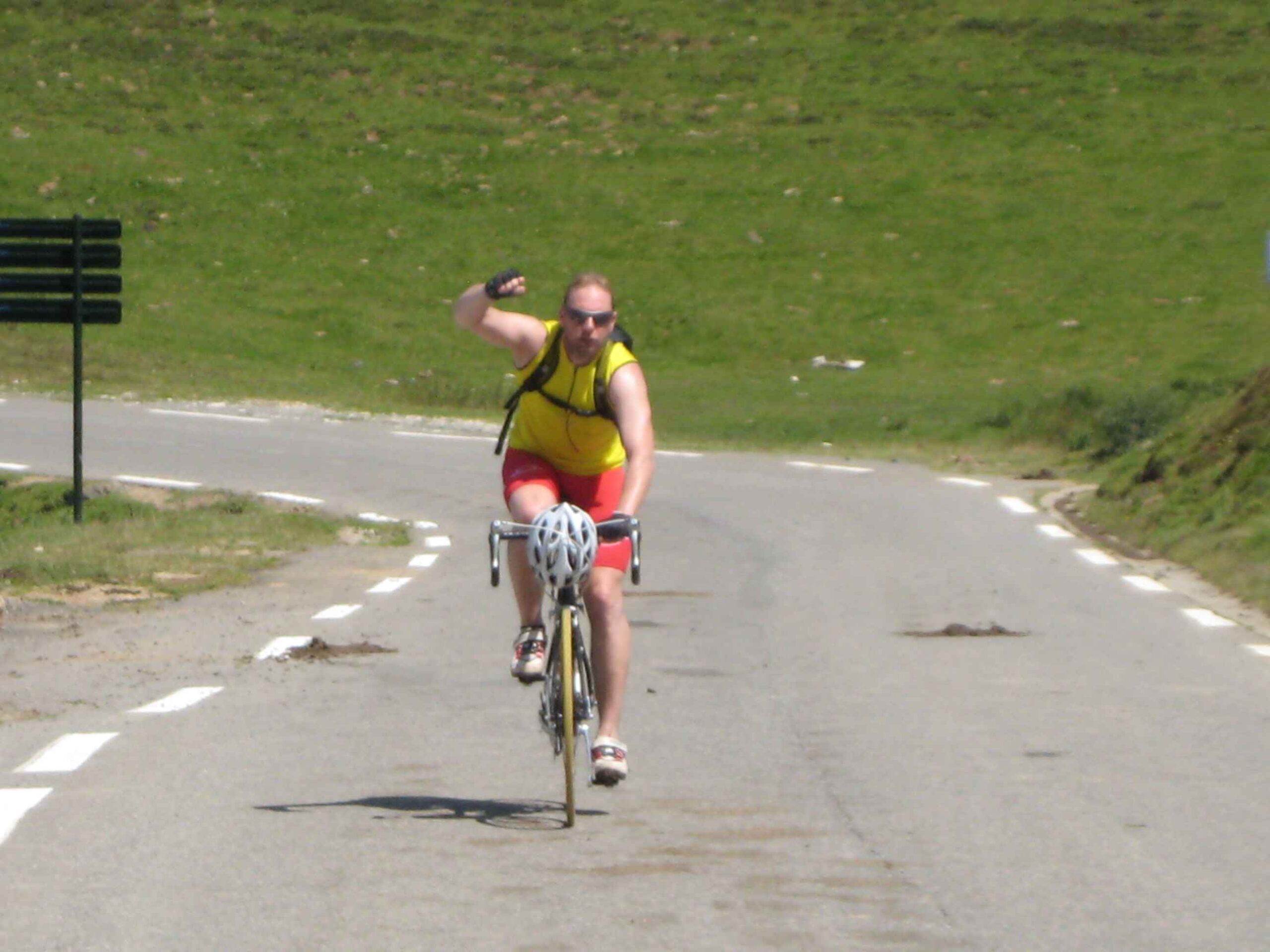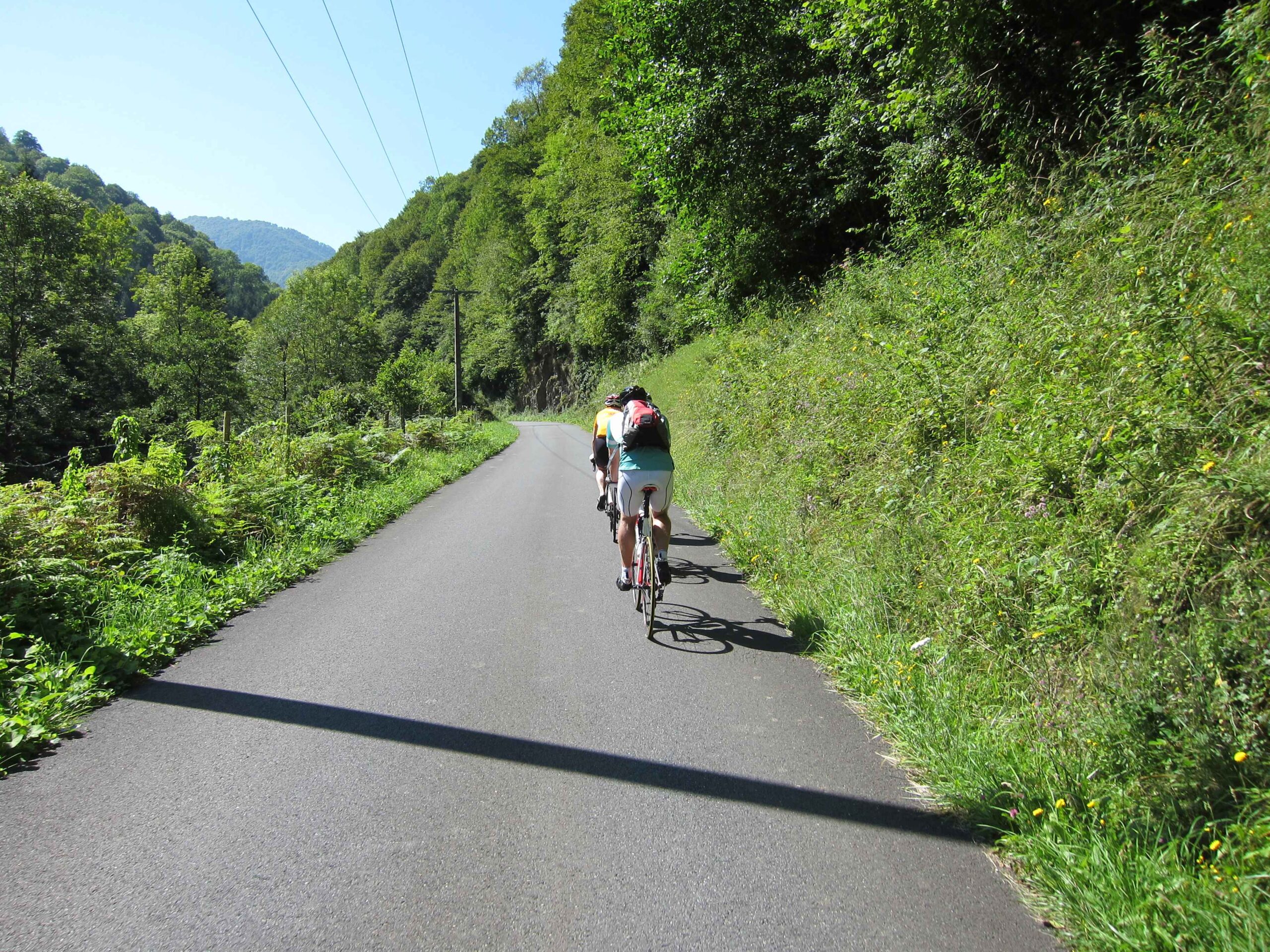 Nachdem wir den ersten Tag gut verkraftet hatten ging es heute in Richtung Osten über den Co de Solour zum Col d’Aubisque. Die Anfahrt durch das schmale Tal war schöner als wir es erwartet hatten und wir genossen die Fahrt in vollen Zügen. Am anstieg zum Solour angekommen ging es mit 9% gleich in die Vollen. Ca. 1-2 Kilometer vor dem Gipfel kam wir aus dem engen Tal heraus und hatten einen wundervollen Blick über den Talkessel hinweg auf den Schlussanstieg zum Col d’Aubisque. In den warmen Temperaturen lief mein Motor richtig gut und ich konnte mich etwas von den anderen absetzen und holte mir den Etappensieg am Col de Solour. Erfreulich war dort eine kleine Raststation, an der wir uns erfrischten und unsere Trinkflaschen netterweise von der Bedienung gefüllt wurden.Der weitere Anstieg zum Col d’Aubisque war genau nach dem Geschmack von Markus. Uns begleitete noch ein zumindest äußerlich ziemlich durchtrainierter Radfahrer, der uns zum Ende des Berges auch stehen ließ. Es folgten noch die obligatorischen Gipfelfotos, zumal dort die berühmten drei großen Räder der Tour stehen. In der Abfahrt war ich wieder in meinem Element, während sich Fayek insbesondere bei dem unbeleuchteten Tunnel nicht wirklich wohl fühlte.