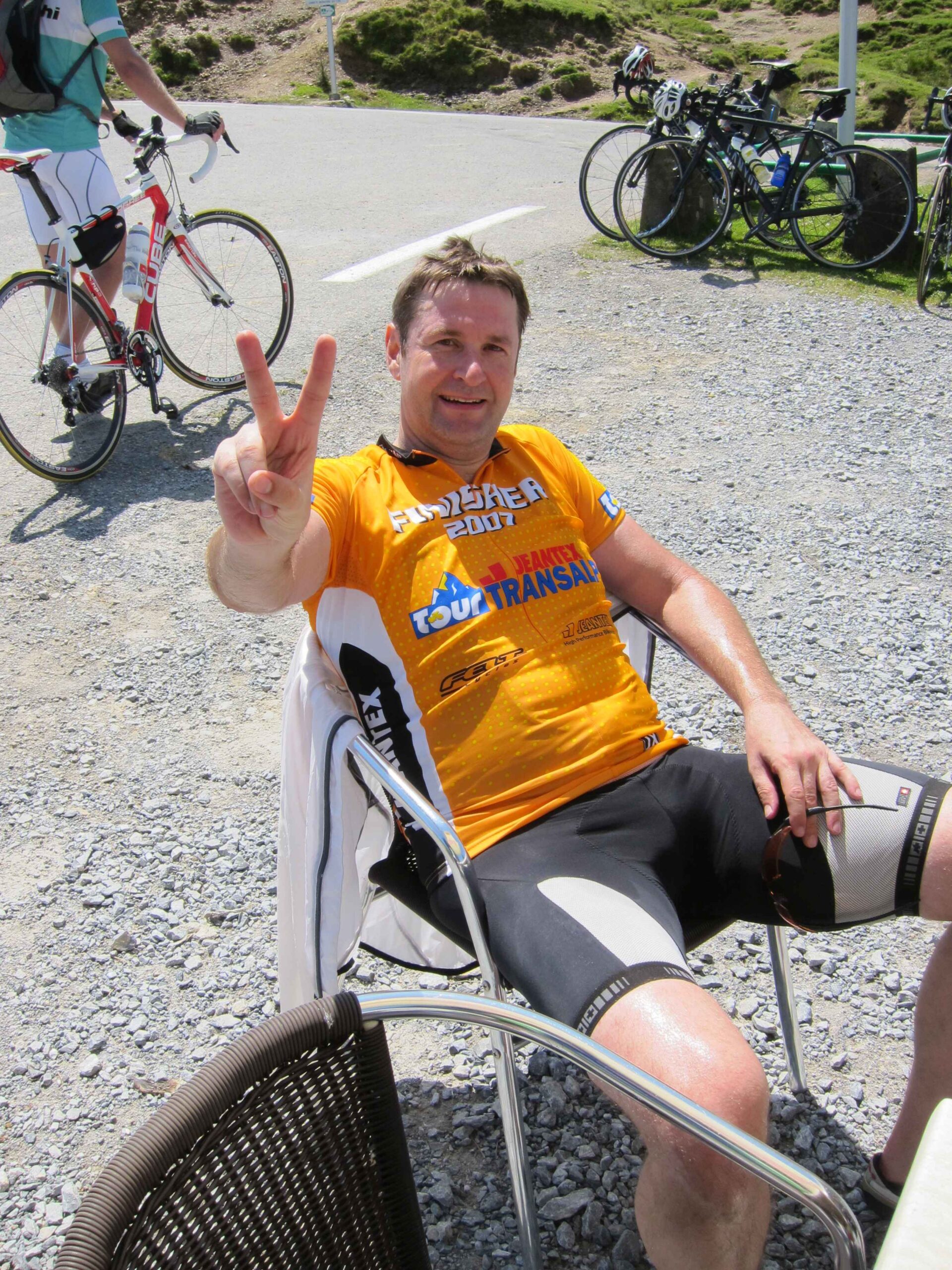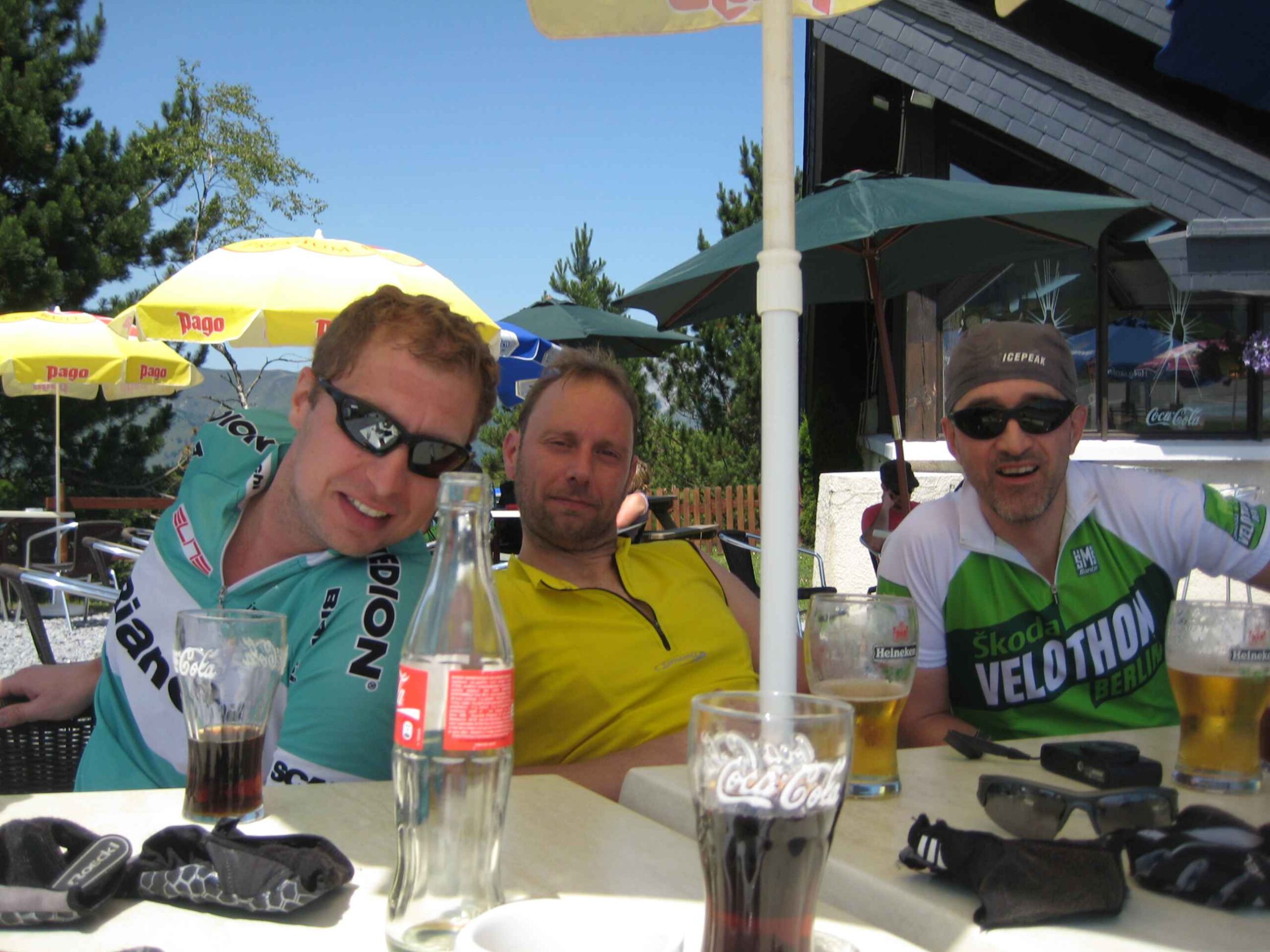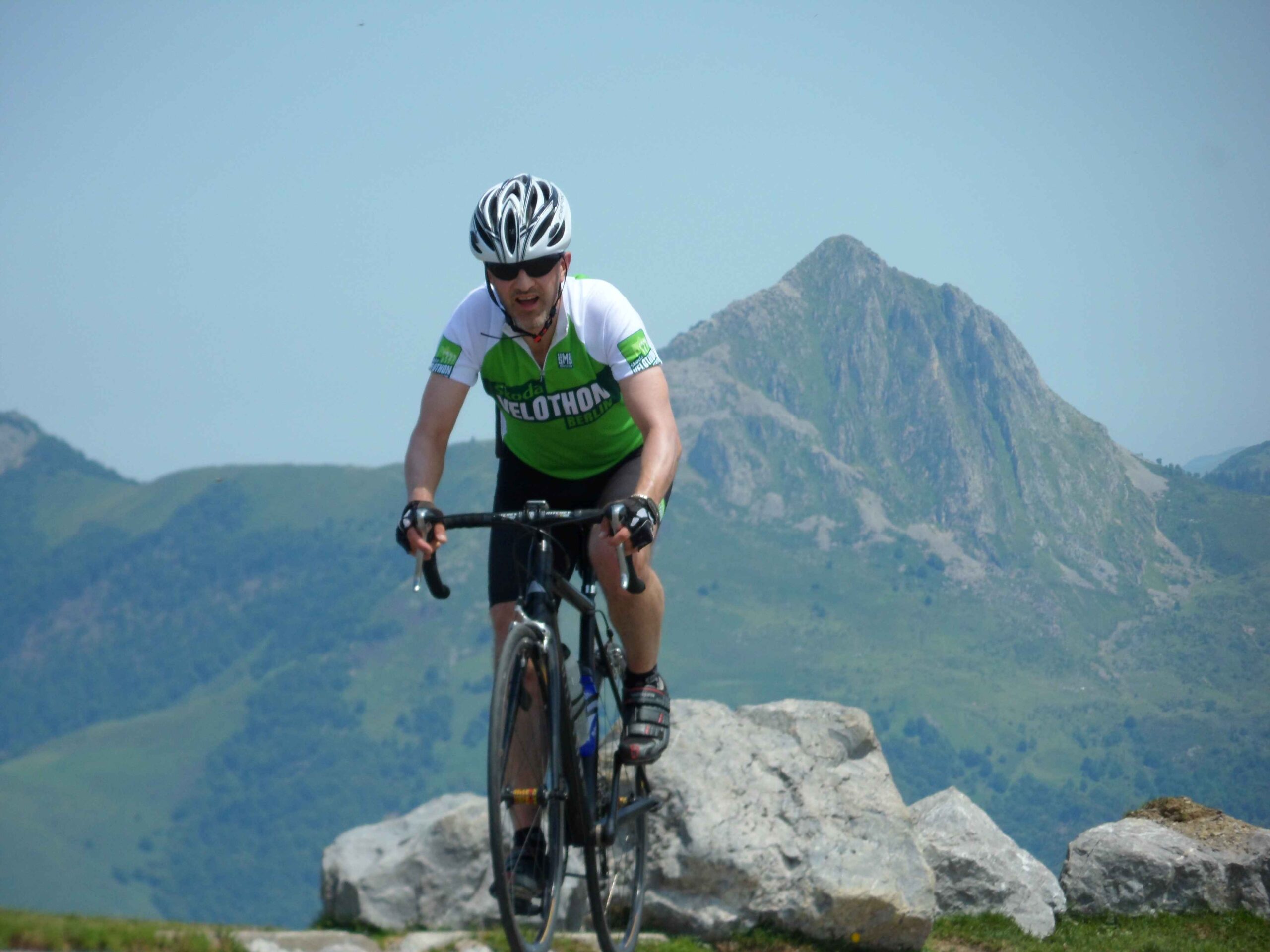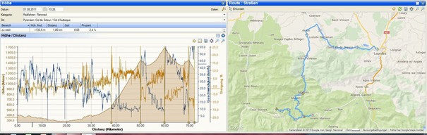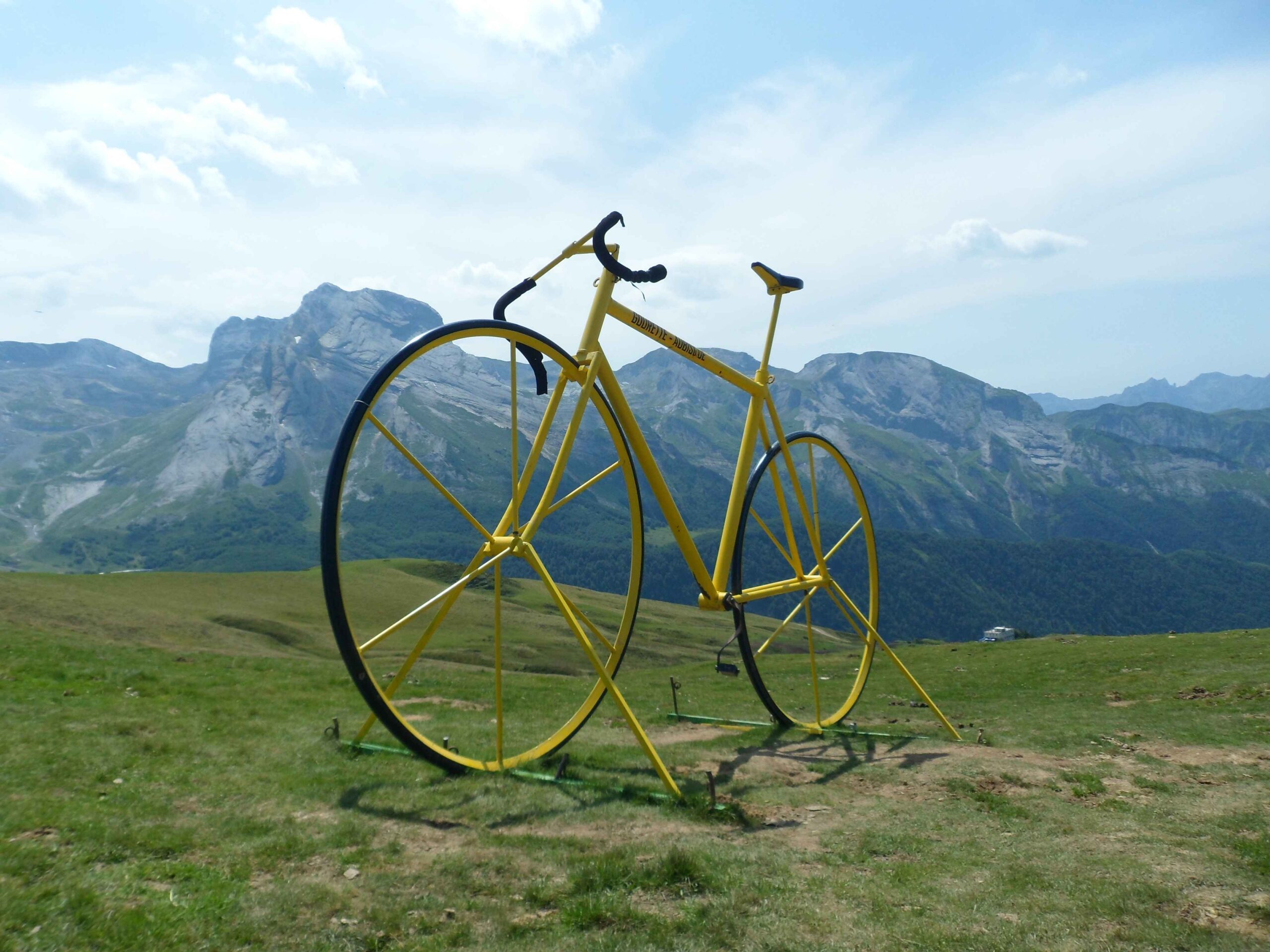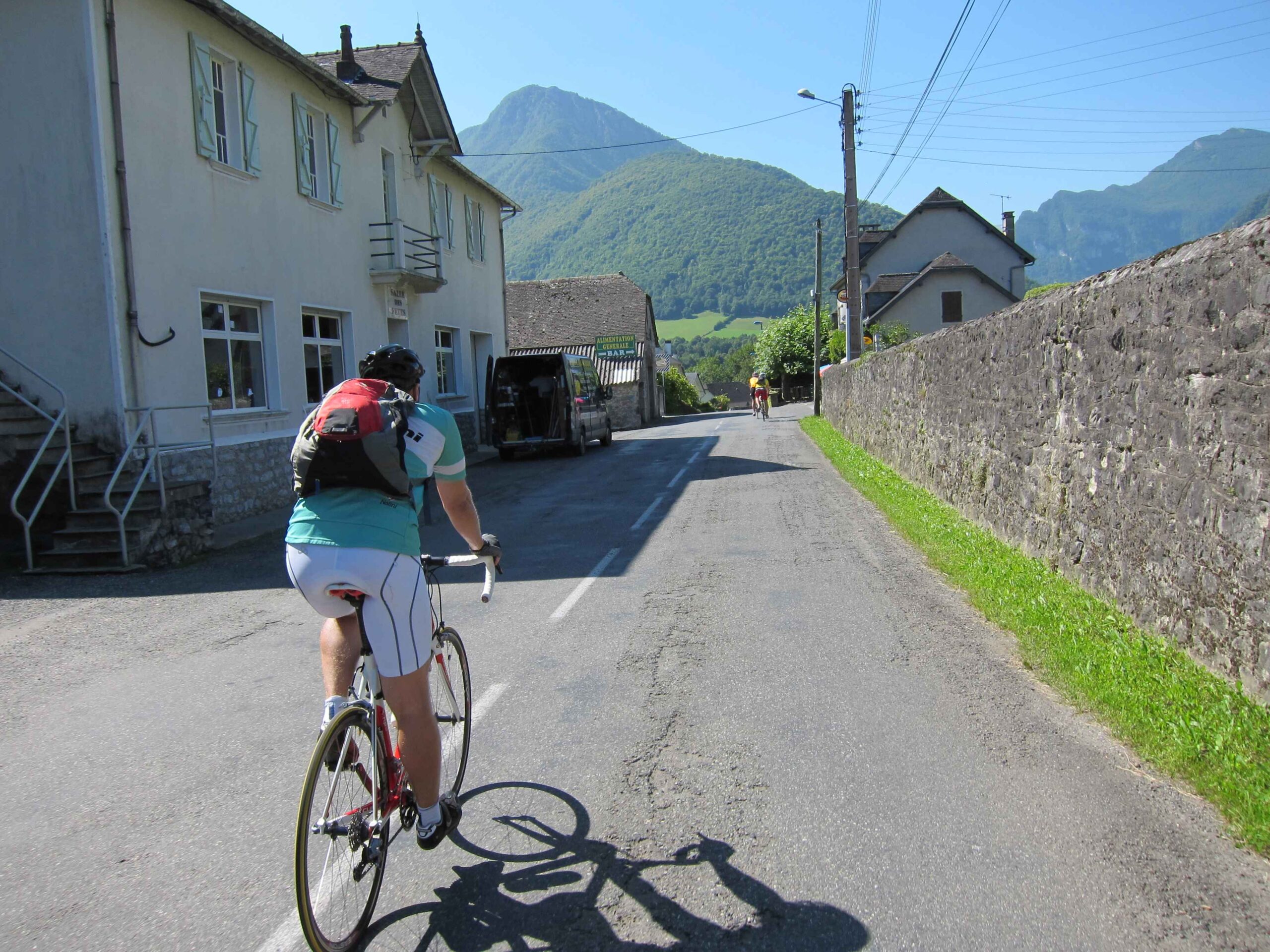 Nachdem wir den ersten Tag gut verkraftet hatten ging es heute in Richtung Osten über den Co de Solour zum Col d’Aubisque. Die Anfahrt durch das schmale Tal war schöner als wir es erwartet hatten und wir genossen die Fahrt in vollen Zügen. Am anstieg zum Solour angekommen ging es mit 9% gleich in die Vollen. Ca. 1-2 Kilometer vor dem Gipfel kam wir aus dem engen Tal heraus und hatten einen wundervollen Blick über den Talkessel hinweg auf den Schlussanstieg zum Col d’Aubisque. In den warmen Temperaturen lief mein Motor richtig gut und ich konnte mich etwas von den anderen absetzen und holte mir den Etappensieg am Col de Solour. Erfreulich war dort eine kleine Raststation, an der wir uns erfrischten und unsere Trinkflaschen netterweise von der Bedienung gefüllt wurden.Der weitere Anstieg zum Col d’Aubisque war genau nach dem Geschmack von Markus. Uns begleitete noch ein zumindest äußerlich ziemlich durchtrainierter Radfahrer, der uns zum Ende des Berges auch stehen ließ. Es folgten noch die obligatorischen Gipfelfotos, zumal dort die berühmten drei großen Räder der Tour stehen. In der Abfahrt war ich wieder in meinem Element, während sich Fayek insbesondere bei dem unbeleuchteten Tunnel nicht wirklich wohl fühlte.