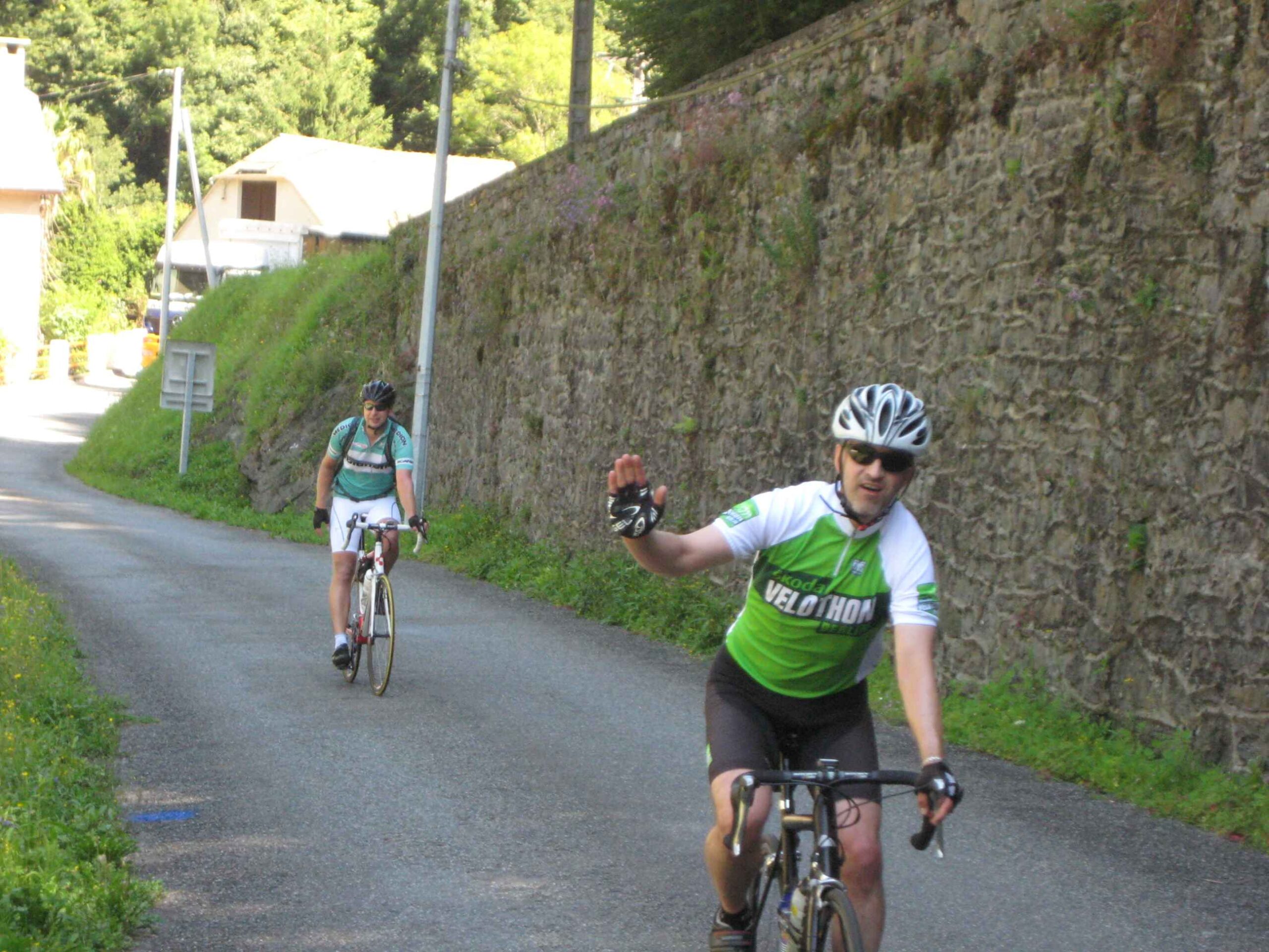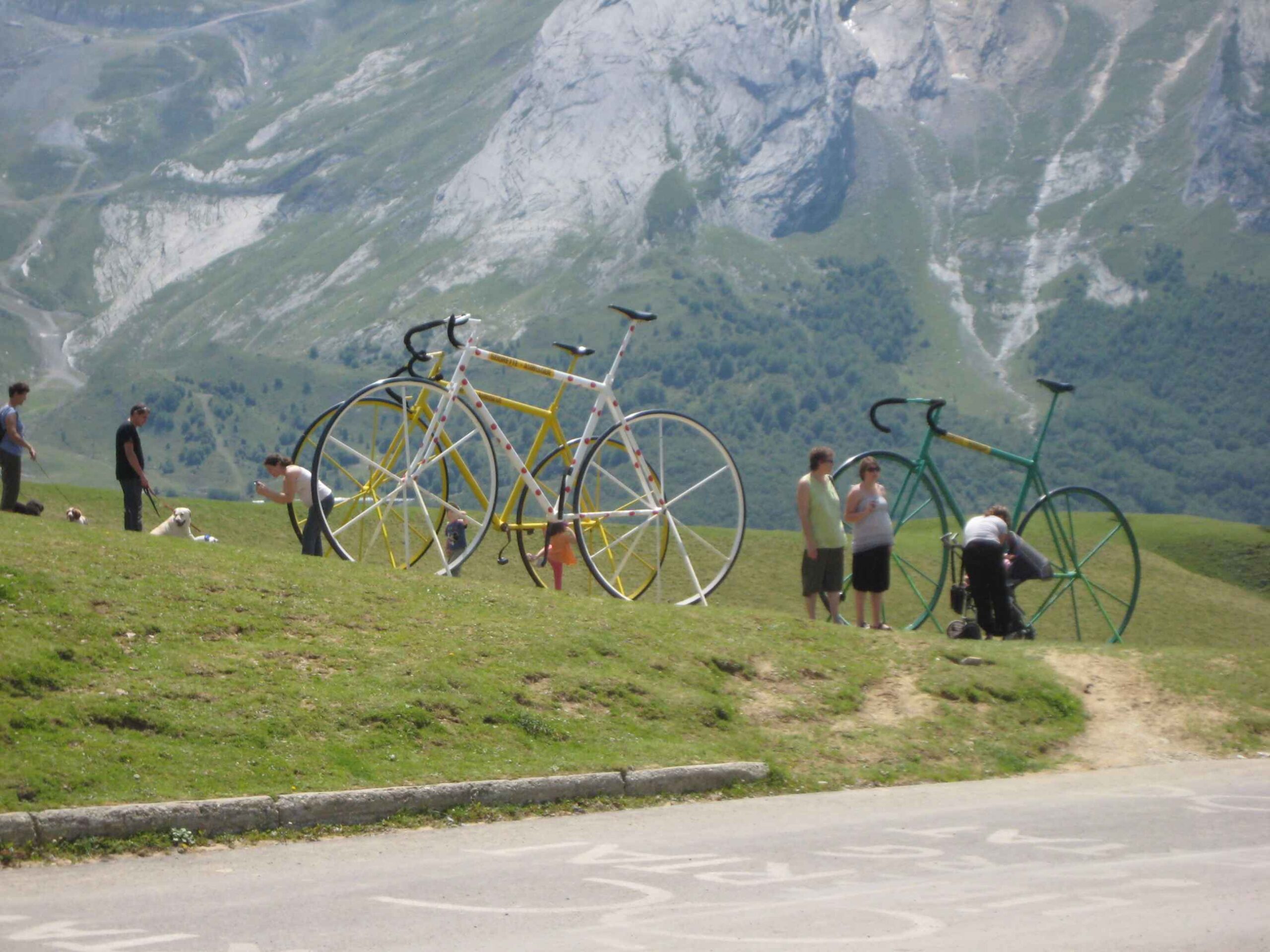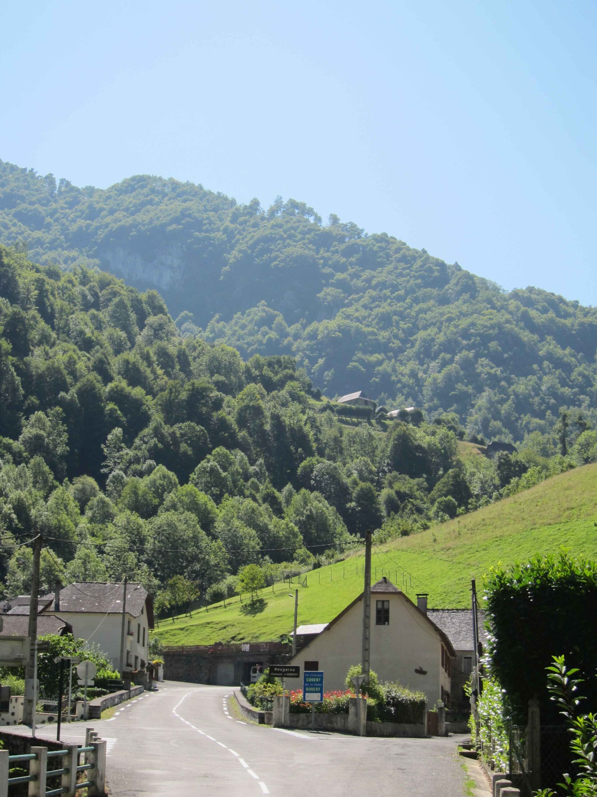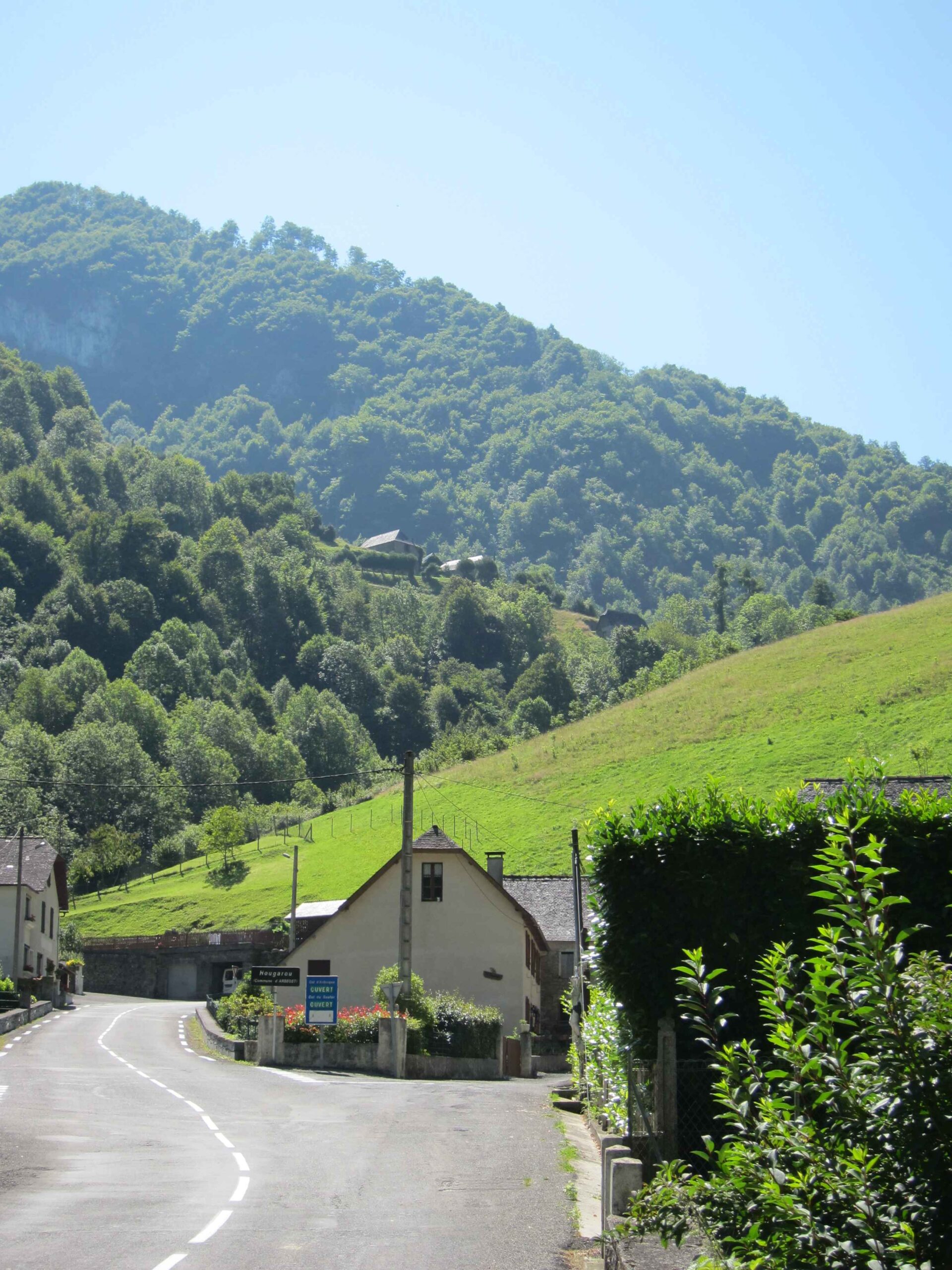 Nachdem wir den ersten Tag gut verkraftet hatten ging es heute in Richtung Osten über den Co de Solour zum Col d’Aubisque. Die Anfahrt durch das schmale Tal war schöner als wir es erwartet hatten und wir genossen die Fahrt in vollen Zügen. Am anstieg zum Solour angekommen ging es mit 9% gleich in die Vollen. Ca. 1-2 Kilometer vor dem Gipfel kam wir aus dem engen Tal heraus und hatten einen wundervollen Blick über den Talkessel hinweg auf den Schlussanstieg zum Col d’Aubisque. In den warmen Temperaturen lief mein Motor richtig gut und ich konnte mich etwas von den anderen absetzen und holte mir den Etappensieg am Col de Solour. Erfreulich war dort eine kleine Raststation, an der wir uns erfrischten und unsere Trinkflaschen netterweise von der Bedienung gefüllt wurden.Der weitere Anstieg zum Col d’Aubisque war genau nach dem Geschmack von Markus. Uns begleitete noch ein zumindest äußerlich ziemlich durchtrainierter Radfahrer, der uns zum Ende des Berges auch stehen ließ. Es folgten noch die obligatorischen Gipfelfotos, zumal dort die berühmten drei großen Räder der Tour stehen. In der Abfahrt war ich wieder in meinem Element, während sich Fayek insbesondere bei dem unbeleuchteten Tunnel nicht wirklich wohl fühlte.