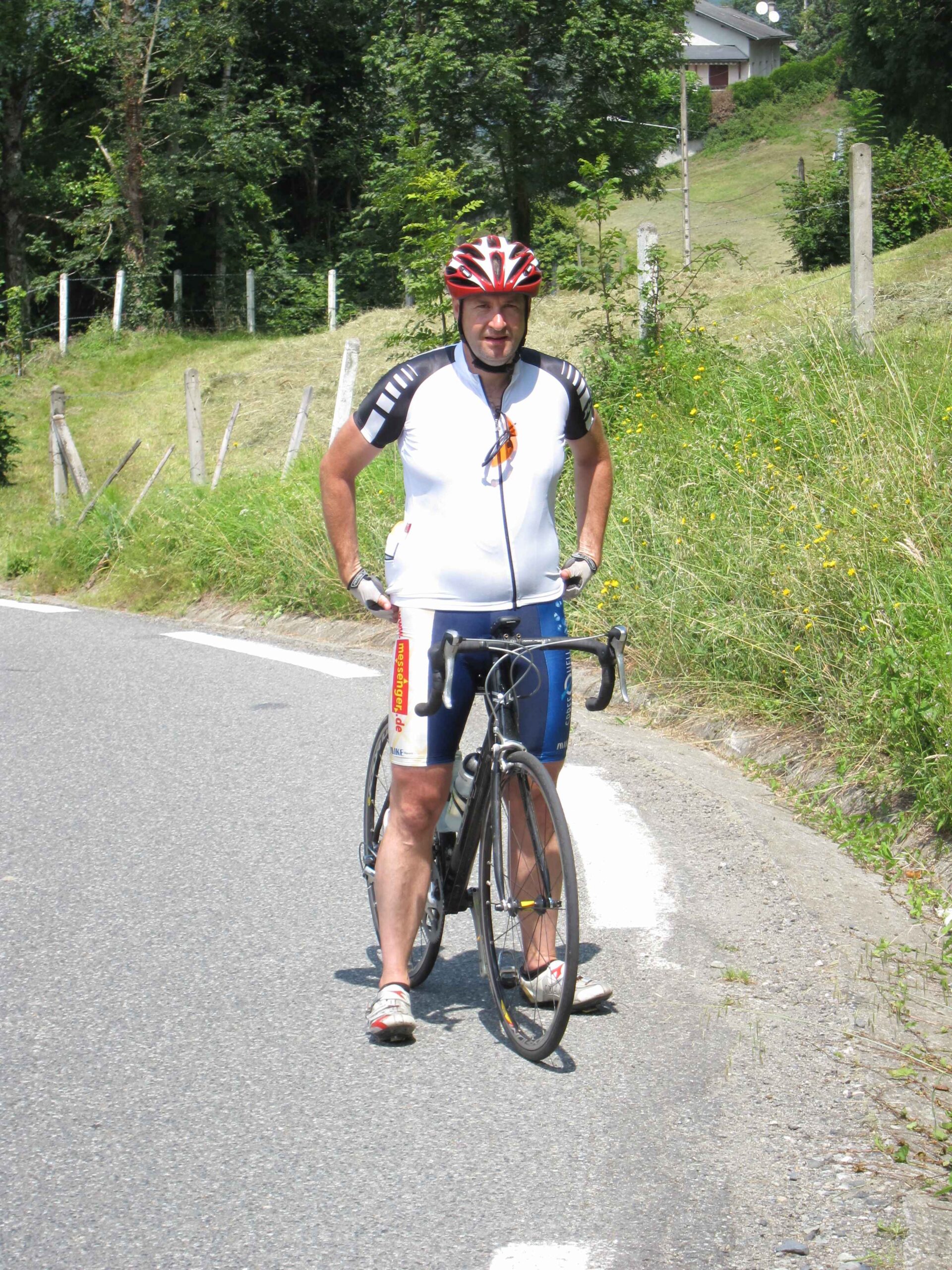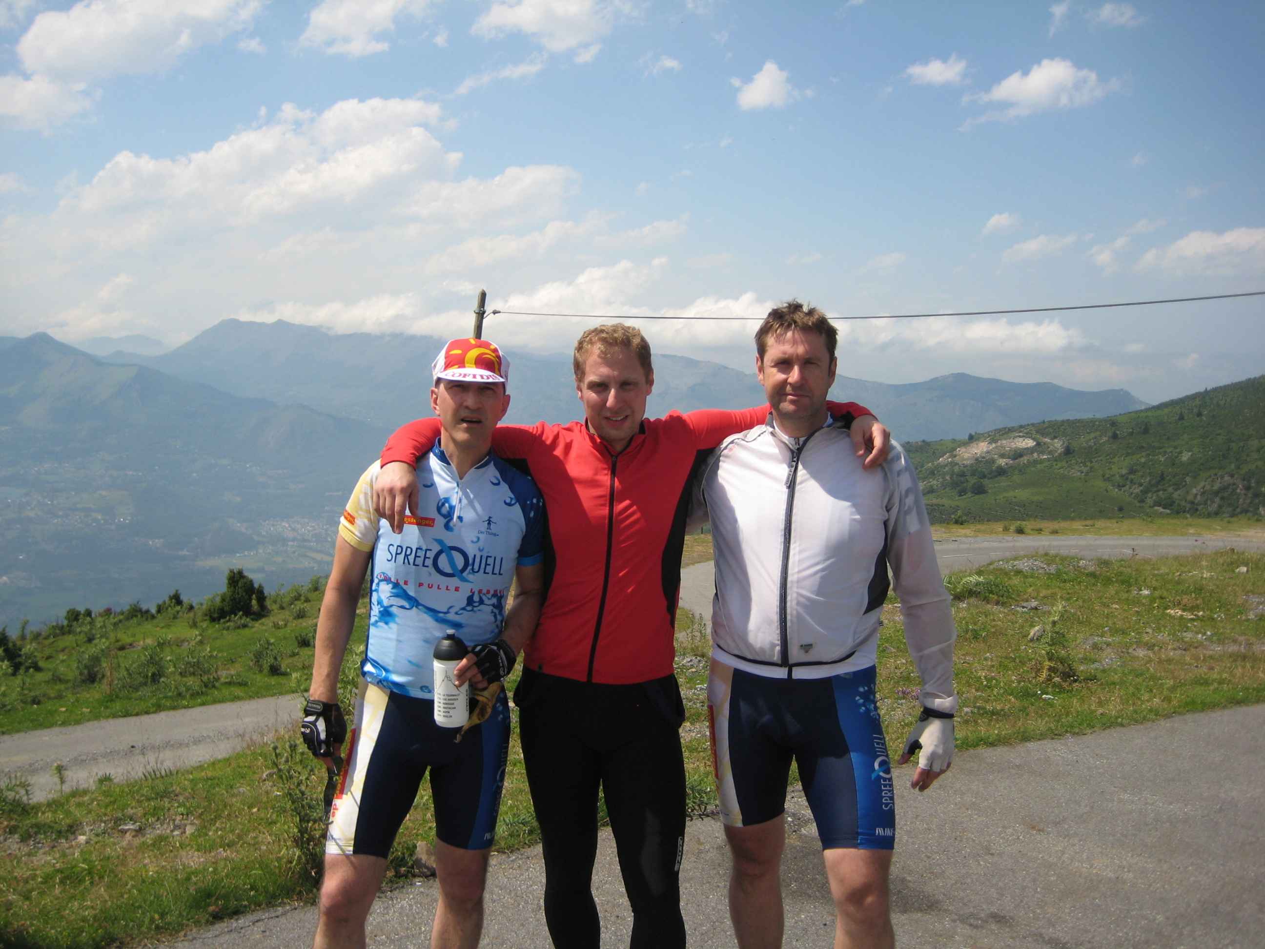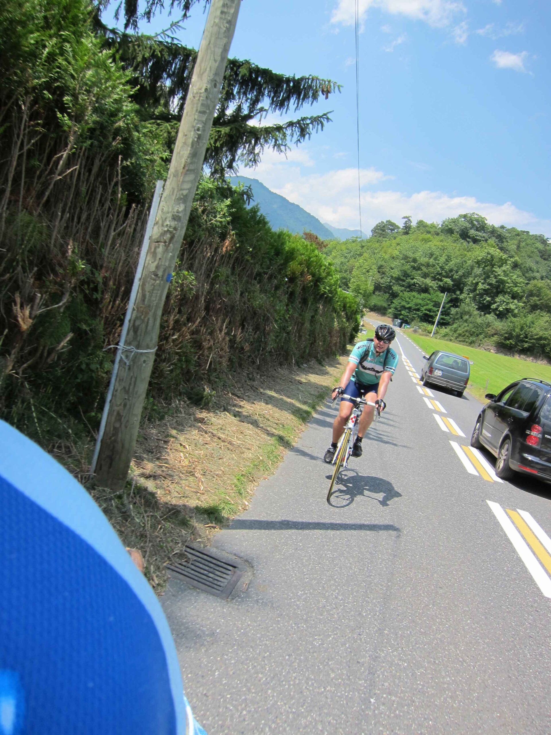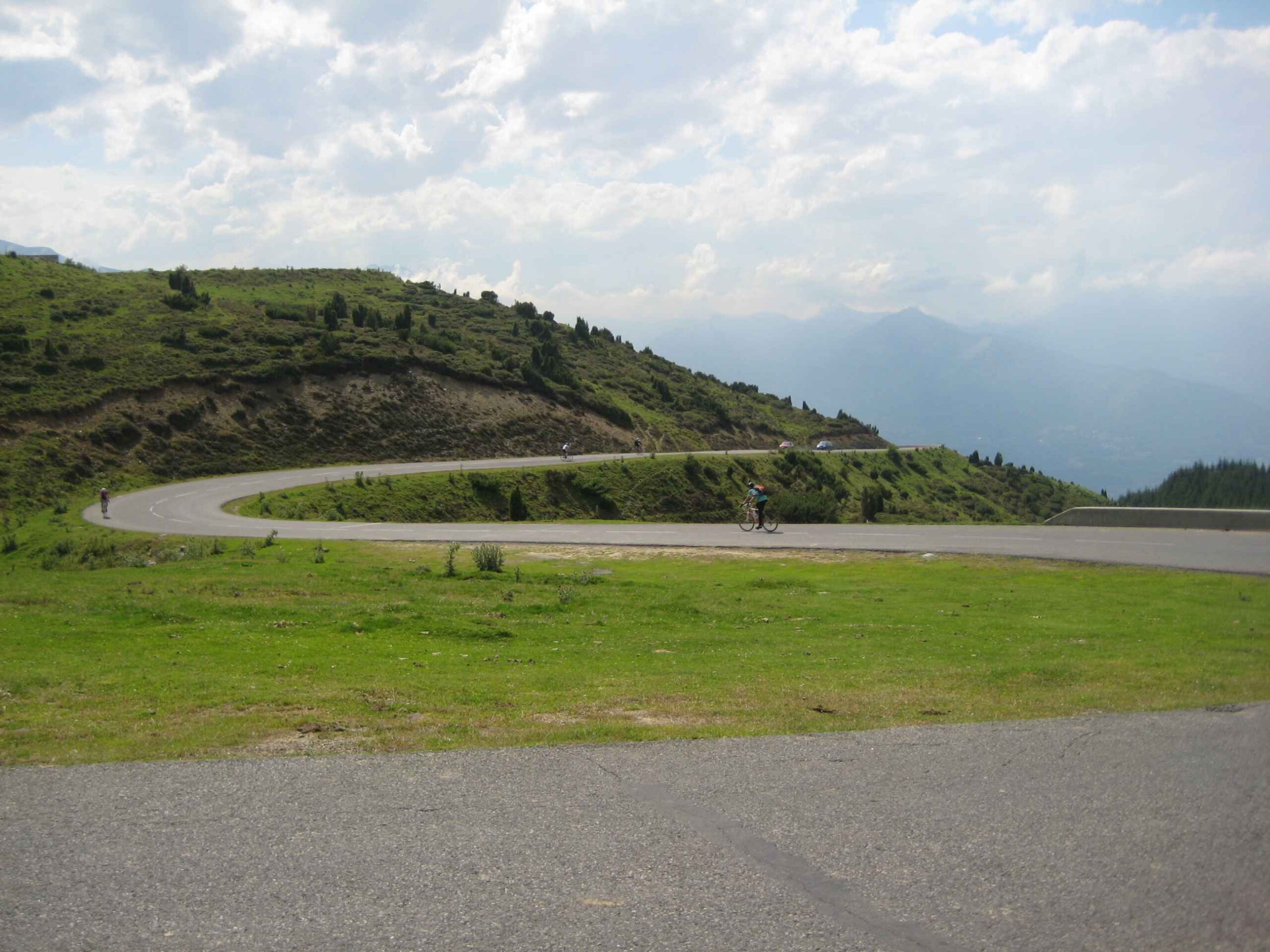 Heute ging es wieder nach Süden, doch sollte es nicht wie am ersten Tag rechts hinauf in die Berge gehen sondern links. Die Gesamtstrecke belief sich mit guten 60 Kilometern auch nicht auf allzu viel, so dass wir eine entspannte Zeitplanung hatten. Allerdings gerieten wir gleich zu Beginn etwas in Verzug, da Markus erneut einen Platten hatte, kaum, dass wir die Stadt hinter uns gelassen hatten. Die Temperaturen waren recht hoch und Markus stöhnte bereits im Flachen. Ich fühlte mich bei der Wärme richtig wohl. Zu Beginn des Anstiegs hielten wir noch an einem kleinen Brunnen und erfrischten uns, dann ging es hinauf. Zwischendurch überholte uns ein paar andere Radfahrer, an die wir uns aber dranhängen konnten und mit ihnen im unausgesprochenen Wettstreit kletterten wir Kehre um Kehre nach oben. Markus kam mit der Hitze gar nicht zu recht und litt sehr im Anstieg.