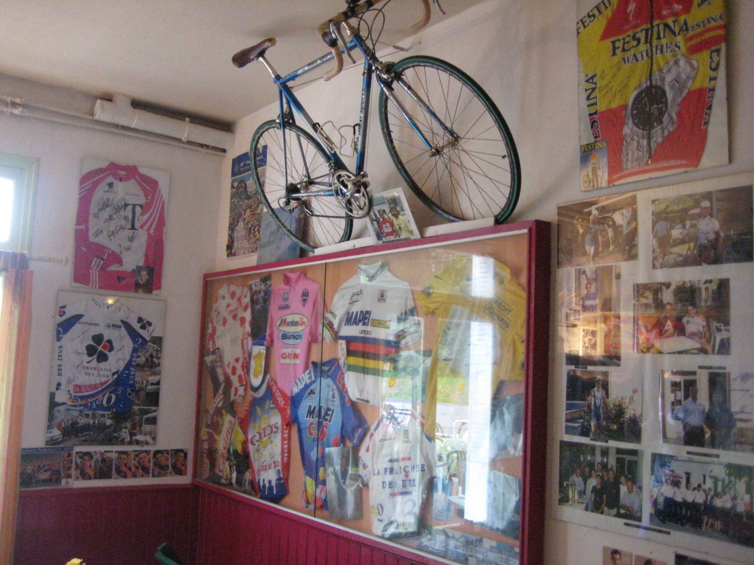 Erneut gab es eine Restauration, in der wir uns erholen konnten und die Aussicht auf die Berge genossen. Auf dem Rückweg machten wir an einem privaten Tour Museum halt, von welchem ich im Tour Magazin gelesen hatte. Das zugehörige Restaurant war zwar geschlossen, trotzdem zeigte uns der Inhaber stolz seine Sammlung der Devotionalien von den unterschiedlichsten Tourteilnehmern aus mehreren Jahrzehnten.