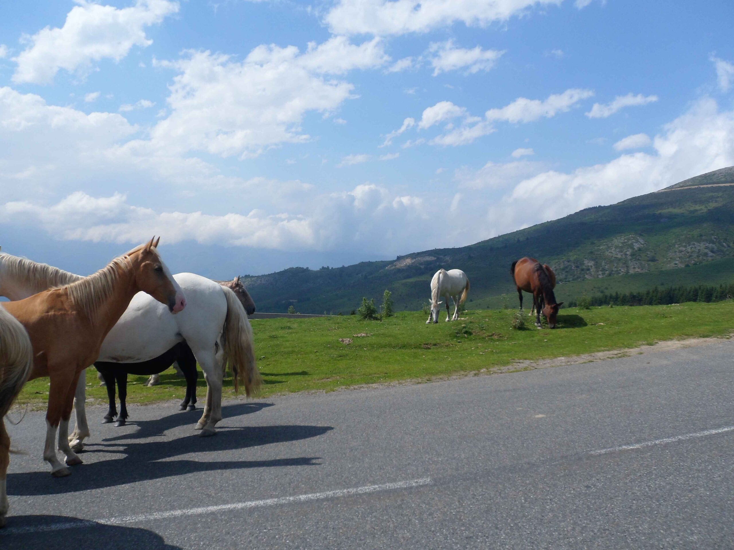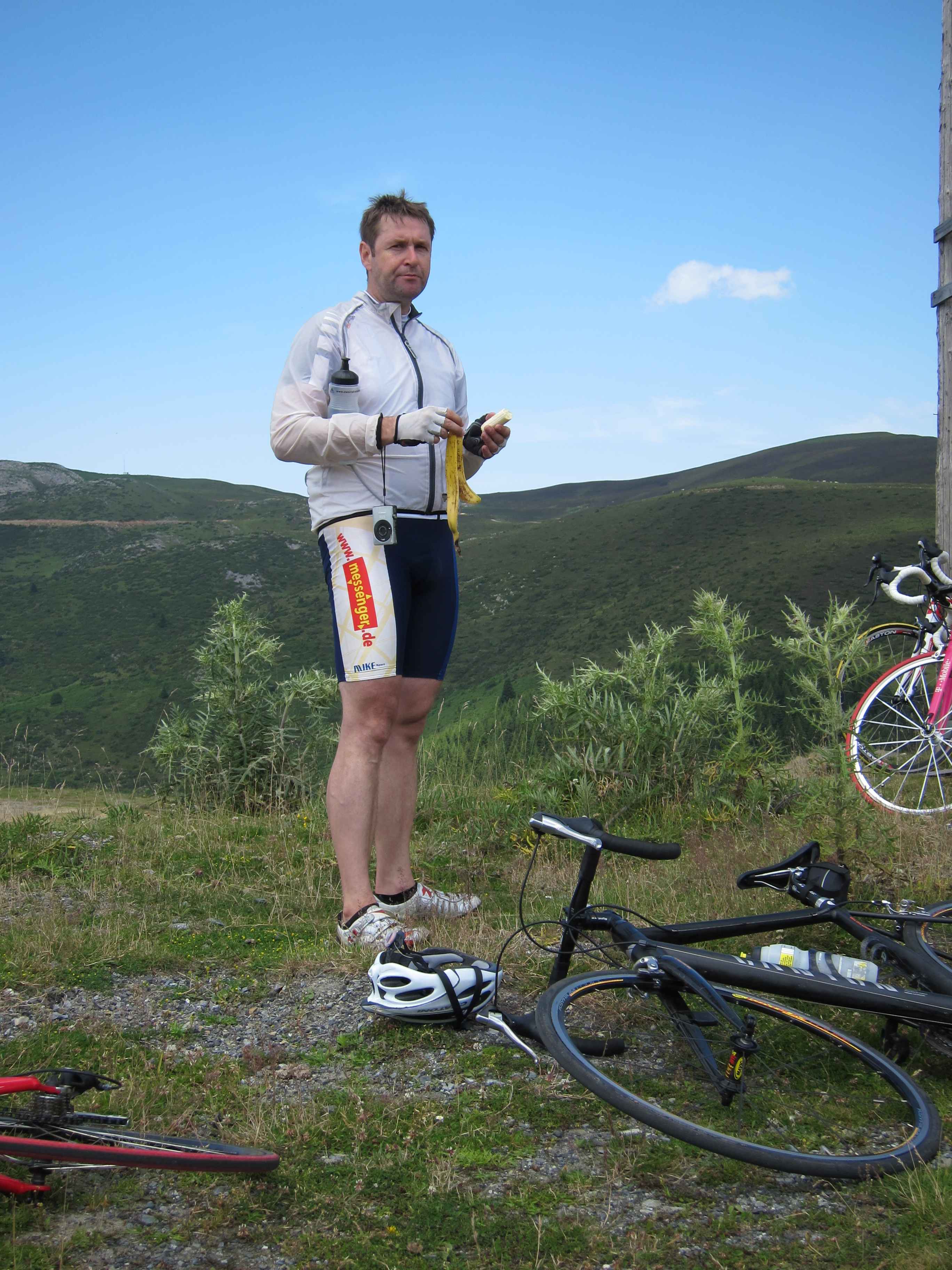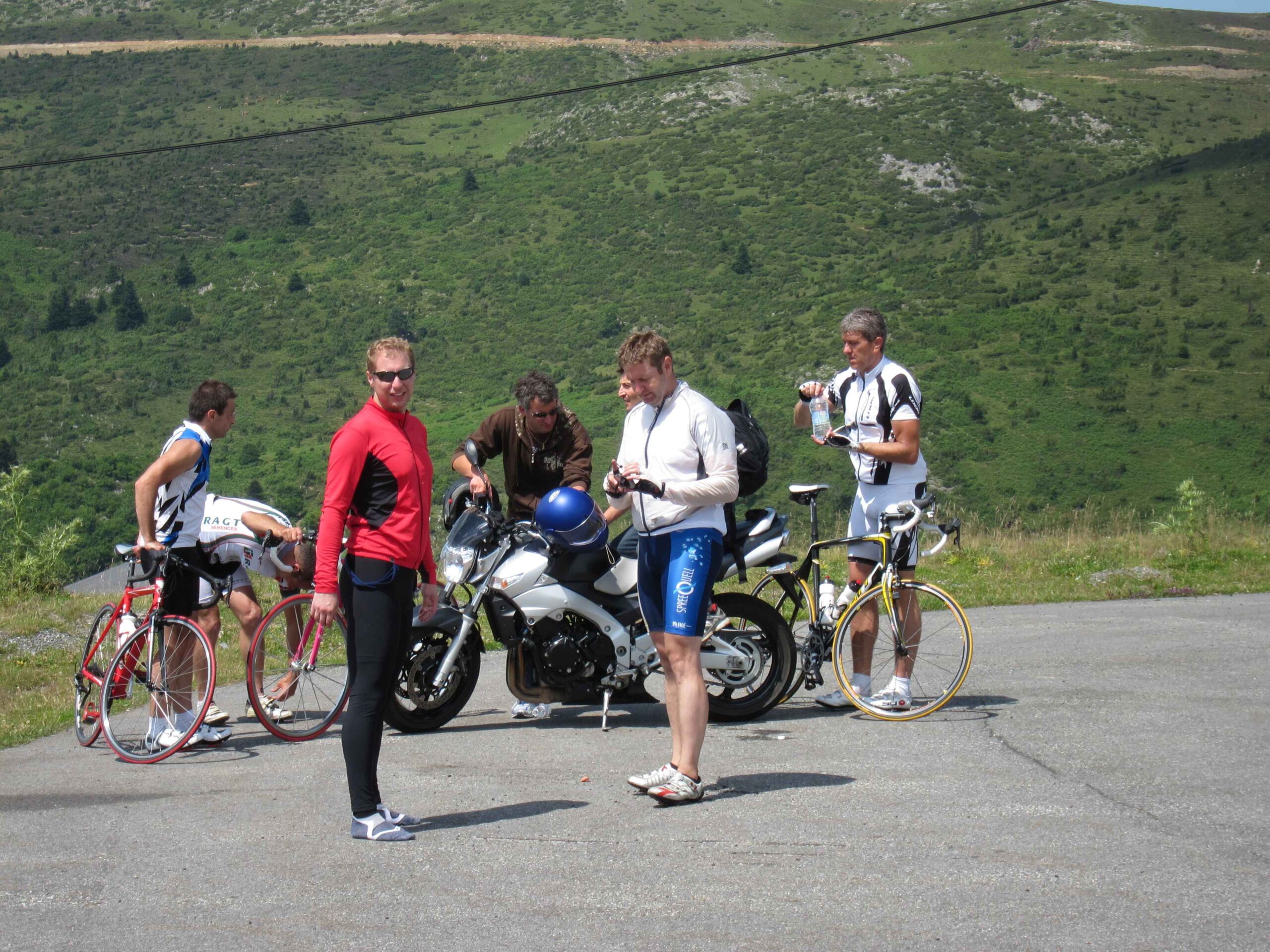 Heute ging es wieder nach Süden, doch sollte es nicht wie am ersten Tag rechts hinauf in die Berge gehen sondern links. Die Gesamtstrecke belief sich mit guten 60 Kilometern auch nicht auf allzu viel, so dass wir eine entspannte Zeitplanung hatten. Allerdings gerieten wir gleich zu Beginn etwas in Verzug, da Markus erneut einen Platten hatte, kaum, dass wir die Stadt hinter uns gelassen hatten. Die Temperaturen waren recht hoch und Markus stöhnte bereits im Flachen. Ich fühlte mich bei der Wärme richtig wohl. Zu Beginn des Anstiegs hielten wir noch an einem kleinen Brunnen und erfrischten uns, dann ging es hinauf. Zwischendurch überholte uns ein paar andere Radfahrer, an die wir uns aber dranhängen konnten und mit ihnen im unausgesprochenen Wettstreit kletterten wir Kehre um Kehre nach oben. Markus kam mit der Hitze gar nicht zu recht und litt sehr im Anstieg.