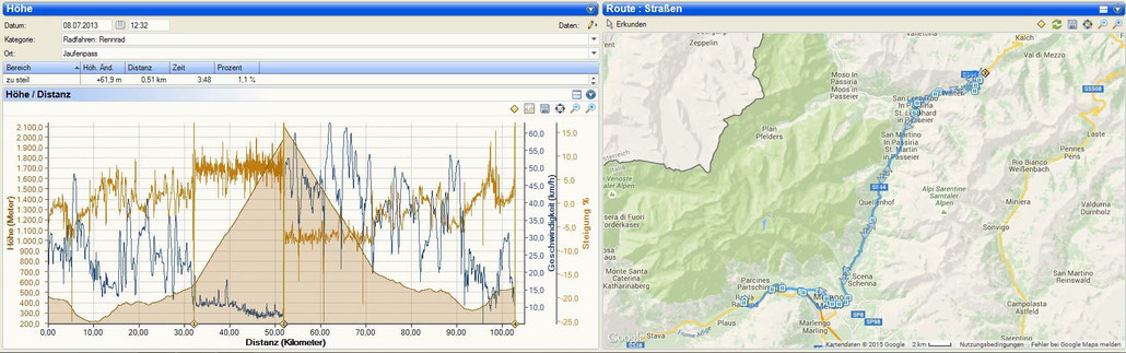 Für den zweiten Tag hatten wir uns den Jaufenpass vorgenommen. Die Anfahrt war ein wenig länger, doch die vorab angeschauten Bilder versprachen eine sehr schön Fahrt. Das Wetter war erneut sehr schön, die Sonne schien und es ging erst mal flach in Richtung Meran. Die Stadt strahlte ein wunderbares italienisches Flair aus und eigentlich wollten wir in die nächste Espresso Bar oder Eisdiele abbiegen. Doch der Ehrgeiz erst den Jaufenpass zu bezwingen liess uns weiterfahren. Vor dem Beginn der eigentlichen Steigung legten wir noch eine Dehnungspause ein, die im Gegensatz zu unserer letzten Tour, nicht nur Fayek nutzte sondern wir alle.