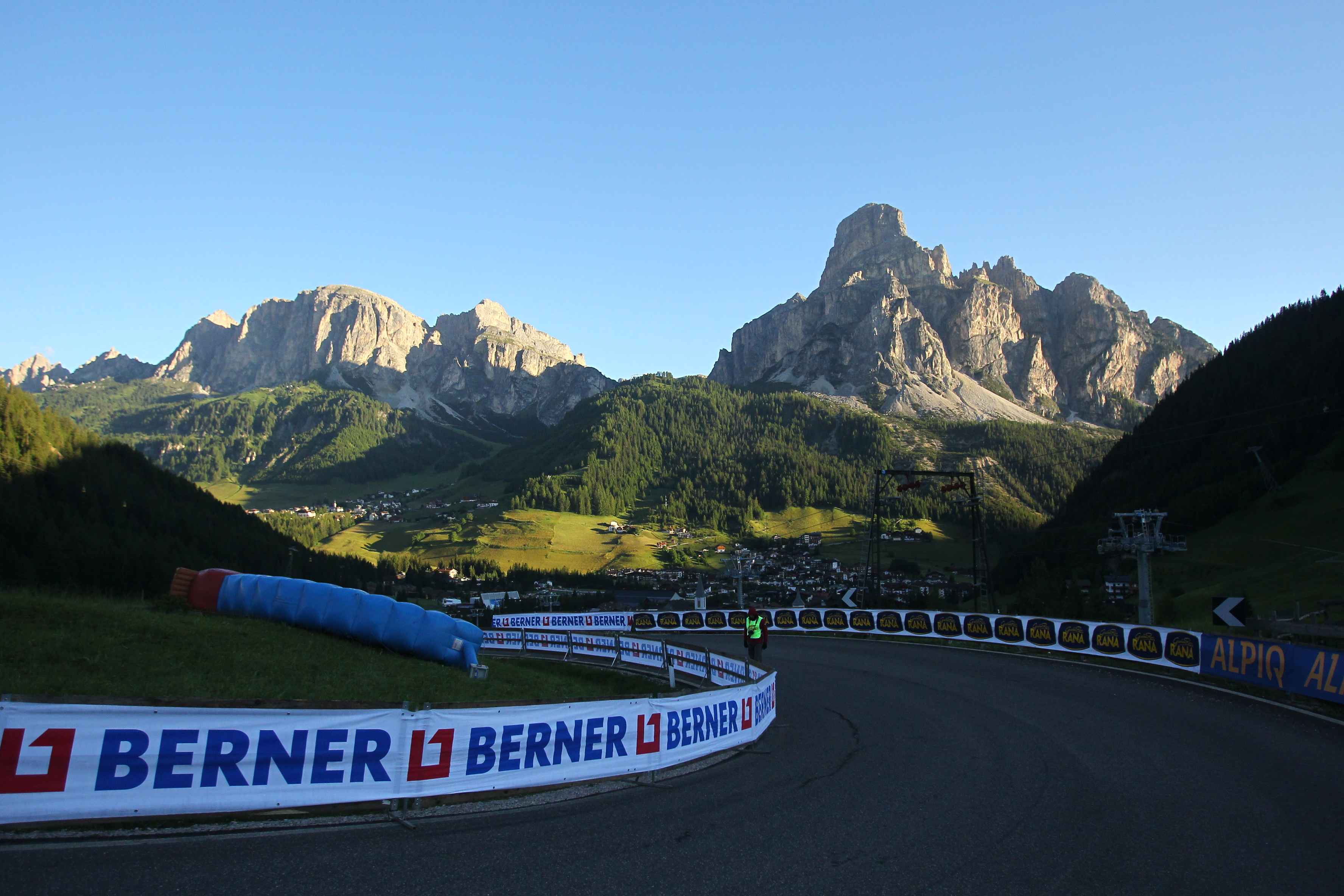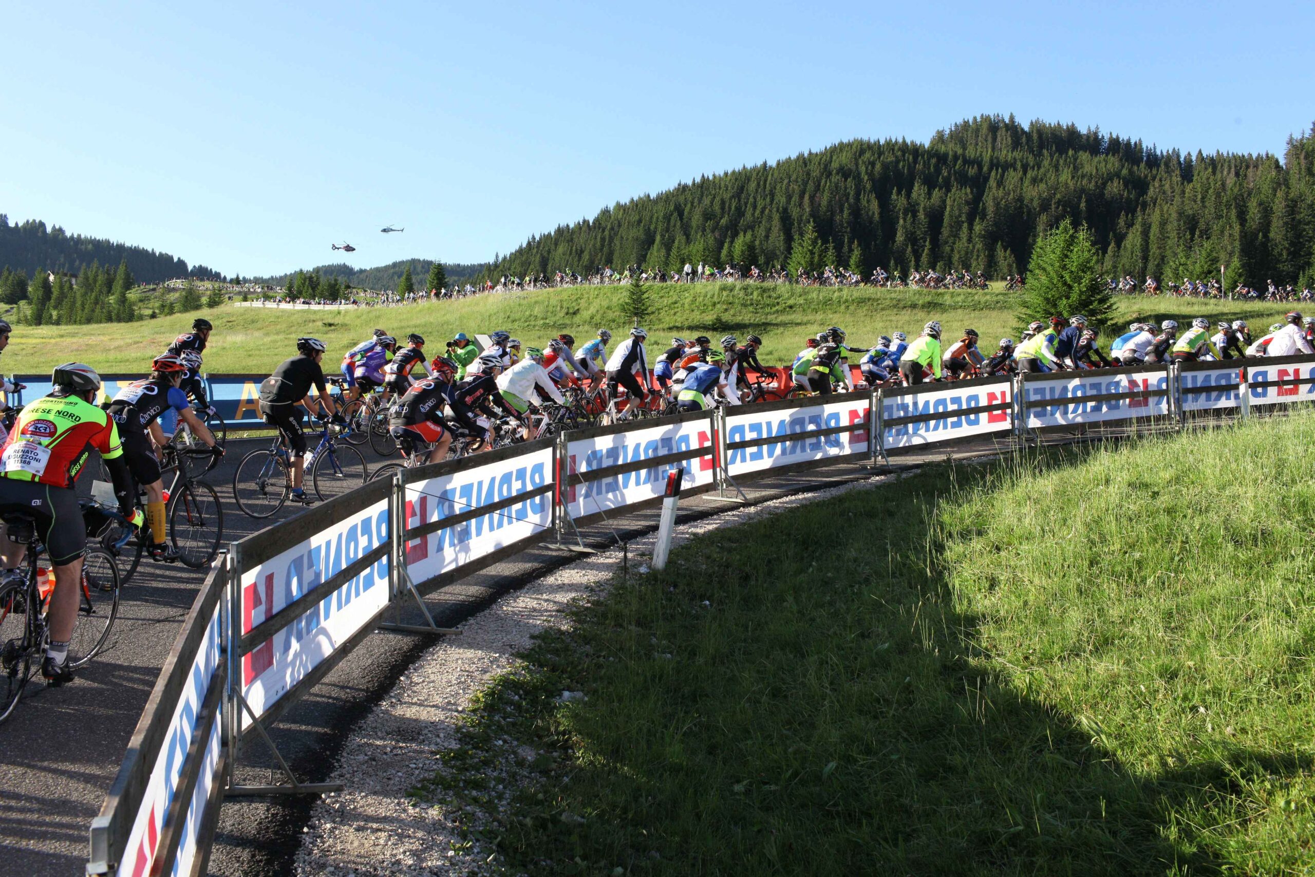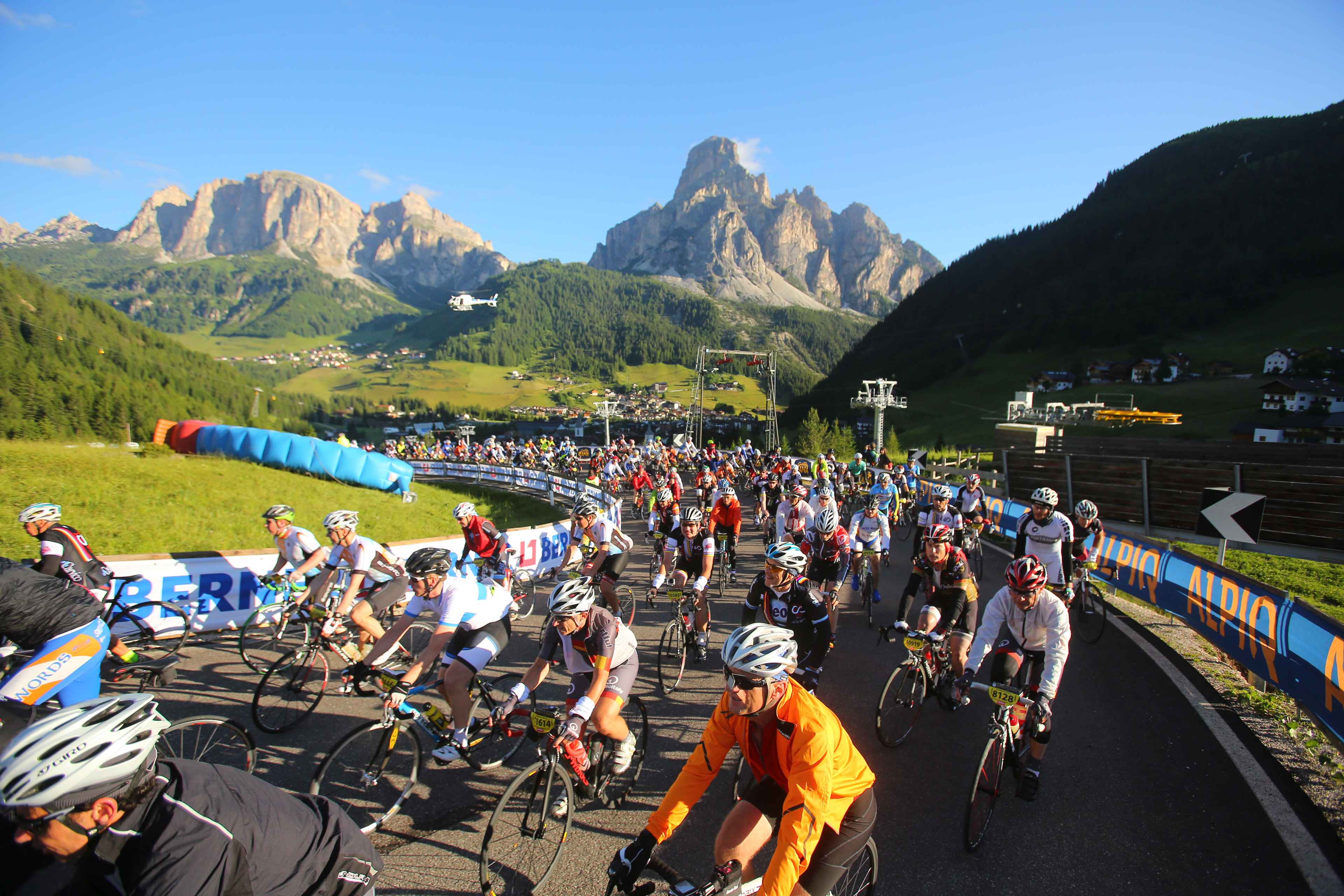 Heute sollte der Tag der Tage sein. Wir hatten alle am Vorabend unsere Kleidung und Verpflegung vorbereitet. Die Räder waren auch gecheckt. Bereits vor 5 Uhr hieß es aufstehen. Unsere Wirtin bereitete uns auch ein frühes Frühstück, welches wir trotz der Aufregung gut zu uns nehmen konnten. Vor allem der Kaffee tat seine Pflicht und weckte die Lebensgeister. So saßen wir bereits vor 6 Uhr auf dem Rad und machten uns auf den Weg zum Startort. Von allen Seiten kamen die anderen Mitstreiter und das Surren der Räder erfüllte die morgige Luft. Es war auch noch recht frisch, speziell auf der Abfahrt runter nach Corvara, doch ließ es sich mit der Windjacke gut aushalten. Aus den Erfahrungen anderen Touren hatte ich mich auch entschieden in kurz zu fahren und auf die Windjacke zu vertrauen. So konnte ich etwas Platz und Gewicht sparen. Der Startbereich füllte sich immer mehr und alle warteten gespannt auf das Startsignal. Als kurz vor dem Start auch noch ein Hubschrauber dicht über dem Starterfeld kreiste kam ich mir wie ein Profi vor. Dann ging es endlich los. Allerdings doch erst sehr geruhsam. Ich denke alle hatten doch den entsprechenden Respekt vor der Anstrengung, die vor uns lag. Unser „lockeres“ Zeil gemeinsam zumindest bis zum ersten Berg zu fahren ging sehr schnell verloren und ich sah recht schnell kein bekanntes Gesicht mehr.
