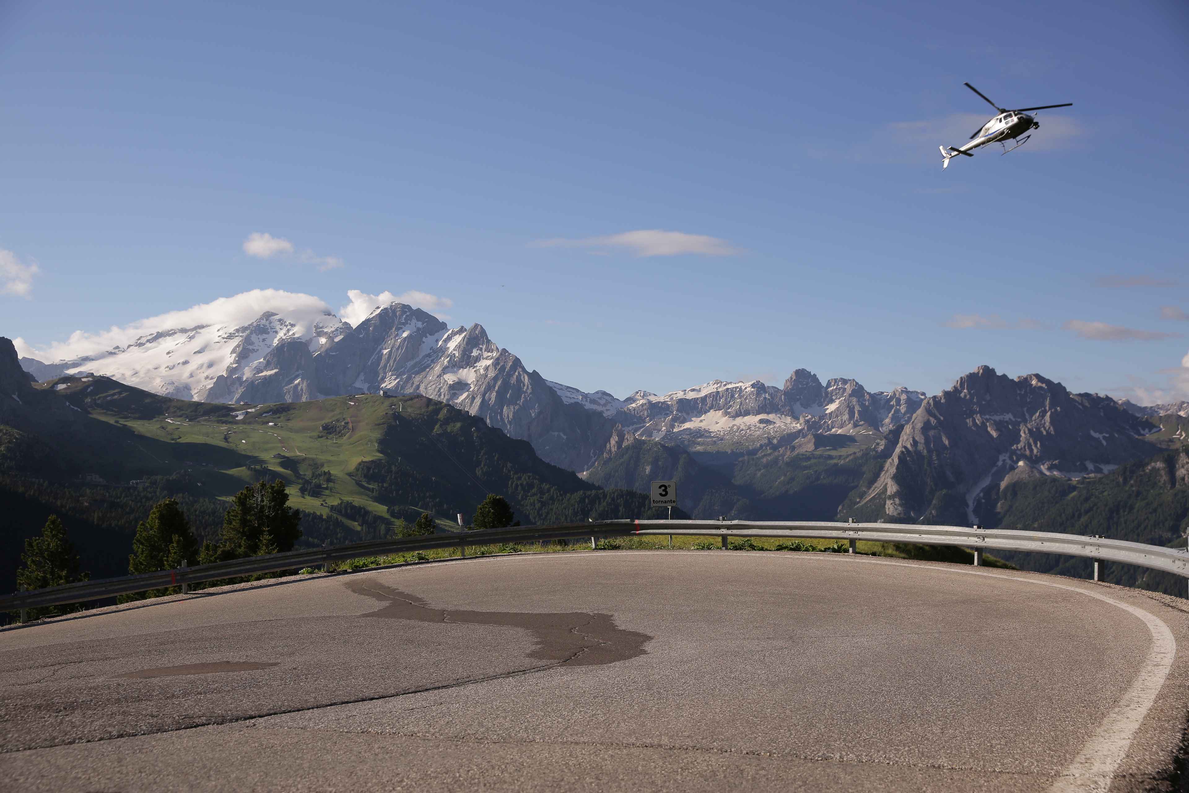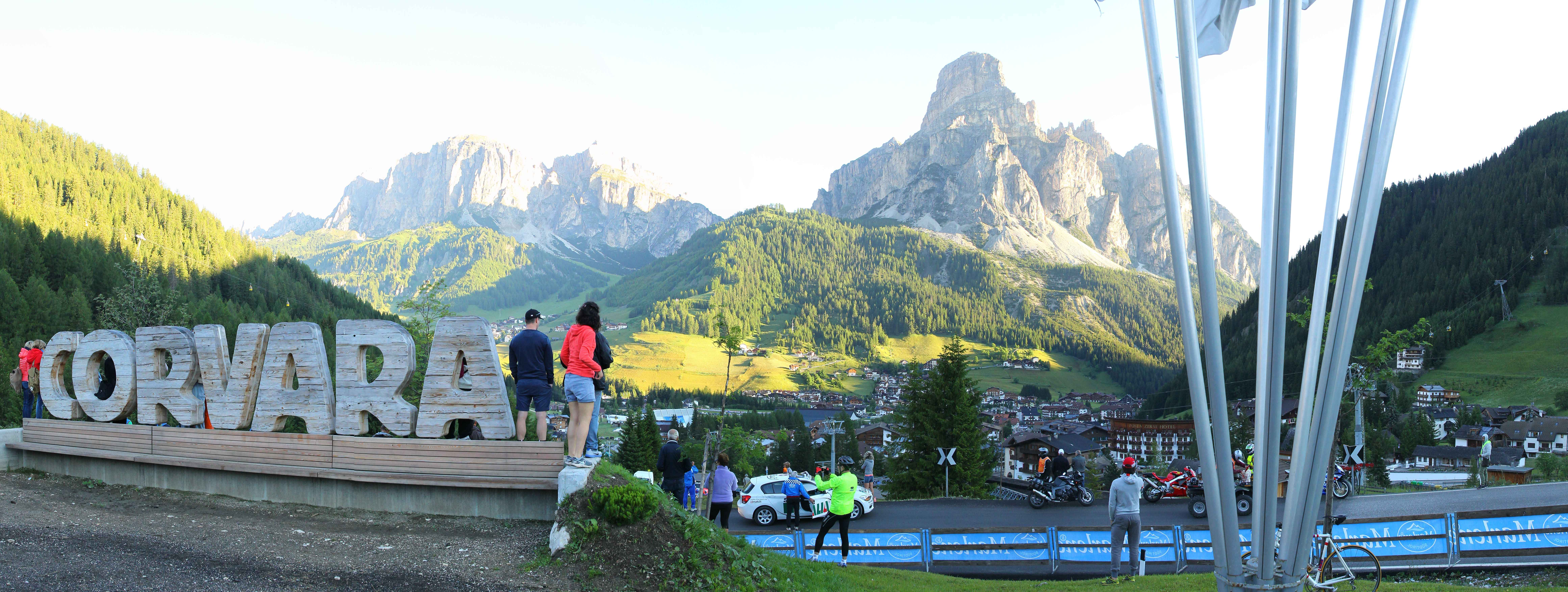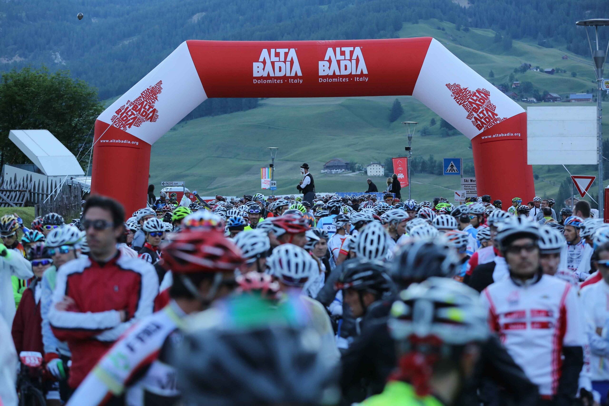 Heute sollte der Tag der Tage sein. Wir hatten alle am Vorabend unsere Kleidung und Verpflegung vorbereitet. Die Räder waren auch gecheckt. Bereits vor 5 Uhr hieß es aufstehen. Unsere Wirtin bereitete uns auch ein frühes Frühstück, welches wir trotz der Aufregung gut zu uns nehmen konnten. Vor allem der Kaffee tat seine Pflicht und weckte die Lebensgeister. So saßen wir bereits vor 6 Uhr auf dem Rad und machten uns auf den Weg zum Startort. Von allen Seiten kamen die anderen Mitstreiter und das Surren der Räder erfüllte die morgige Luft. Es war auch noch recht frisch, speziell auf der Abfahrt runter nach Corvara, doch ließ es sich mit der Windjacke gut aushalten. Aus den Erfahrungen anderen Touren hatte ich mich auch entschieden in kurz zu fahren und auf die Windjacke zu vertrauen. So konnte ich etwas Platz und Gewicht sparen. Der Startbereich füllte sich immer mehr und alle warteten gespannt auf das Startsignal. Als kurz vor dem Start auch noch ein Hubschrauber dicht über dem Starterfeld kreiste kam ich mir wie ein Profi vor. Dann ging es endlich los. Allerdings doch erst sehr geruhsam. Ich denke alle hatten doch den entsprechenden Respekt vor der Anstrengung, die vor uns lag. Unser „lockeres“ Zeil gemeinsam zumindest bis zum ersten Berg zu fahren ging sehr schnell verloren und ich sah recht schnell kein bekanntes Gesicht mehr.