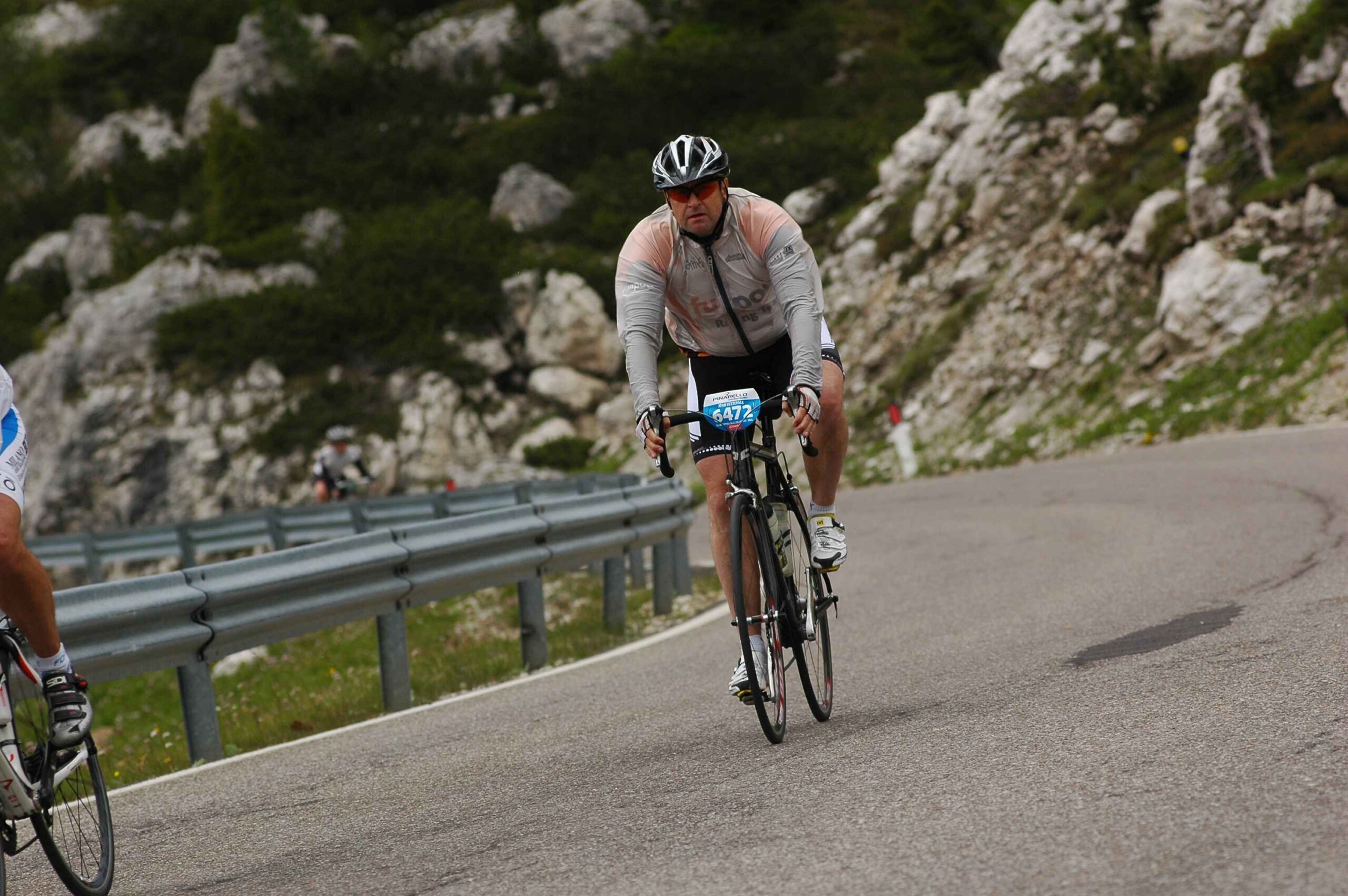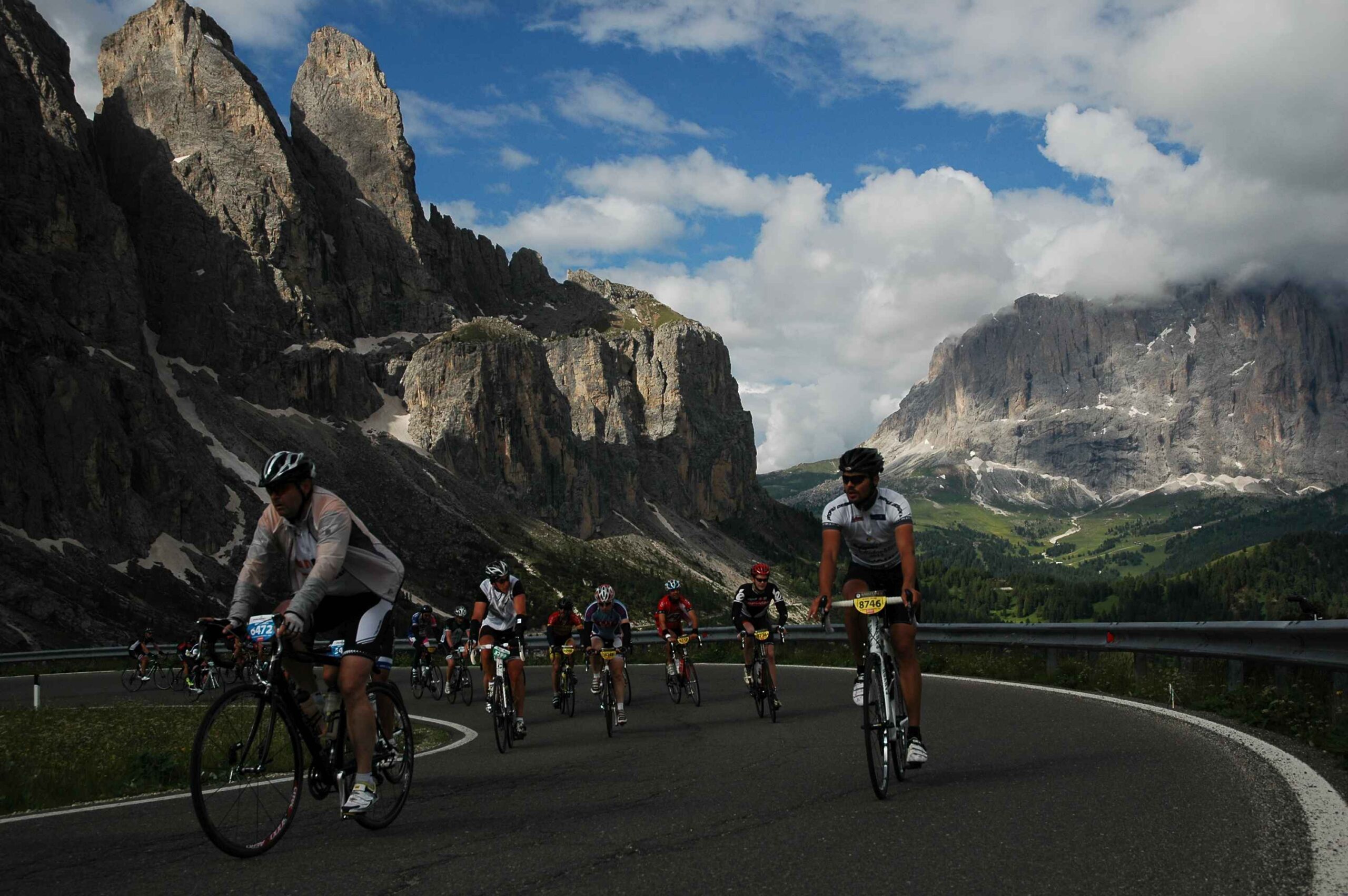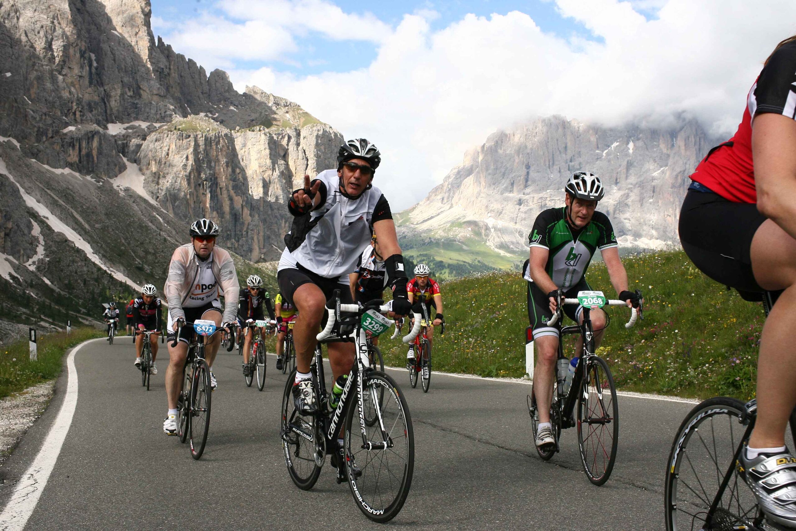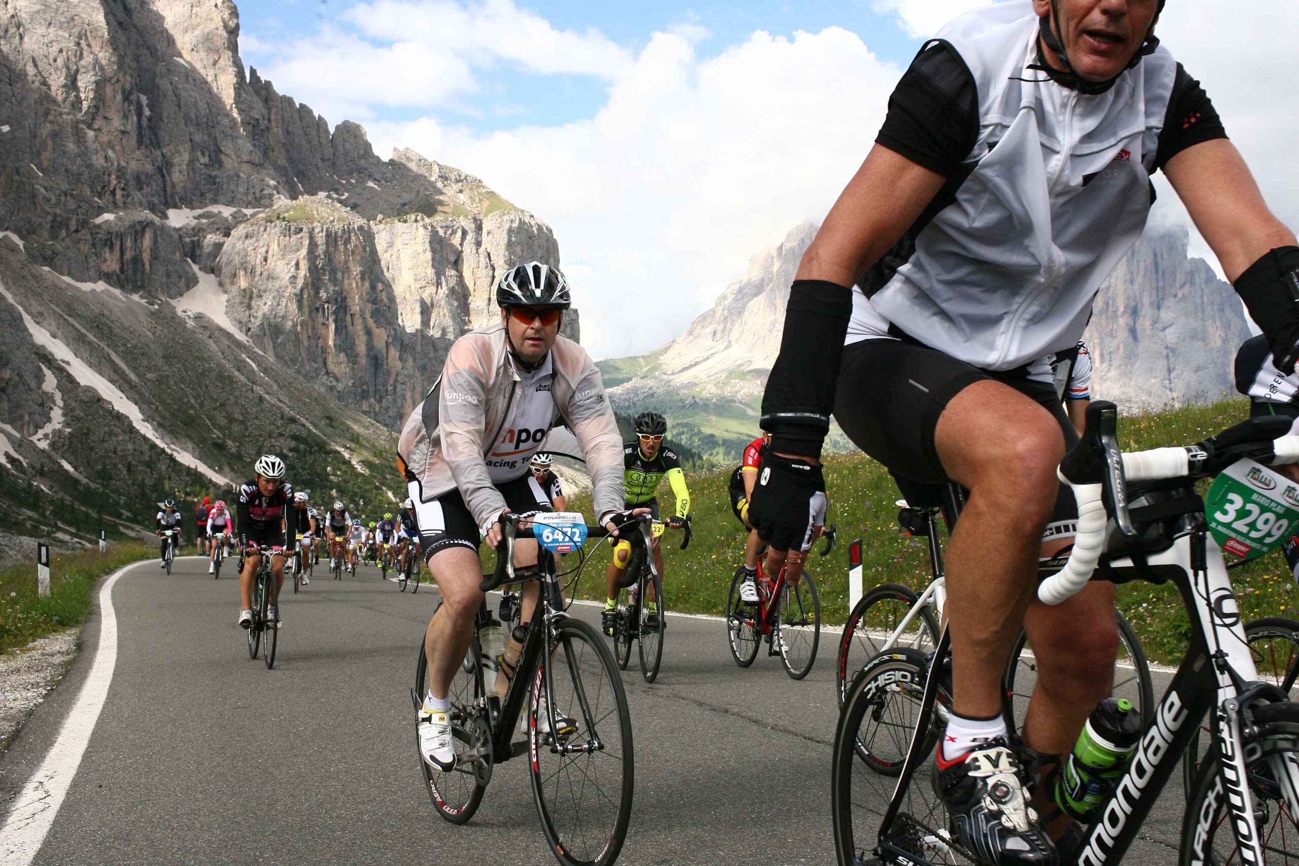 Am ersten Berg (Campolongo) schob sich das Feld sehr zusammen und es ging doch sehr langsam hinauf. Es war fast schon schwierig einen Rythmus zu finden, da doch einige Fahrer mit sehr großen Übersetzungen unterwegs waren und hier bereits Schwierigkeiten hatten. Mit meiner kleinen Übersetzung kam ich ganz gut zurecht und strampelte so mit vielen anderen Mitstreitern den Berg hinauf. Der Anblick von so vielen Radfahrern, die sich alle den Berg hinaufkämpften und fast nur das Surren der Räder zu hören war, war fantastisch, zumal es der Wettergott gut mit uns gemeinte hatte und wir in den strahlenden Sonnenschein fuhren. Ich merkte allerdings, dass meine Blase schon drückte und überlegte, wo ich wohl am besten anhalten konnte. Ich entschied mich am Ende der ersten Abfahrt anzuhalten, in der Hoffnung dort vielleicht eine Toilette zu finden, die es leider nicht gab und so blieb mir nur der Straßenrand ,während die anderen an mir vorbeizogen.