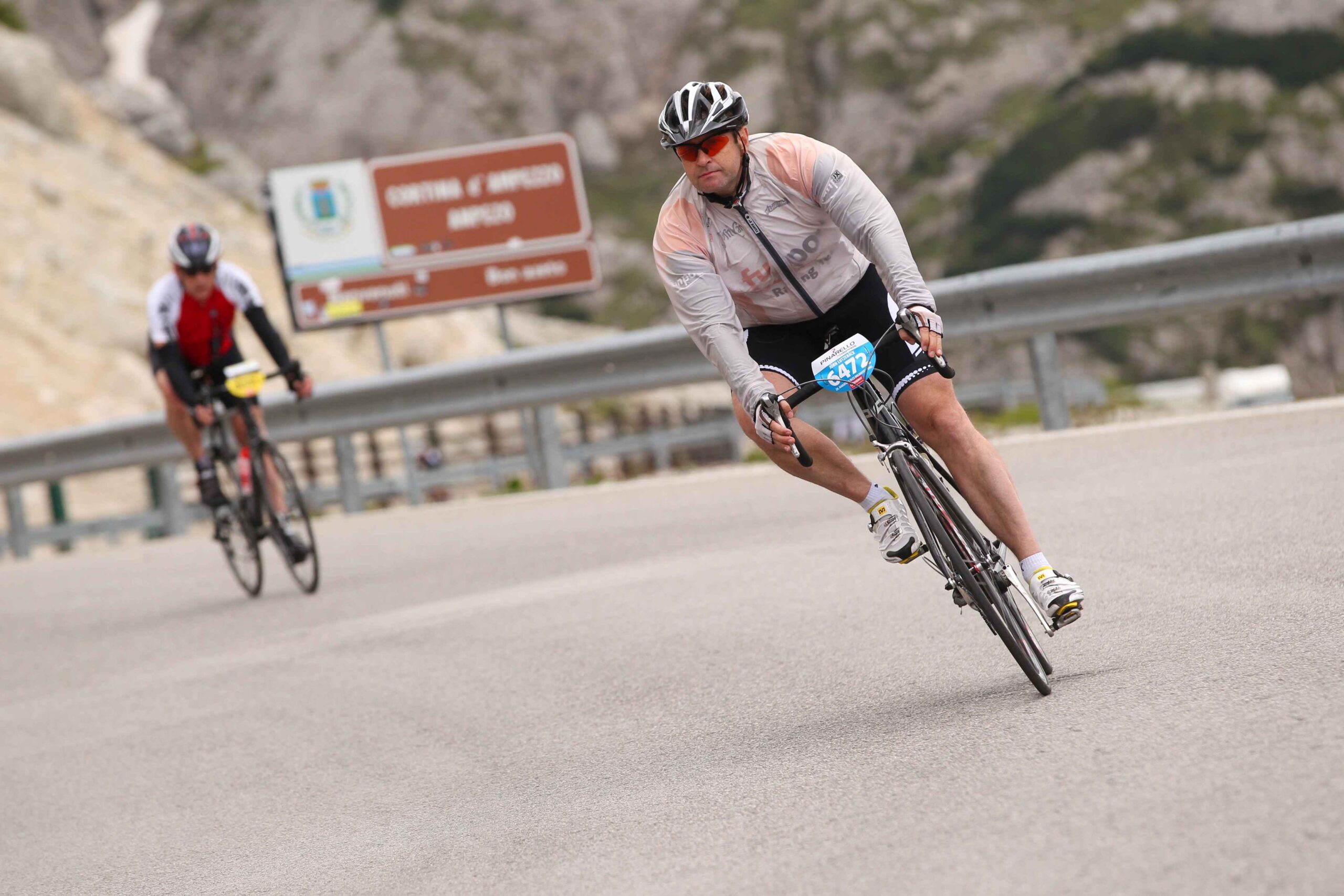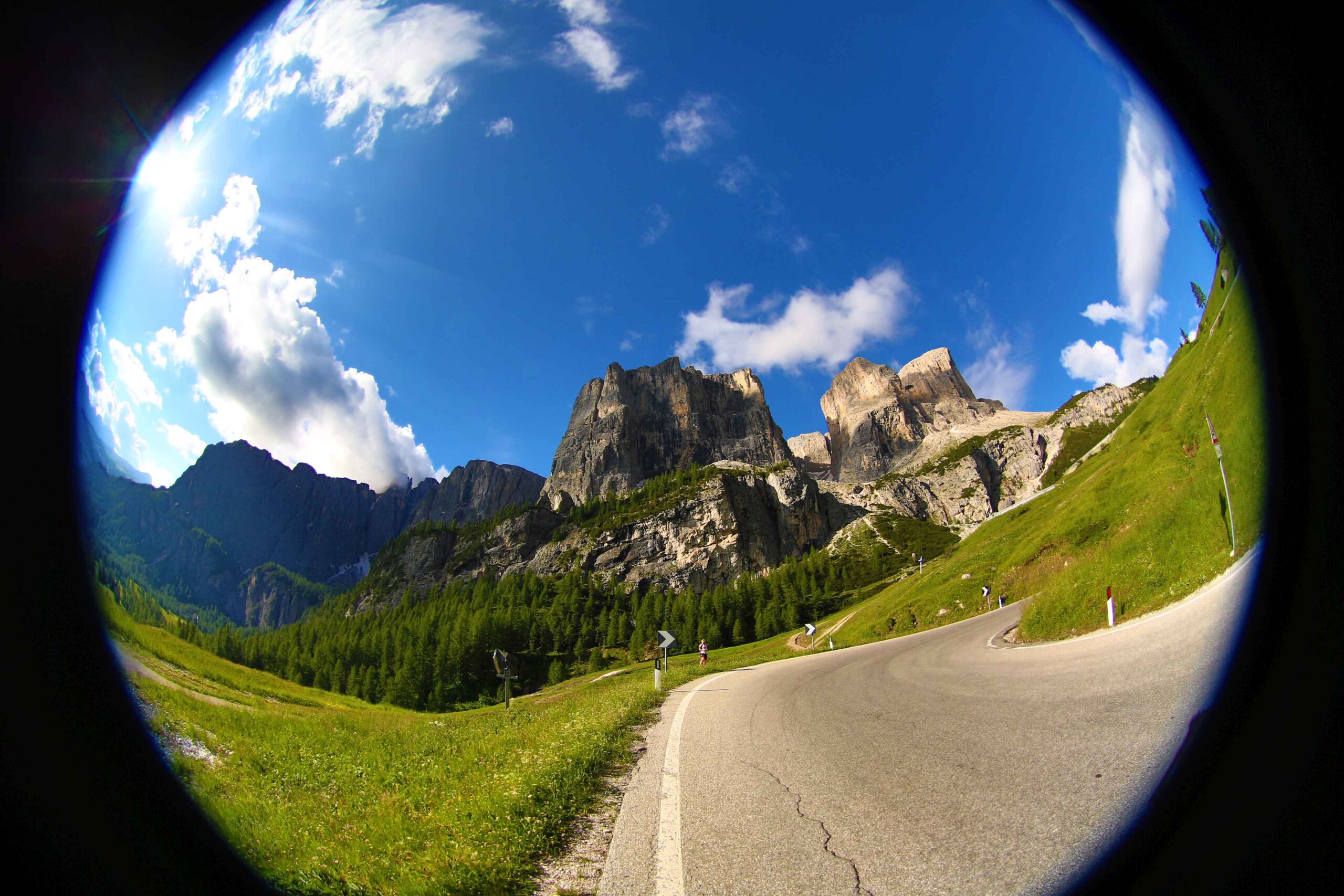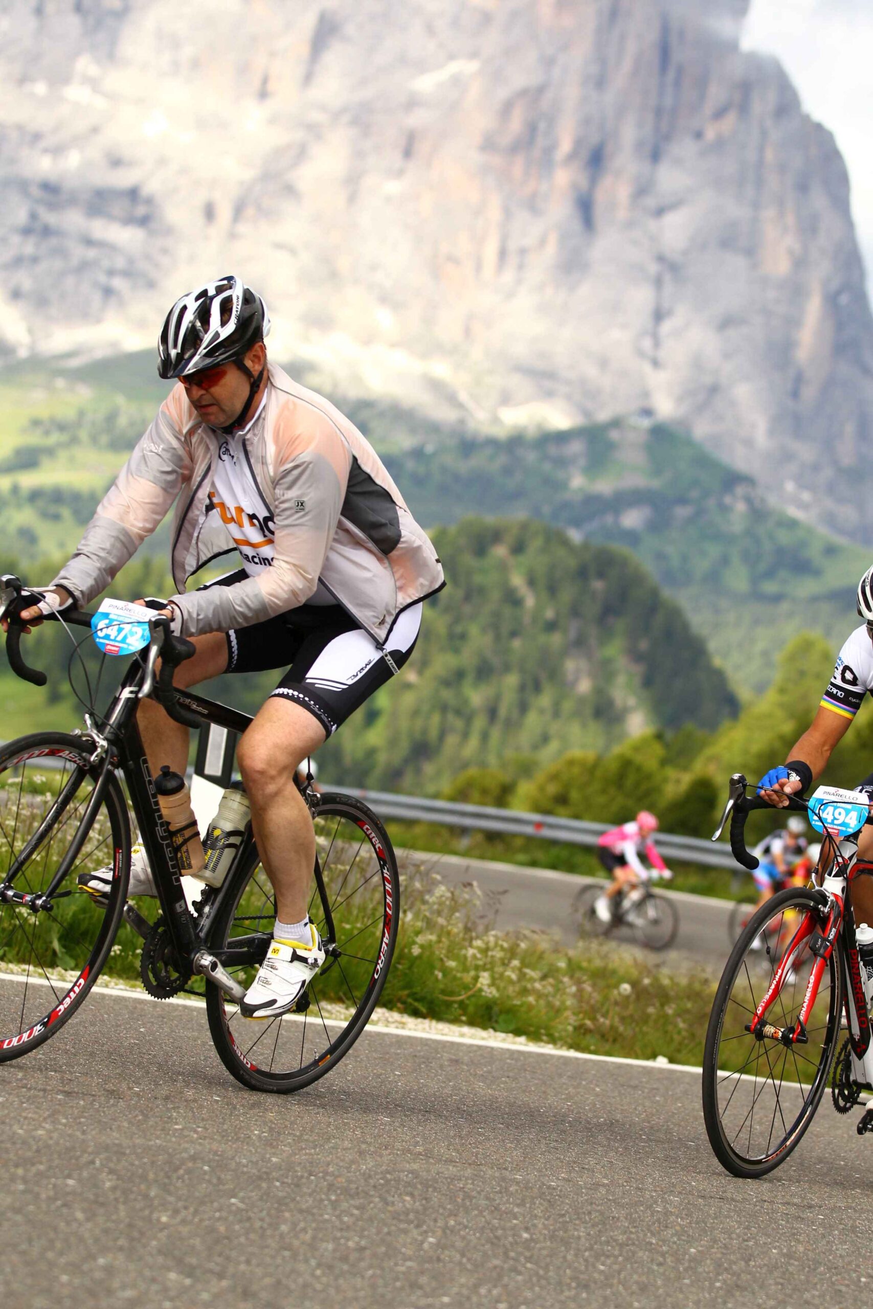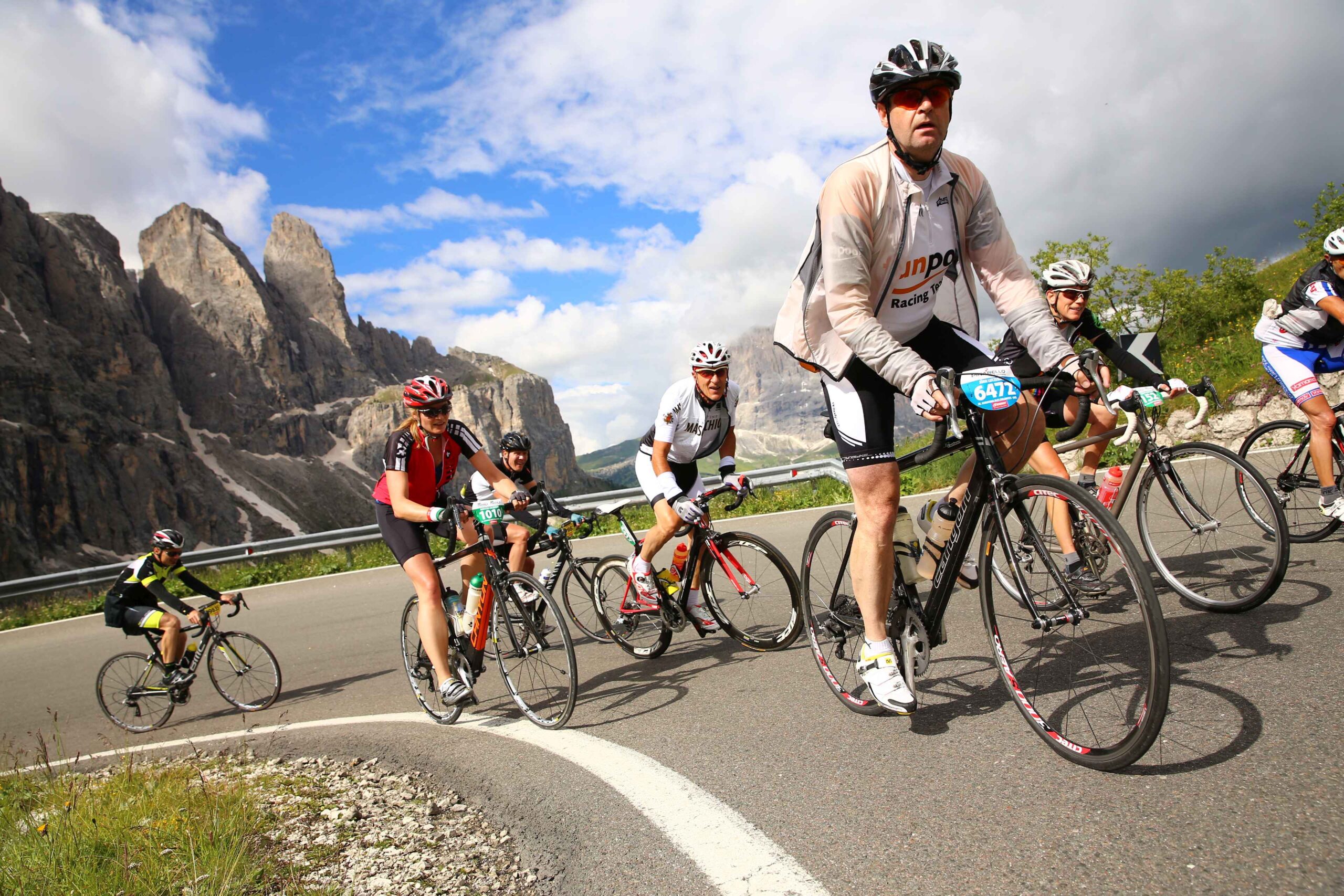 Am ersten Berg (Campolongo) schob sich das Feld sehr zusammen und es ging doch sehr langsam hinauf. Es war fast schon schwierig einen Rythmus zu finden, da doch einige Fahrer mit sehr großen Übersetzungen unterwegs waren und hier bereits Schwierigkeiten hatten. Mit meiner kleinen Übersetzung kam ich ganz gut zurecht und strampelte so mit vielen anderen Mitstreitern den Berg hinauf. Der Anblick von so vielen Radfahrern, die sich alle den Berg hinaufkämpften und fast nur das Surren der Räder zu hören war, war fantastisch, zumal es der Wettergott gut mit uns gemeinte hatte und wir in den strahlenden Sonnenschein fuhren. Ich merkte allerdings, dass meine Blase schon drückte und überlegte, wo ich wohl am besten anhalten konnte. Ich entschied mich am Ende der ersten Abfahrt anzuhalten, in der Hoffnung dort vielleicht eine Toilette zu finden, die es leider nicht gab und so blieb mir nur der Straßenrand ,während die anderen an mir vorbeizogen.
