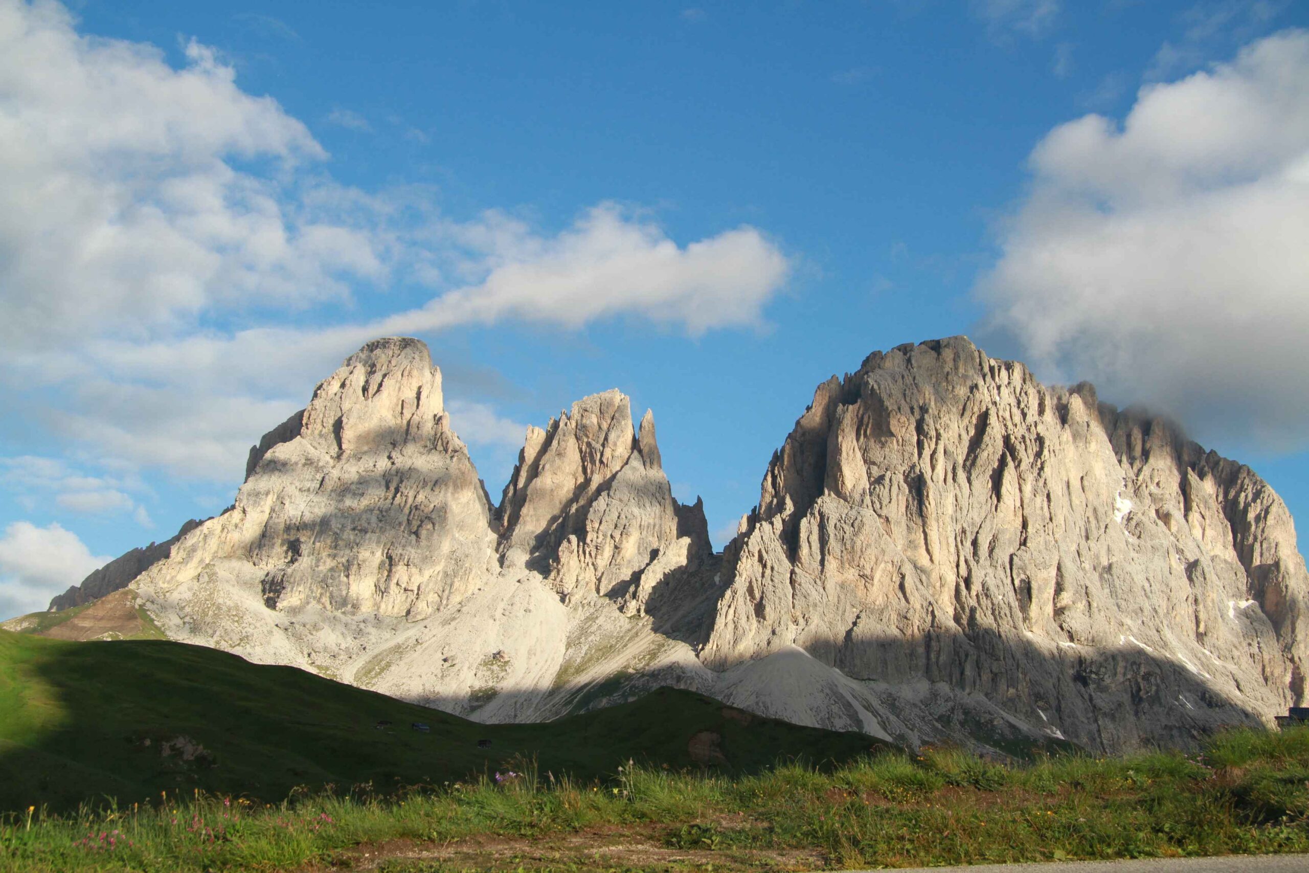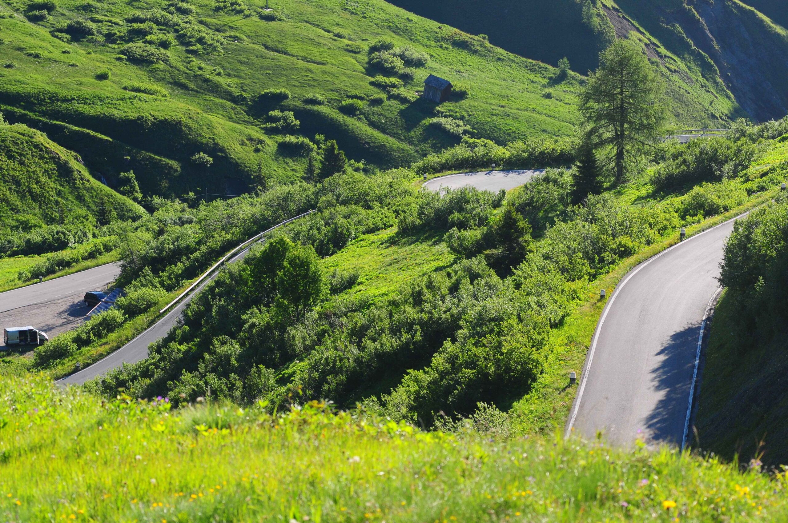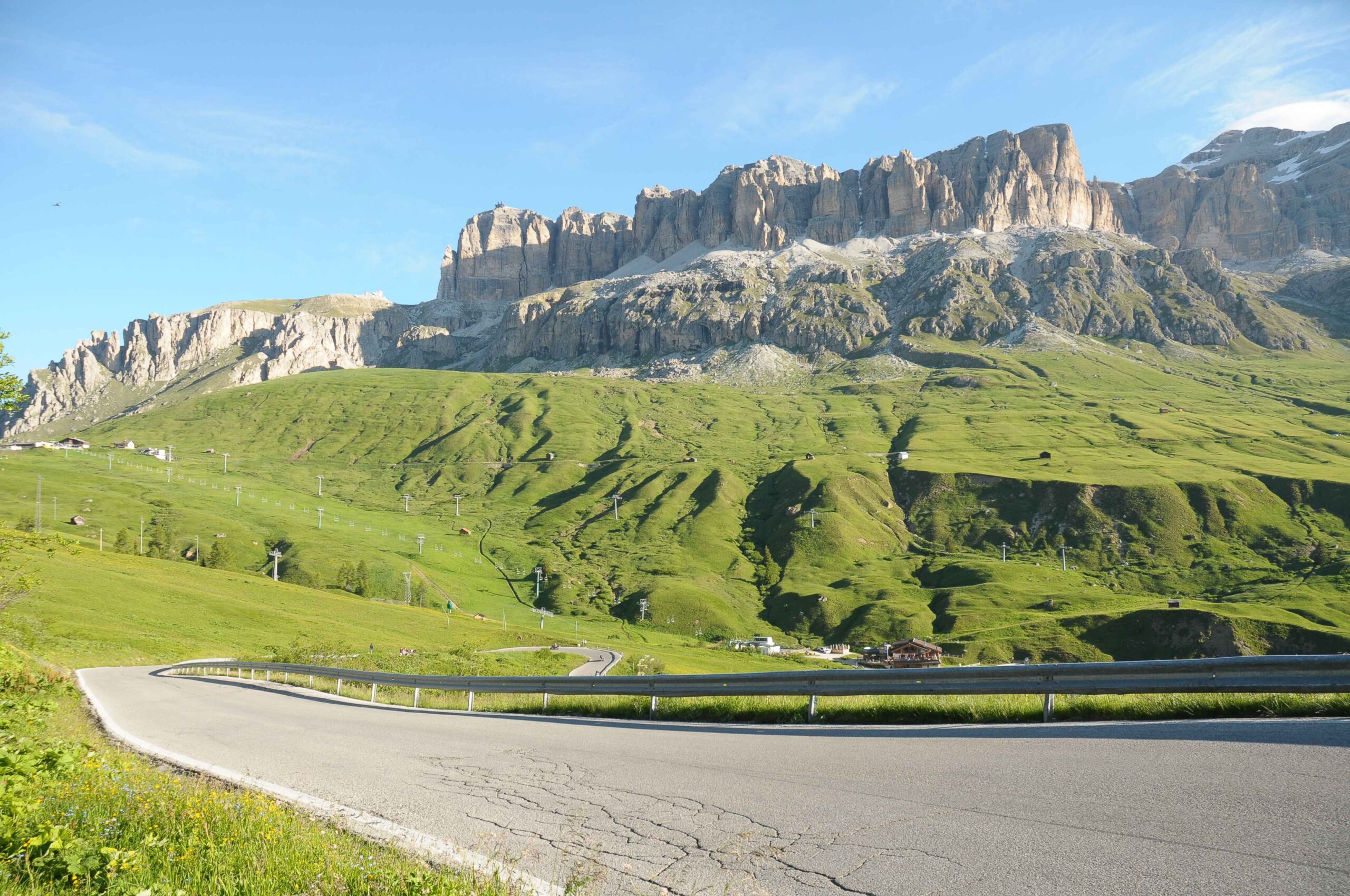 Jetzt ging es hinauf zum Sellajoch. Ich wusste aus meinen Trainingsfahrten auf dem Heimtrainer, dass dieser Anstieg nicht zu lang war doch gerade am Anfang war der Umstieg vom abfahren zum bergausfahren nicht einfach und die Muskeln mussten sich erst wieder umstellen. Am Straßenrand wurden wir mit Glockengeläut angefeuert und alle waren bester Stimmung. In der Abfahrt hin zum Grödnerjoch überholte ich Carsten und ging mit einem Vorsprung in den nächsten Anstieg.