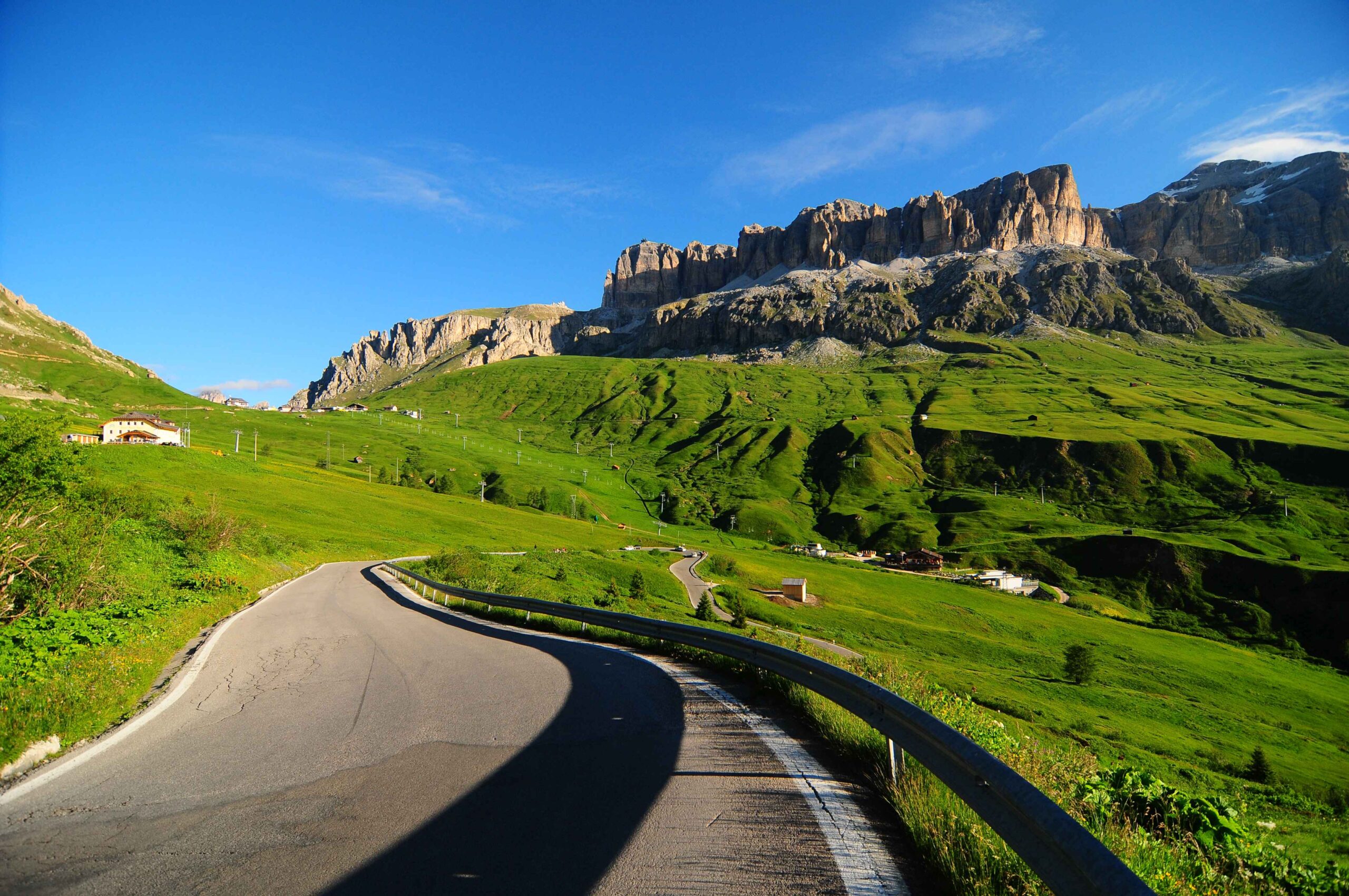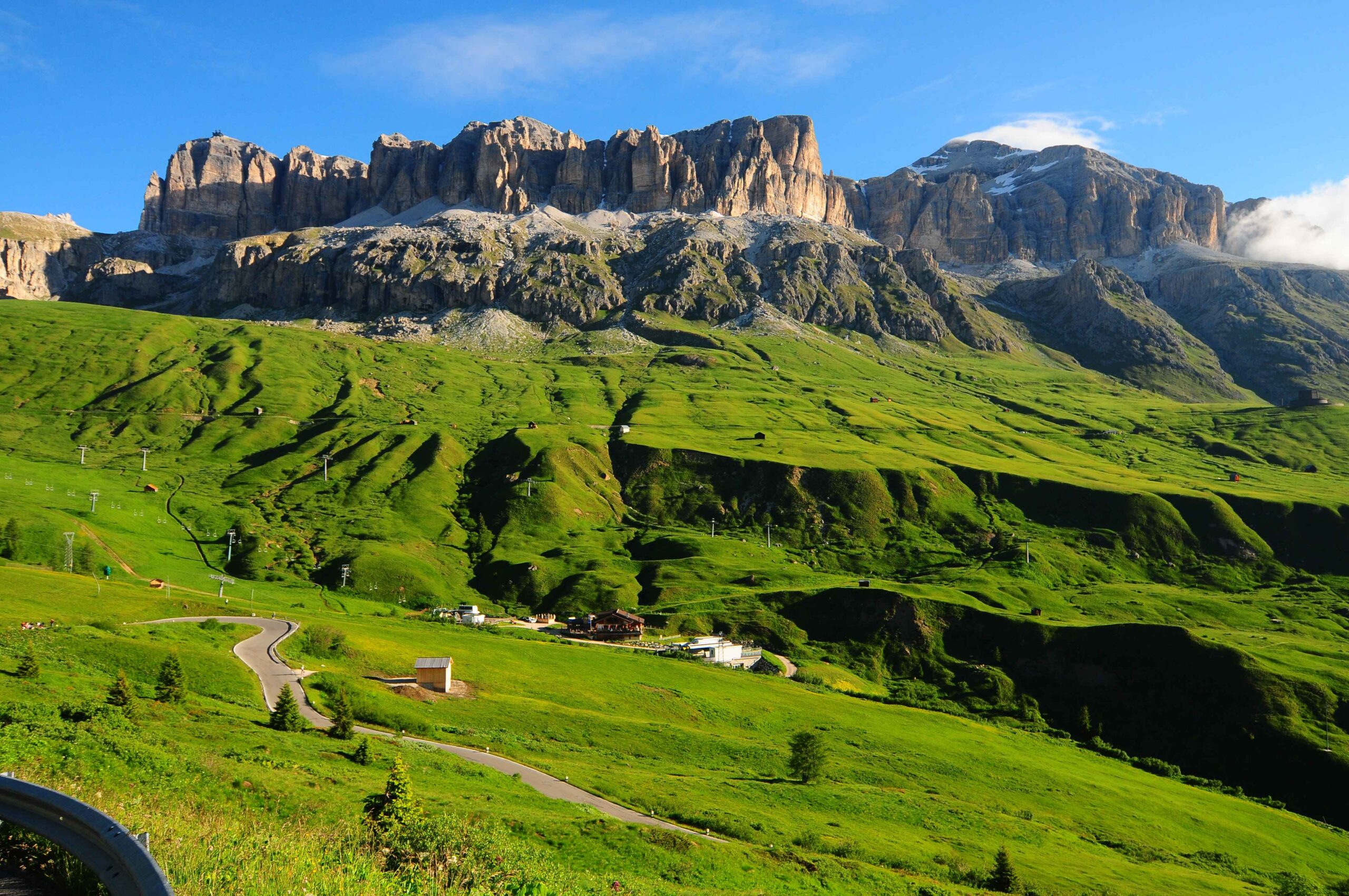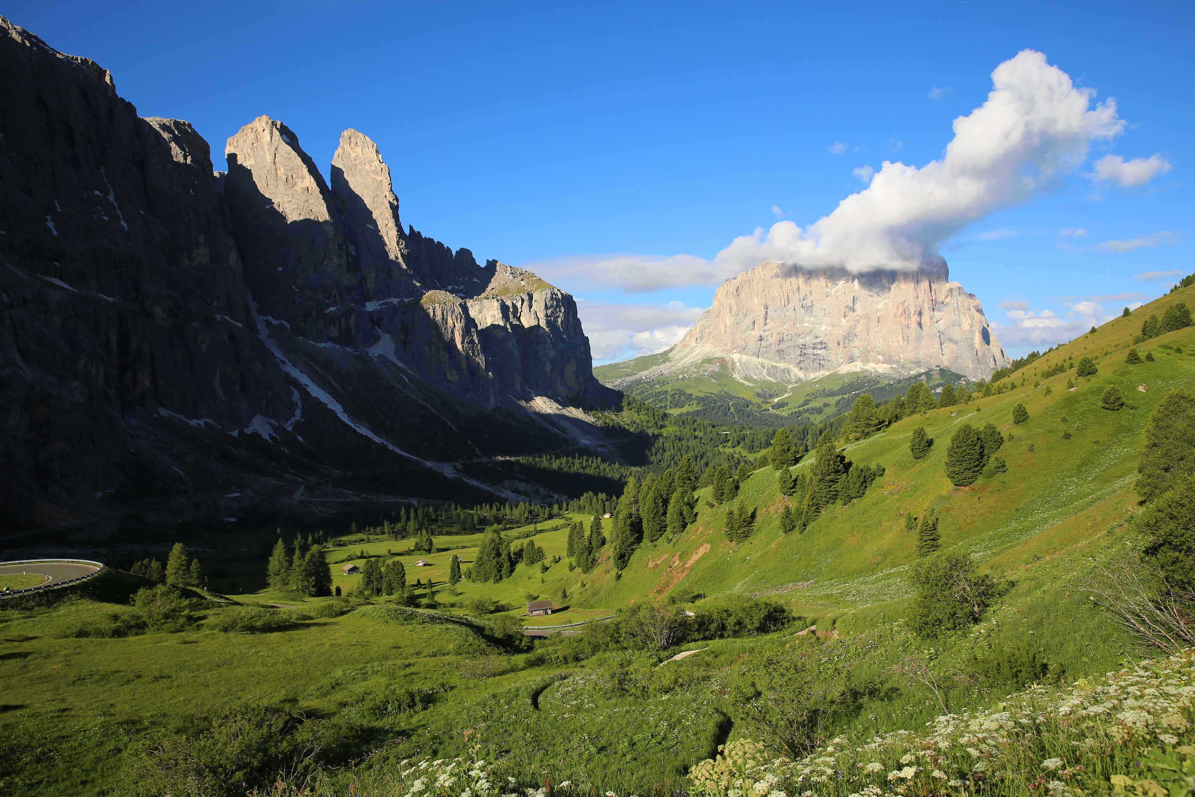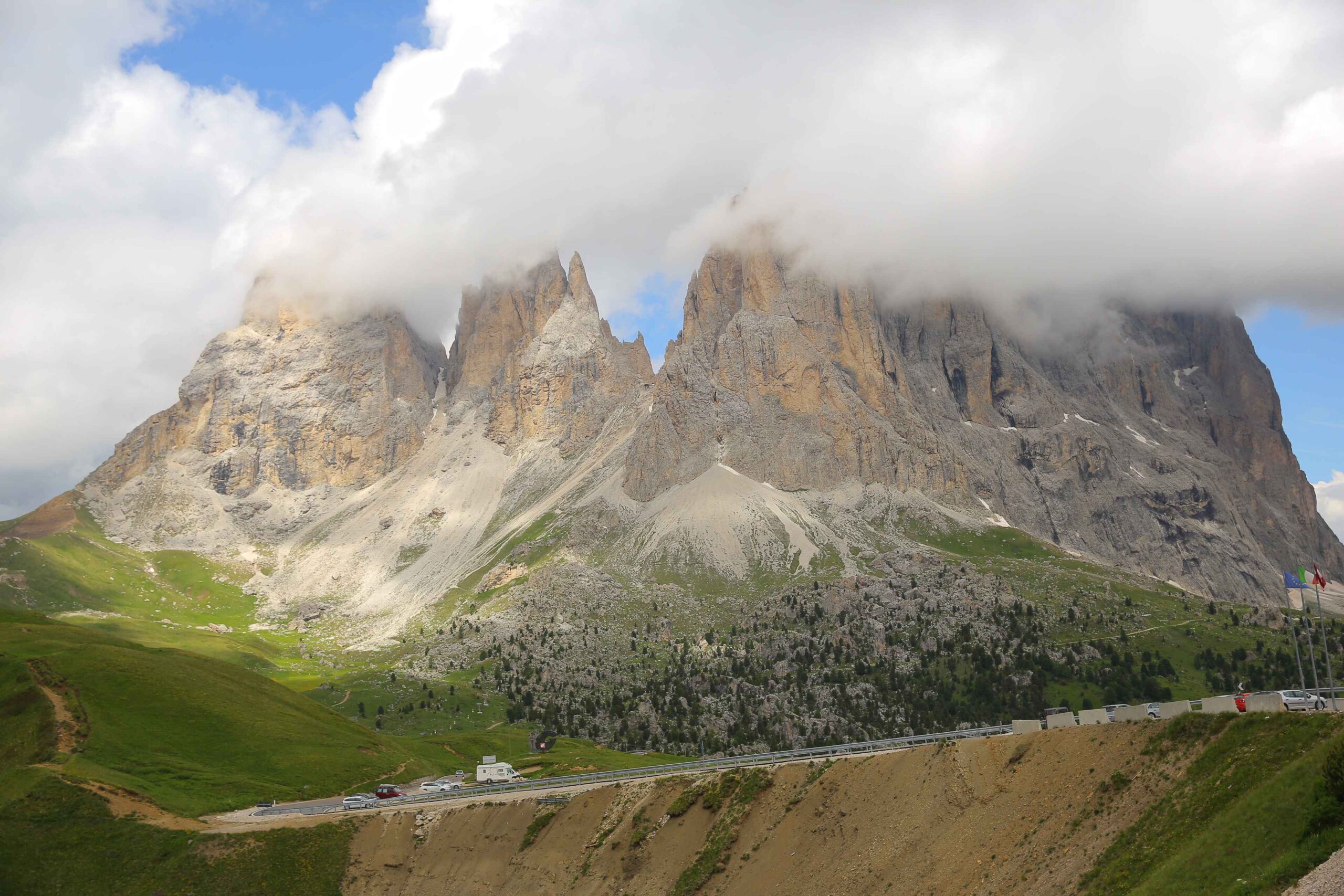 Jetzt ging es hinauf zum Sellajoch. Ich wusste aus meinen Trainingsfahrten auf dem Heimtrainer, dass dieser Anstieg nicht zu lang war doch gerade am Anfang war der Umstieg vom abfahren zum bergausfahren nicht einfach und die Muskeln mussten sich erst wieder umstellen. Am Straßenrand wurden wir mit Glockengeläut angefeuert und alle waren bester Stimmung. In der Abfahrt hin zum Grödnerjoch überholte ich Carsten und ging mit einem Vorsprung in den nächsten Anstieg.
