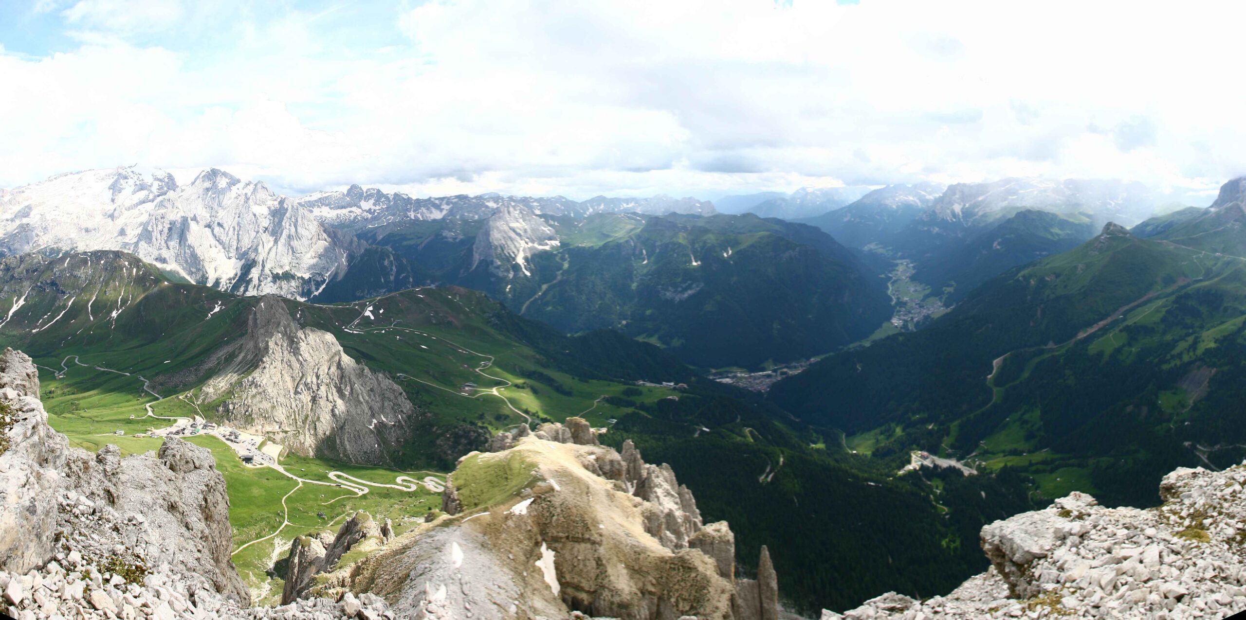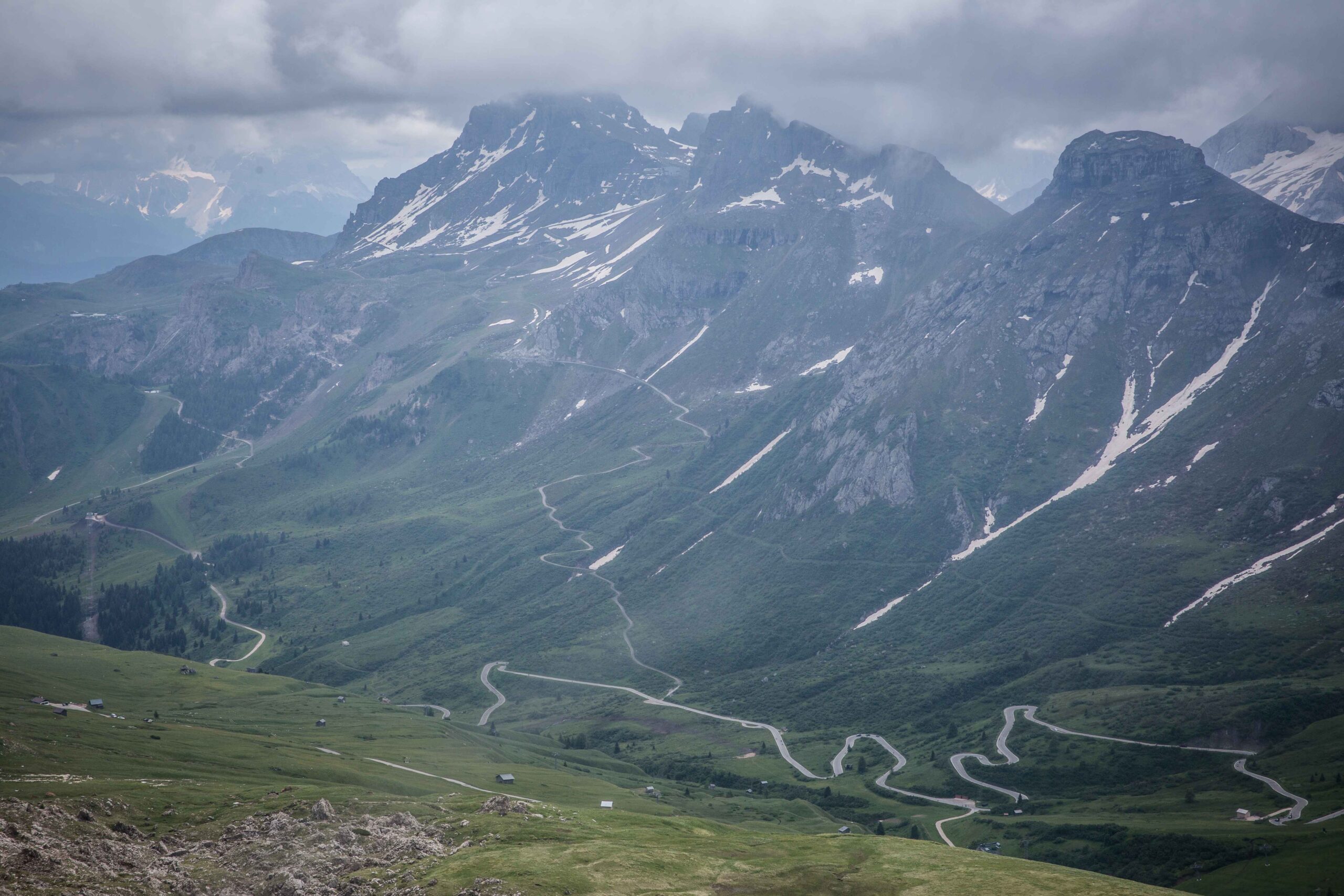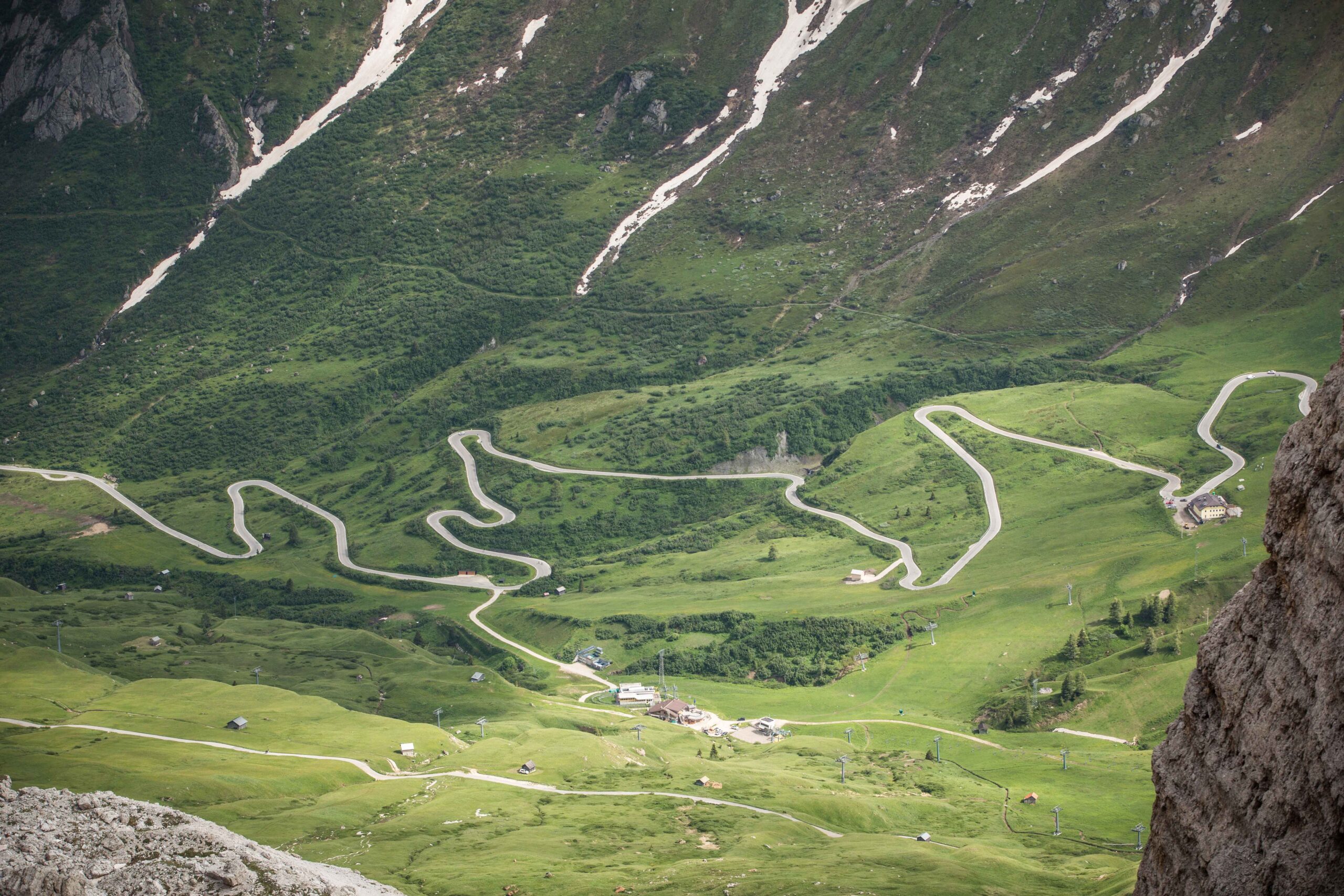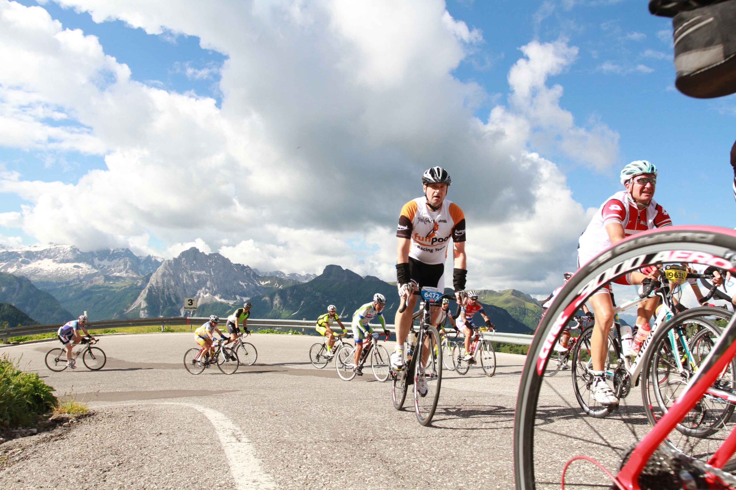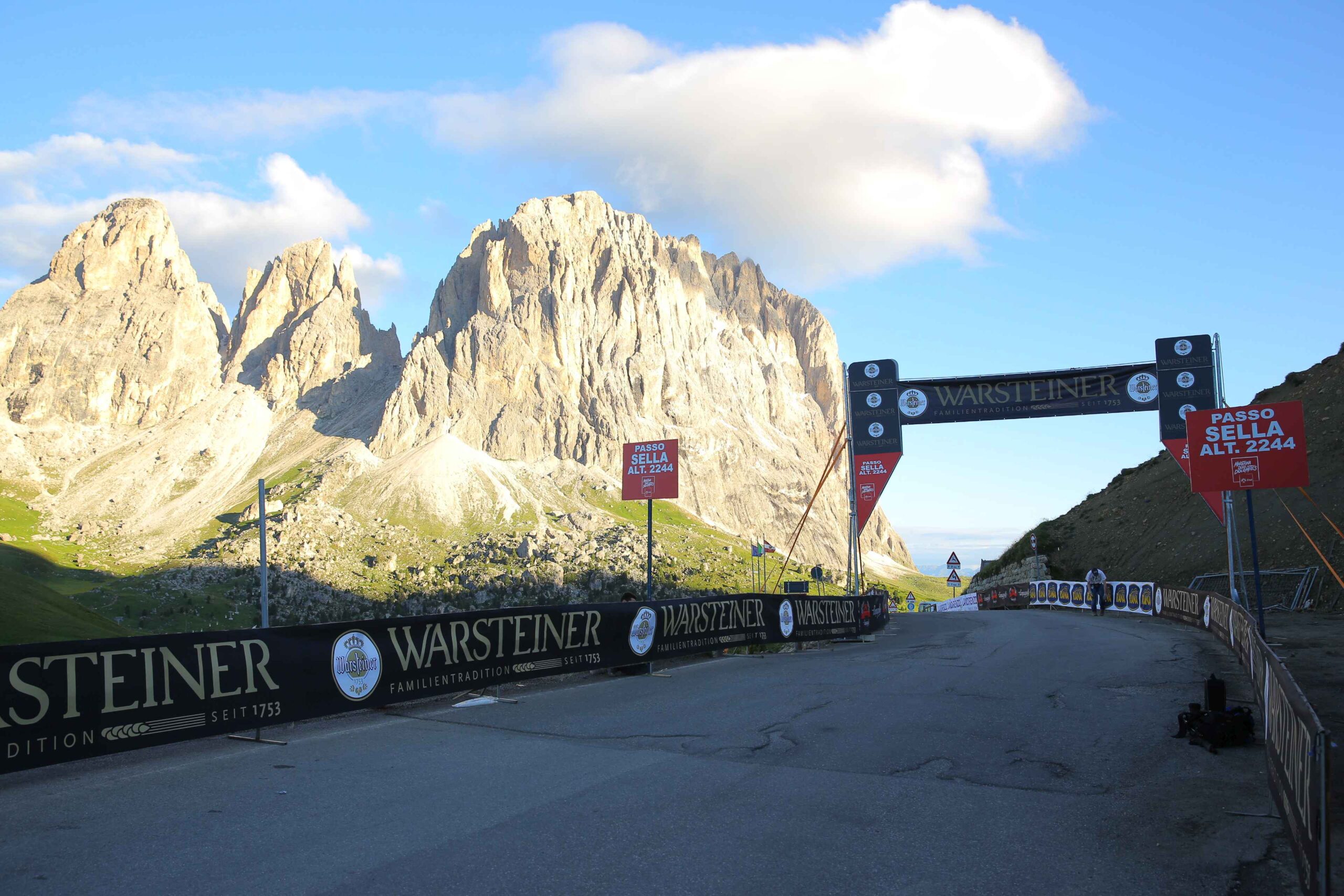 Es folgte der Anstieg zum Passo di Pordoi. Hier zog sich das Feld bereits etwas auseinander und man hatte mehr Gelegenheit sein eigenes Tempo zu finden. ich versuchte nicht zu schnell zu fahren, da ich immer noch einen heiden Respekt vor den noch zu überwindenden Bergen hatte. Für die gut 9km hinauf zum Gipfel benötigte ich fast eine Stunde und war immer noch von vielen anderen Radfahrern umgeben. Auch gab es nochmal die Gelegenheit ins Tal zu Blicken und die lange Kette an Radfahrern zu bewundern. Diesen Moment werde ich nie vergessen. In der Abfahrt konnte ich dann meine Fähigkeiten ausspielen und fuhr doch an einigen anderen vorbei und machte so wieder Plätze, die ich in der Auffahrt verloren hatte wieder gut.