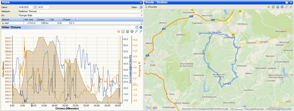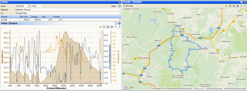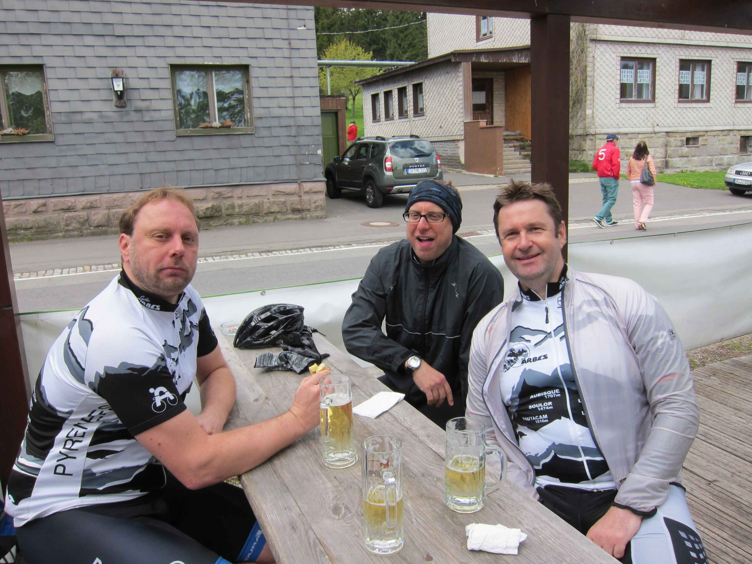 Wir anderen drei machten eine schöne Runde in den Norden des Thüringer Walds, wobei uns auch die ein oder andere Motorradtruppe überholte und wir auch, dank Herrentag, diverse Mountain Bike Gruppen sahen. Die Sonne schien und es war auch nicht zu kalt, Marcus war sogar in kurz-kurz unterwegs. Nach ca. 30 Kilometern fanden wir auch eine gute Gelegenheit oben am Gehlberg uns mit einem Herren-Bierchen und einer Thüringer Bratwurst zu versorgen. Schließlich hatten wir unseren ersten richtigen Anstieg hinter uns und die Erholung kam genau zum richtigen Zeitpunkt. Im Anschluss ging es fast nur noch bergab, zurück nach Manebach. So hatten wir es immerhin auf gute 50 Kilometer und über 800 Höhenmeter gebracht.