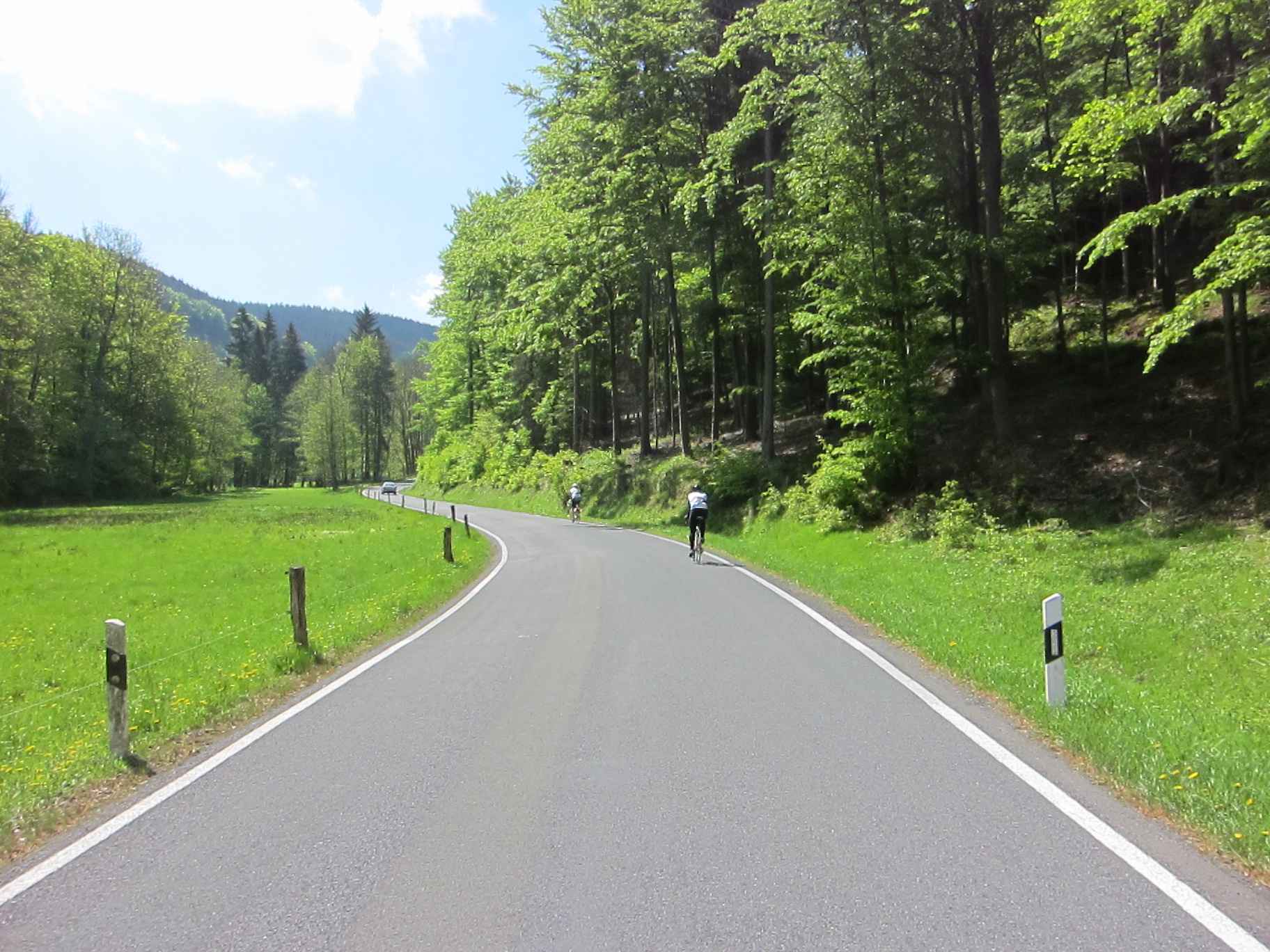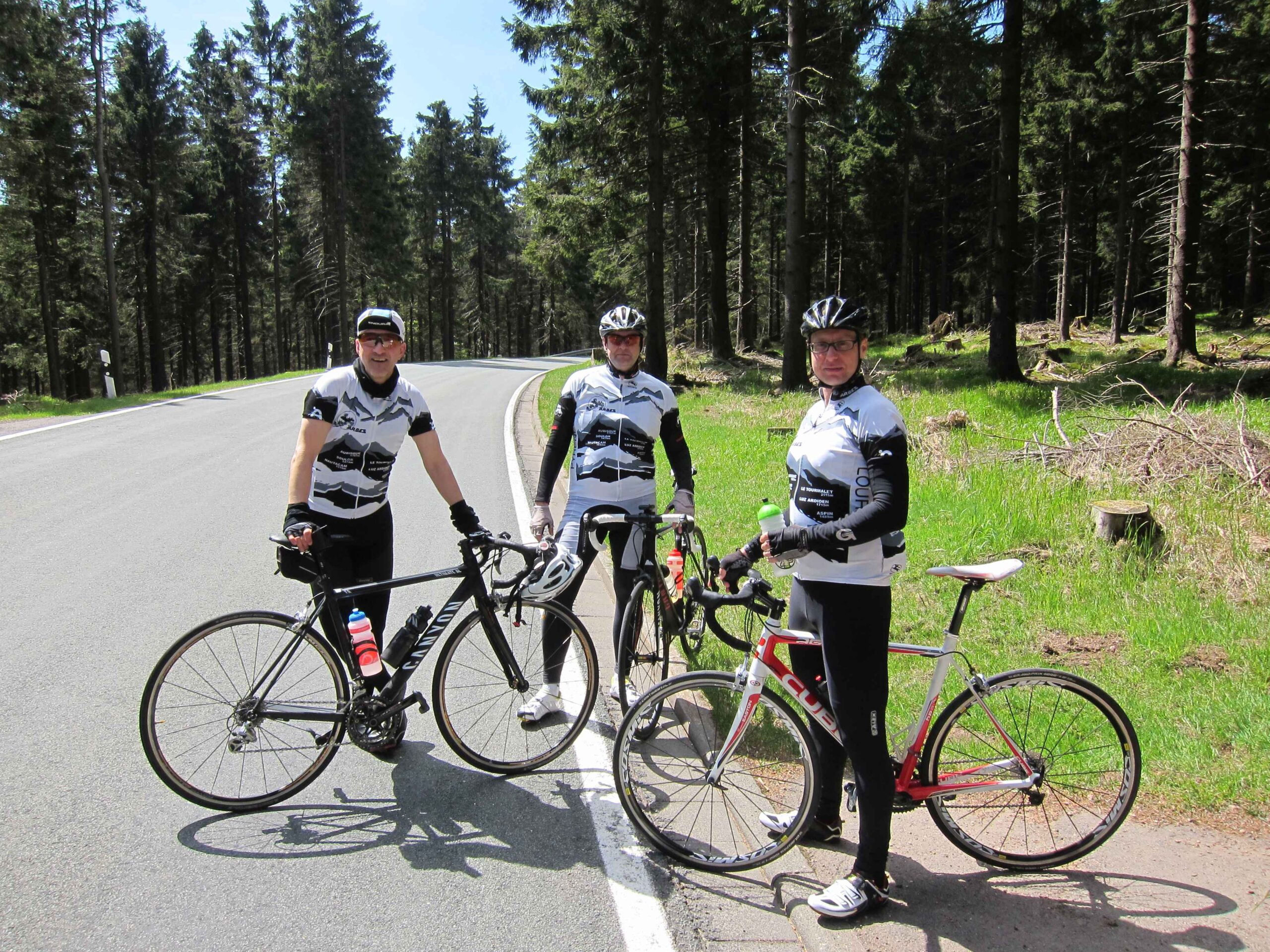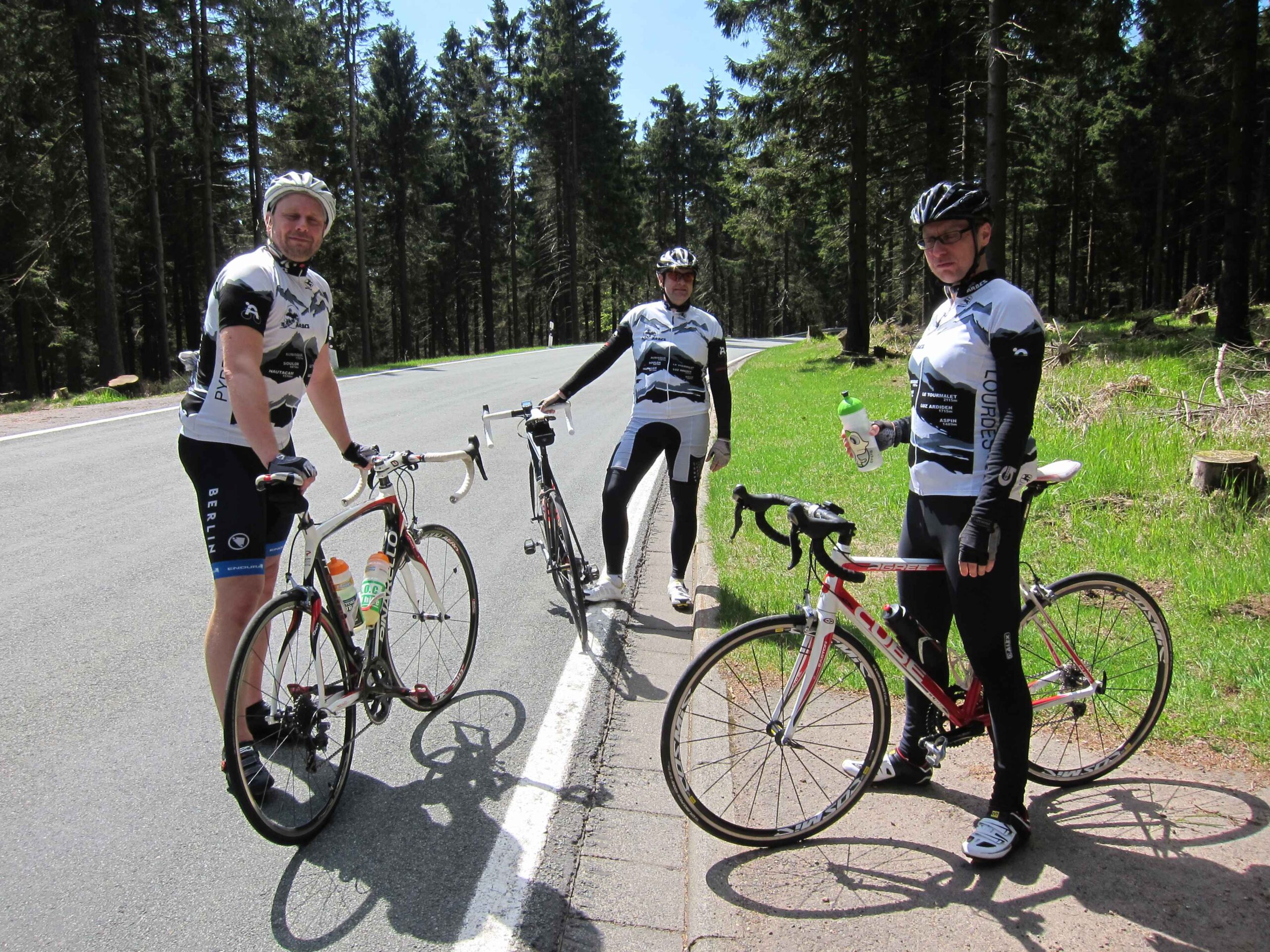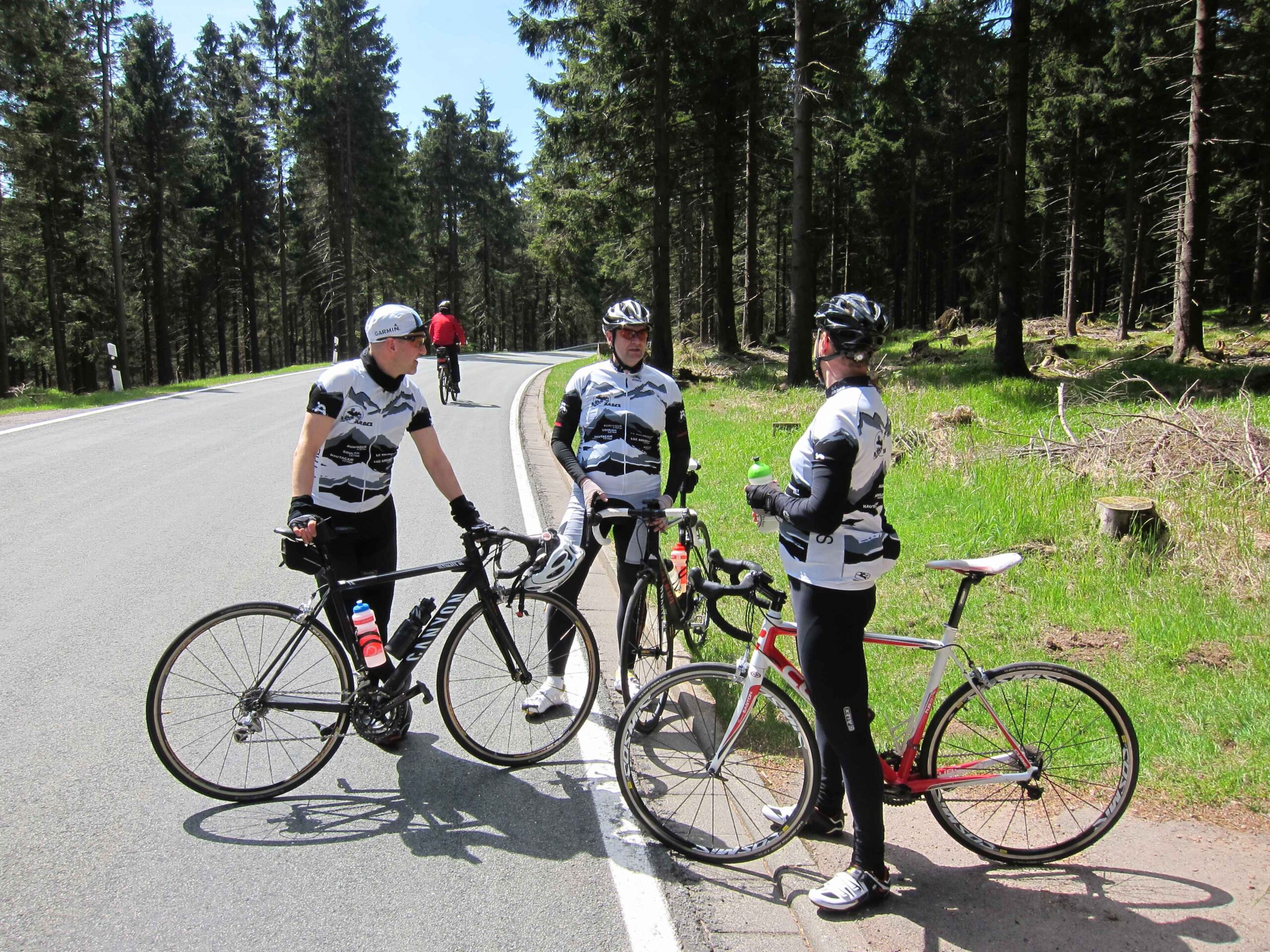 Jetzt waren wir in voller Mannstärke zusammen und die zweite Runde konnte losgehen. Carsten war ganz interessiert an meinem neuen Renner und machte gleich eine kurze Probefahrt, bevor es wirklich los ging. Nach einer Abfahrt hinunter nach Ilmenau ging es einen längeren Anstieg mit zwischenzeitlich 12% hoch. Hier zeigte sich gleich, dass Carsten mal wieder eine gute Form hatte und sogar Fayek in Schach hielt. Da ich diesmal keine Kamera dabei hatte, übernahm Frank das Bilder schießen und ließ uns auch immer wieder für ein paar sehr schöne Fotos anhalten. Nach einer weiteren kleinen Abfahrt ging noch einmal ein schönen Anstieg mit ca. 7% hoch. Danach ging es dann in einer schönen langen Abfahrt wieder runter nach Ilmenau und es blieb nur noch der Schlussanstieg nach Manebach