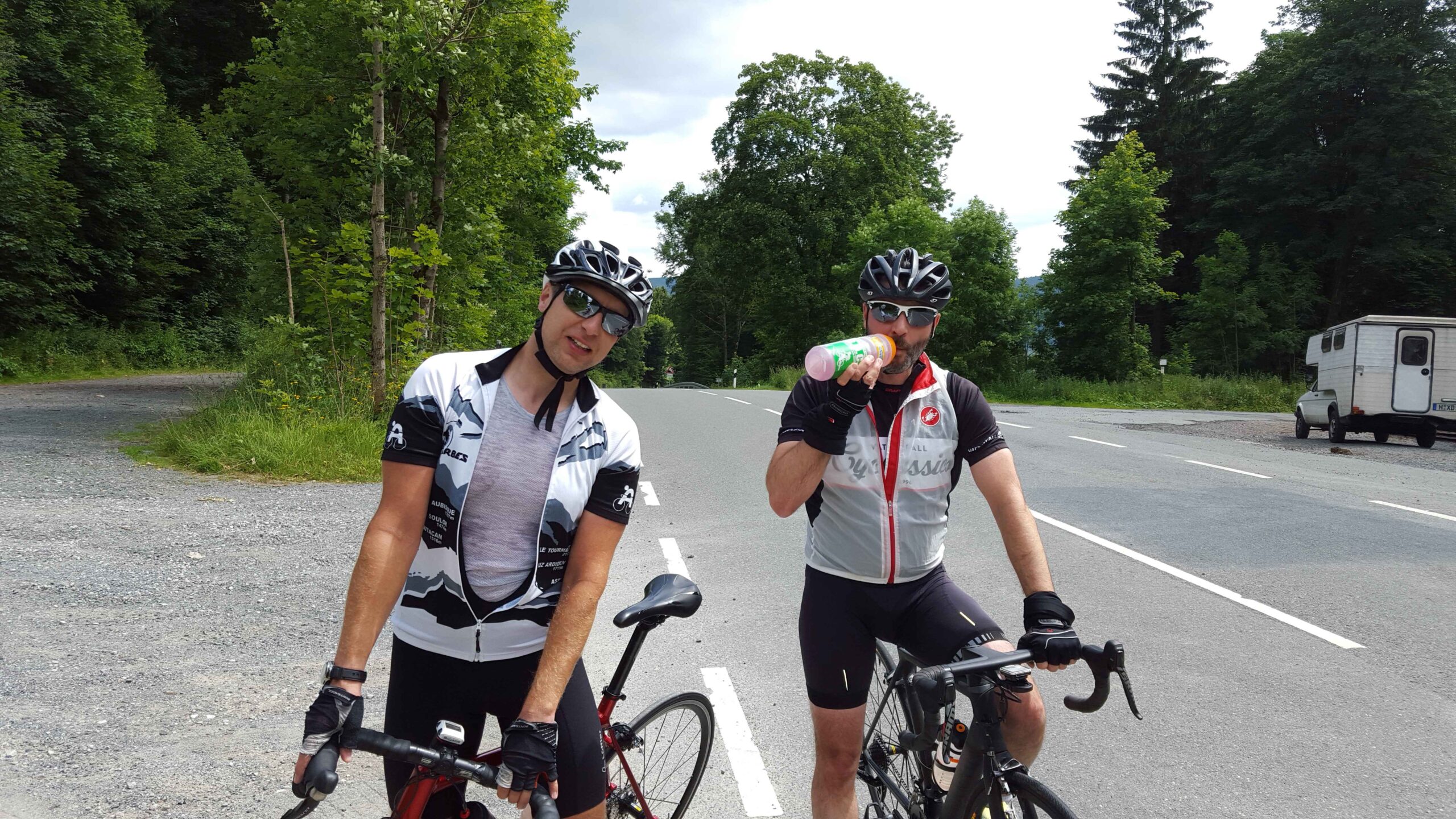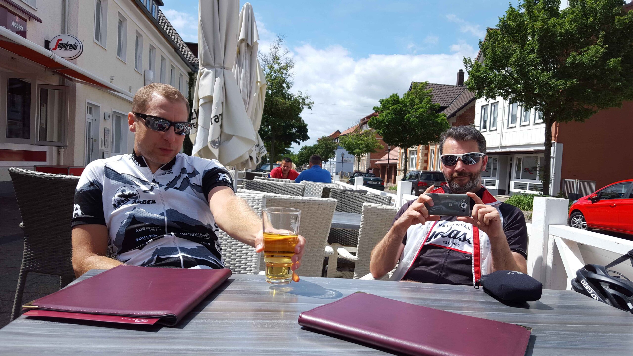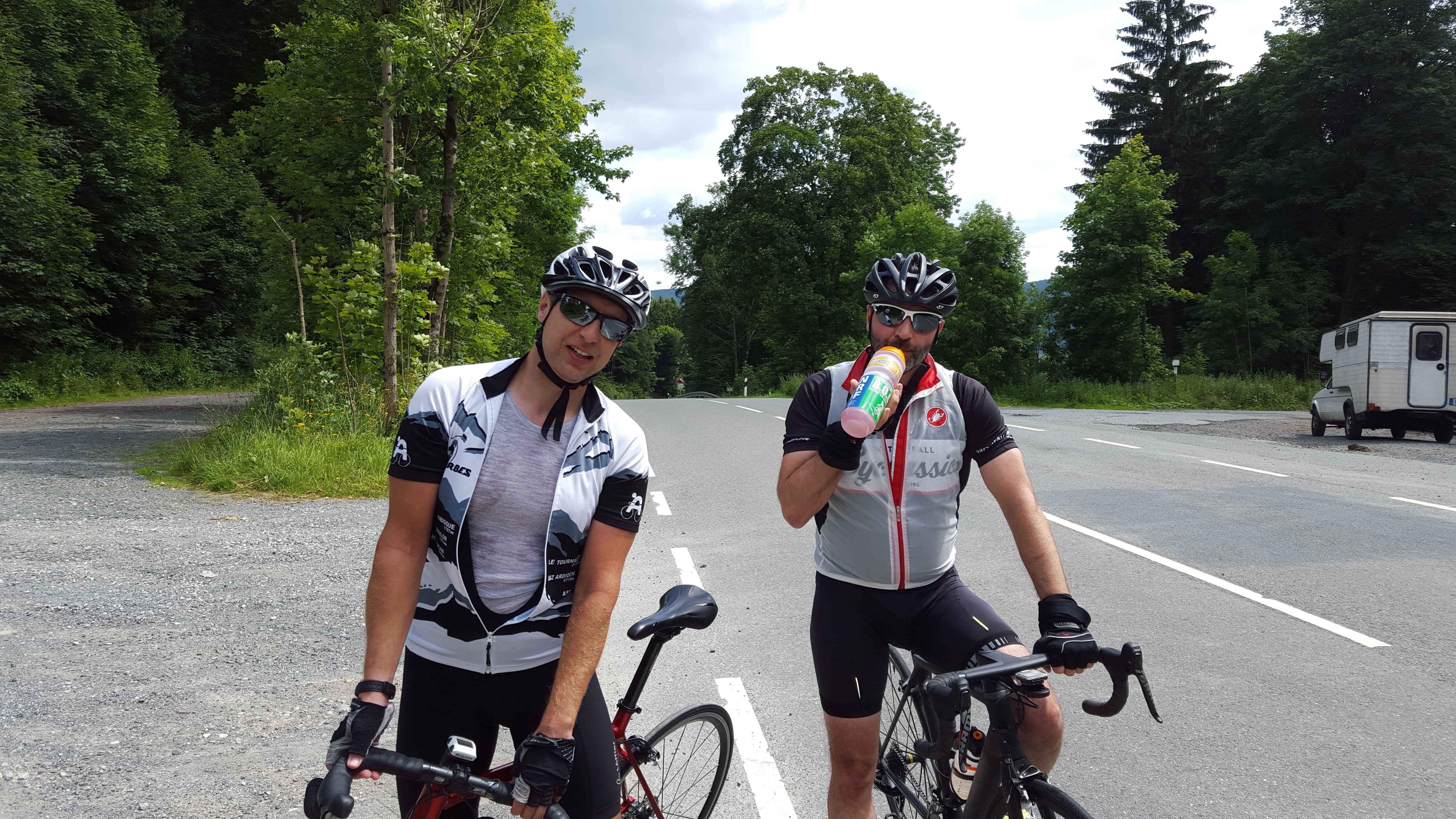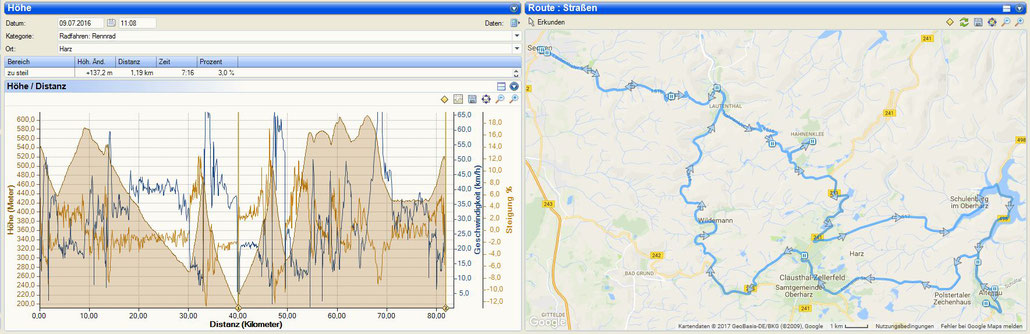 Das Wetter war uns hold und wir konnten bei besten Temperaturen und Sonnenschein in die Runde starten. Die Anfahrt über Schulenberg und Clausthal ging bestens und auf der langen Abfahrt von Wildemann durch das Lautenthal war Fayek wieder in seinem Element. Wir düsten mit 40km/h über die Strecke und unserem ersten echten Anstieg entgegen. Der war dann auch echt knackig. Der gesamte Anstieg hat nur eine Länge von 2,7 km doch galt es auf dieser Strecke einen Höhenunterschied von gut 200 hm zu überwinden. Gerne hätte ich in diesem Moment mein Bergritzel dabei gehabt, musste mich aber mit der 36-28er Übersetzung hinaufdrücken. Hier half mir dann auch das Training aus dem Keller und ich konnte Casi etwas distanzieren und schaffte es sogar Fayek in Schach zu halten. So gehörte die erste Bergwertung mir 🙂 Die Abfahrt hinunter nach Seesen zeigte uns schon mal was uns noch erwarten würde. Doch suchten wir uns in Seesen erst einmal ein nettes Cafe, genossen  die Sonne und sammelten unsere Kräfte für die Rückfahrt. Diesmal war der Anstieg etwas kürzer. Nur die letzten 700 m hatten wieder eine deutliche Steigung und die Trittfrequenz sank locker auf die 50 um/Min. Erneut durfte ich die Bergpunkte einstreichen…