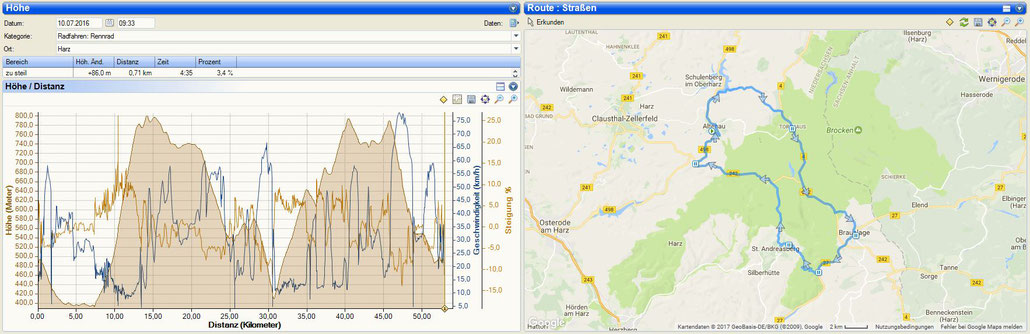 Auf dem Weg nach Braunlage schlossen sich uns zwei andere Radler an und wir fuhren ein Stück zusammen. Es ist doch immer wieder schön wenn sich so spontan Gleichgesinnte zusammenschließen. Da die Umgehungsstraße von Braunlage für Radfahrer gesperrt war fuhren wir direkt durch Braunlage und ich stellte mal wieder fest, was für ein schönes Städtchen dies doch ist.  Nach einer mittelmäßigen Abfahrt durch eine lange Baustelle ging es dann in Richtung Andreasberg. Die Strecke dort hinauf ist eine sehr schöne, mit ansprechender Steigung. Ich konnte diese Auffahrt umso mehr genießen, da Fayek bereits am Anfang mir enteilt war und ich so wirklich mal mein Tempo fuhr. In Andreasberg ging es dann gleich kräftig hinauf und ich zog das Tempo mit Fayek im Schlepptau deutlich an. Doch am Ende musste ich ihn wieder passieren lassen…