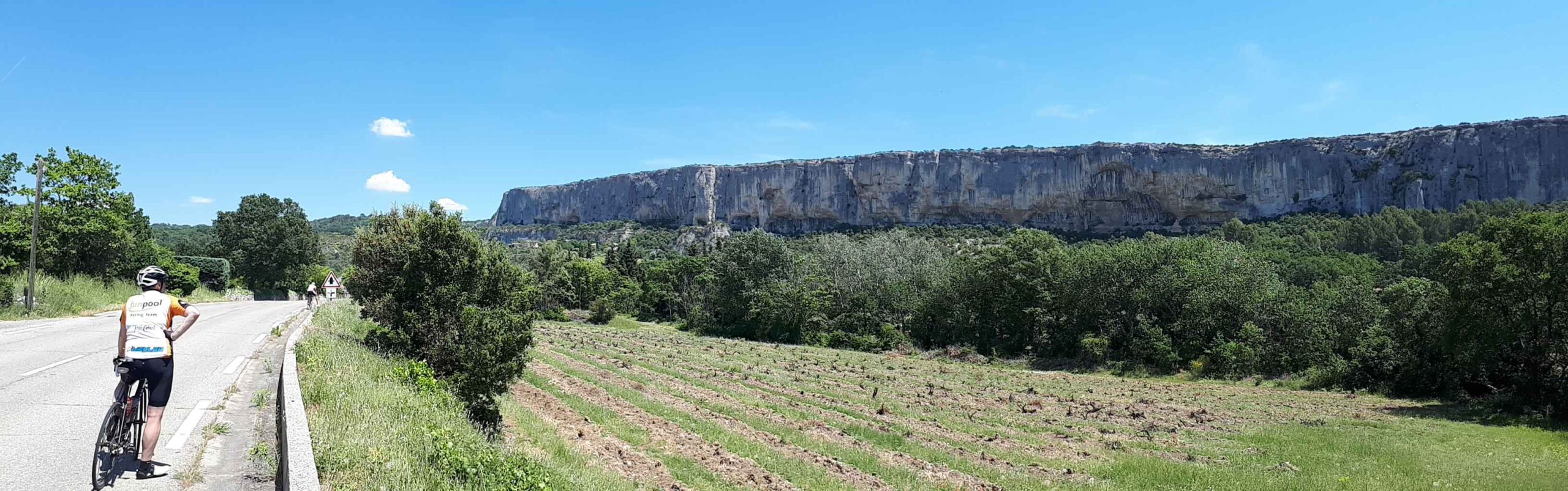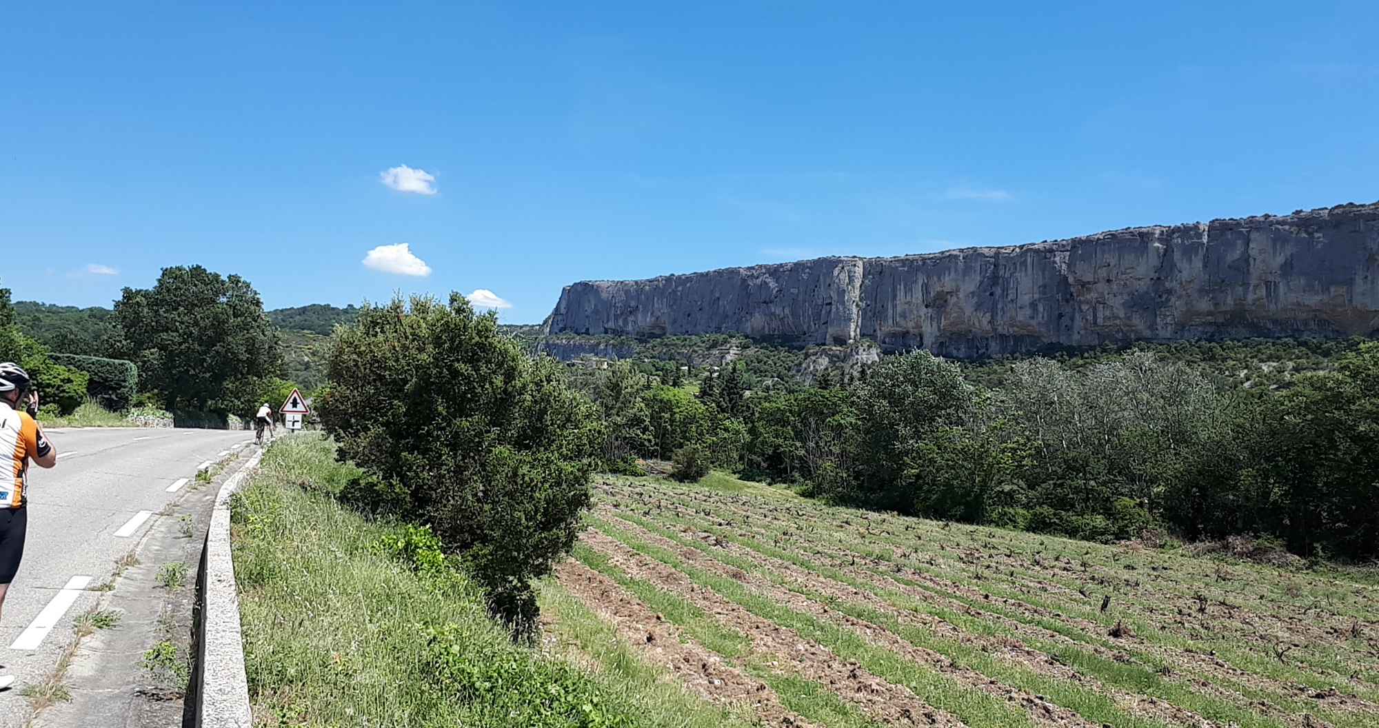 Nach unserer erfolgreichen Befahrung des Mont Ventoux am vorherigen Tag sollte es heute ins südliche Umland gehen. Ich hatte eine schöne Strecke geplant und bei bestem Wetter machten wir uns auf den Weg. Meine Beine waren an diesem Morgen richtig gut. Den großen Berg im Rücken ging es über leicht hügeliges Terrain bis der erste Anstieg hinauf zum Col de Murs kam. Lange nicht so steil und lang wie gestern, doch mindestens genauso schön. Es ging recht kurvenreich durch eine schmale Schlucht mit sehr wenig Autoverkehr. Nach der Hälfte des Anstiegs ging ich nochmal richtig aus dem Sattel und gab Gas. So konnte ich Fayek und Carsten etwas distanzieren, was meinem Ego durchaus gut tat und oben ein kleines Video von Fayek und Carsten drehen.