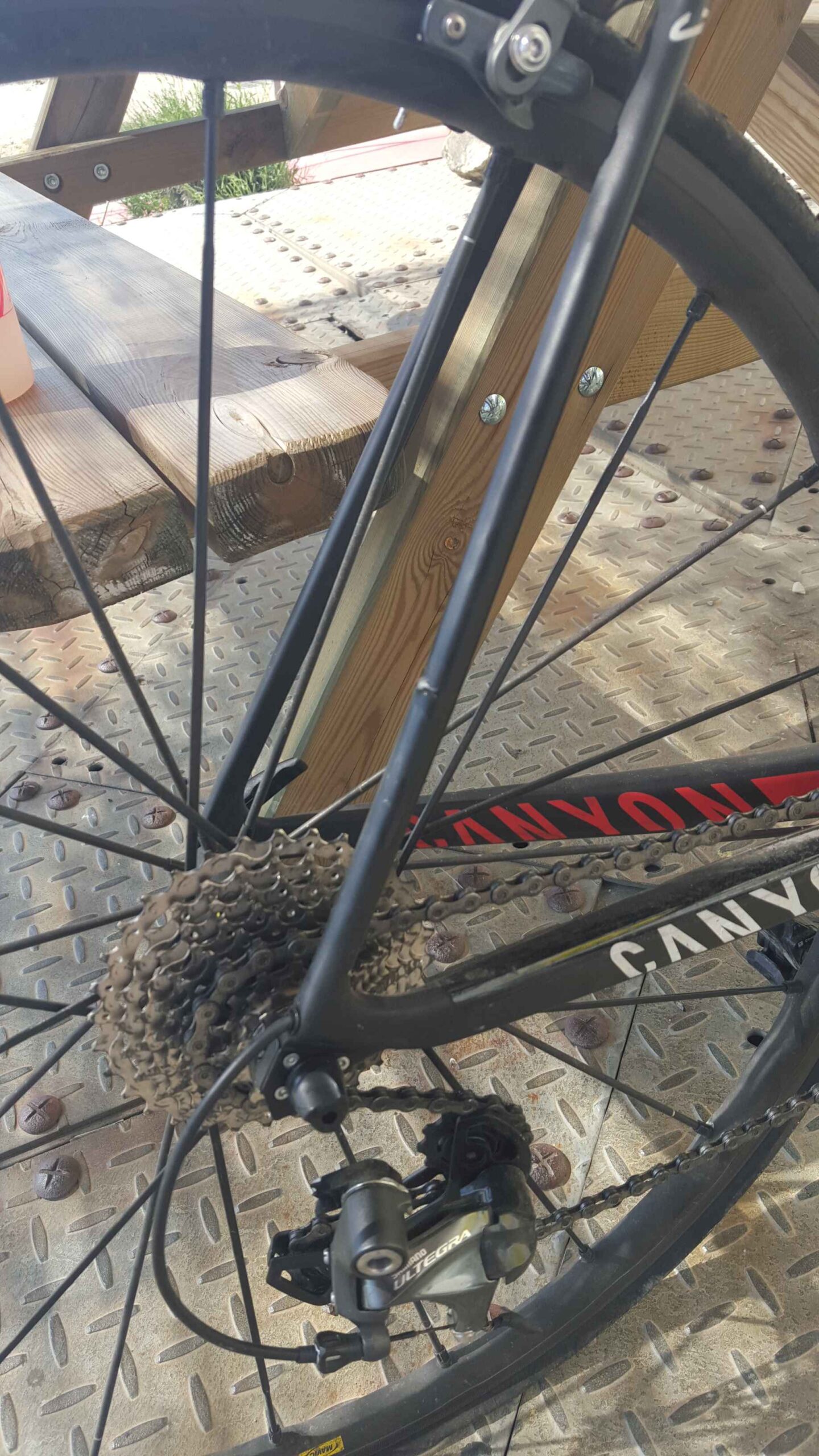 Leider gab es hier den nächsten Rückschlag. Der Mechaniker meinte ein neues Schaltauge würde sicherlich 1-2 Tage brauchen, da er es sich von Canyon schicken lassen müsste, doch meinte er mit Blick auf den Rahmen, dass er jegliches Fahren damit nicht anraten würde. Er zeigte auf meine rechte Hinterbaustrebe, die an zwei Stellen angebrochen war. Somit war klar dass der Rahmen irreparabel defekt war und jedes weitere Fahren damit ausgeschlossen war. Meine Stimmung ging ziemlich in den Keller. Ich konnte nach einigem hin und her Markus erreichen und ihm meine Situation schildern und ihn bitten mich in dem Radgeschäft abzuholen. So setzte ich mich vor das Geschäft und warte ca. 2 Stunden bis Markus mich aufsammelte und mit zurück zu unserer Unterkunft nahm.