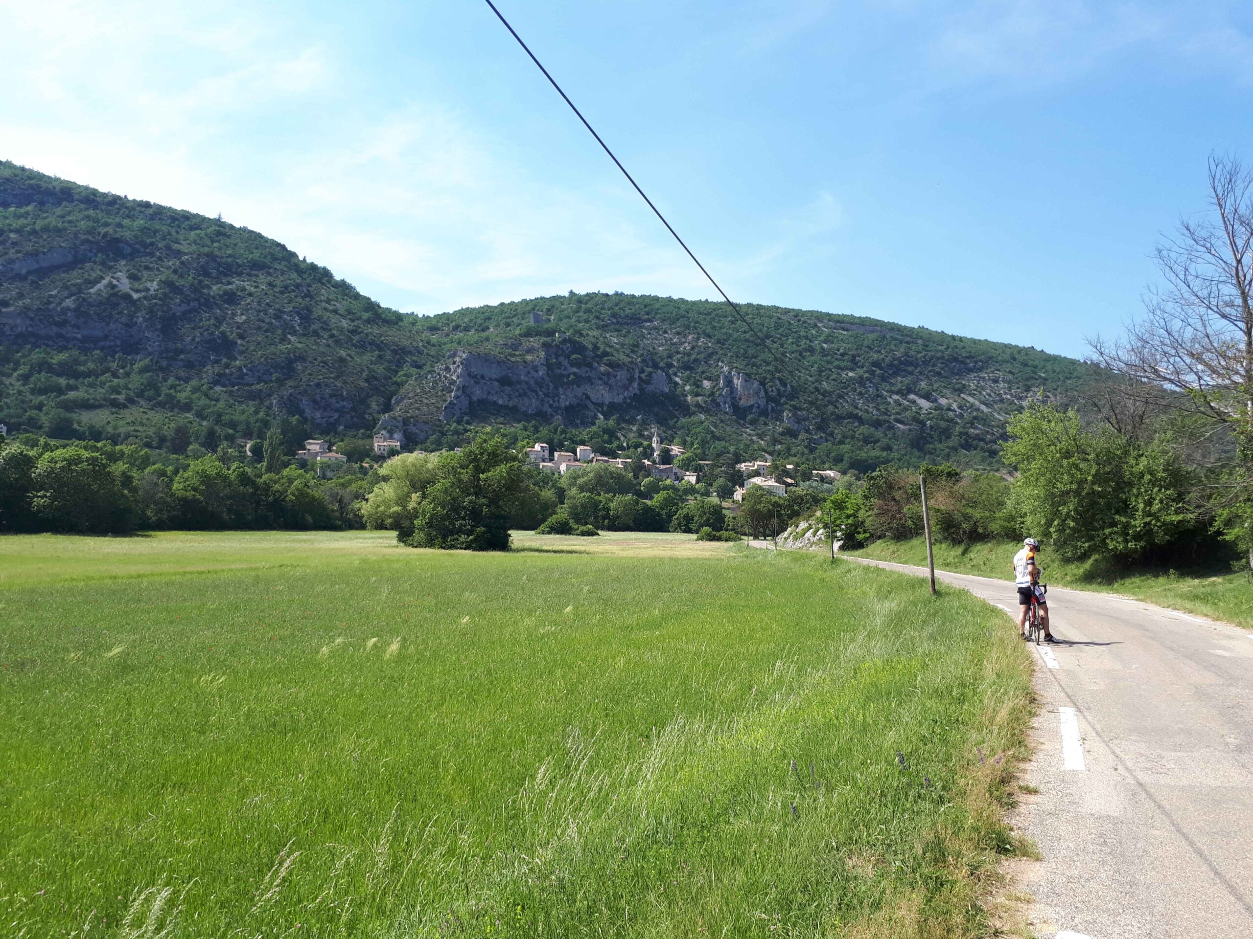Nach einem Zwischenhalt an einem Brunnen zum Auffüllen unserer Flaschen ging es weiter mit schönen Blick über die Landschaft. Auch der zweite Anstieg ging richtig gut und ich konnte ein schönes Tempo anschlagen. Kurz nach dem Gipfel kamen wir an eine Straße, die gerade neu gemacht wurde. Die Walze fuhr noch drüber und presste den Split mit dem leicht warmen teer zusammen. Unsere Reifen sammelten auch reichlich von dem Split auf und es kam wie es kommen musste, mir platzte der Reifen. Ich hielt direkt an, um mir den Schaden anzusehen, wobei ich zu meinem Schrecken feststellen musste, dass die Krafteinwirkung so groß gewesen war, dass mein Schaltauge abgerissen war. Somit war an weiterfahren nicht zu denken. Zu unserem Leidwesen war der Handyempfang an dieser Stelle nahezu gleich null, so dass wir Markus, Julia oder Regina nicht erreichen konnten. Auch war sehr wenig Autoverkehr auf der Straße. Carsten sprach einen Autofahrer an, der gerade von seinem „Anwesen“ herunterkam, doch er war sehr zurückhaltend und sah sich nicht in der Lage uns zu helfen. Wenige Minuten später konnte Casi erneut einen Autofahrer anhalten, der sich sehr zuvorkommend zeigte und gerne bereit war mich in die nächste Stadt zu einem Radgeschäft zu bringen. So trennten wir uns. Casi und Fayek machten sich auf den Weg zurück zu unserem Haus, wobei sie erst einmal eine längere Strecken die Räder schoben um nicht dasselbe Schicksal zu erleiden und ich unterhielt mich mit meinem Helfer. Er fuhr nur so durch die Gegend und war gerade bei den Filmfestspielen in Cannes gewesen. Netterweise brachte er mich zu einem Radgeschäft in Sault. Dort angekommen wünschte er mir alles Gute und ich berat den Laden in der Hoffnung auf eine schnelle Reparatur.