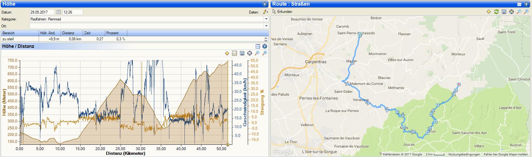 Noch am Abend machte ich mich mit Casi auf den Weg nach Bedoin ins nächste Radgeschäft, um mir dort ein Rad für die kommenden Tage zu leihen. Ich legte Wert auf ein halbwegs gleichwertiges Rad und konnte ein Trek Domane mit Kompaktkurbel und 32er Ritzel mieten, doch mein Rad war hin und konnte den Rest unseres Urlaubs nicht mehr genutzt werden..