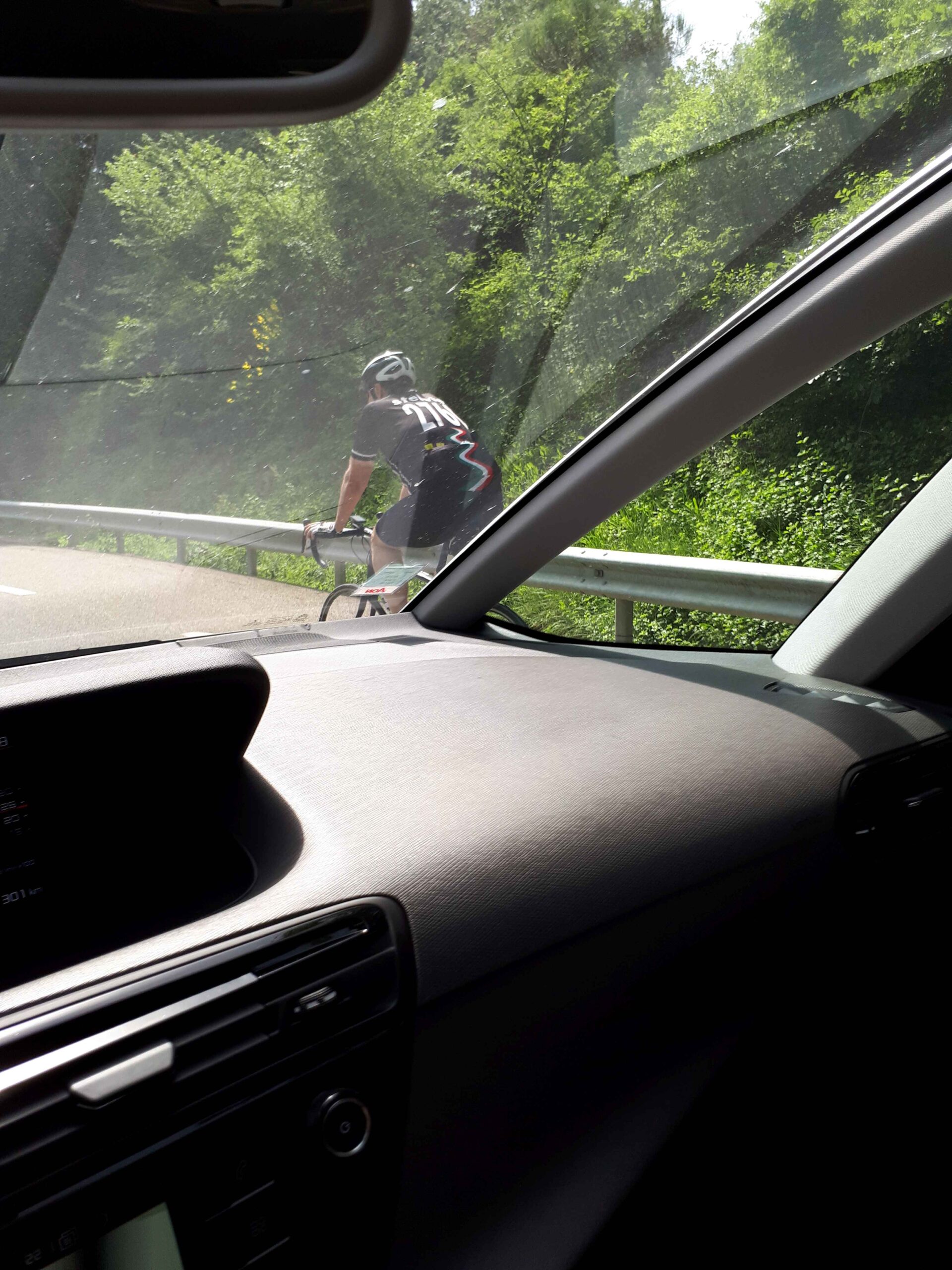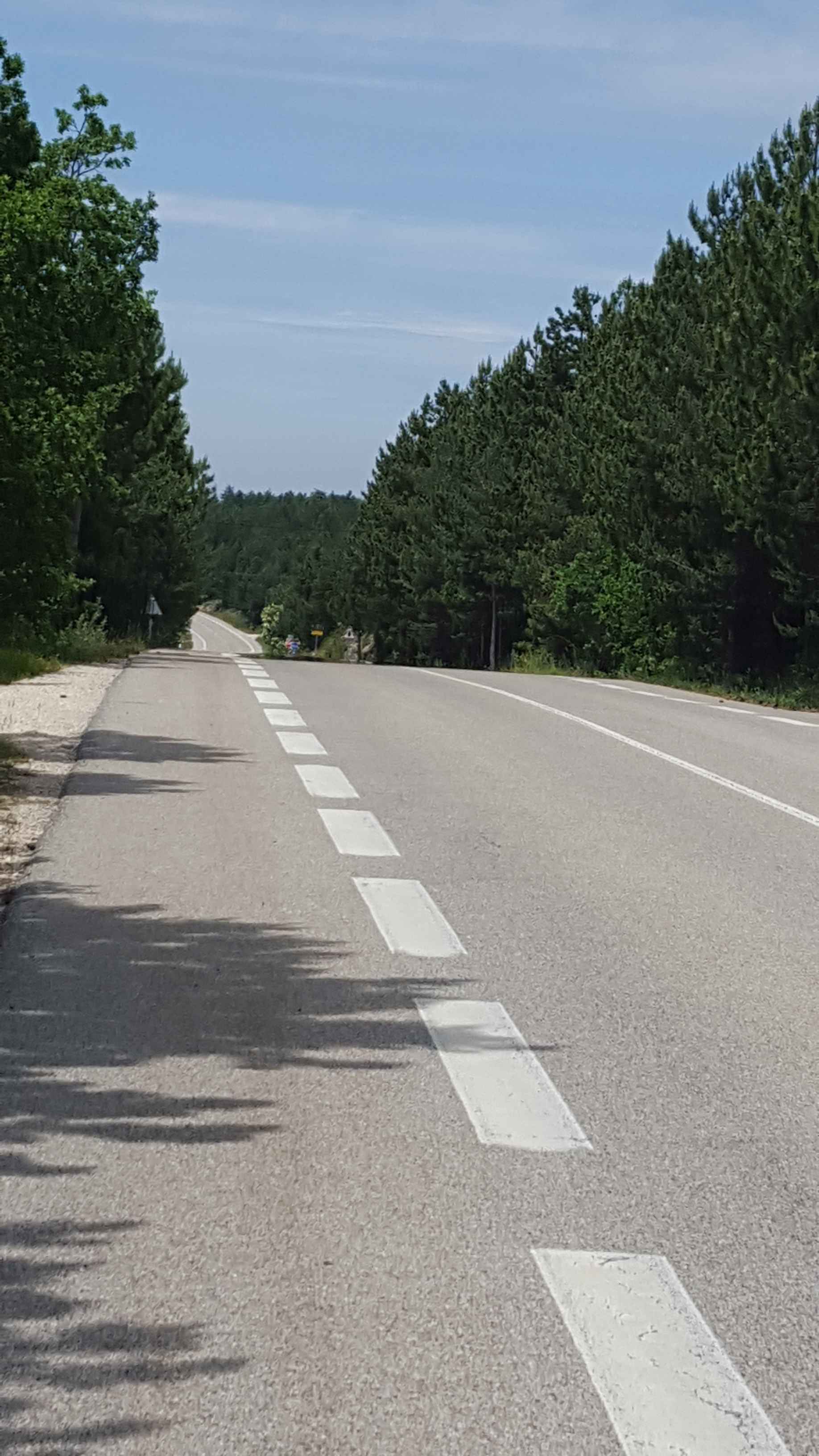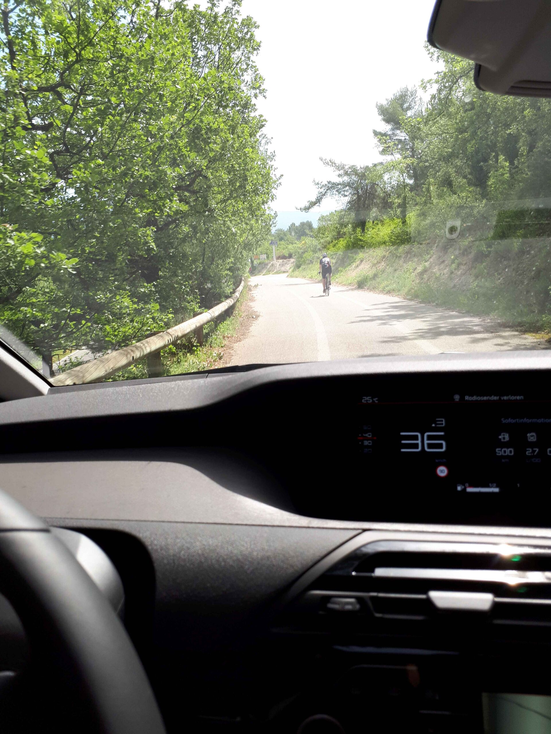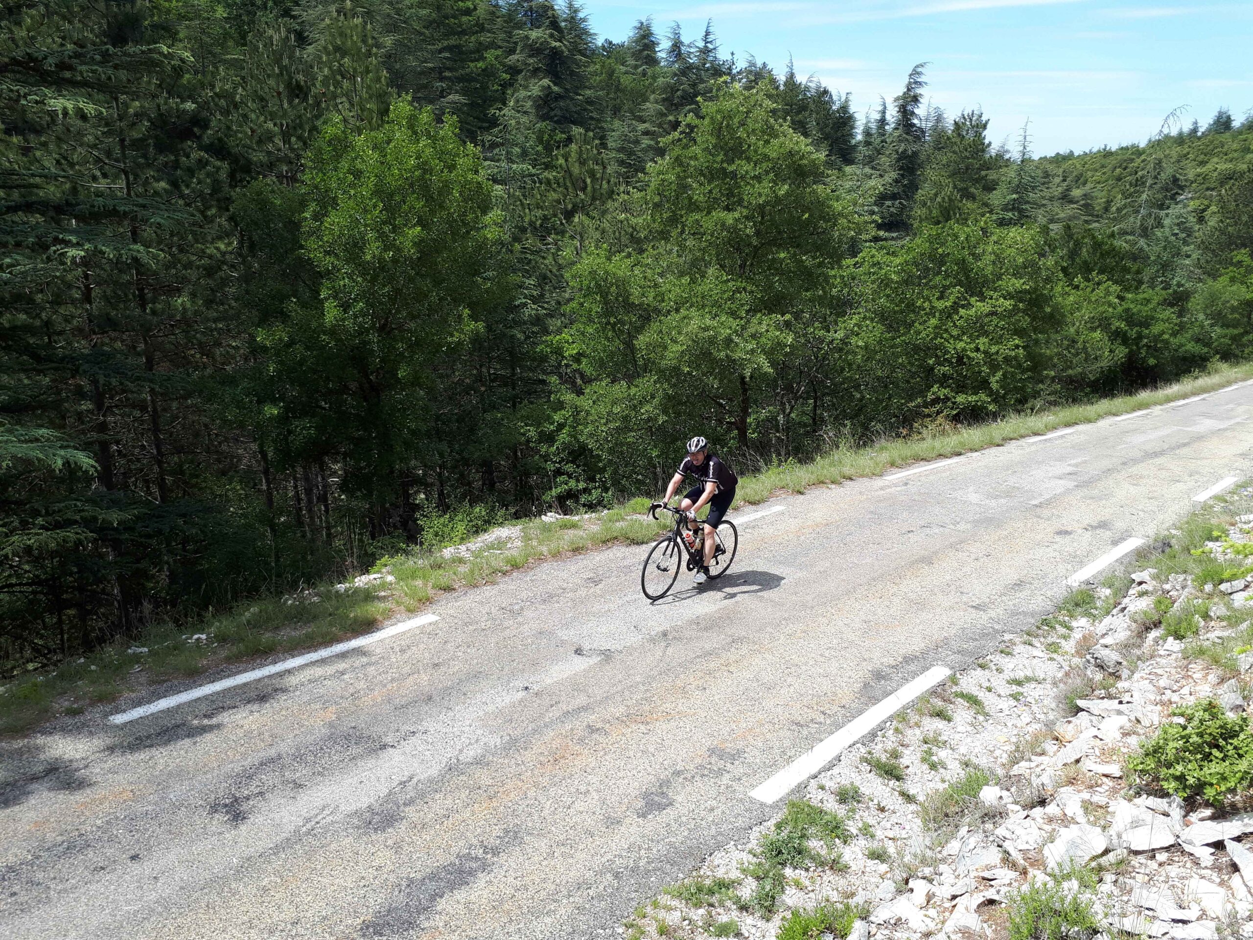 Ich nahm mir den leichtesten Anstieg zum Mont Ventoux vor und machte mich auf den Weg nach Sault. Unterwegs wartete Carsten immer wieder auf mich und machte Fotos von mir. Den ersten Anstieg kannte ich bereits von unserer Abfahrt am ersten Tag und ich rollte auf dem etwas rauen Asphalt dahin. Da ich alleine war konnte ich auch sehr schön mein eigenes Tempo fahren, immer wieder angefeuert durch mein Begleitfahrzeug! In Sault angekommen trafen wir dann zufällig auch wieder auf die anderen, die durch den Ort geschlendert waren. Nach einer kleinen Pause machte ich mich auf den Weg hoch zum Gipfel. Schon am Fuße der Steigung kam ich mit einem anderen Radfahrer aus Köln ins Gespräch, der gerade bei seiner dritten Auffahrt an diesem Tag war. Er bestritt also genau dass, was wir auch noch vorhatten, den Club des Cinglés. Alle drei Anstiege an einem Tag! Ich konnte sein Tempo auch gut halten und wir unterhielten uns die ganze Zeit über, wodurch der Anstieg gar nicht so schwer war. Auch der Schlussanstieg vom Chalet Renard zum Gipfel ging besser als die zwei Tage zuvor! Auf dem Gipfel verabschiedete ich mich dann von Jochen und genoss die Abfahrt hinunter nach Bedoin. So hatte ich jetzt bereits zwei der drei Anstiege auf meinem Palmares.