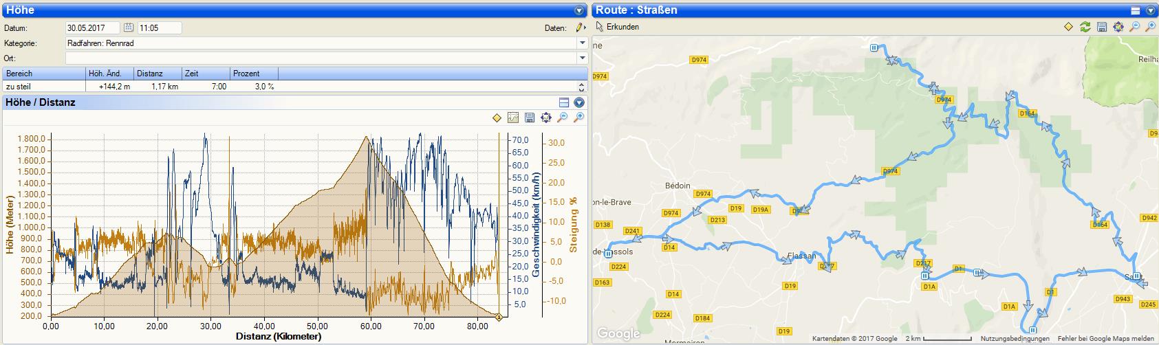 Mit dem geliehenen Rad kam ich gut zurecht, zumal ich meinen Sattel und auch meine Pedalen am Rad angeschraubt hatte. Die Tour hatte mit 83km und gut 2000 Höhenmeter auch ein paar gute Eckdaten