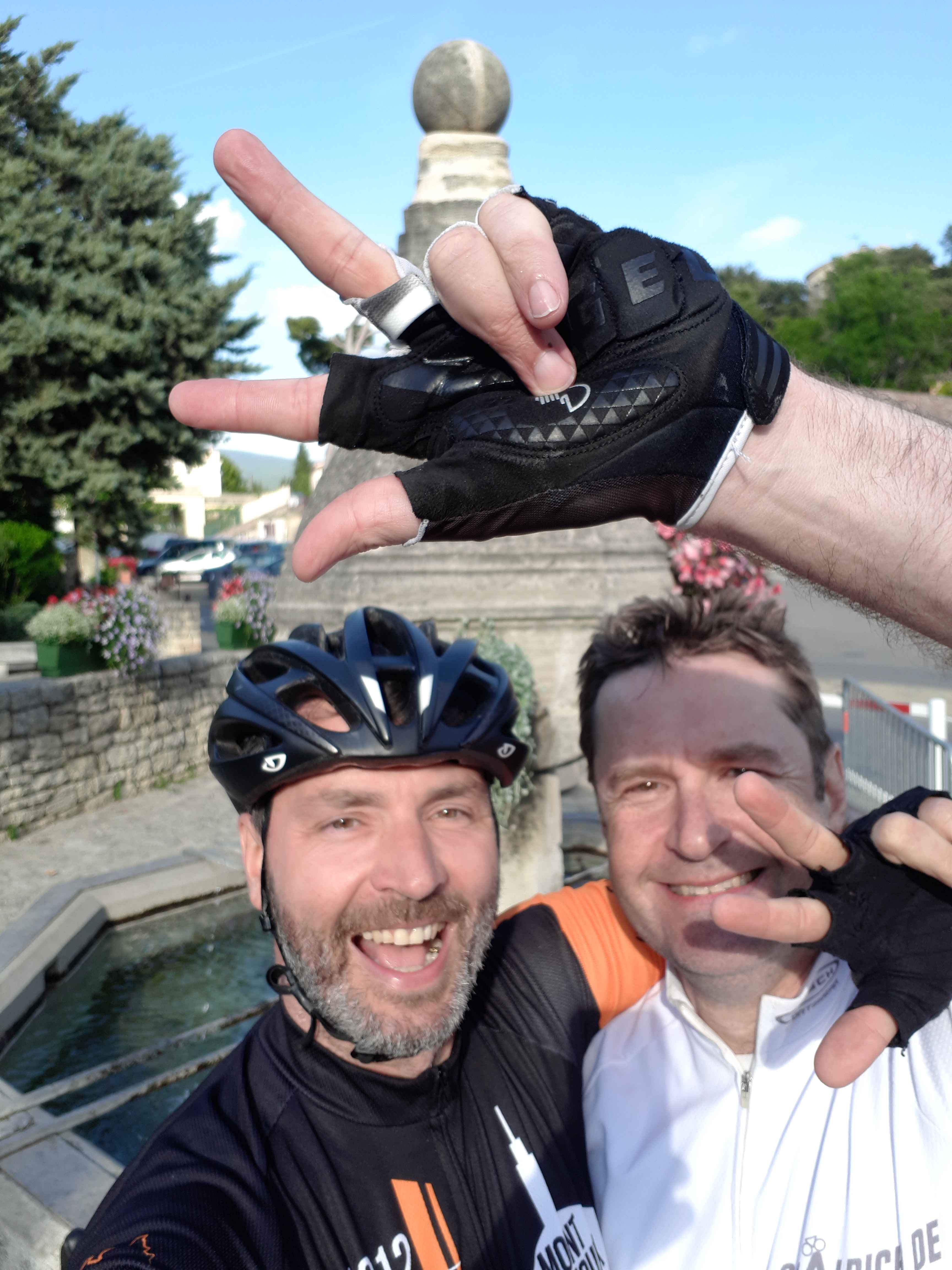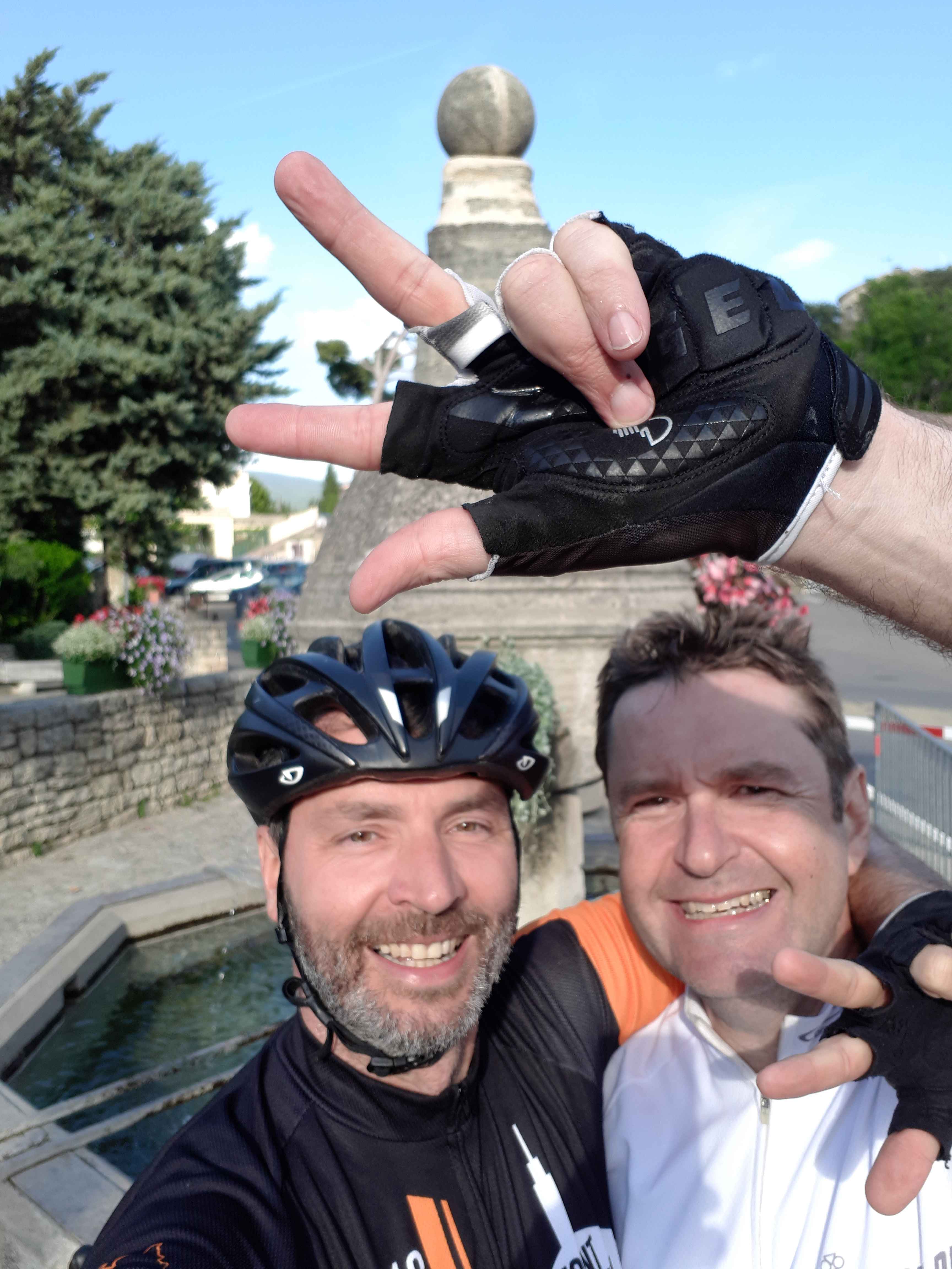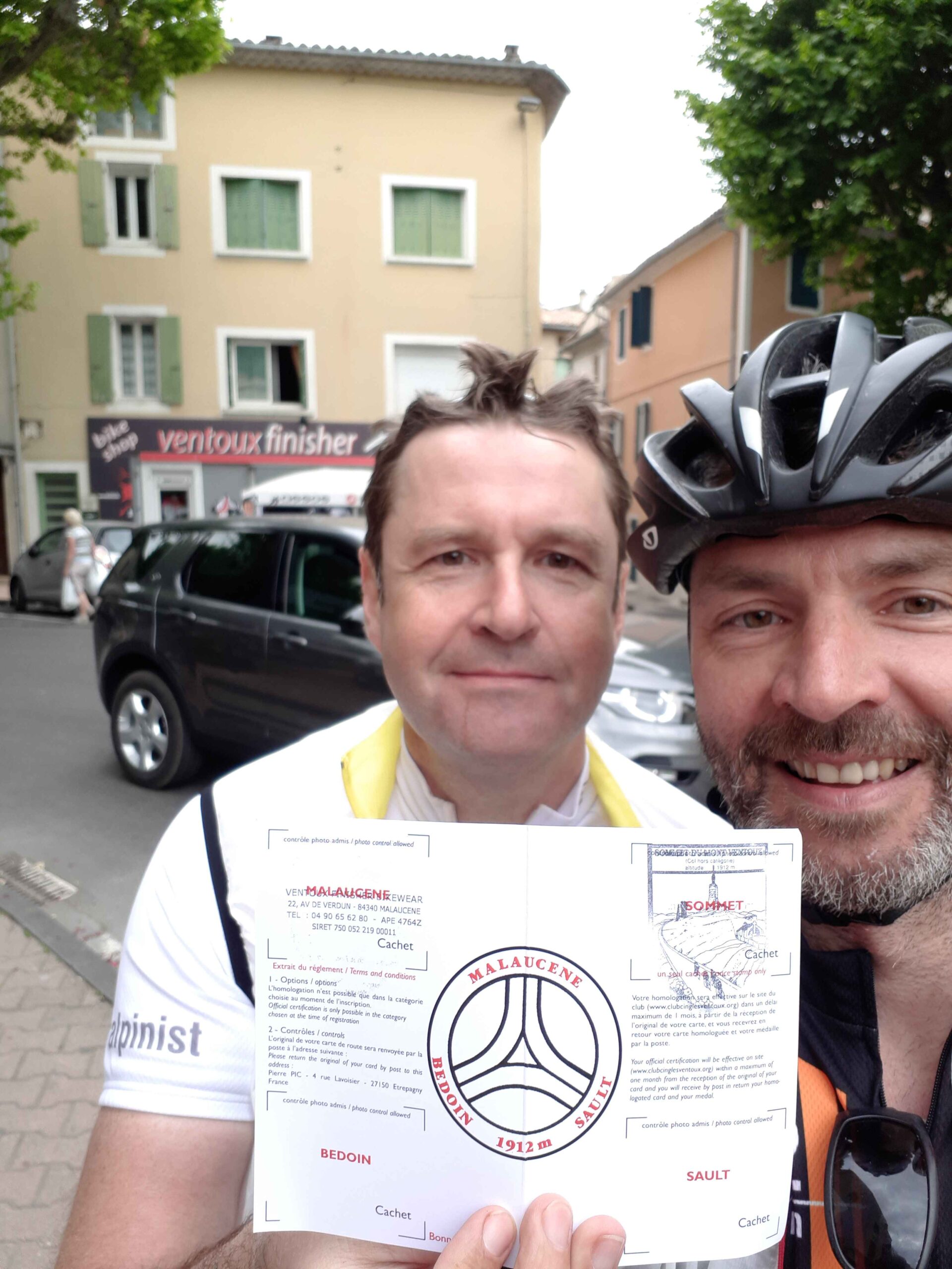 Kurz vor 8 Uhr starten wir zu unserem unterfangen. In Bedoin hatte das Radgeschäft noch geschlossen, so dass ich mehrere Fotos mit mir und der Kontrollkarte machte. Auch zusammen mit Casi dokumentierte wir unseren Anstieg, damit er die Bilder später als Beweis nutzen konnte.