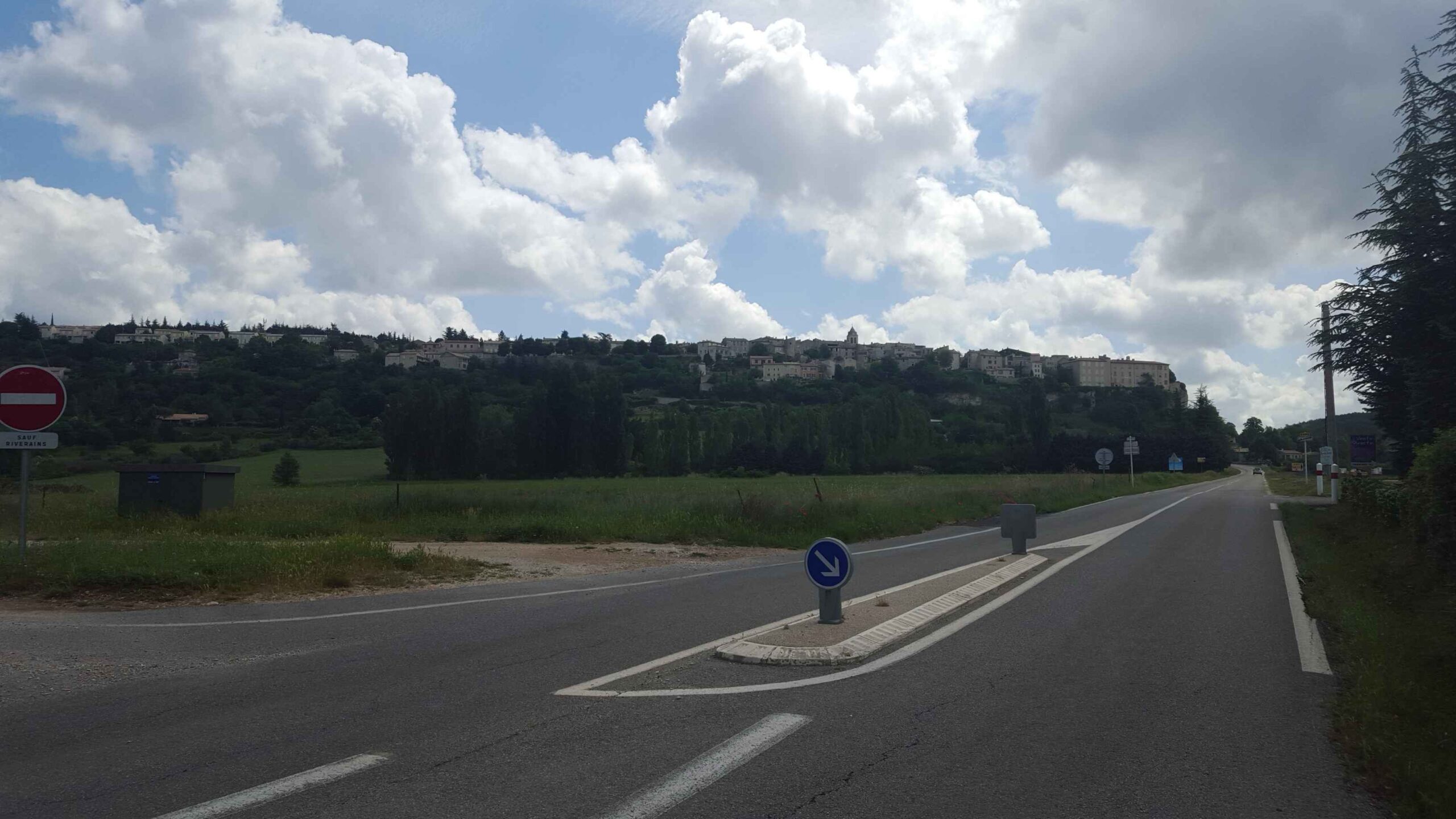 Doch für ein gemeinsames Passfoto reichte es dann doch. Hinunter nach Sault hatte ich die Nase wieder vorne… In Sault bogen wir dann nicht zum Ventouxanstieg ab sondern es ging weiter ins Landesinnere. Wir schlossen zu einer anderen kleinen Radgruppe auf und fuhren ein Stück mit ihnen zusammen. Die Landschaft war wunderschön und immer wieder ging der Blick zum Ventoux hinter dessen Rücken wir jetzt entlang fuhren. So ging es auf kleinen Strassen mit wenig Verkehr mehr bergab als bergauf in Richtung Malaucène.