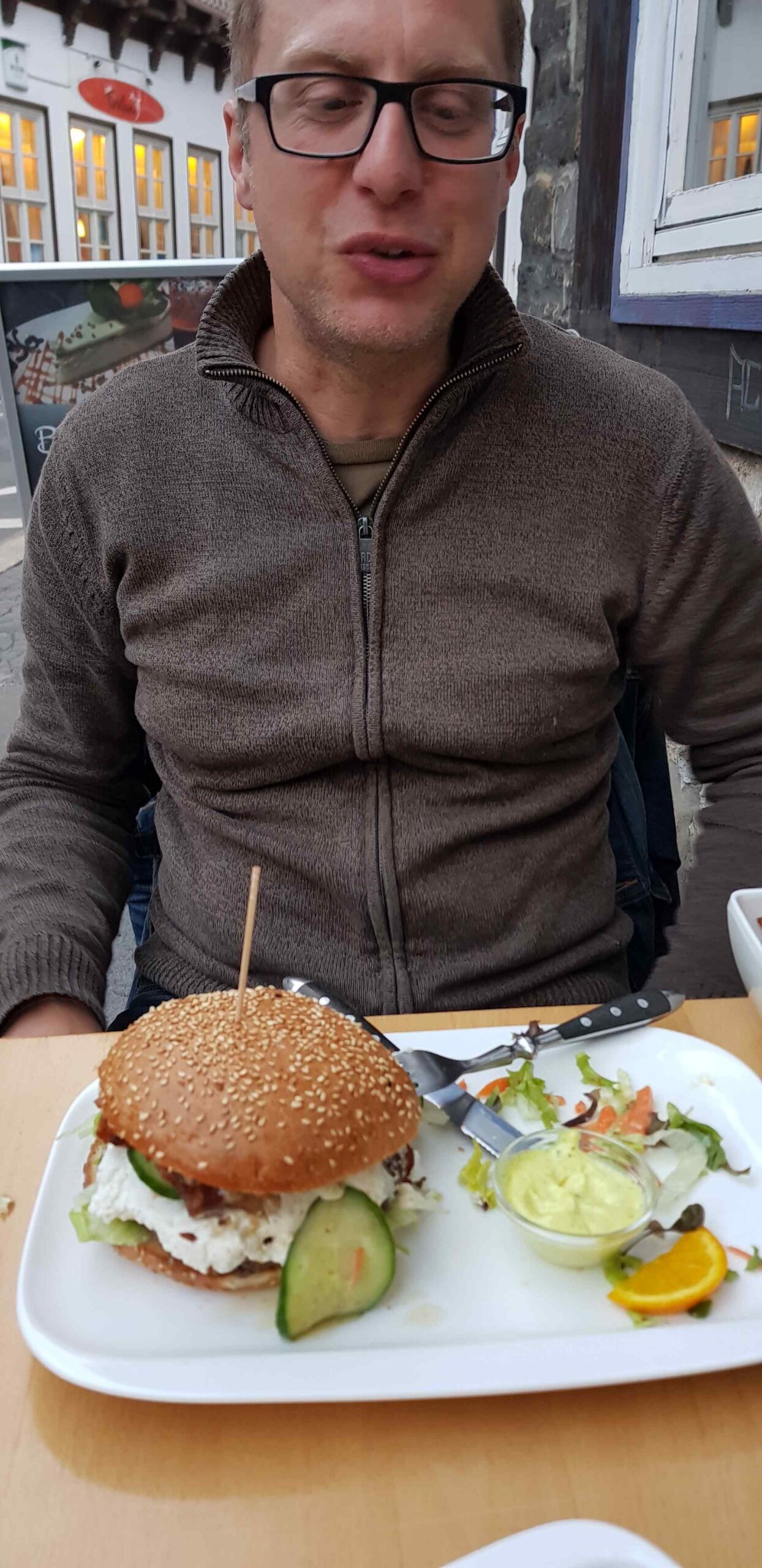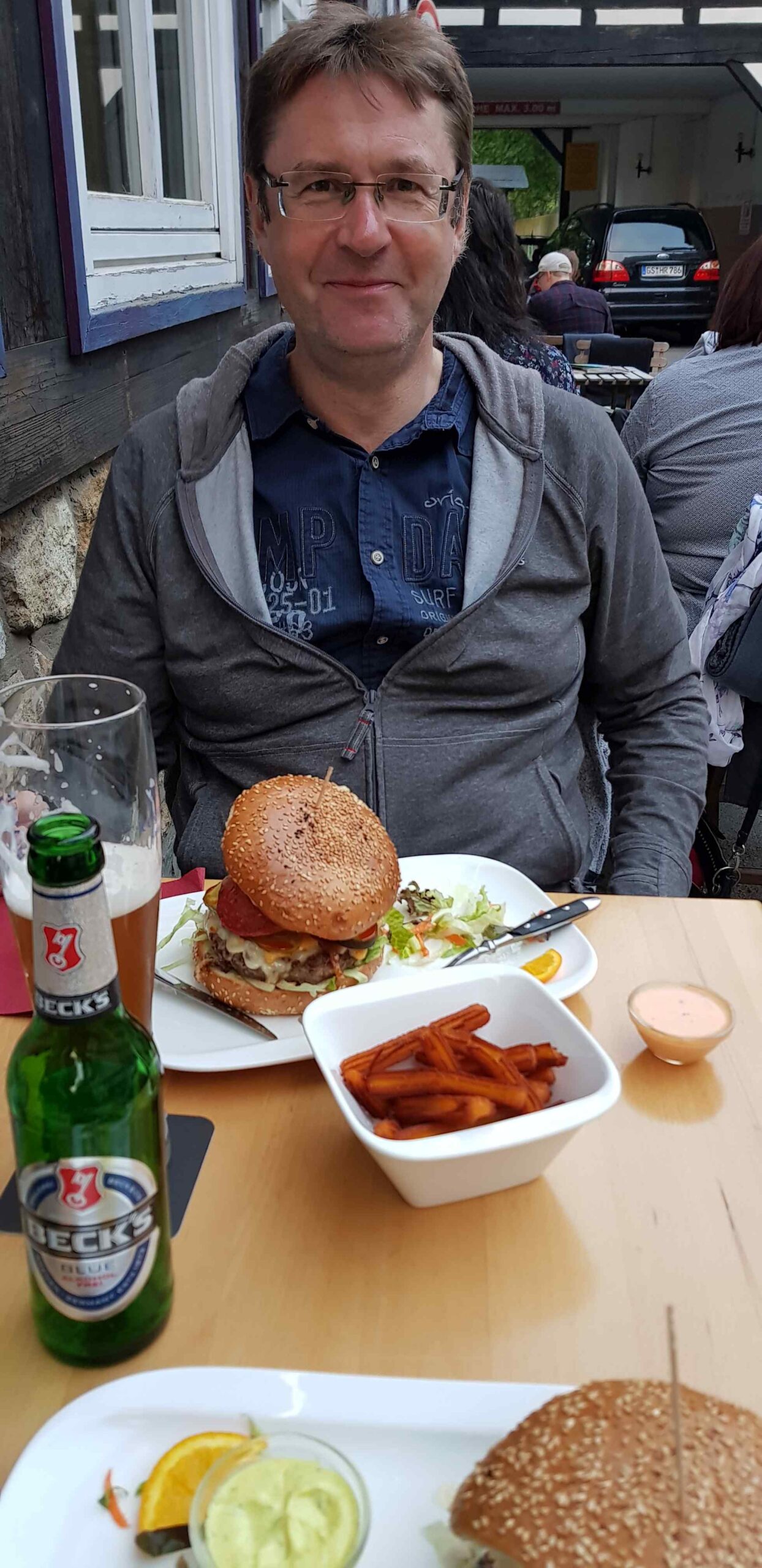 Fayek meldete sich mit Lust auf Fleisch und so verzichteten wir auf Nudeln mit Thunfisch-Tomatensauße und ich suchte im Internet nach einem Burgerladen. Fündig wurde ich in Goslar, was uns gut zu pass kam, da wir ja schon zweimal in Bad Harzburg gewesen waren. Wir informierten uns allerdings erst noch über den letzten Bundesligaspieltag und erlebten den ersten Abstieg des HSV. Der Laden entpuppte sich als sehr leckerer Burgerladen mit gutem Essen zu anständigen Preisen. Das Wetter ließ sogar zu, dass wir draußen sitzen konnten, was wir genossen. Gut gestärkt traten wir dann wieder die Heimreise an und ließen den Tag gemütlich auf dem Sofa ausklingen