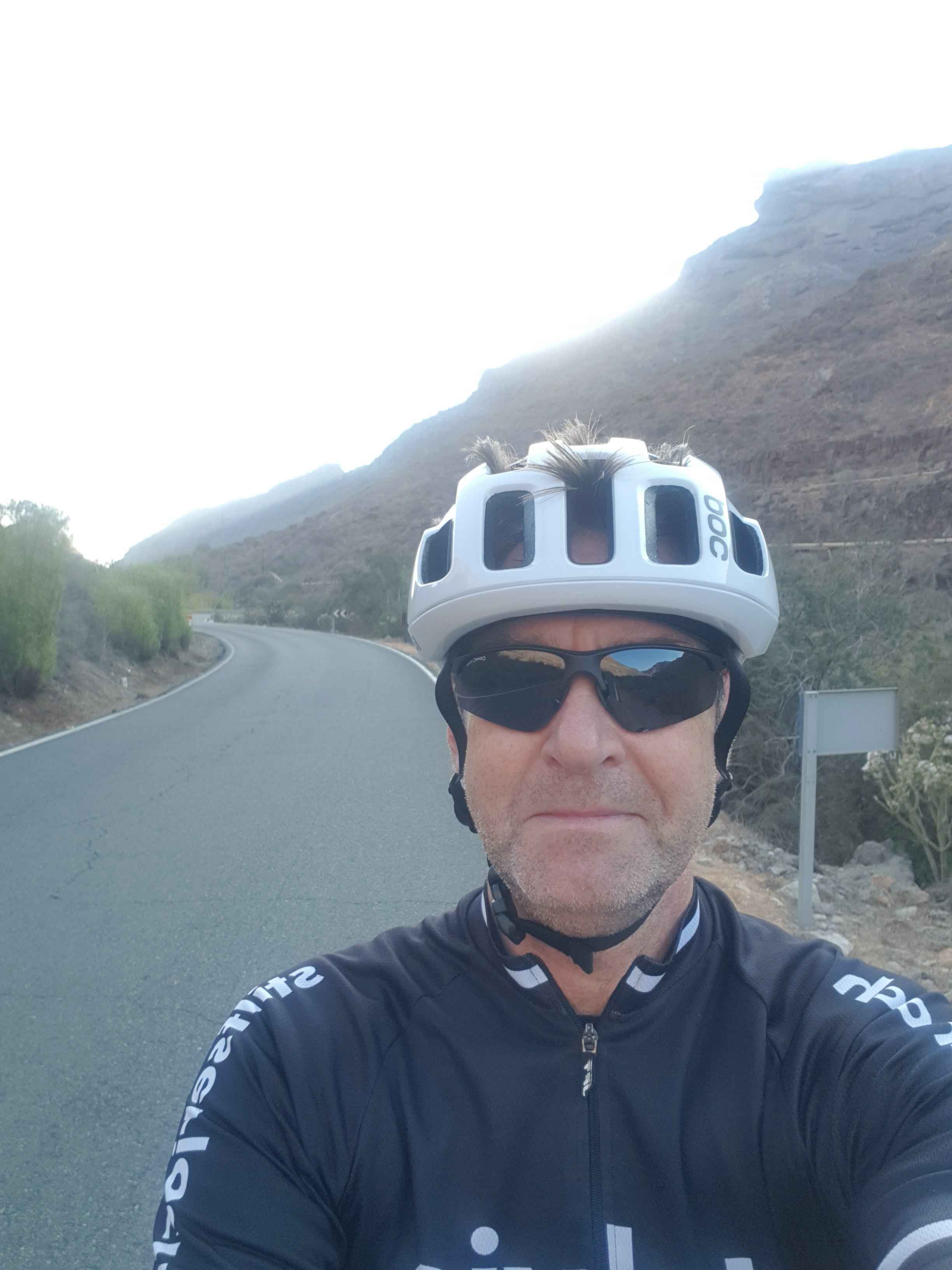Der Anfang war aber doch etwas holperig, den ersten Abzweig verpasste ich gleich und dann war auf der Gegenfahrbahn auch noch ein Triathlon im Gange. Ich hatte auch etwas Schwierigkeiten die Informationen auf dem Garmin zu entziffern. Da zeigten sich dann doch die Nachteile der Gleitsichtlinsen, gepaart mit einer dunklen Sonnenbrille. Doch schließlich fand ich den richtigen Weg. Dabei bekam ich auch direkt den ersten Motivationsschub, da etwas vor mir zwei andere Radler unterwegs waren. Ich konnte zu den beiden aufschließen und fuhr an ihnen vorbei. Nach dem ersten Fotostopp fuhr ein weiterer Radfahrer an mir vor und ich blieb die darauffolgenden 10 Kilometer immer in Schlagdistanz. Da ich durchaus auf meine Kräfte achtete, war ich umso zufriedener nicht direkt abgehängt zu werden. So ging es über knapp 15Kilometer immer an der Küste entlang mit einem permanenten auf und ab. Bei Arguineguin ging es mit einer leichten Steigung ins Landesinnere. Die Sonne stand noch so niedrig, dass ich die ganze Zeit im Schatten fuhr. Die Temperaturen waren etwas zu kühl für kurz-kurz, doch die Armlinge wollte ich nicht anziehen, zumal es ja bergauf ging und Tempo und somit der Fahrtwind keine Rolle spielte. Auch war ich noch ganz froh den Schatten zu haben, da ich vergessen hatte mich einzucremen.