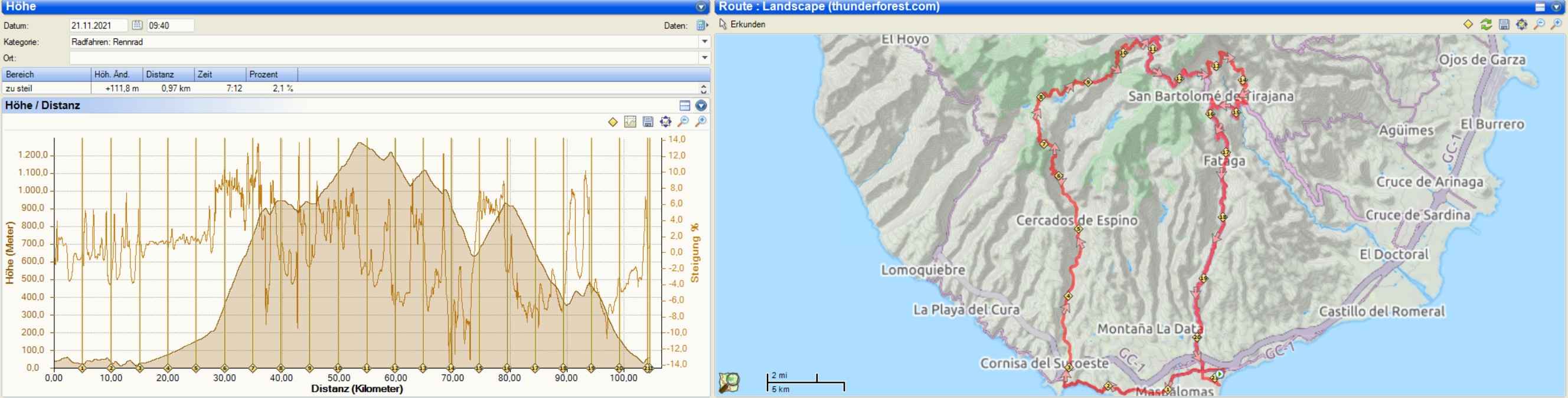 Die restliche Abfahrt ließ ich locker austrudeln, verfuhr mich aber prompt in Maspalomas noch einmal und war plötzlich direkt vor dem Meer. Doch der Tacho machte seine Sache gut, berechnete eine neue Route und so kam ich mit ein paar zusätzlichen Höhenmetern glücklich an meiner Unterkunft wieder an.
