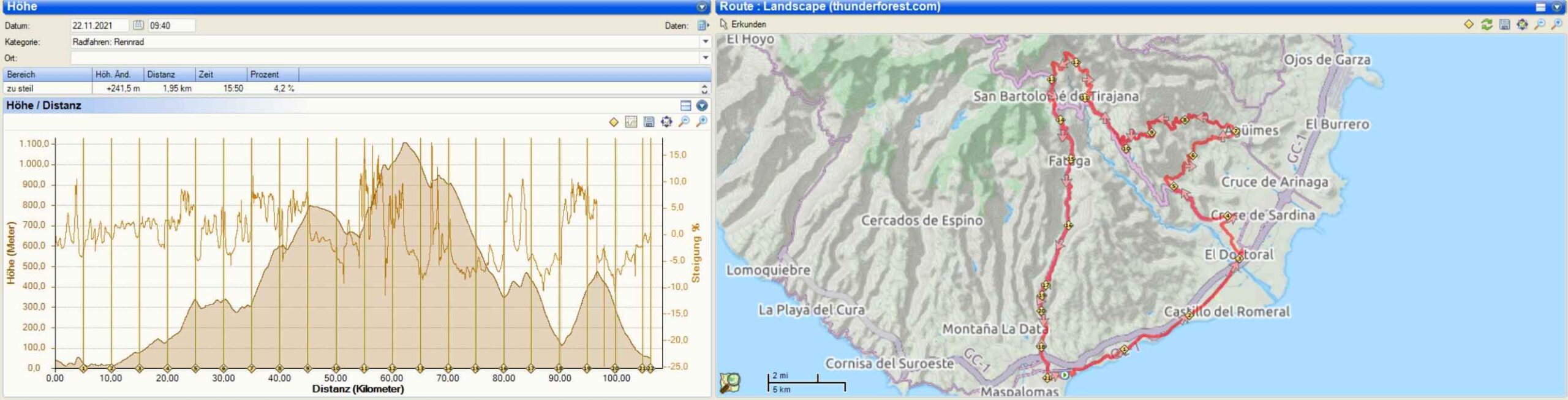 Die Landschaft hatte schon fast etwas Surreales, da alles braun in braun und sehr karg war. Der wenige Verkehr trug seinen Teil zu diesem Gefühl noch bei. So fuhr ich in einem großen Bogen wieder in Richtung San Bartolome. Ich konnte auch einige Radfahrer von oben sehen, die einen der steilsten Anstiege auf Gran Canaria in Angriff genommen hatte (wie ich dachte…). Ich hatte mit meiner Strecke einen großen Bogen darum gemacht, auch weil ich mir den Anstieg nicht wirklich zugetraut hatte. Das Wetter hielt sich wider erwarten gut. Es war zwar bewölkt, aber der Regen schien sich auf die Nordseite der Insel zu beschränken. Hin und wieder kam sogar die Sonne heraus.