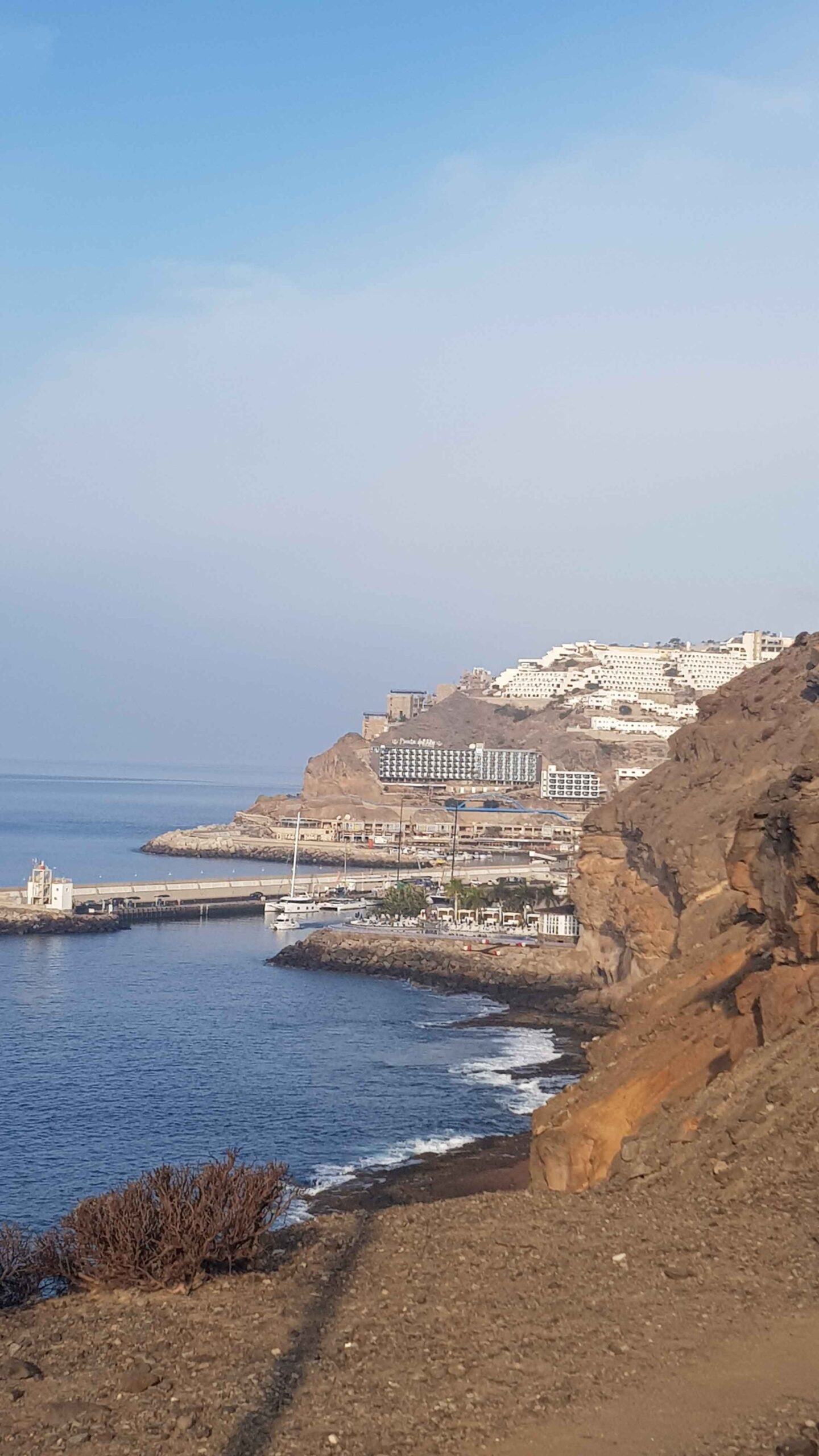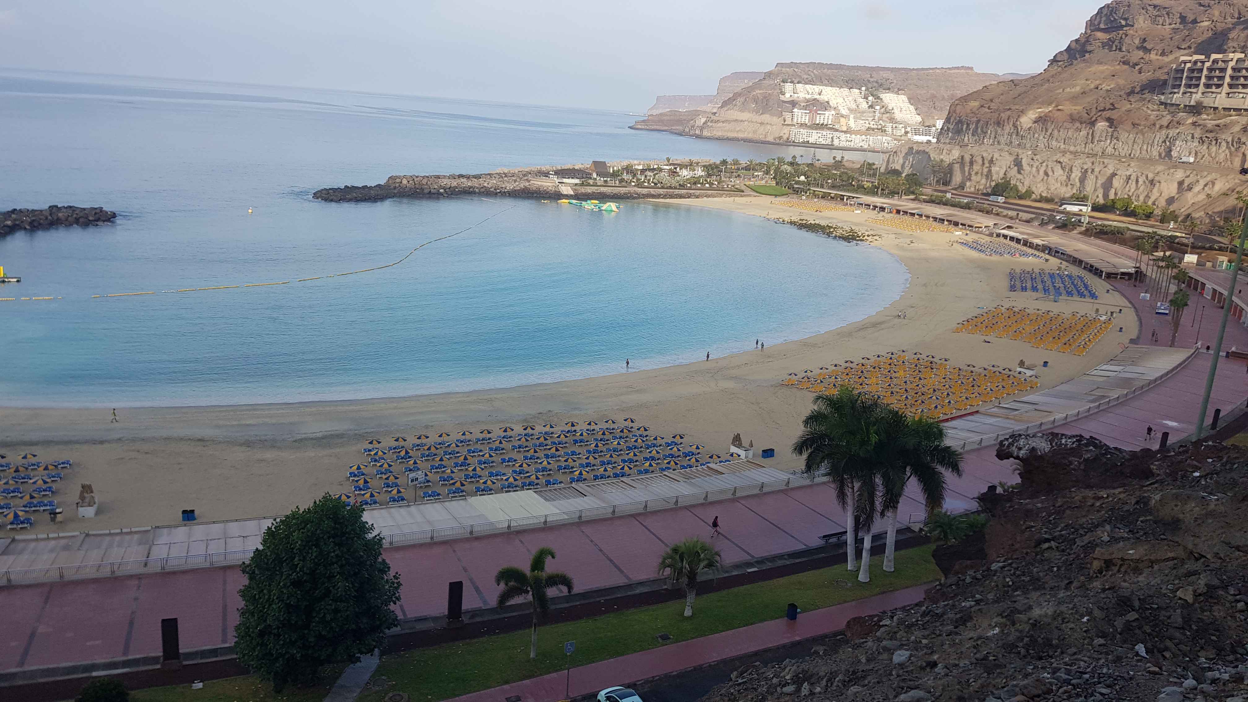 Den Start kannte ich bereits, da es wieder die Küste entlang in Richtung Puerto de Mogan ging. Der Wind war günstig und so konnte ich in der aufgehenden Sonne die ersten Wellen nehmen. Kurz vor Puerto de Mogan, wo es in die Berge gehen sollte, erlebte ich eine böse Überraschung. Die Straße war komplett gesperrt. Sie war richtig mit einem Bauzaun abgesperrt und ein großes Schild wies daraufhin, dass die Weiterfahrt gefährlich und verboten sei. Verwirrt blieb ich erst einmal stehen, um zu überlegen wie es weitergehen könnte. Ich irrte ein wenig auf den Straßen herum, ob ich irgendwo ein Hinweis finden würde, wie ich weiterkommen könnte. Doch selbst unter zu Hilfenahme von Google fand ich keinen Weg. Der einzige Weg, der mir angezeigt wurde, war die Autobahn und da wäre ich wohl wirklich falsch. So fuhr ich wieder zur Absperrung. Dort sah ich mehrere Fußgänger die abgesperrte Strecke hochgehen. So dachte ich mir, wenn die da lang können, kann ich es vielleicht auch. Ich klemmte mein Rad durch die Lücke am Bauzaun und fuhr weiter. Da es nach oben und um eine Kurve ging konnte ich auch nicht sehen, wie es dahinter aussah. Nach ca. 500-600m war dann wirklich Schluss. Auf der Straße war eine richtige 3m hohe Mauer gezogen und dort gab es kein Durchkommen. Ich musste umkehren.