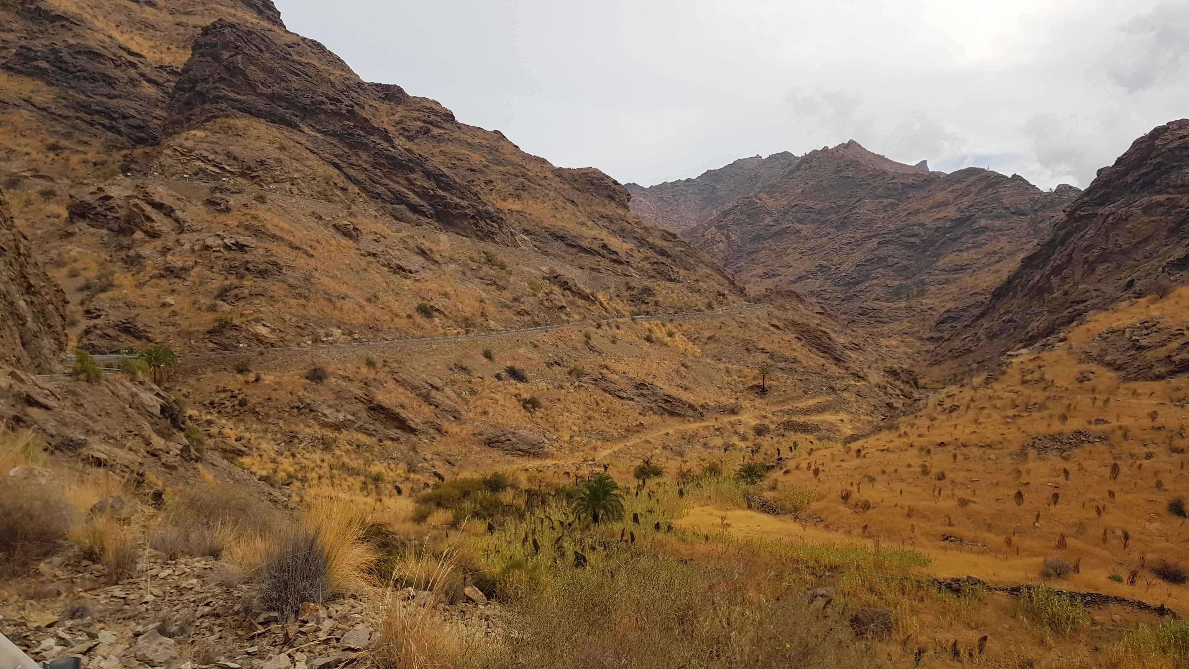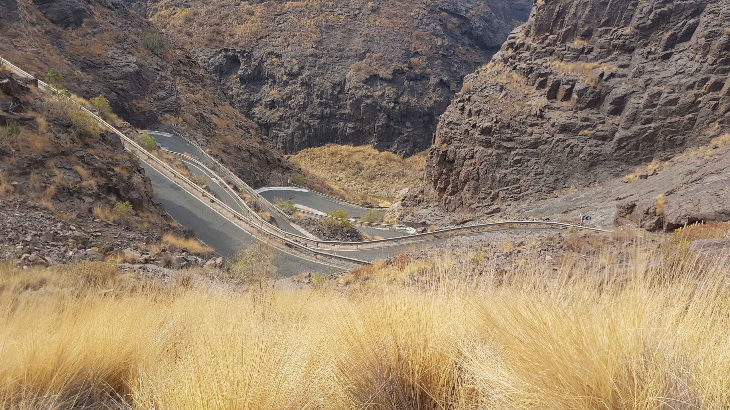 Unten wieder angekommen fuhr ich in Richtung Autobahn in der Hoffnung, dass es dort einen kleinen Nebenweg geben würde. Doch nach 400m stand ich direkt an der Auffahrt. Nach links ging es in einen Tunnel, der mit einer Länge von rund 650m angegeben war und dieses wäre meine Richtung. Nach rechts ging es auch in einen Tunnel, allerdings mit einer Länge von rund 2,5 km. Glücklicherweise gab es an der Stelle an der ich stand eine Art Mittelinsel mit einer Leitplanke und so entschied ich mich kurzerhand mit dem Rad auf die andere Seite zu gehen und auf dem Seitenstreifen durch den Tunnel zu fahren. Da die Autobahn leicht abschüssig war, konnte ich gut Tempo aufnehmen und hatte den Abschnitt in weniger als einer Minute durchquert. Etwas mulmig war mir schon dabei, zumal ich nicht wusste wie die lokale Polizei reagieren würde, falls man mich erwischte. Endlich war ich wieder auf der richtigen Straße und konnte meine Fahrt „ordnungsgemäß“ fortsetzen. Umso überraschter war ich, als ich direkt vor mir zwei anderen Radlern begegnete. Ich fragte sie, wo sie herkämen, da ich sie nicht gesehen hatte. Sie teilten mir mit, dass sie ein Boot von Puerto Rico genommen hätten und dieses hätte sie in den Hafen von Mogan gebracht. Auf die Idee war ich gar nicht gekommen, doch lag Puerto Rico auch ca. 10 Kilometer zurück. Ich wünschte den Beiden noch viel Spaß und fuhr weiter. Zuerst blieben sie noch an mir dran, doch nach und nach setze ich mich ab, auch wenn sie durch meine Fotostopps immer wieder an mir vorbeifuhren. In Mogan hielten sie dann an und wir verloren uns aus den Augen.