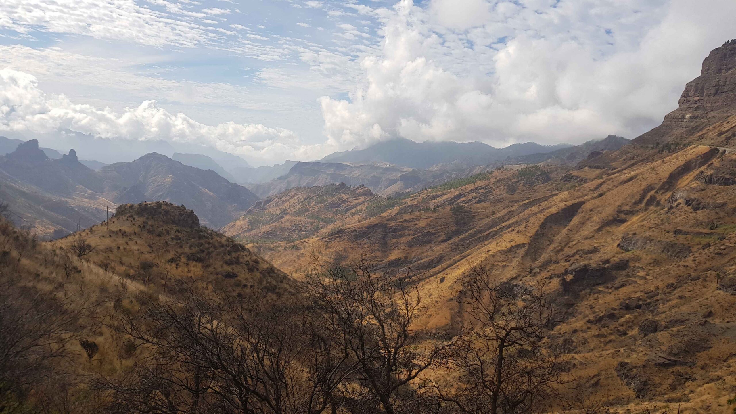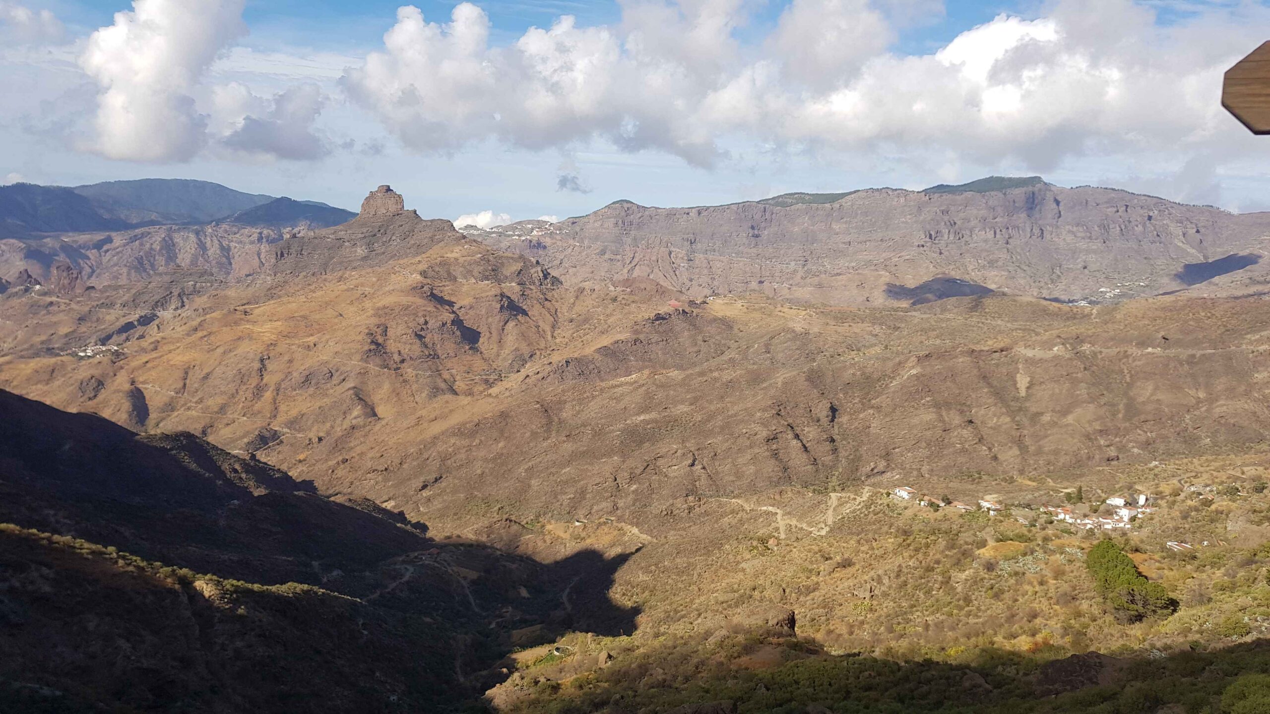 Jetzt begann der bergige Abschnitt. Es ging nicht den Tauropass hoch, sondern links weg in Richtung Aldea. Auch hier stieg die Straße an, doch alles im moderaten Bereich (6-7%). Die Landschaft war sehr karg und alles war braun in braun, aber trotzdem toll anzuschauen. Es herrschte wenig Verkehr und die Fahrt machte viel Spaß, zumal auch die Sonne immer wieder zwischen den Wolken durchschien und mich wärmte. Auf der Passhöhe angekommen hatte ich einen fantastischen Blick in Richtung Westen nach Aldea, oder wie der vollständige Name hieß „La Aldea de San Nicolas de Tolentino“.
