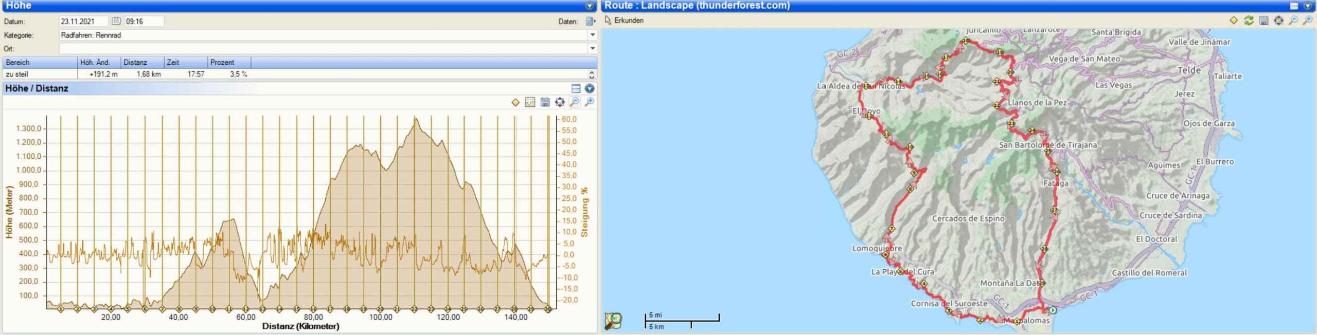 In moderaten Steigungen ging es weiter in Richtung Tejeda. Dort kam ich dann auch an dem Abzweig vorbei, der mich von Mogan heraufgebracht hätte, wenn ich den Tauropass genommen hätte. Den jetzt folgenden Abschnitt war ich bereits vor zwei Tagen gefahren und so befand mich wieder auf gewohntem Terrain. Die Mauer in San Bartolome ließ ich aber heute aus. So ging es auf bekannten Pfaden wieder zurück in Richtung Maspalomas. Den letzten Anstieg bei Fata bewältigte ich wieder gut. Meine Beine hatten sich in der langen Abfahrt doch besser erholt als gedacht. So kam ich erschöpft, doch glücklich, im Apartment wieder an. Der Tacho zeigte mir 149,9 Kilometer. Da wollte ich doch die 150 voll machen und fuhr noch ein wenig die Straße weiter und wieder zurück. An Höhenmeter hatte ich rund 3200 gesammelt. So viel war ich schon lange nicht mehr gefahren.