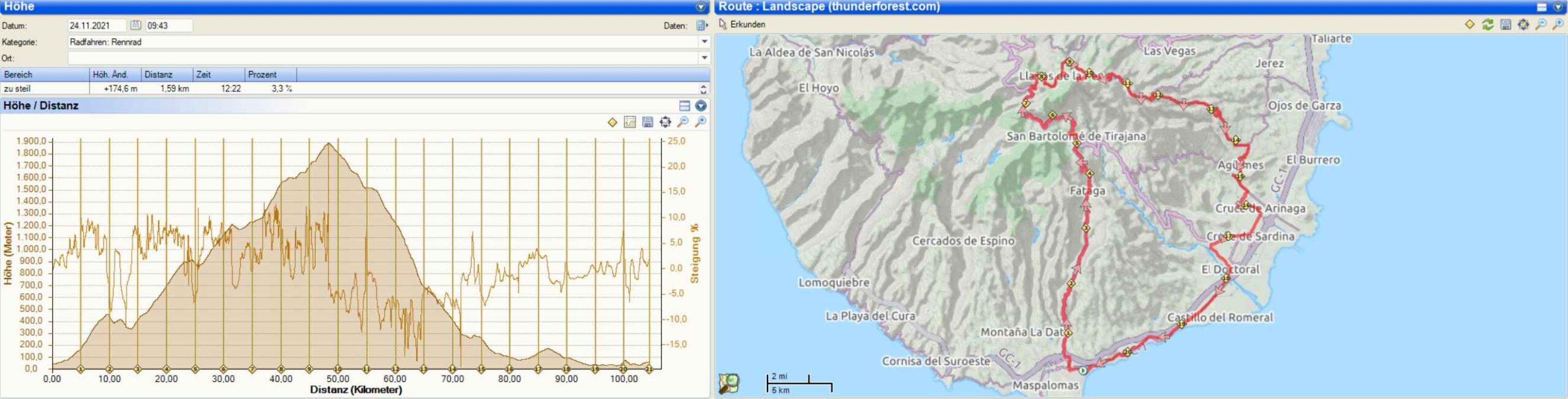 Jetzt gönnte ich mir erst mal eine Pause mit einem Kaffee, einer Cola und einem Bocadillo. Der Verkaufsstand war noch der Gleiche, wie ich ihn aus meiner damaligen Tour vor 14 Jahren in Erinnerung hatte. Der Kaffee war ok, das Bocadillo allerdings nur mit einer Paste beschmiert und nicht so der Hit. Aber die Kohlenhydrate taten gut. Ich kam auch mit einem anderen Radler ins Gespräch. Er hieß Christian Wünscher und kam aus dem Niederrhein. Er hatte mich kurz hinter San Bartholome überholt, war dann aber nochmal abgebogen. Wir tauschten uns etwas über die möglichen Touren und unsere Erfahrungen aus. Gemeinsam fuhren wir dann auch wieder los. Es sollte auf der anderen Seite in Richtung Ingenio und Aguemes runtergehen. Ich überholte ihn bald, da ich den Eindruck hatte der etwas schnellere Abfahrer zu sein, doch blieb er dicht hinter mir. Bei einem meiner Fotostopps fuhr er dann aber weiter und ich verlor ihn aus den Augen.