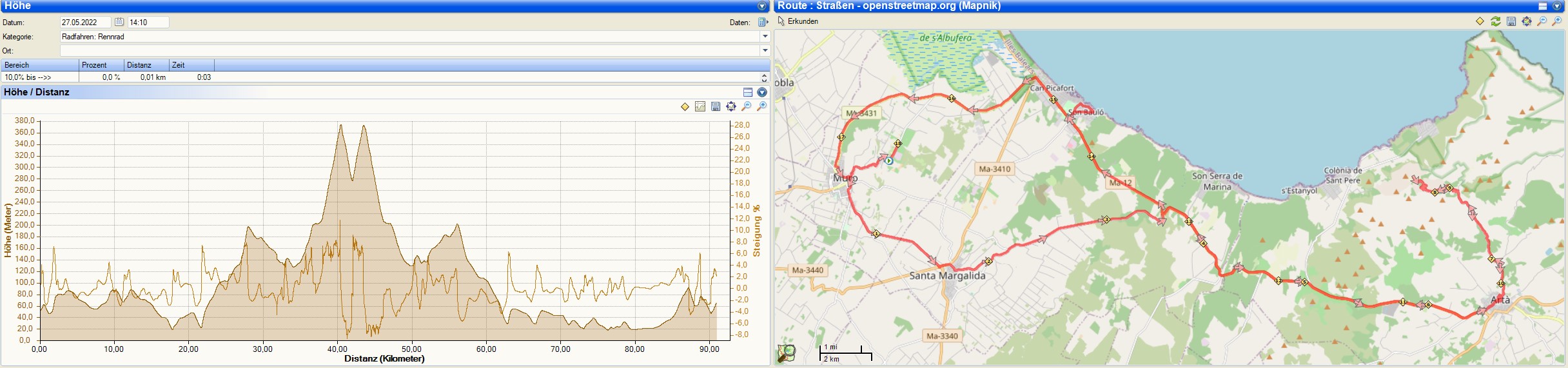 Da wir auf jeden Fall alle zusammen SaCalobra fahren wollten und ich doch sehr gerne mal zum Santuari von Betlem wollte machten Fred und ich uns dorthin auf den Weg. Der erste Teil der Strecke über Santa Margalida war uns bereit bekannt, doch ab Arta ging es dann auf unbekannte Wege. Die Straße wurde immer kleiner und es herrschte auch sehr wenig Verkehr. Dafür war es wundschön zu fahren! Es gab Serpentinen, tolle Ausblicke und nicht allzu steile Anstiege. Auf einer Kuppe angekommen hatten wir einen phantastischen Blick über die Buch von Can Picafort und hinunter nach Betlem. Eigentlich hatte ich erwartet, dass das Kloster oben auf der Anhöhe sein wurde, doch mussten wir nochmal zwei Kilometer bergab fahren, um zum eigentlichen Kloster zu gelangen. Dort war es sehr ruhig, da das Kloster geschlossen war. Da es auch keine Restauration gab waren auch sonst keine anderen Besucher dort. Die Fahrt hierher zum Kloster stufte ich als eine der schönsten Touren, die ich bisher auf Mallorca gemacht hatte ein! Fred haderte erneut mit seinem Rad. So entschieden wir uns kurzerhand unsere Rücktour leicht zu verändern und noch beim Radladen vorbeizufahren, in der Hoffnung, dass er ein anderes Rad erhalten würde.
