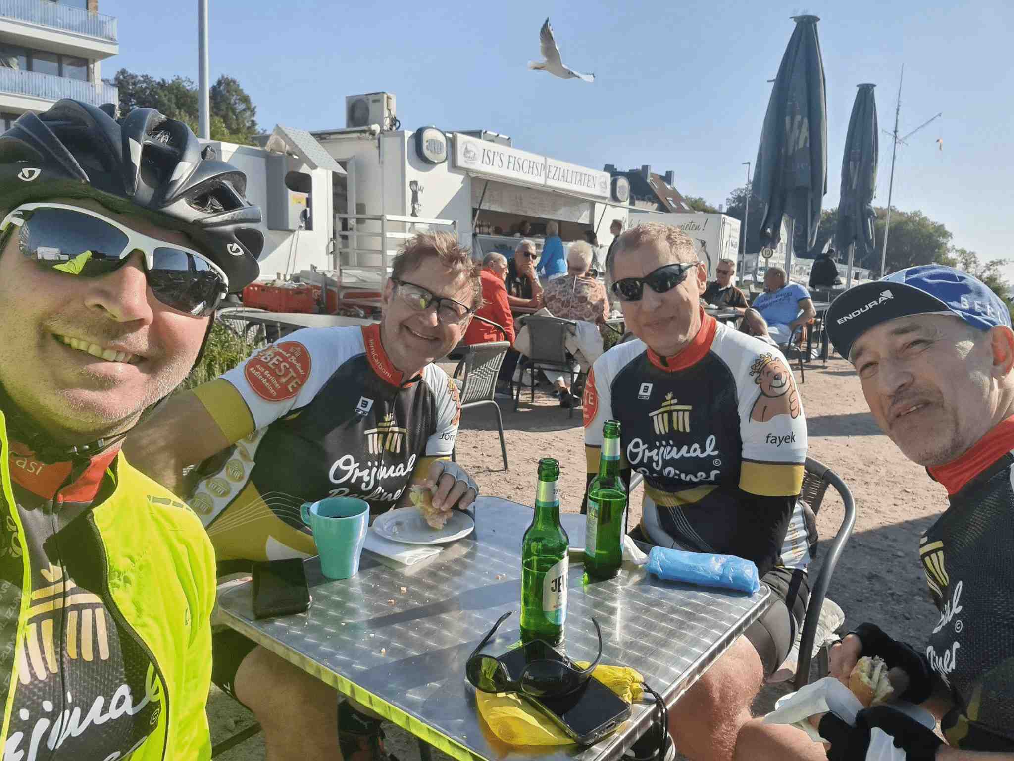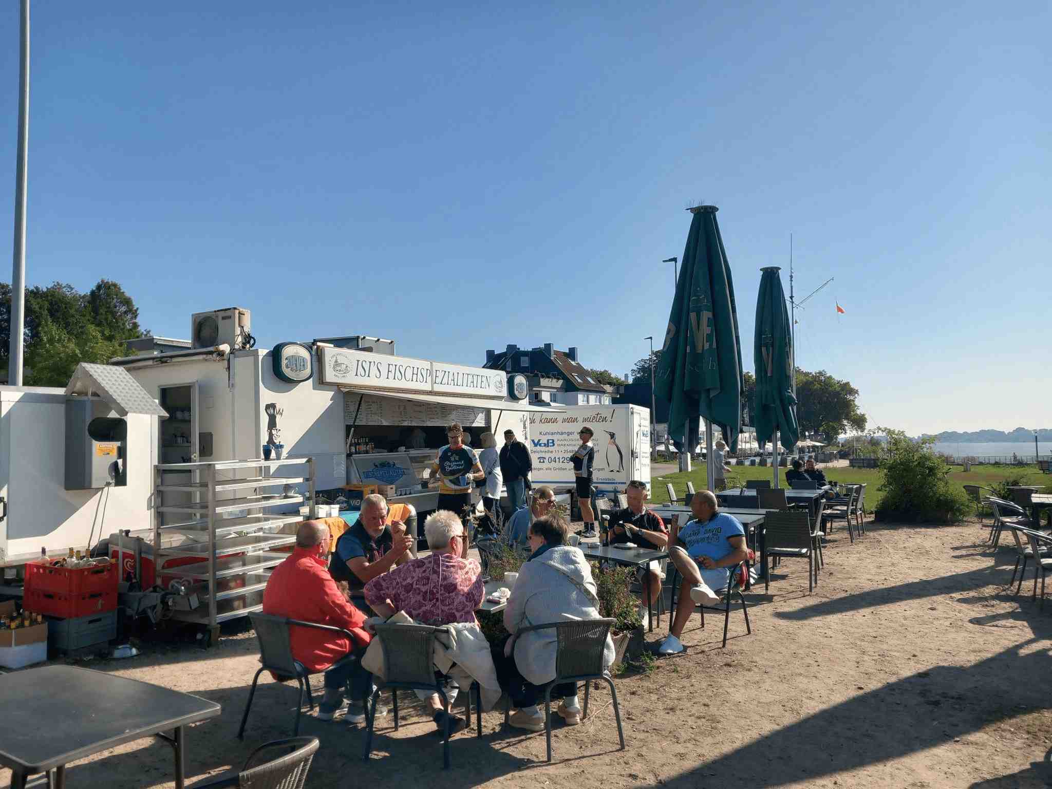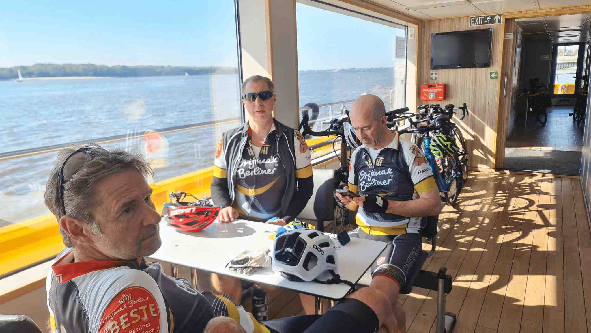 Anschließend flogen die Kilometer nur so dahin und eh wir uns versahen kam auch schon die Elbe in Sicht. Da stand erst einmal stand eine Pause mit Fischbrötchen an. Gut gestärkt ging es weiter, allerdings hatten wir jetzt doch etwas Gegenwind. Die Fahrt dauerte aber nicht allzu lange, denn es stand die Überquerung der Elbe mittels einer Fähre an. Da wir ein bisschen Zeit hatten gönnten wir uns vor Abfahrt noch ein Erfrischungsgetränk und schoben dann unsere Räder auf die Fähre und genossen die Überfahrt.