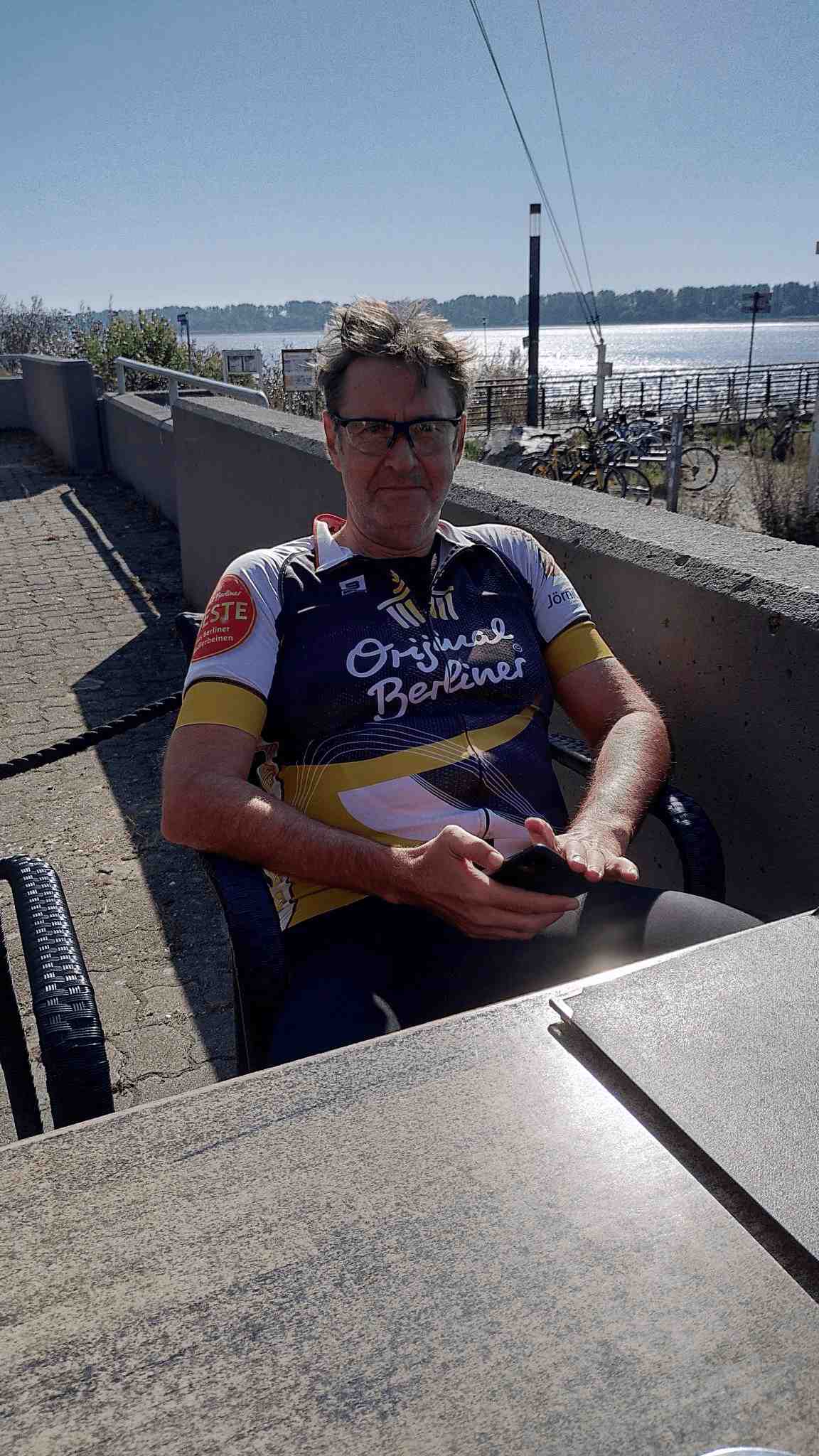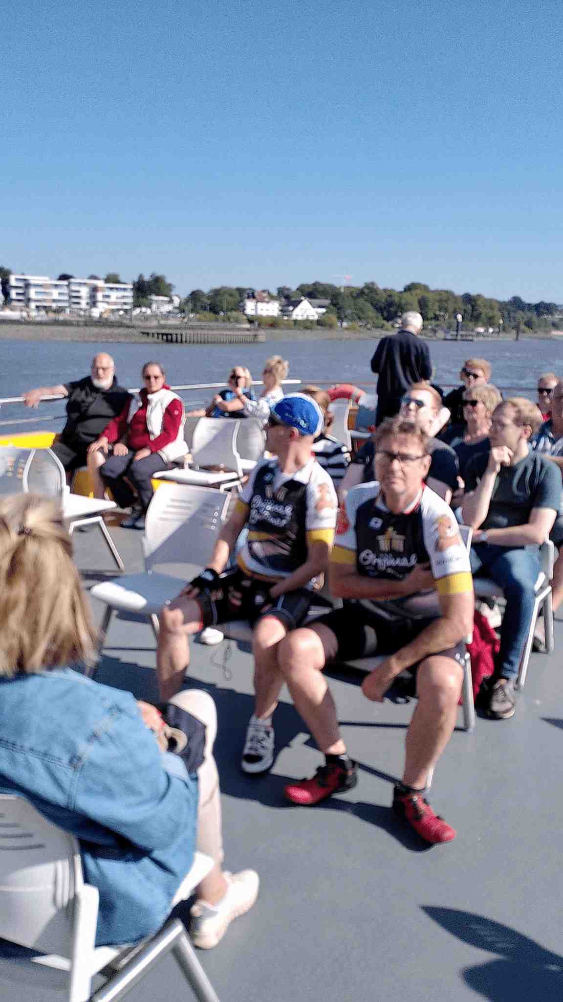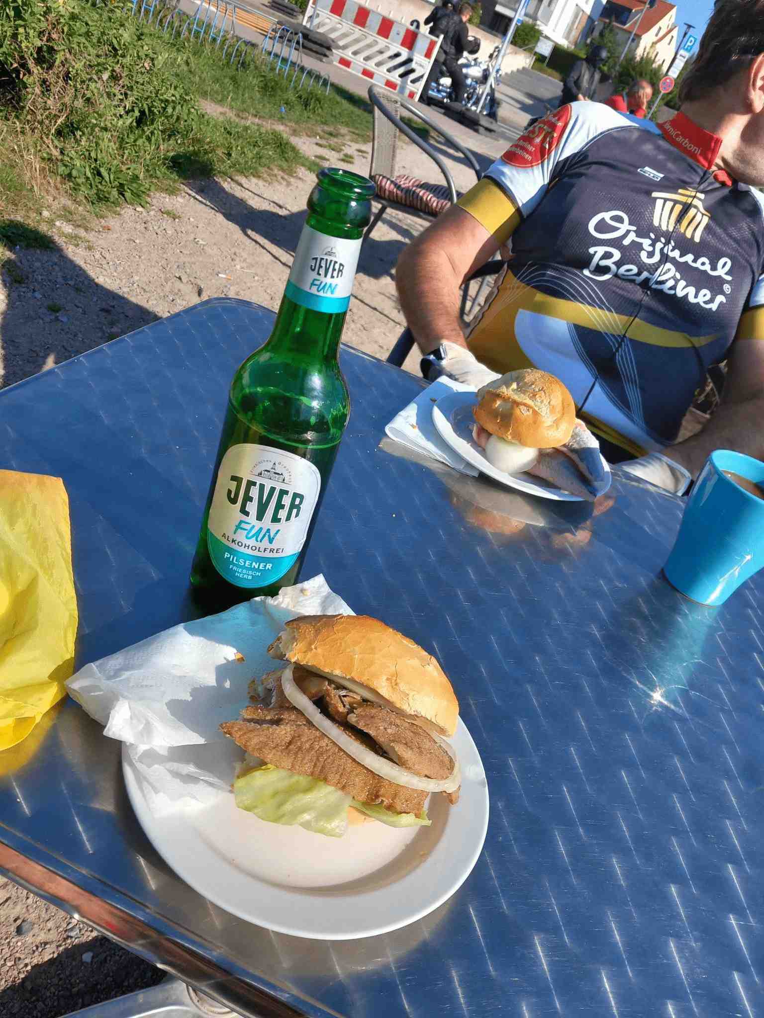 Anschließend flogen die Kilometer nur so dahin und eh wir uns versahen kam auch schon die Elbe in Sicht. Da stand erst einmal stand eine Pause mit Fischbrötchen an. Gut gestärkt ging es weiter, allerdings hatten wir jetzt doch etwas Gegenwind. Die Fahrt dauerte aber nicht allzu lange, denn es stand die Überquerung der Elbe mittels einer Fähre an. Da wir ein bisschen Zeit hatten gönnten wir uns vor Abfahrt noch ein Erfrischungsgetränk und schoben dann unsere Räder auf die Fähre und genossen die Überfahrt.