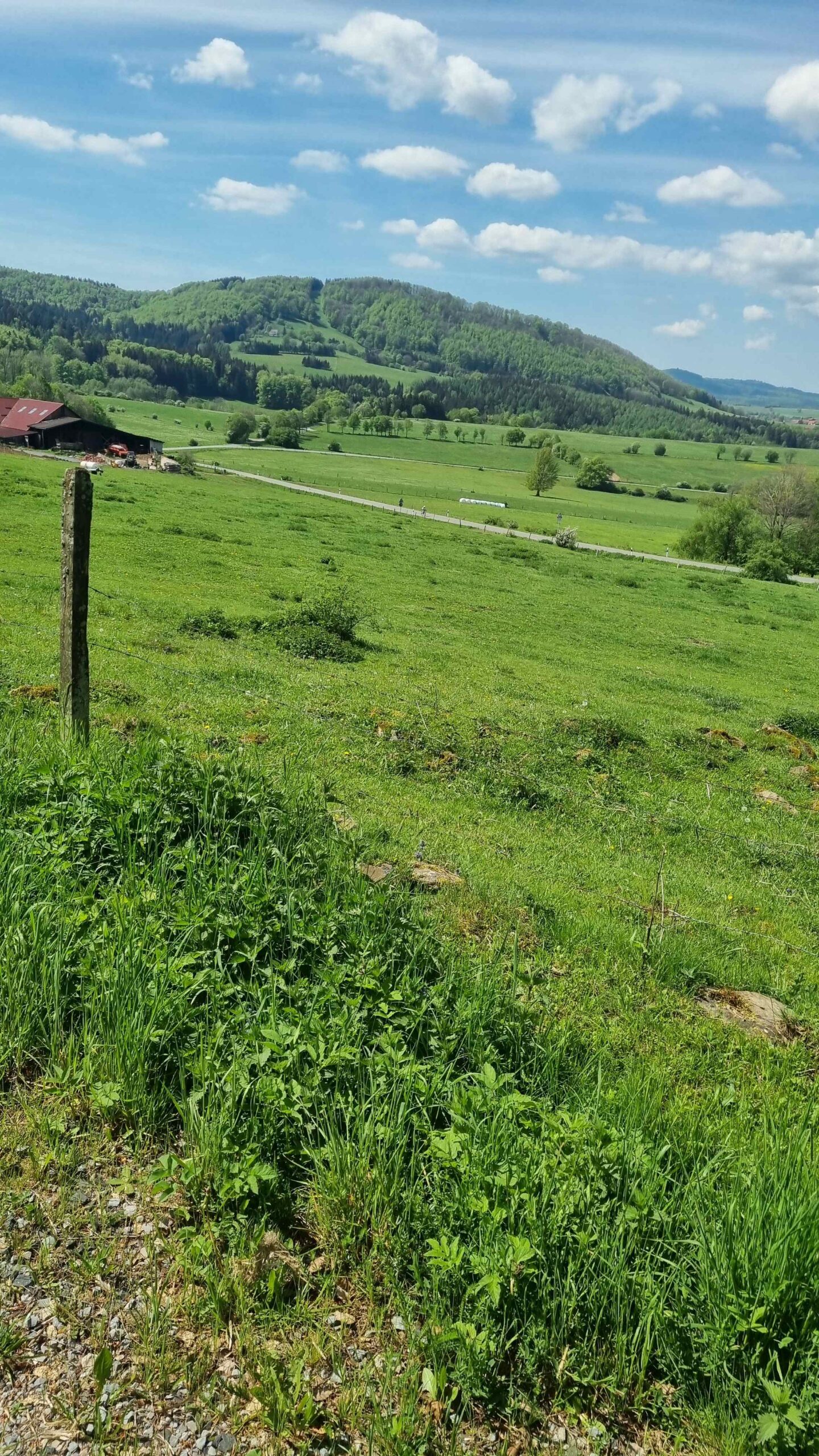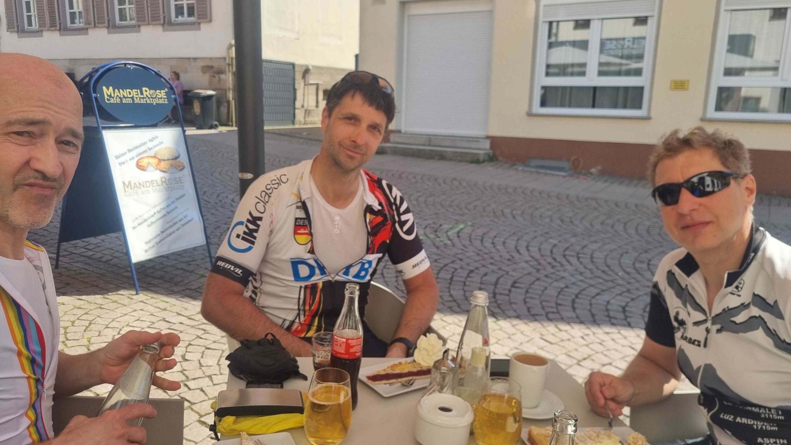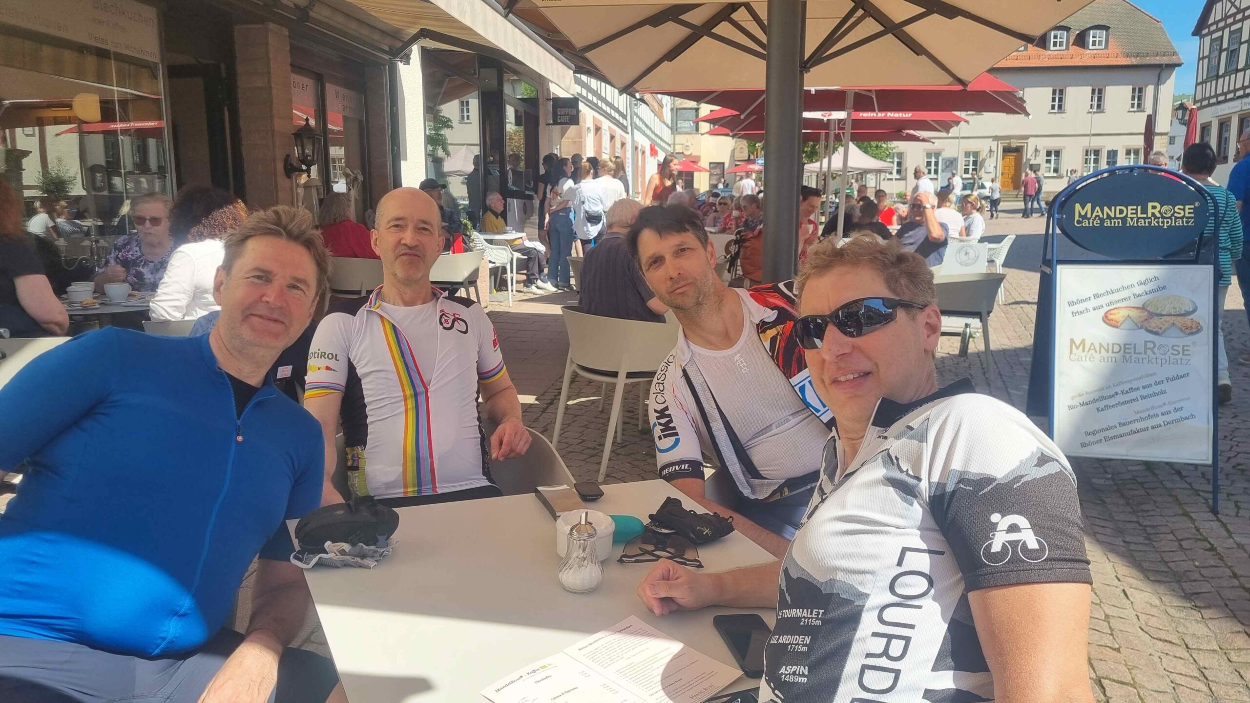 Kurz vor dem Steilstück fuhr Stefan noch auf eine andere Gruppe auf und ließ sie dann im Anstieg auch hinter sich. Ich konnte gerade noch den letzten aus der Gruppe am Parkplatz einholen. Fayek hatte überraschenderweise an dem Anstieg mehr Schwierigkeiten als ich und kam mit leichtem Abstand hinterher. Es ging dann am Kloster vorbei und auf einem schmalen Weg hinauf zum Gipfel. Diesen umrundeten wir dann noch auf einem Schotterweg und machten diverse Fotos. Frank fand leider nicht den Abzweig hinter dem Kloster und suchte uns unterhalb etwas vergebens. Wir beeilten uns dann mit unseren Fotos und fuhren wieder hinunter zu ihm. Auf der Rückseite des Klosters konnten wir uns zu einer schönen Pause hinsetzen ohne dabei die Räder aus den Augen zu verlieren. Anschließend ging es auf die zweite Hälfte der heutigen Tour. Rund 20 Kilometer später kehrten wir bei Gersfeld aber erneut ein und ließen es bei einem leckeren Kuchen uns gut gehen. Anschließend ging es dann in den Schlußabschnitt und ehe wir uns versahen hatten wir bereits die Runde beendet.
