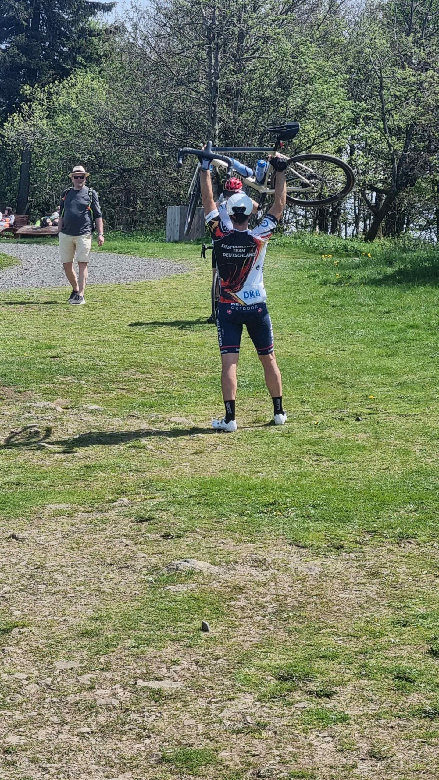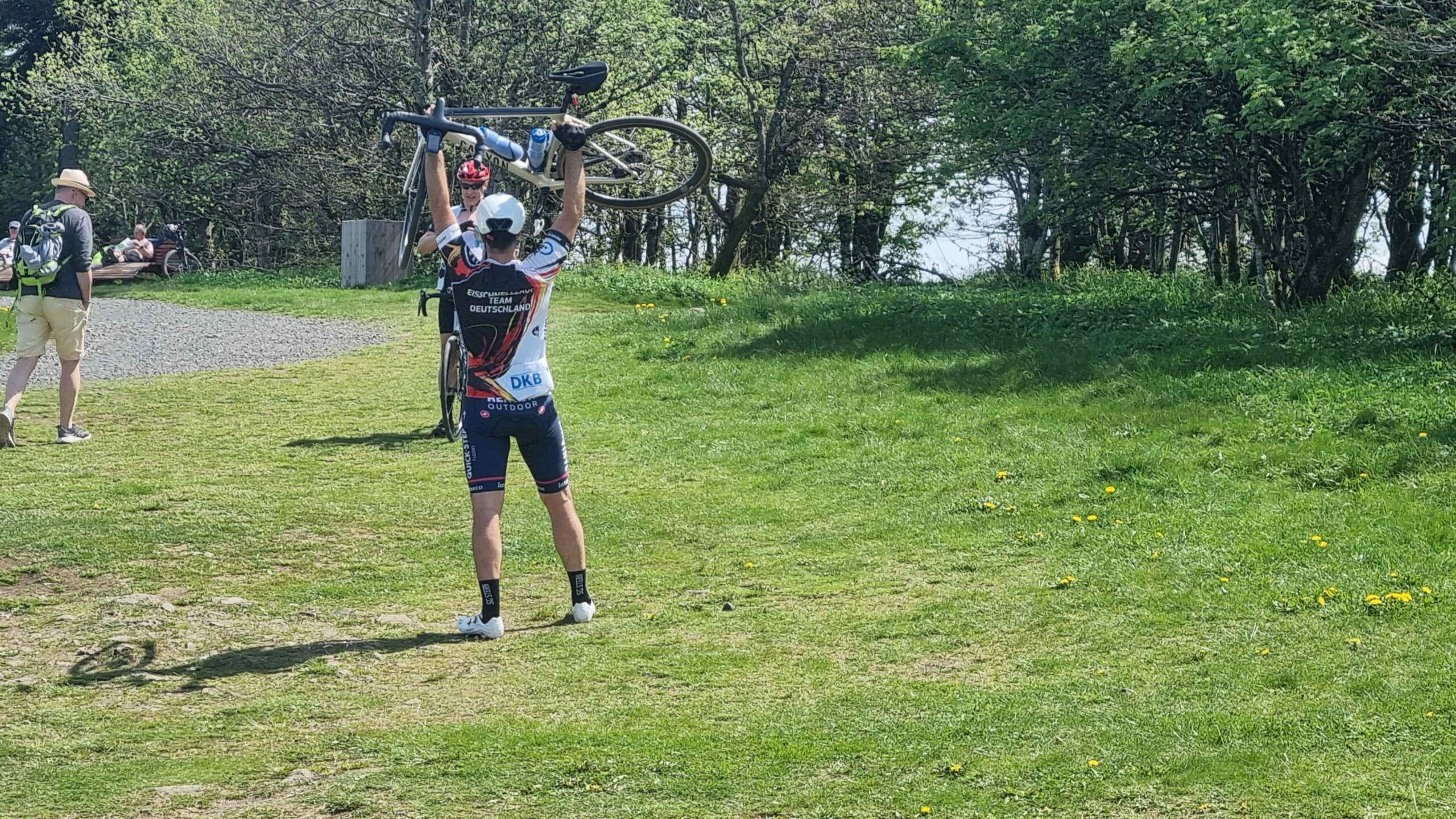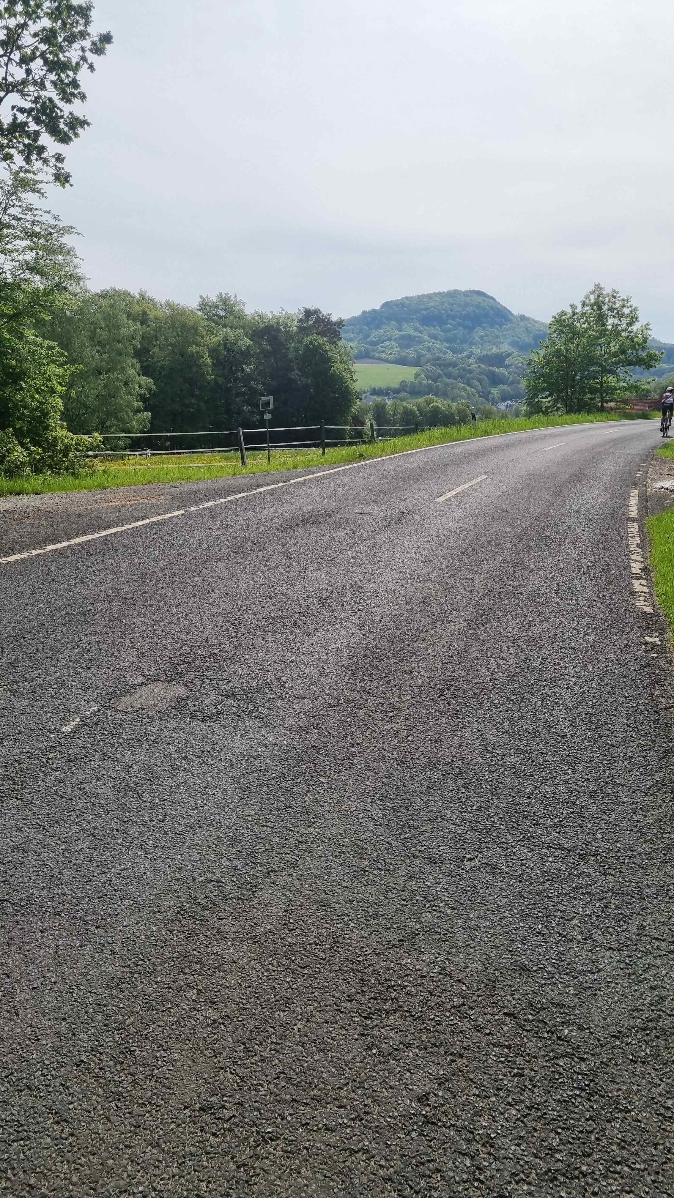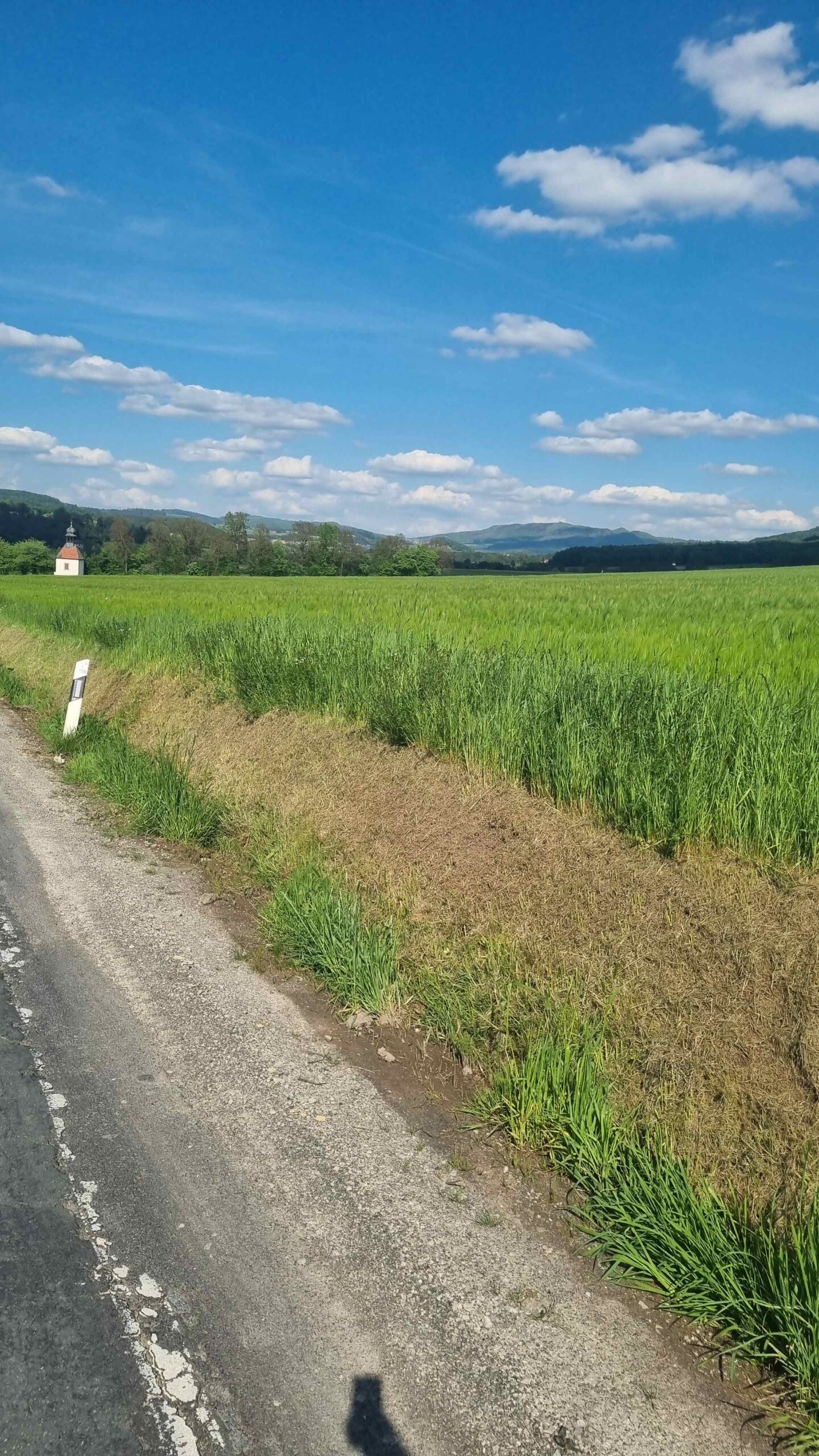 Kurz vor dem Steilstück fuhr Stefan noch auf eine andere Gruppe auf und ließ sie dann im Anstieg auch hinter sich. Ich konnte gerade noch den letzten aus der Gruppe am Parkplatz einholen. Fayek hatte überraschenderweise an dem Anstieg mehr Schwierigkeiten als ich und kam mit leichtem Abstand hinterher. Es ging dann am Kloster vorbei und auf einem schmalen Weg hinauf zum Gipfel. Diesen umrundeten wir dann noch auf einem Schotterweg und machten diverse Fotos. Frank fand leider nicht den Abzweig hinter dem Kloster und suchte uns unterhalb etwas vergebens. Wir beeilten uns dann mit unseren Fotos und fuhren wieder hinunter zu ihm. Auf der Rückseite des Klosters konnten wir uns zu einer schönen Pause hinsetzen ohne dabei die Räder aus den Augen zu verlieren. Anschließend ging es auf die zweite Hälfte der heutigen Tour. Rund 20 Kilometer später kehrten wir bei Gersfeld aber erneut ein und ließen es bei einem leckeren Kuchen uns gut gehen. Anschließend ging es dann in den Schlußabschnitt und ehe wir uns versahen hatten wir bereits die Runde beendet.
